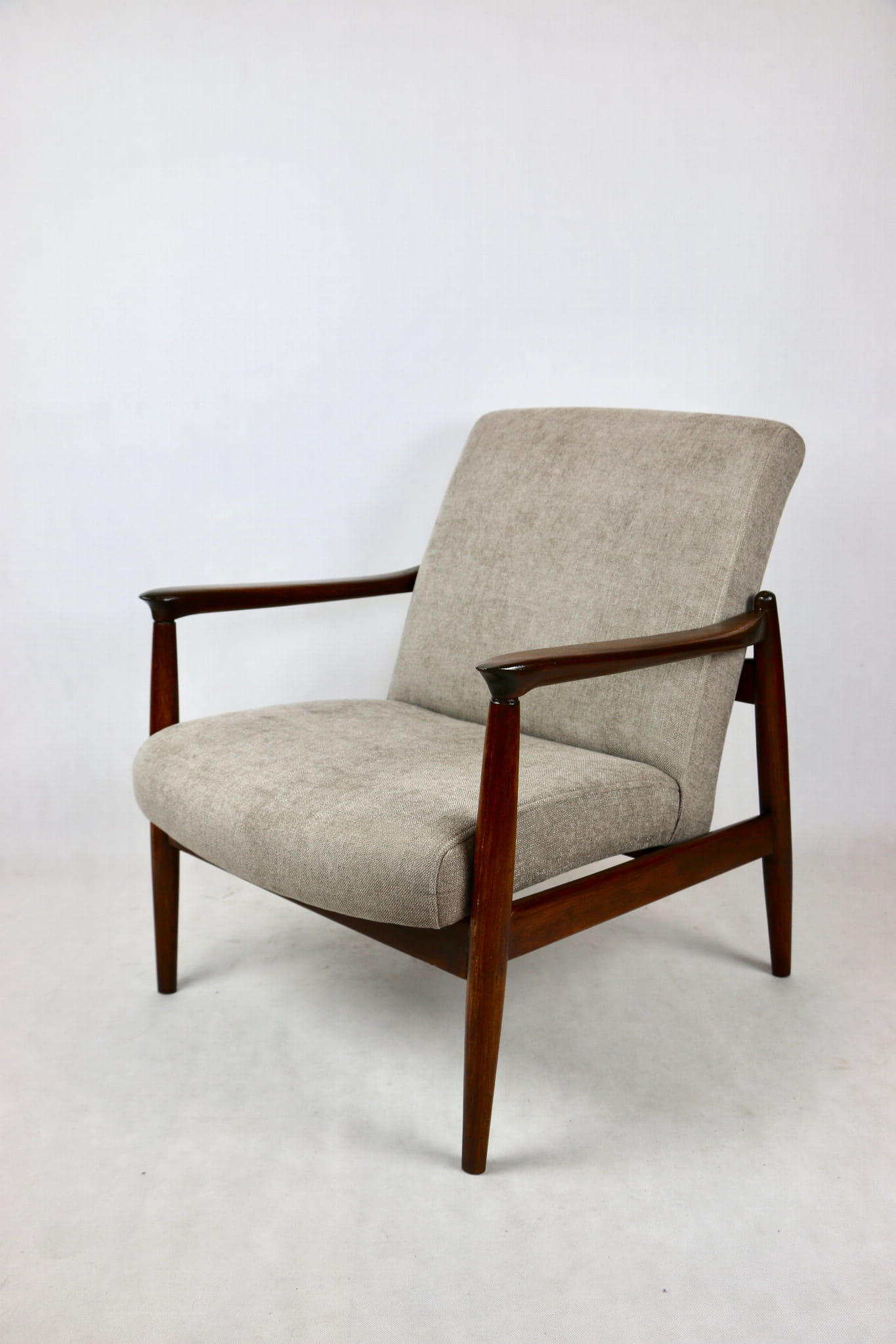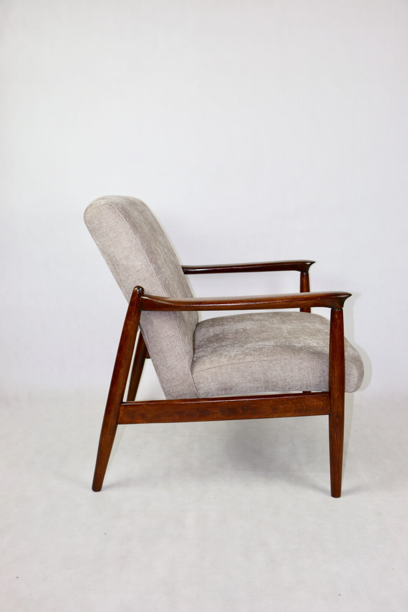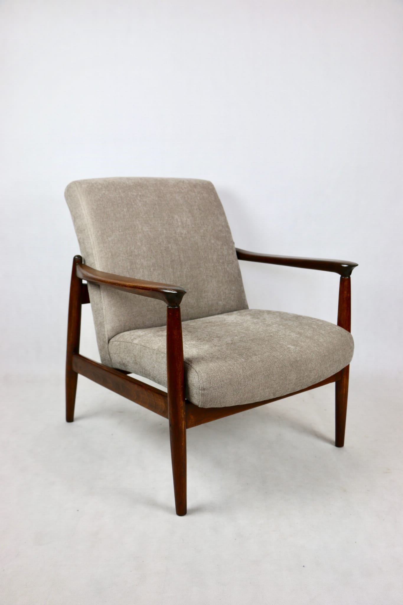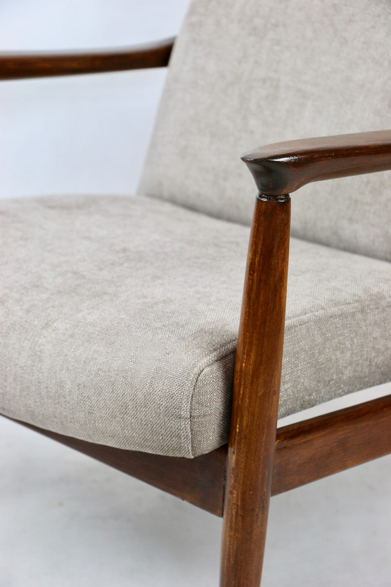 Fotel GFM - 64 zaprojektowany przez Edmunda Homa. Kompletnie odrestaurowany - nowa tapicerka wraz z wypełnieniem została pokryta materiałem tapicerskim strukturalnym w kolorze beżowym z serii Danubio. Podparcia i nóżki drewniane, pokryte lakierem w kolorze ciemnego drewna.