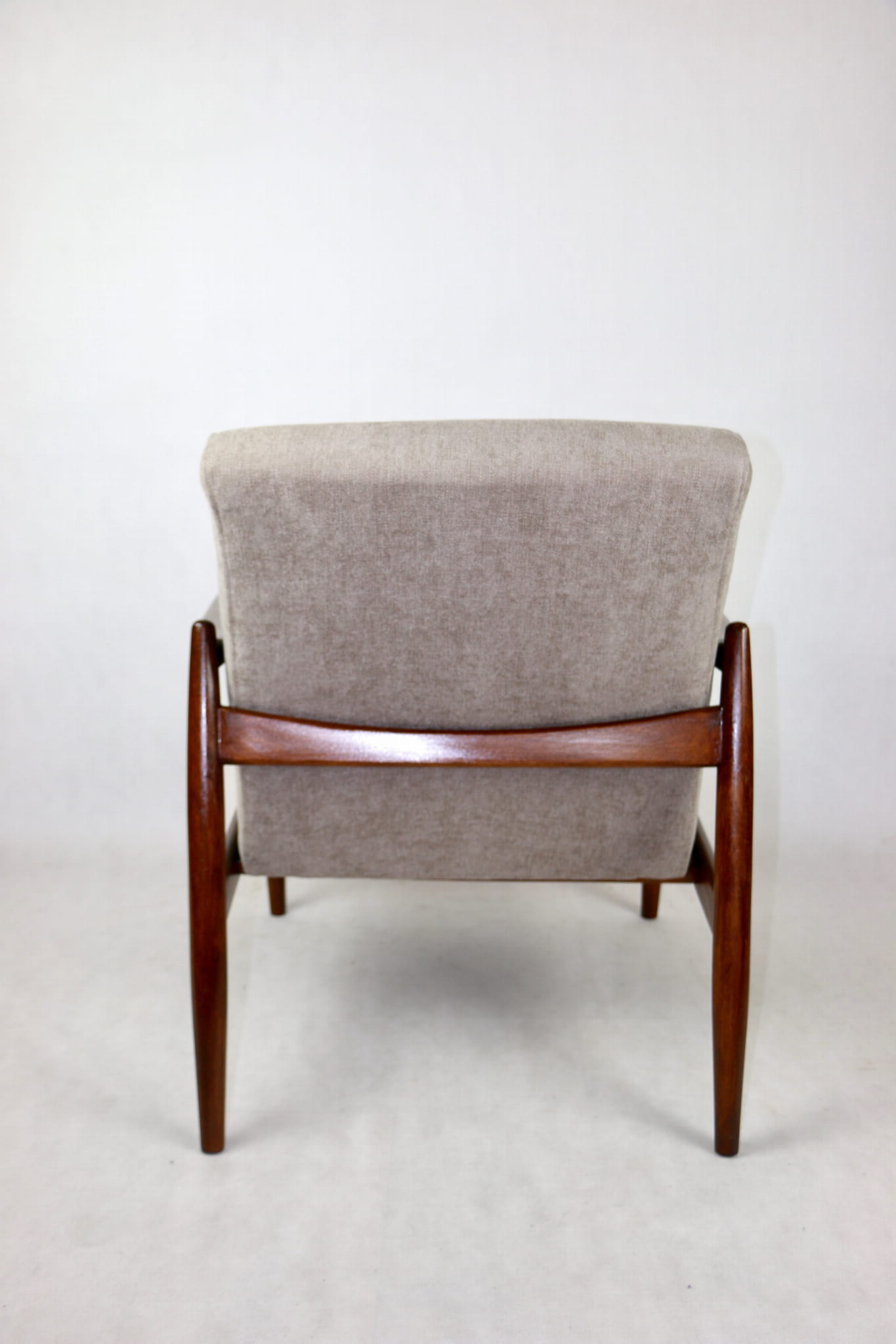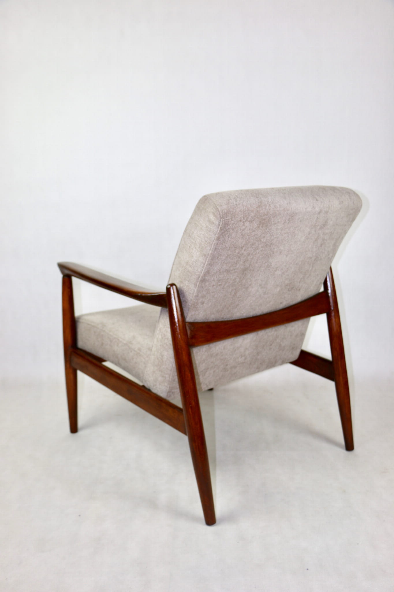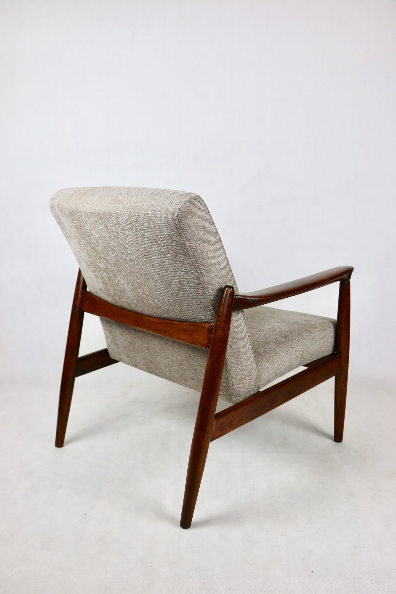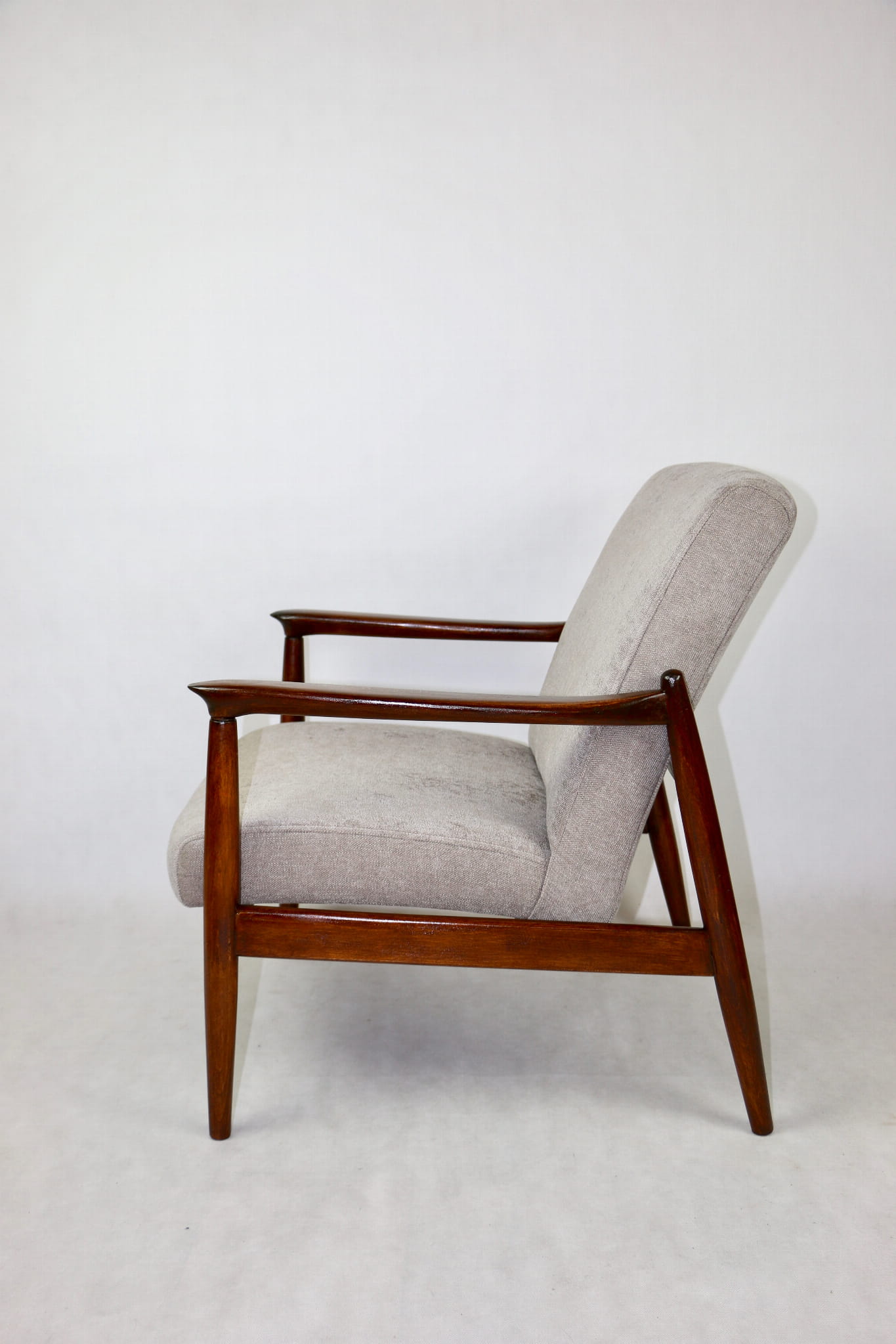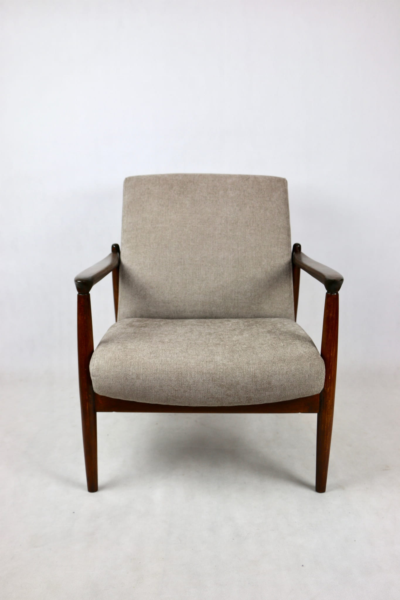 Fotel GFM - 64 zaprojektowany przez Edmunda Homa. Kompletnie odrestaurowany - nowa tapicerka wraz z wypełnieniem została pokryta materiałem tapicerskim strukturalnym w kolorze beżowym z serii Danubio. Podparcia i nóżki drewniane, pokryte lakierem w kolorze ciemnego drewna.