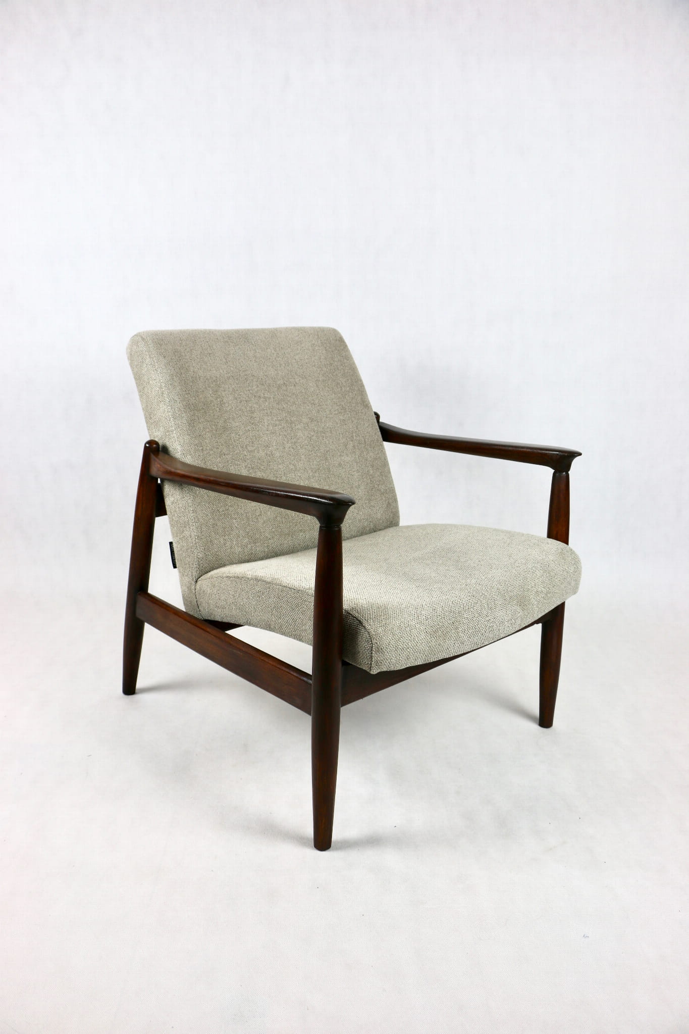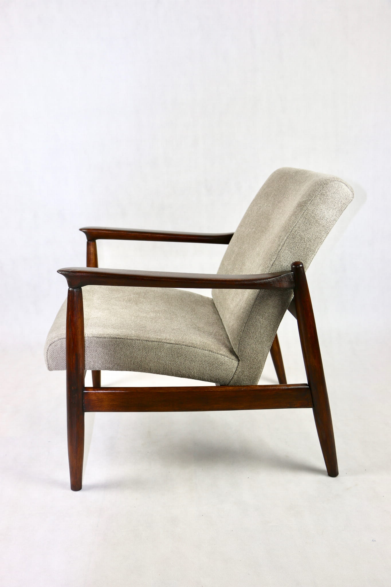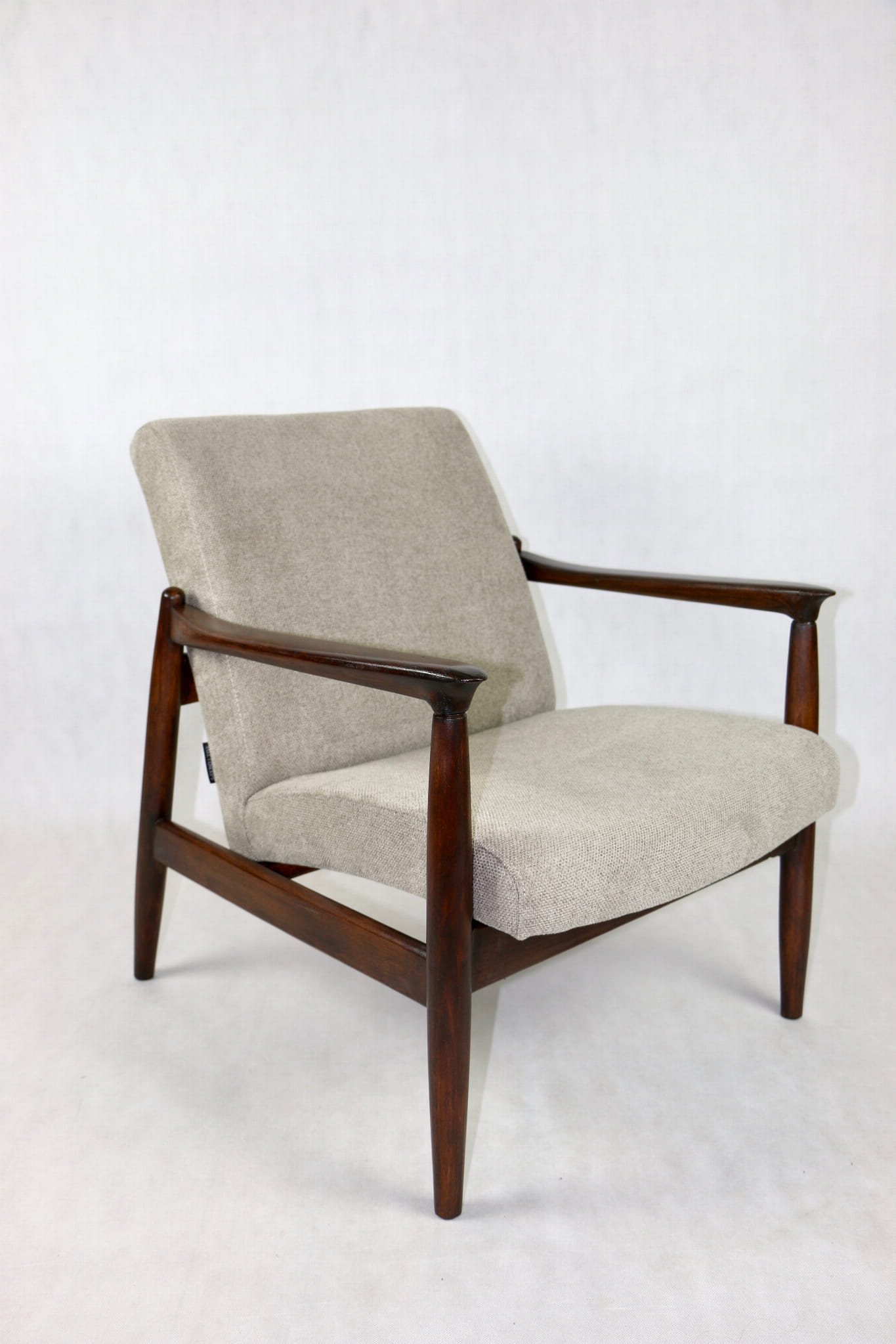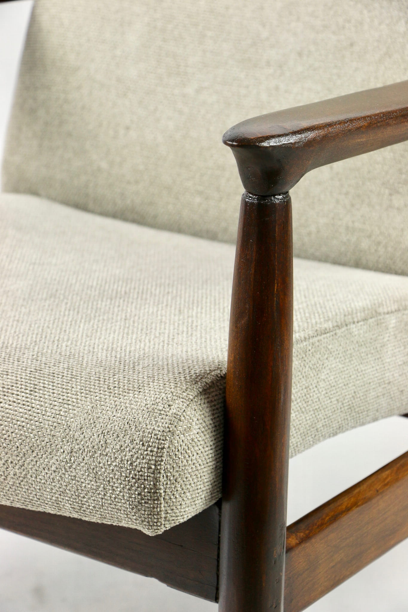 Fotel GFM - 64 zaprojektowany przez Edmunda Homa. Kompletnie odrestaurowany - nowa tapicerka wraz z wypełnieniem została pokryta materiałem tapicerskim strukturalnym w kolorze beżowym z serii Danubio. Podparcia i nóżki drewniane, pokryte lakierem w kolorze ciemnego drewna.