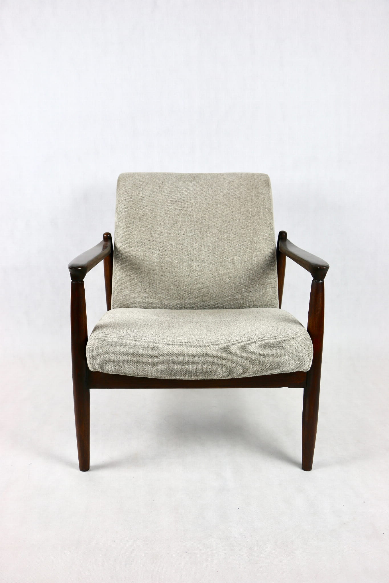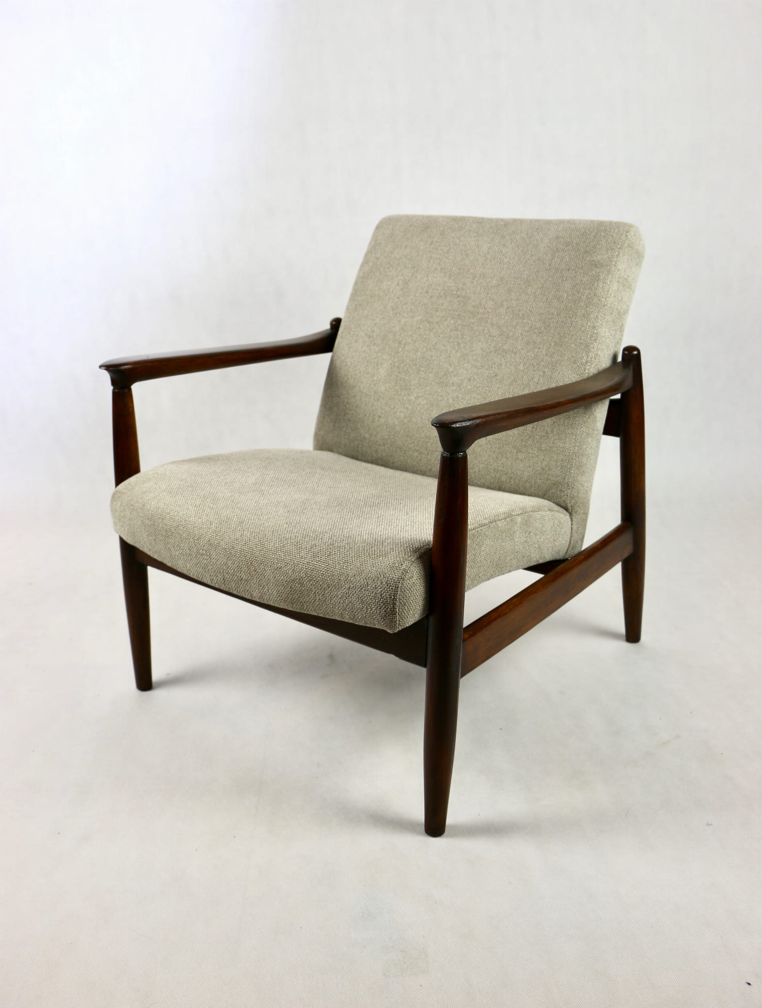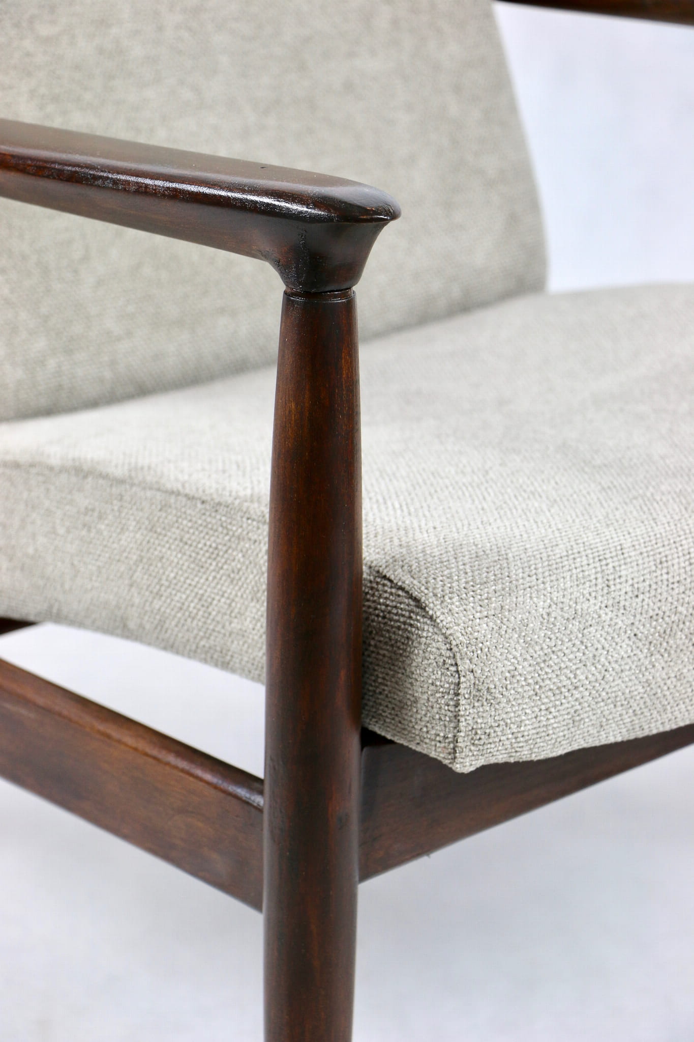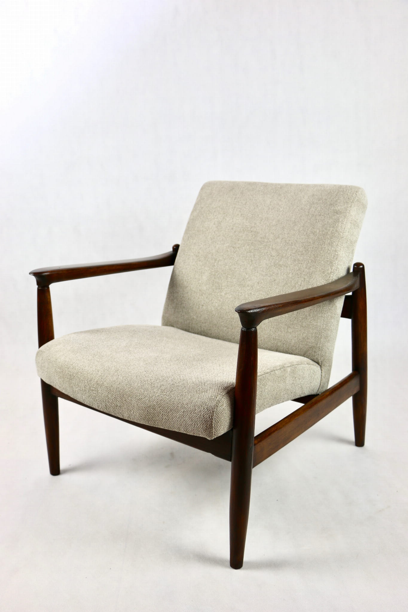 Fotel GFM - 64 zaprojektowany przez Edmunda Homa. Kompletnie odrestaurowany - nowa tapicerka wraz z wypełnieniem została pokryta materiałem tapicerskim strukturalnym w kolorze beżowym z serii Danubio. Podparcia i nóżki drewniane, pokryte lakierem w kolorze ciemnego drewna.