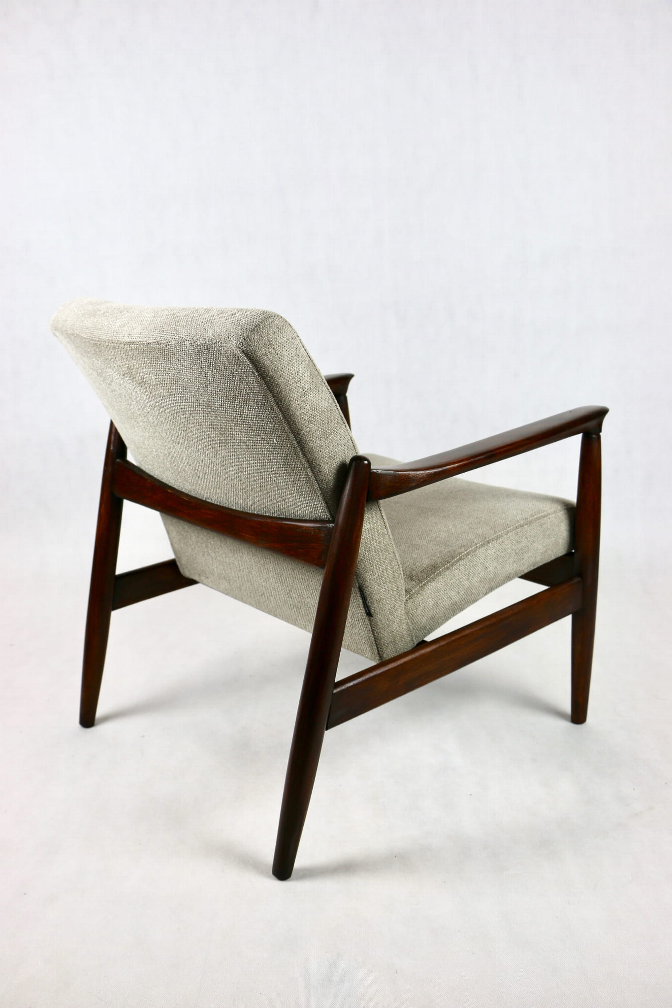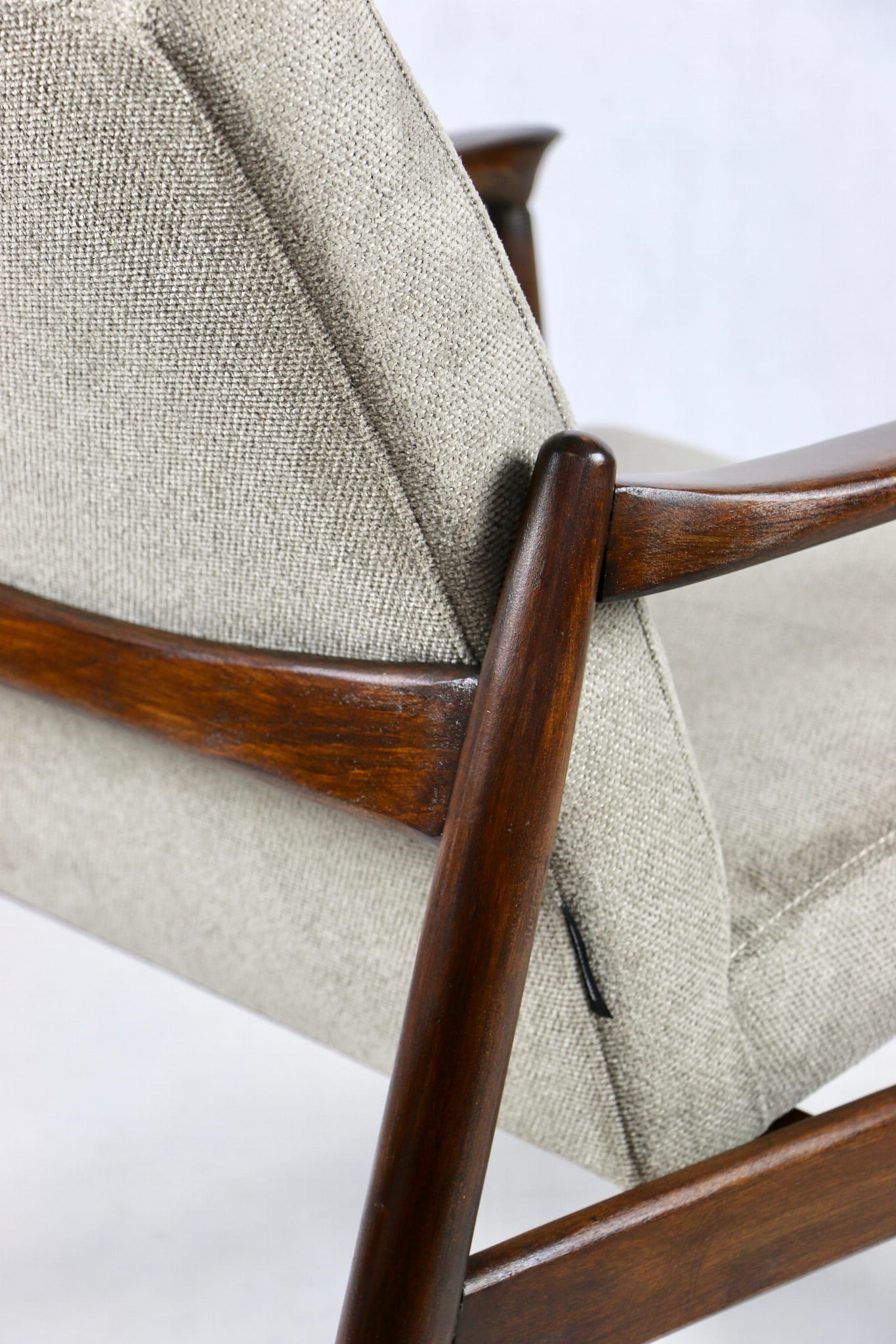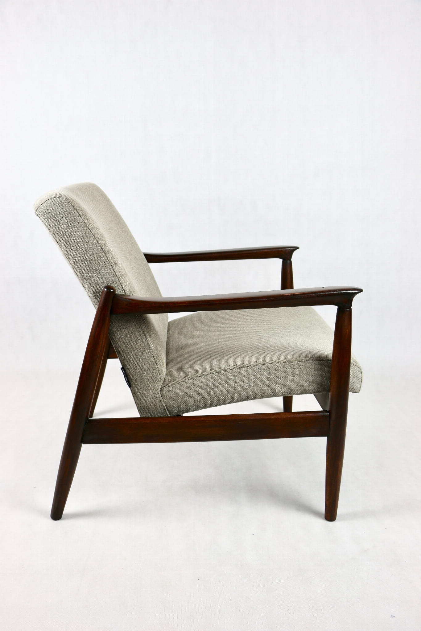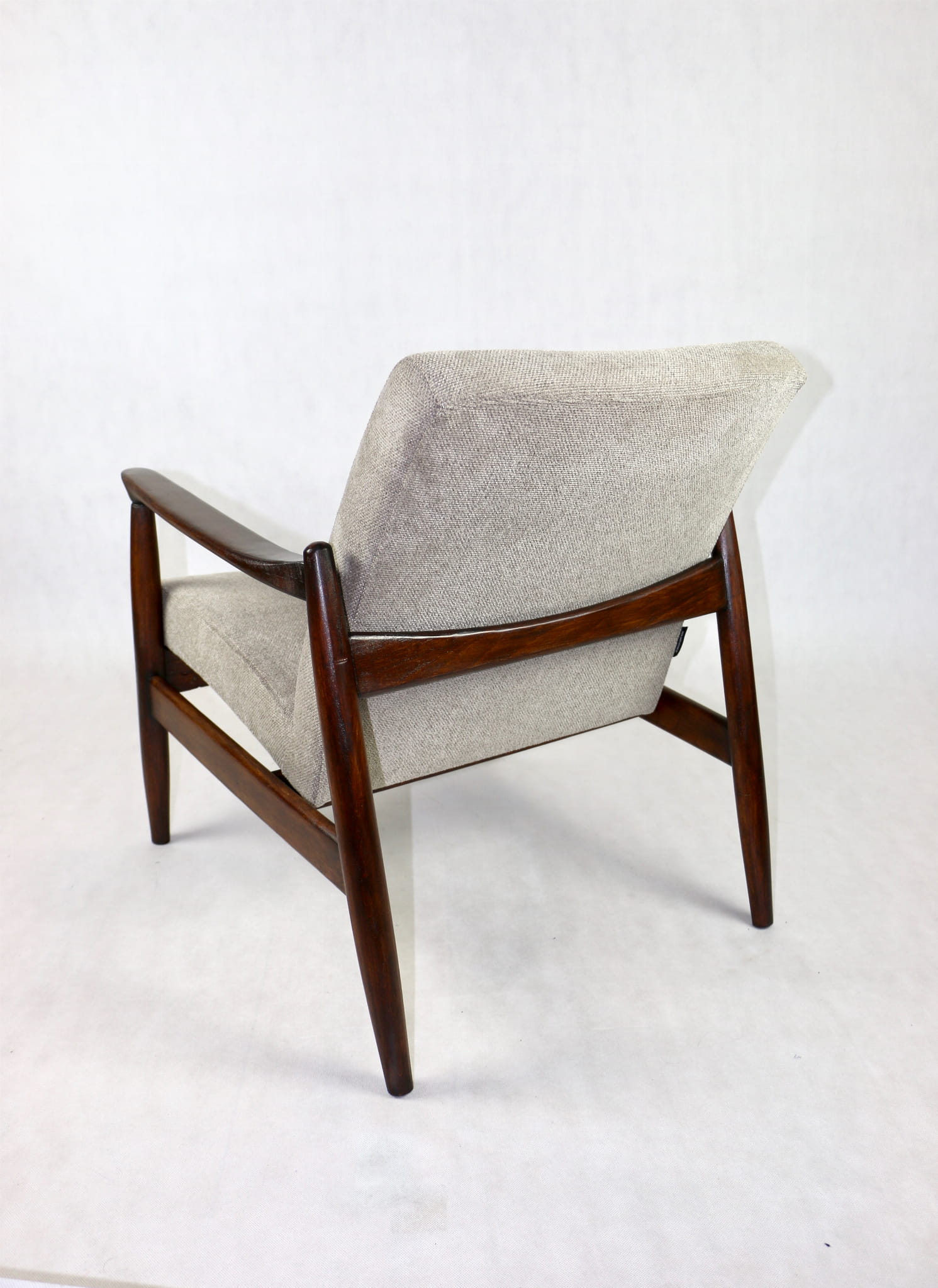 Fotel GFM - 64 zaprojektowany przez Edmunda Homa. Kompletnie odrestaurowany - nowa tapicerka wraz z wypełnieniem została pokryta materiałem tapicerskim strukturalnym w kolorze beżowym z serii Danubio. Podparcia i nóżki drewniane, pokryte lakierem w kolorze ciemnego drewna.