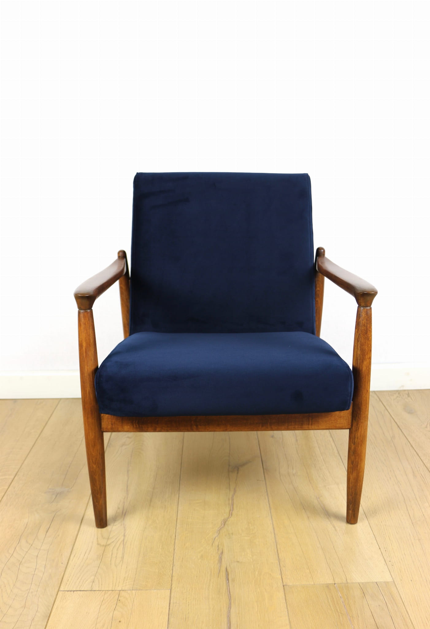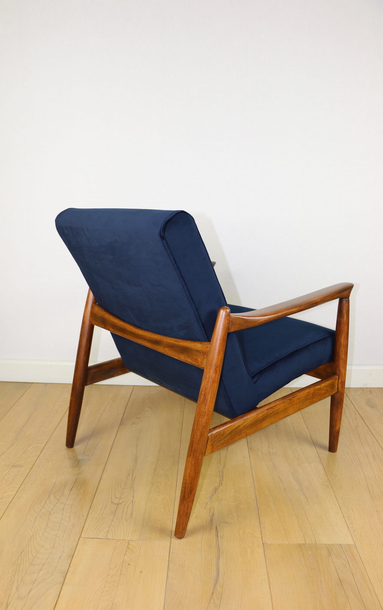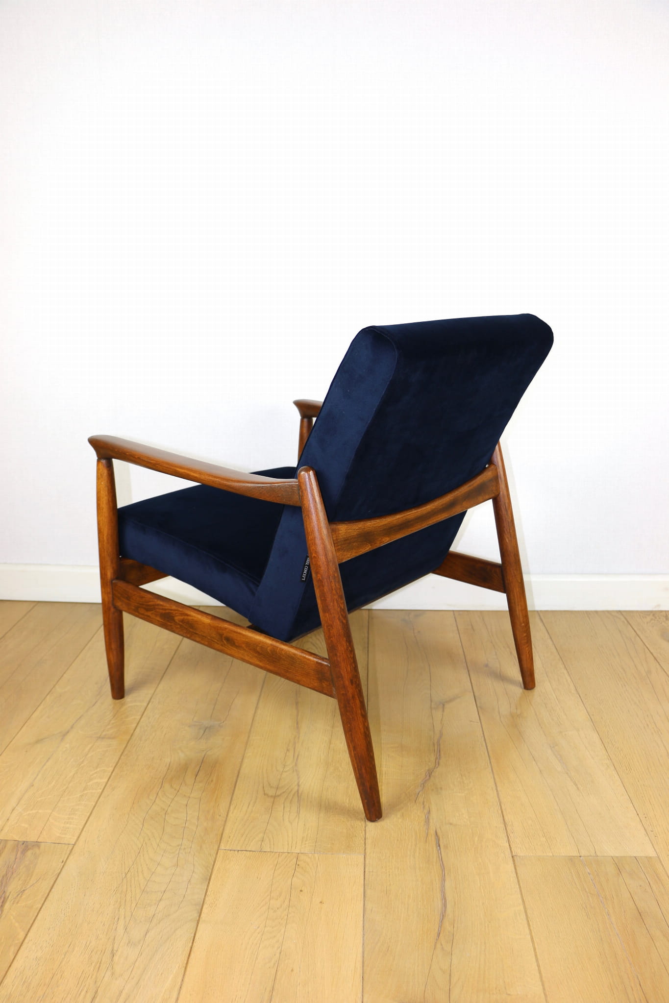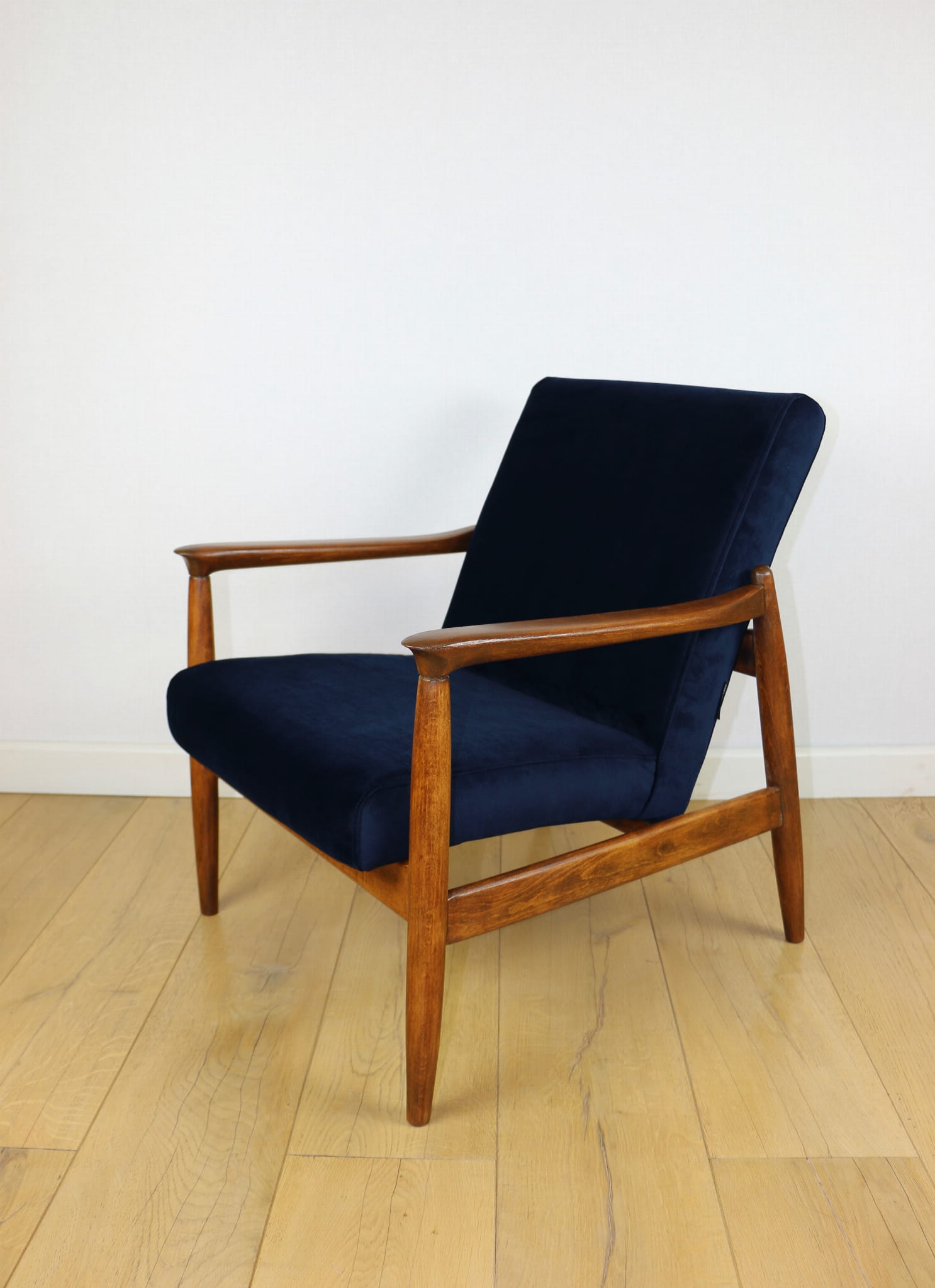 Fotel GFM - 64 zaprojektowany przez Edmunda Homa w latach 70-tych. Kompletnie odrestaurowany - nowa tapicerka wraz z wypełnieniem została pokryta materiałem tapicerskim typu welwet w kolorze granatowym. Podparcia i nóżki drewniane, pokryte lakierem w kolorze ciemnego bukowego drewna.