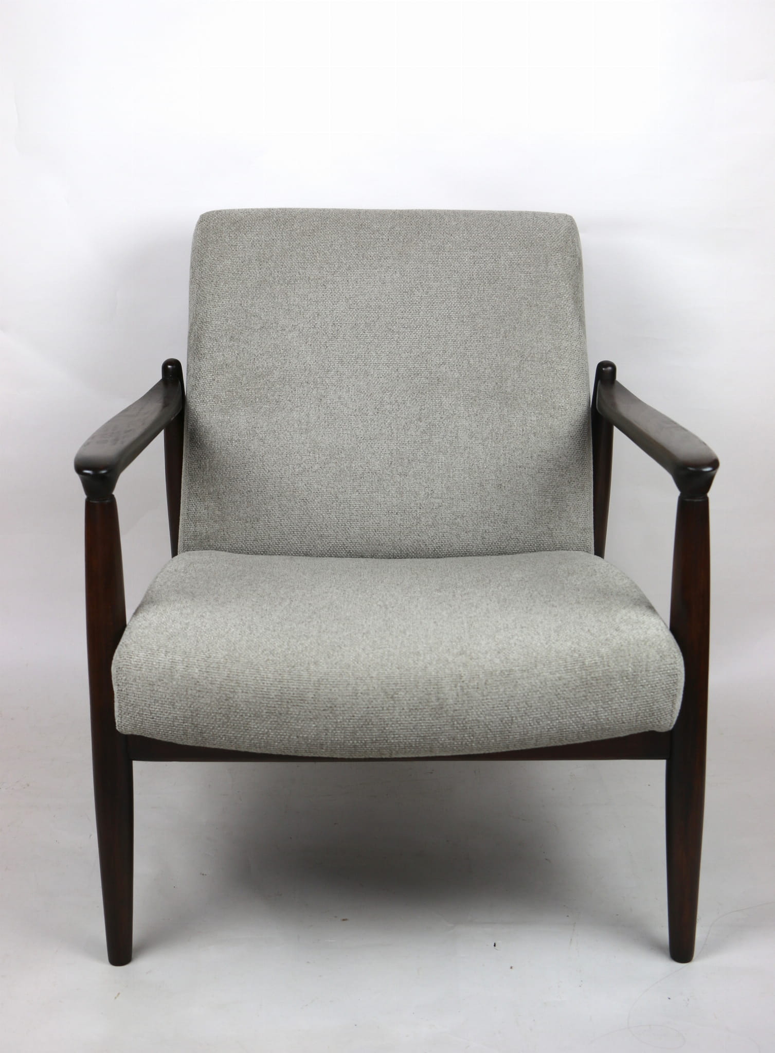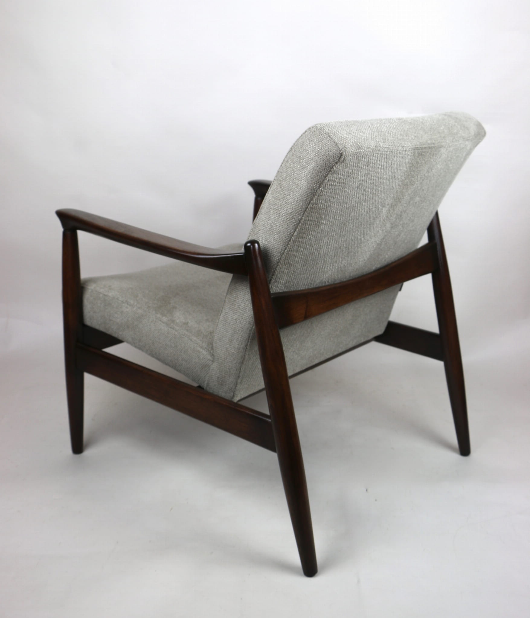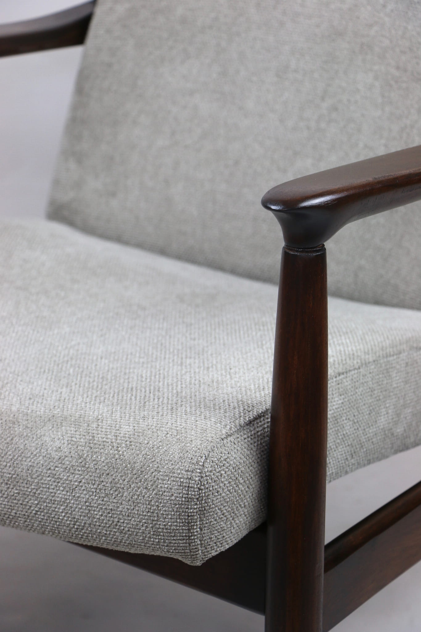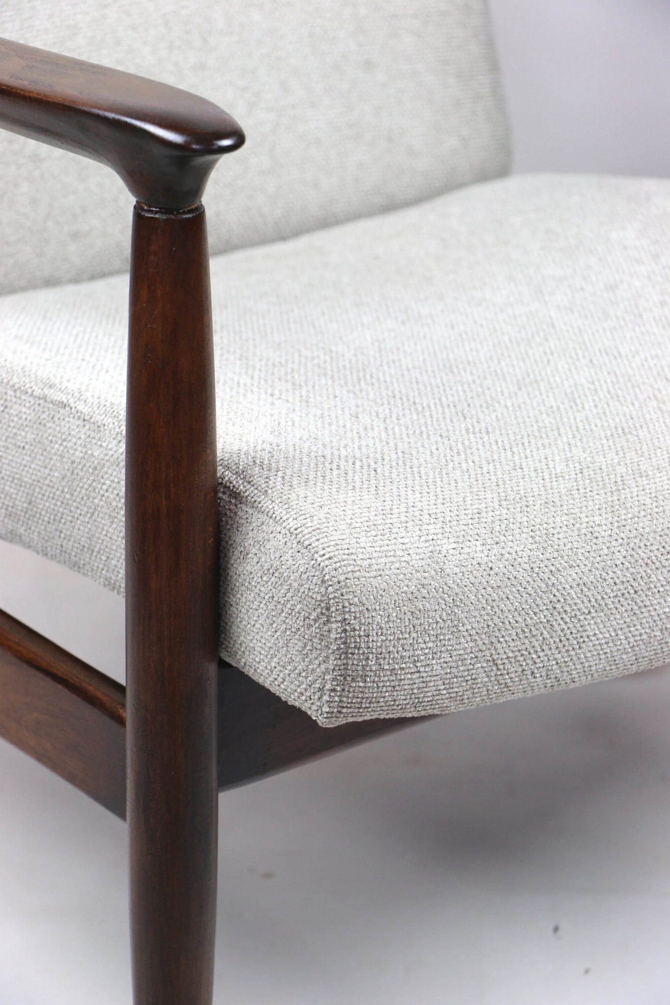 Fotel GFM - 64 zaprojektowany przez Edmunda Homę. Kompletnie odrestaurowany - nowa tapicerka wraz z wypełnieniem została pokryta materiałem tapicerskim strukturalnym plecionym w kolorze szarym jasnym. Podparcia i nóżki drewniane, pokryte lakierem w kolorze ciemnego drewna.