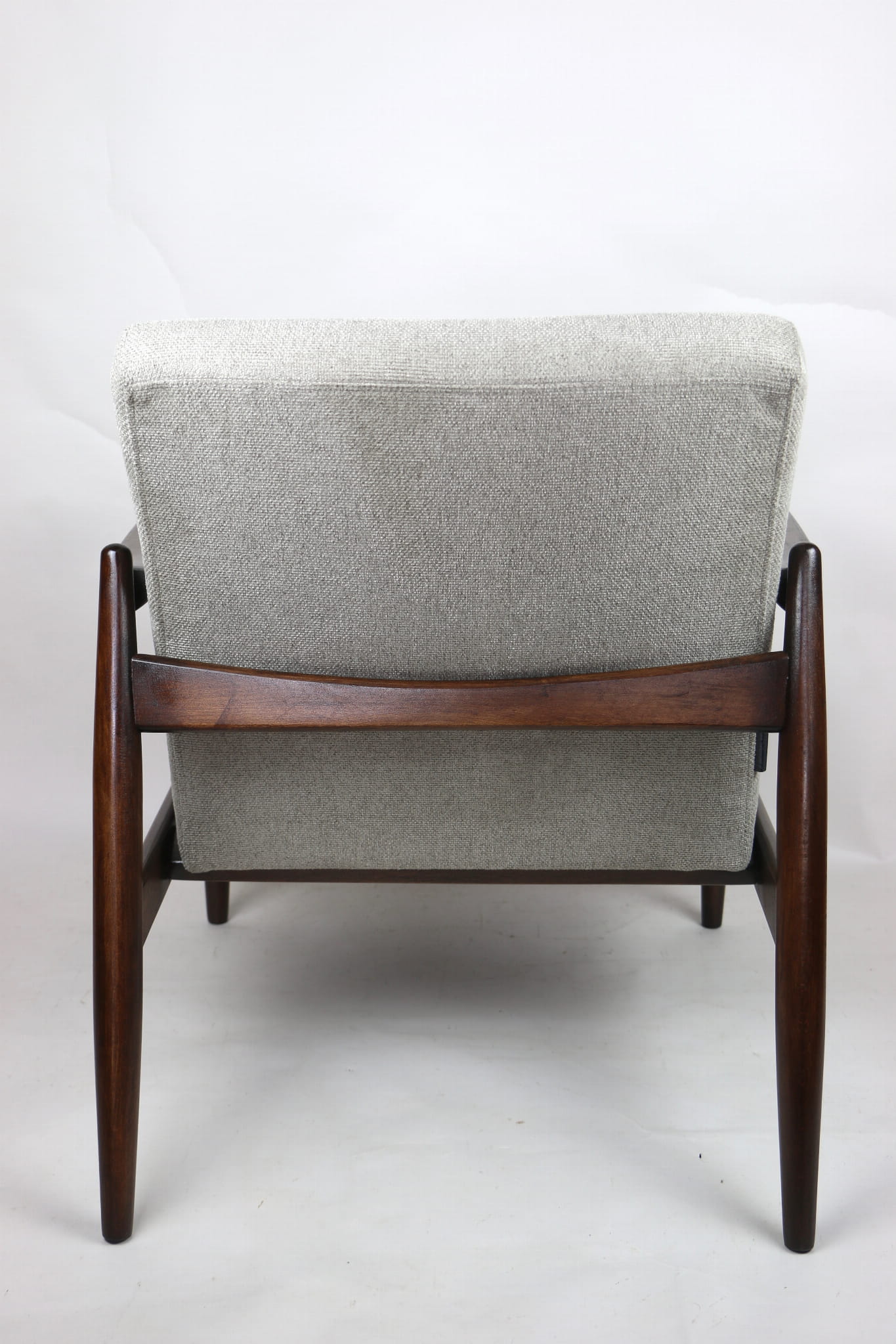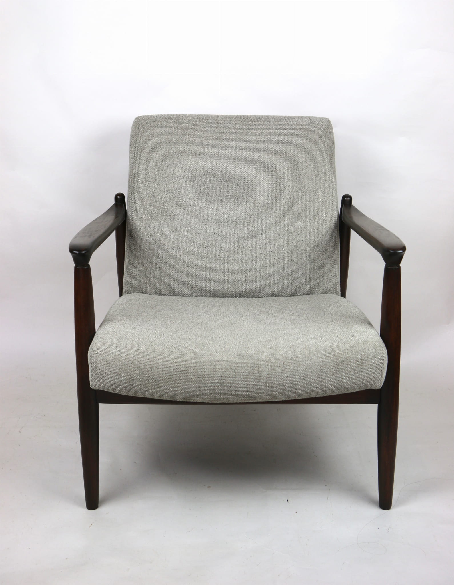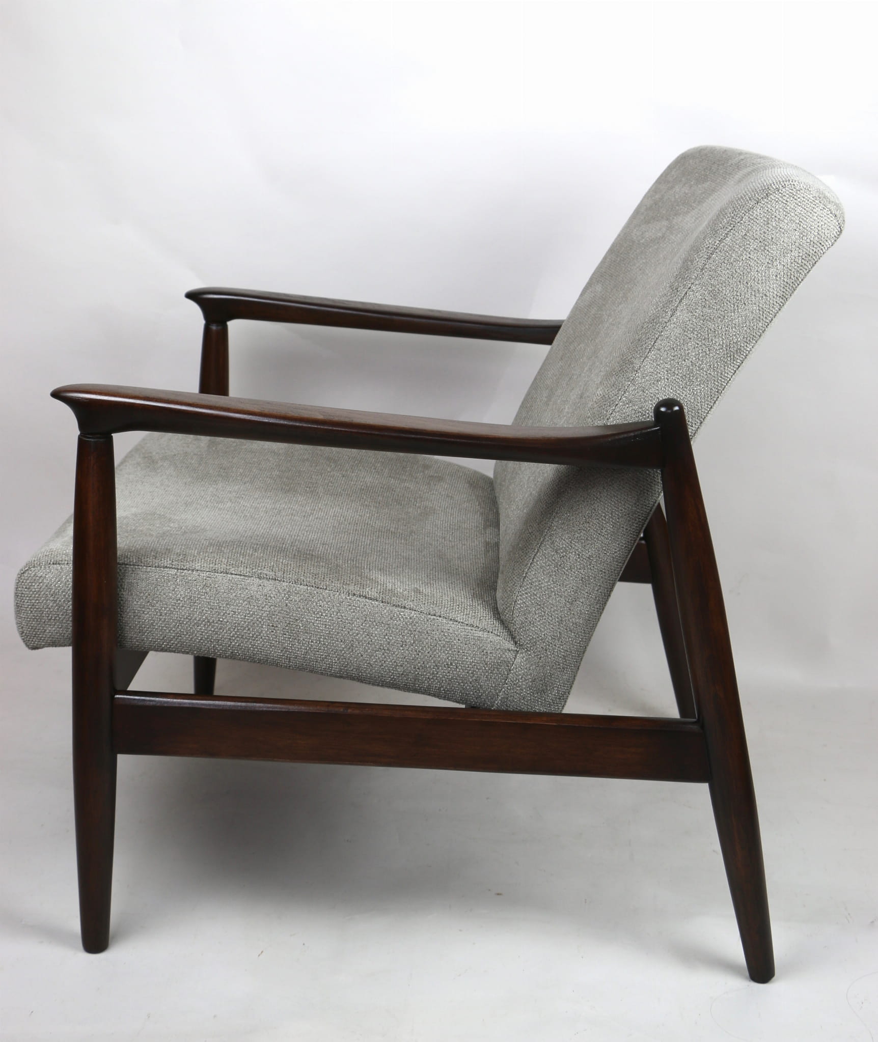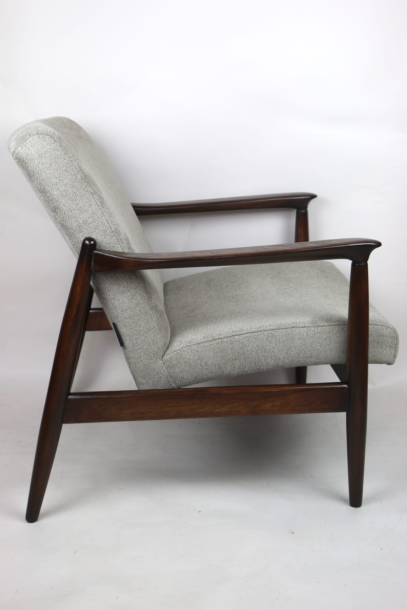 Fotel GFM - 64 zaprojektowany przez Edmunda Homę. Kompletnie odrestaurowany - nowa tapicerka wraz z wypełnieniem została pokryta materiałem tapicerskim strukturalnym plecionym w kolorze szarym jasnym. Podparcia i nóżki drewniane, pokryte lakierem w kolorze ciemnego drewna.