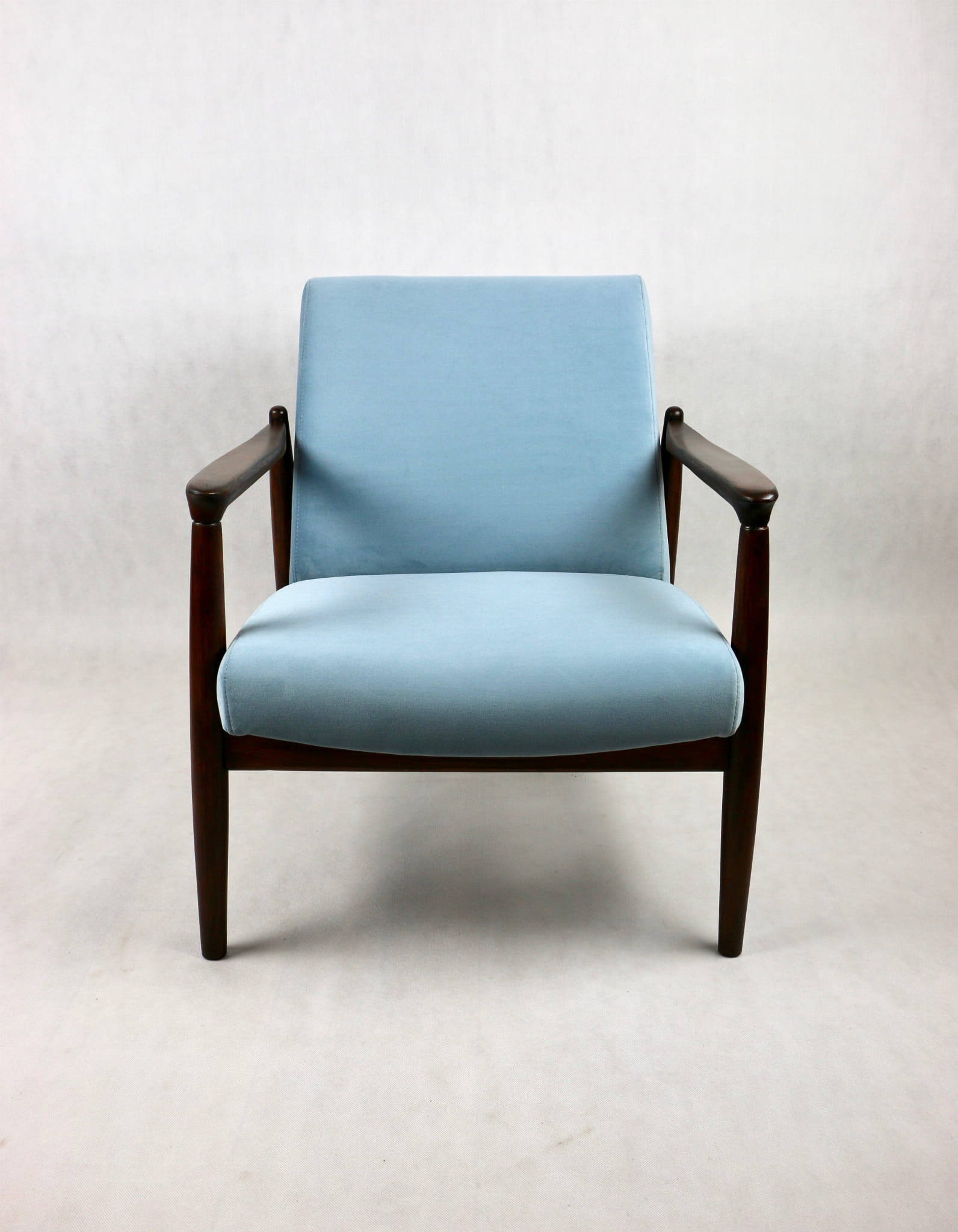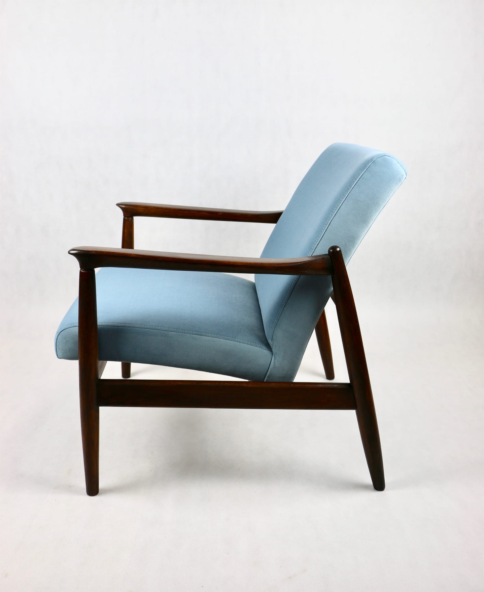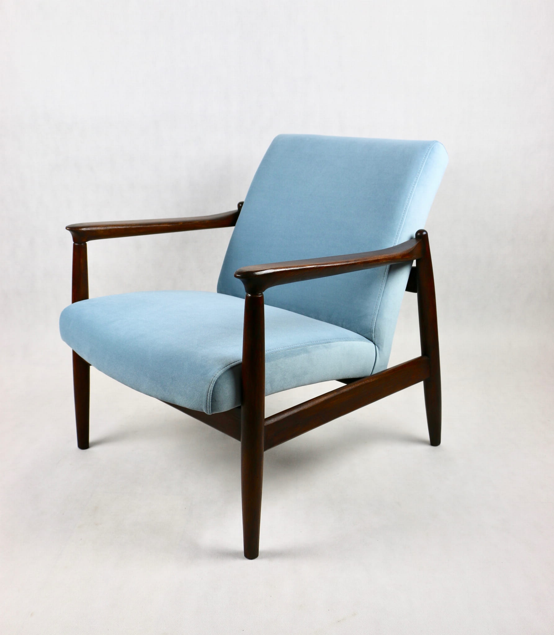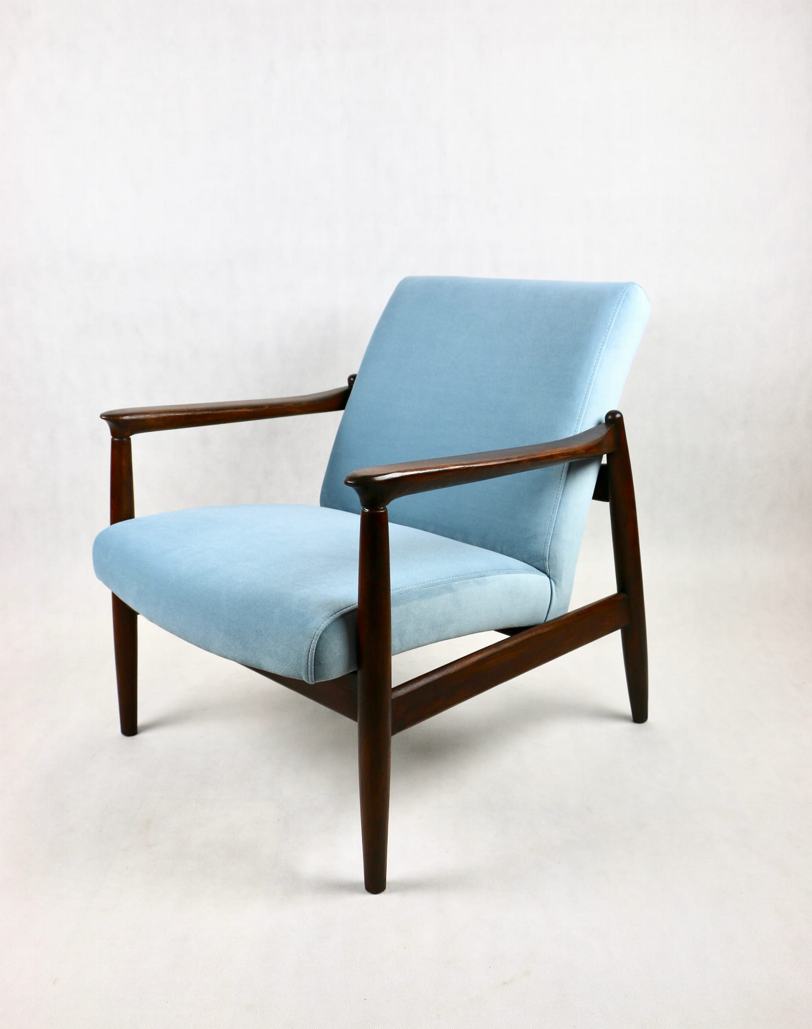 Fotel GFM - 64 zaprojektowany przez Edmunda Homę. Kompletnie odrestaurowany - nowa tapicerka wraz z wypełnieniem została pokryta aksamitnym materiałem tapicerskim JADE w kolorze błękitnym - kolor 606. Podparcia i nóżki drewniane, naturalne pokryte lakierem w kolorze ciemnego drewna.
