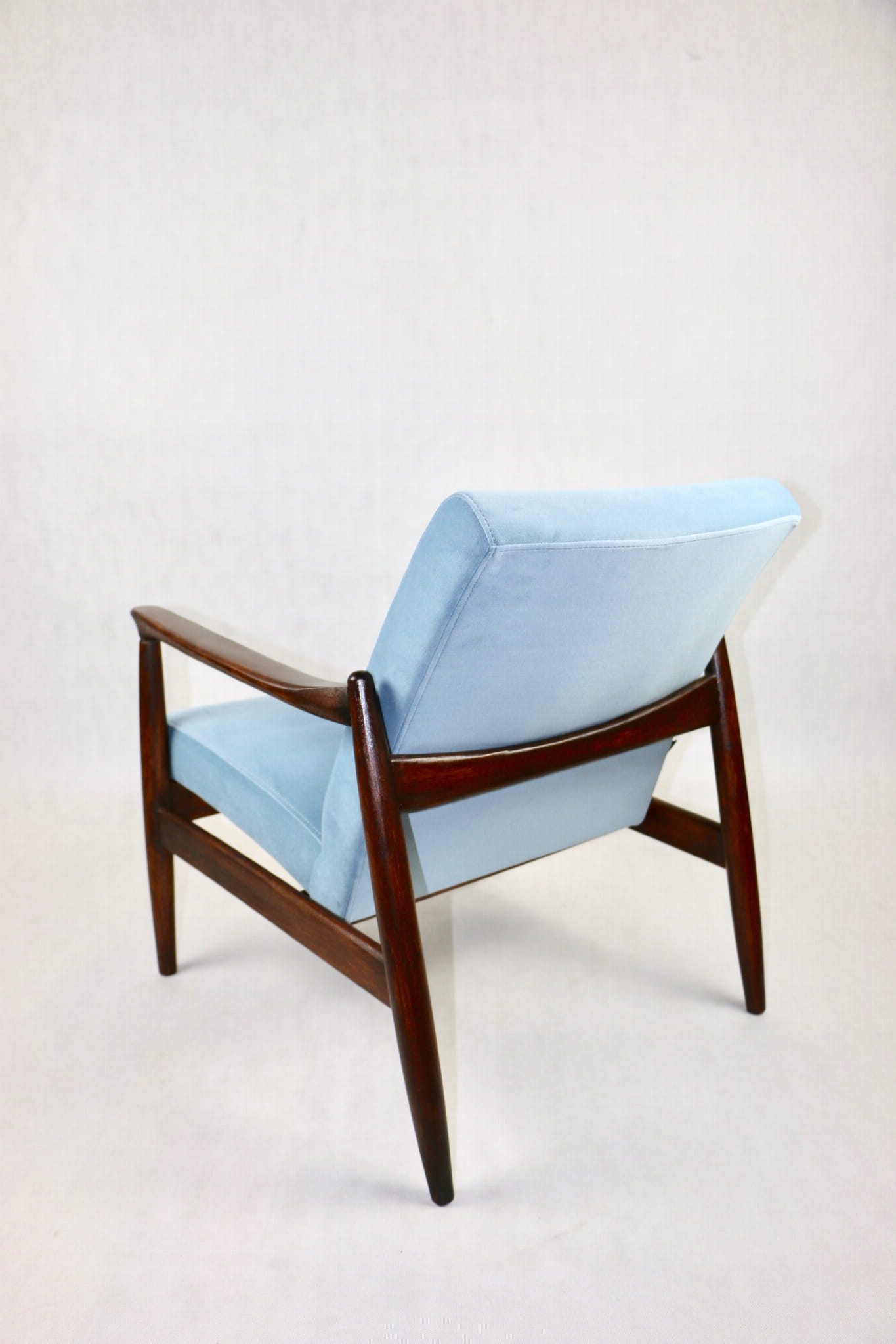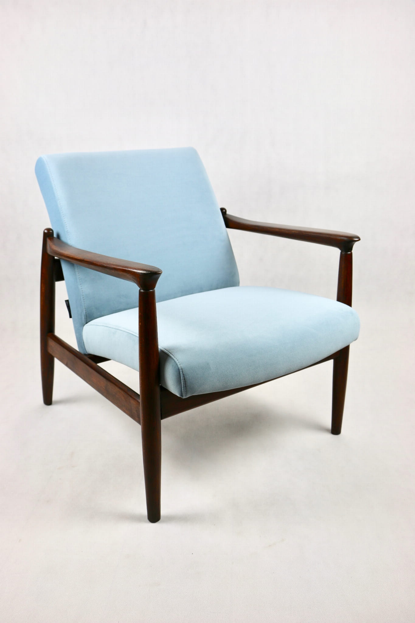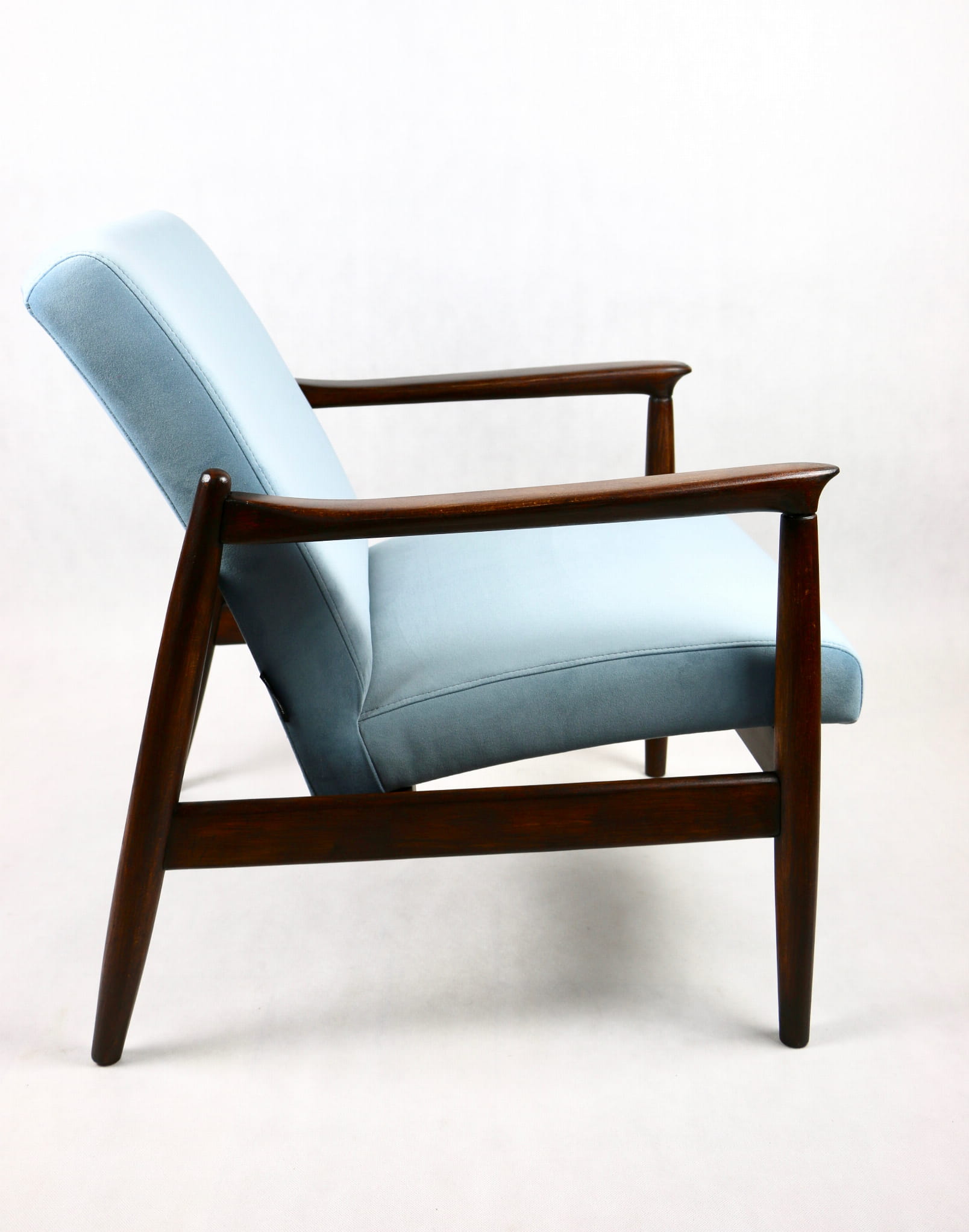 Fotel GFM - 64 zaprojektowany przez Edmunda Homę. Kompletnie odrestaurowany - nowa tapicerka wraz z wypełnieniem została pokryta aksamitnym materiałem tapicerskim JADE w kolorze błękitnym - kolor 606. Podparcia i nóżki drewniane, naturalne pokryte lakierem w kolorze ciemnego drewna.