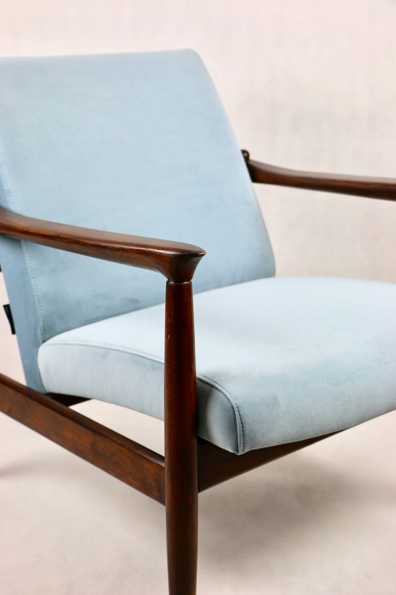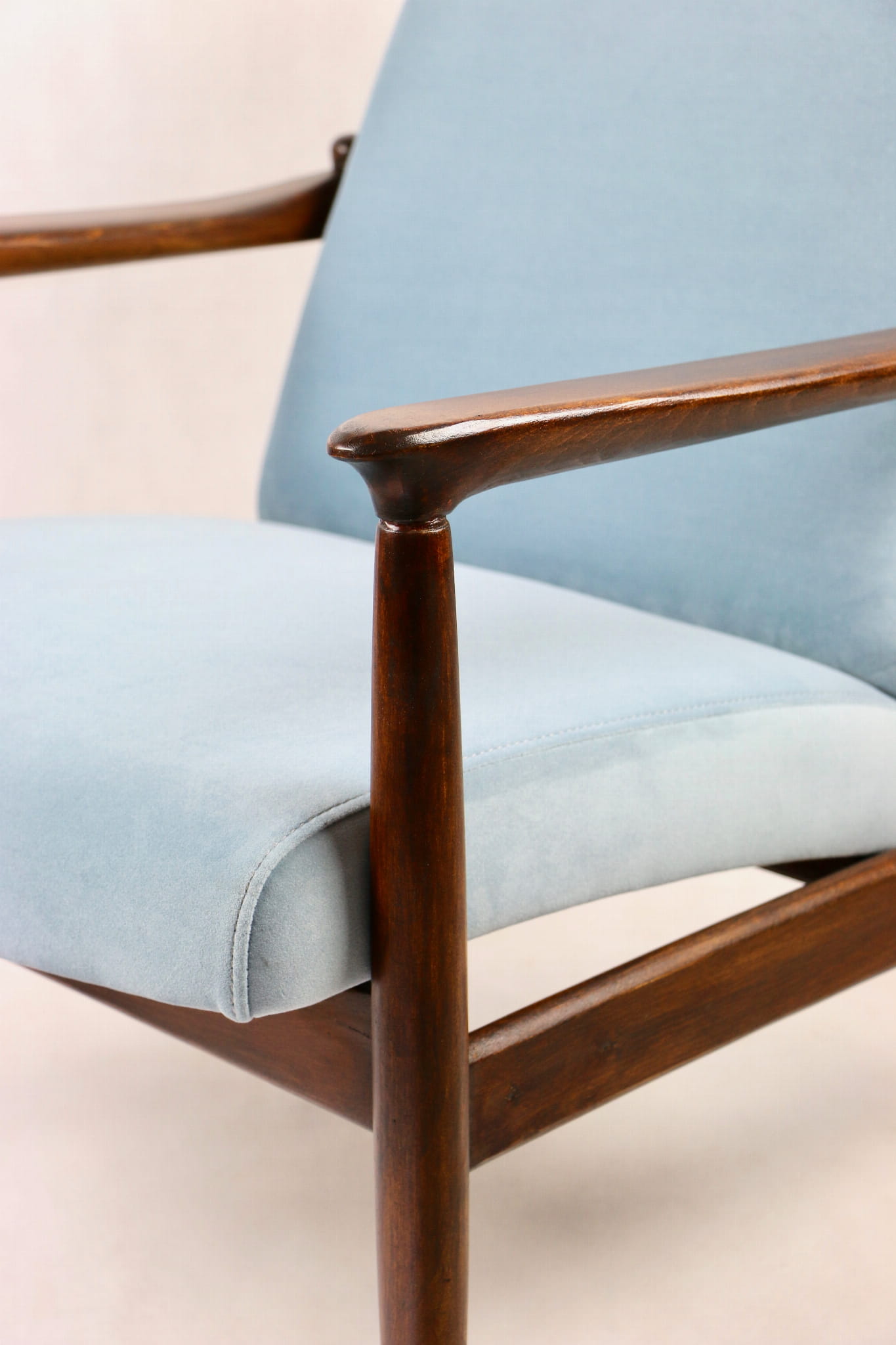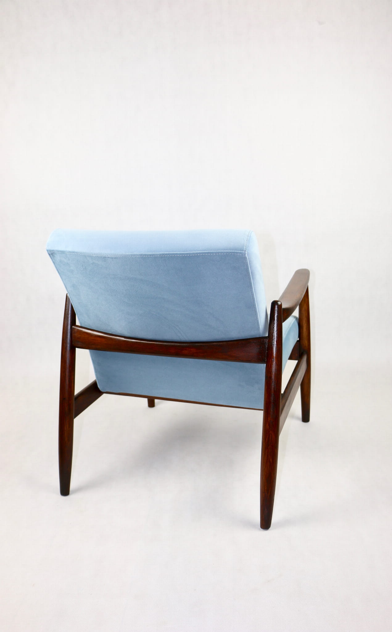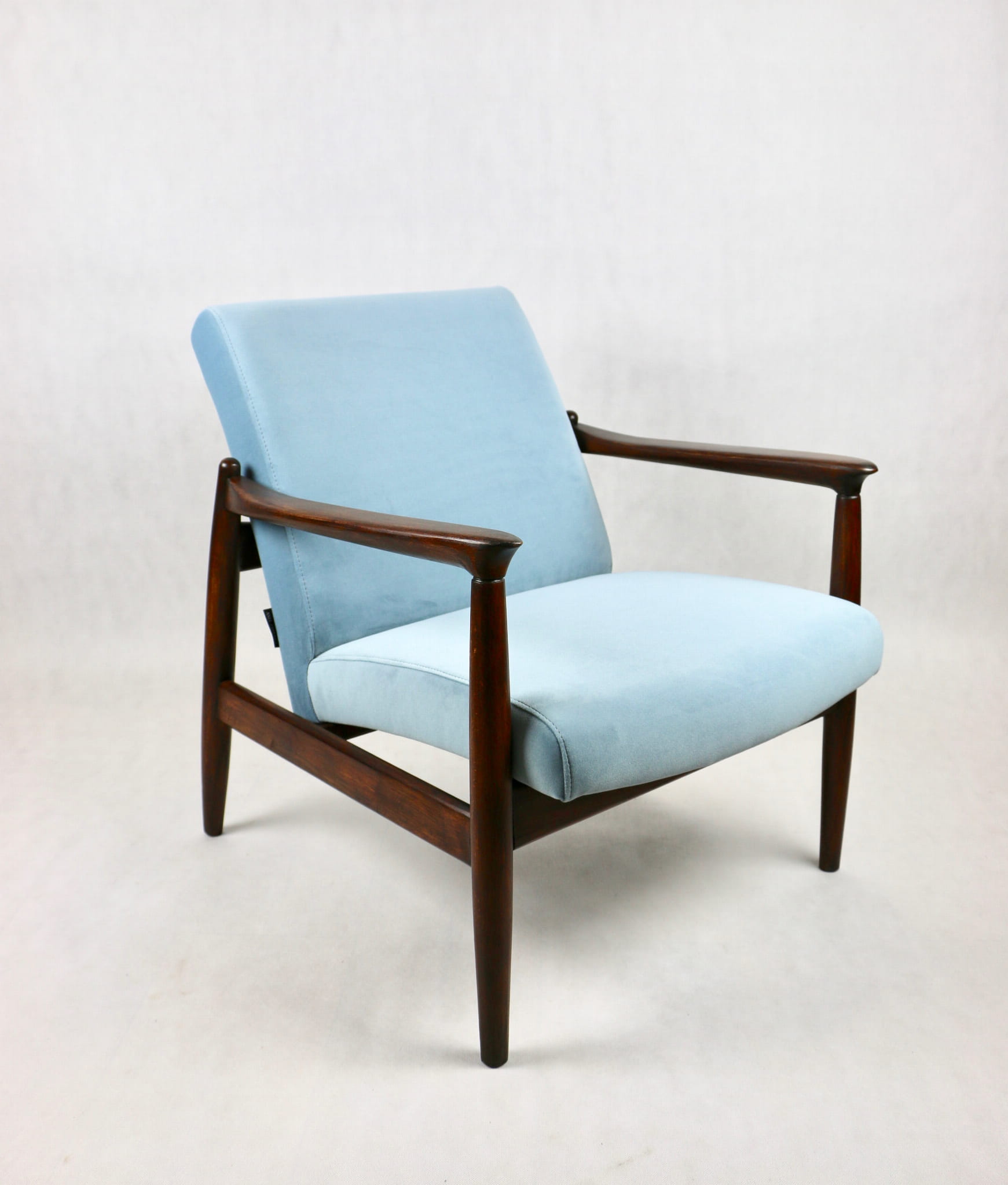 Fotel GFM - 64 zaprojektowany przez Edmunda Homę. Kompletnie odrestaurowany - nowa tapicerka wraz z wypełnieniem została pokryta aksamitnym materiałem tapicerskim JADE w kolorze błękitnym - kolor 606. Podparcia i nóżki drewniane, naturalne pokryte lakierem w kolorze ciemnego drewna.