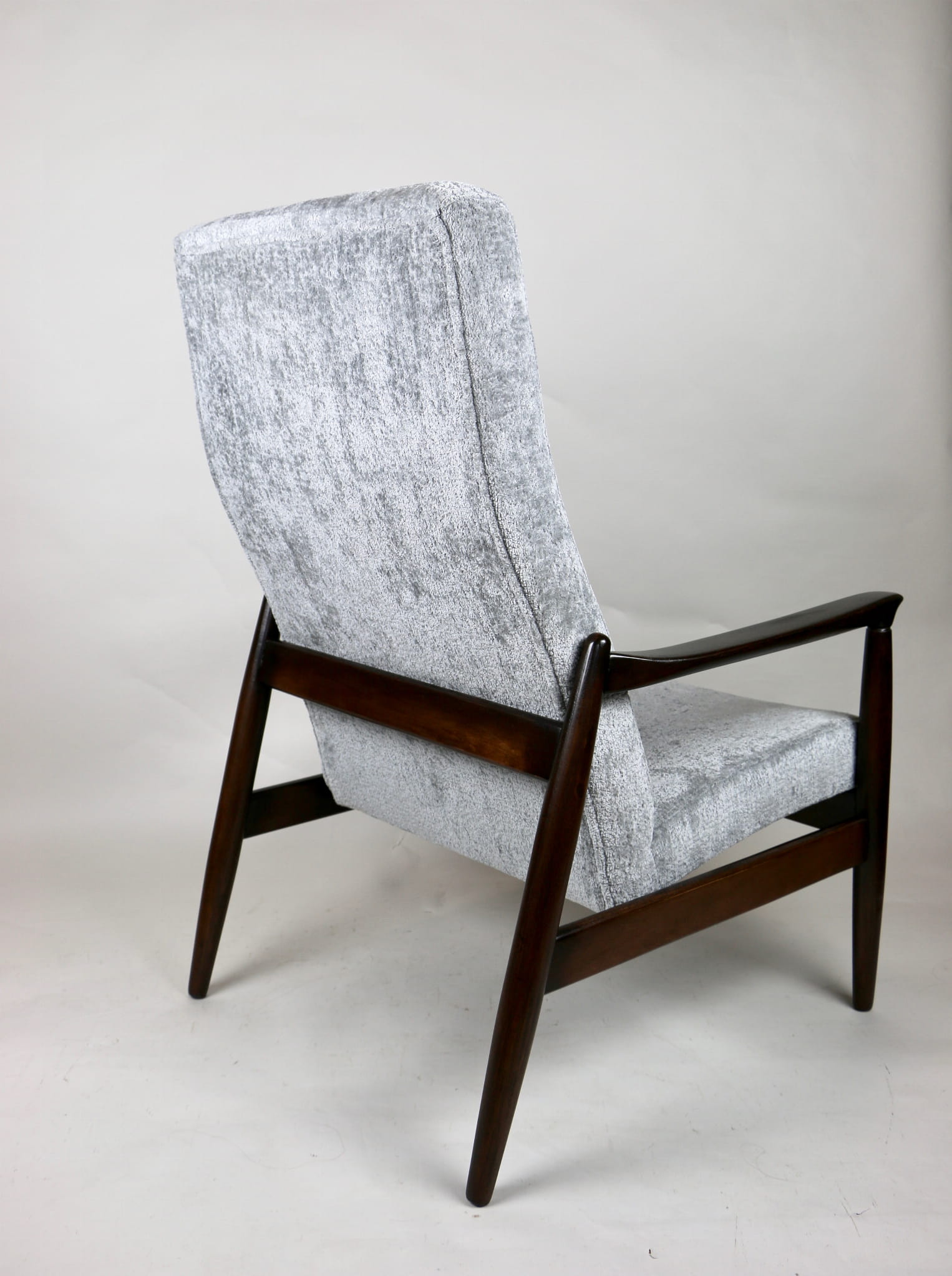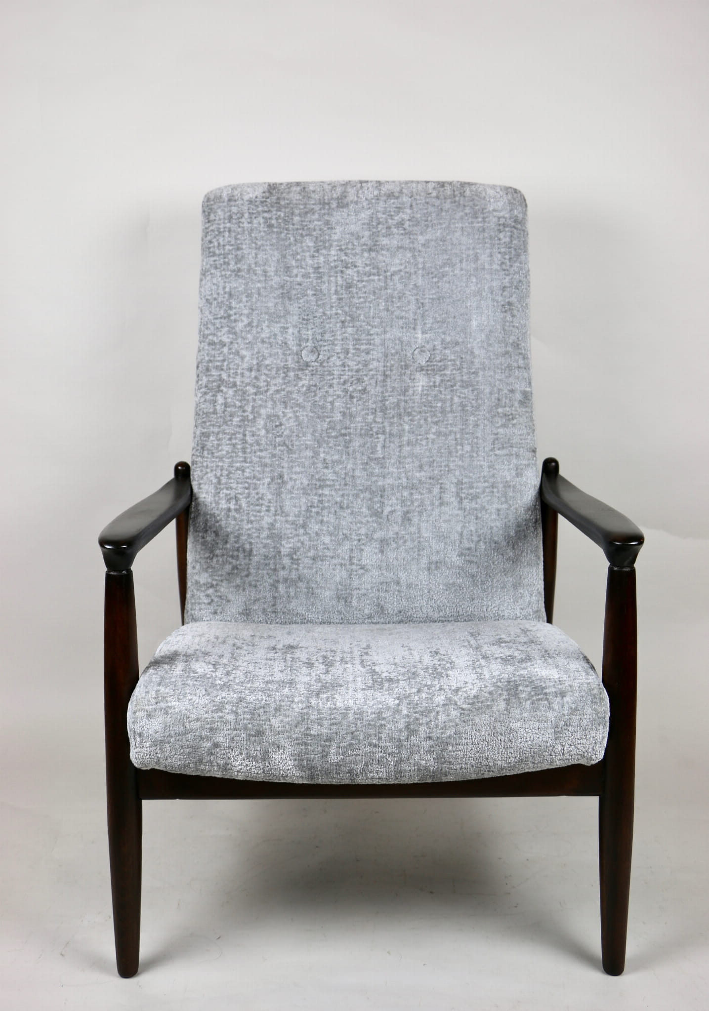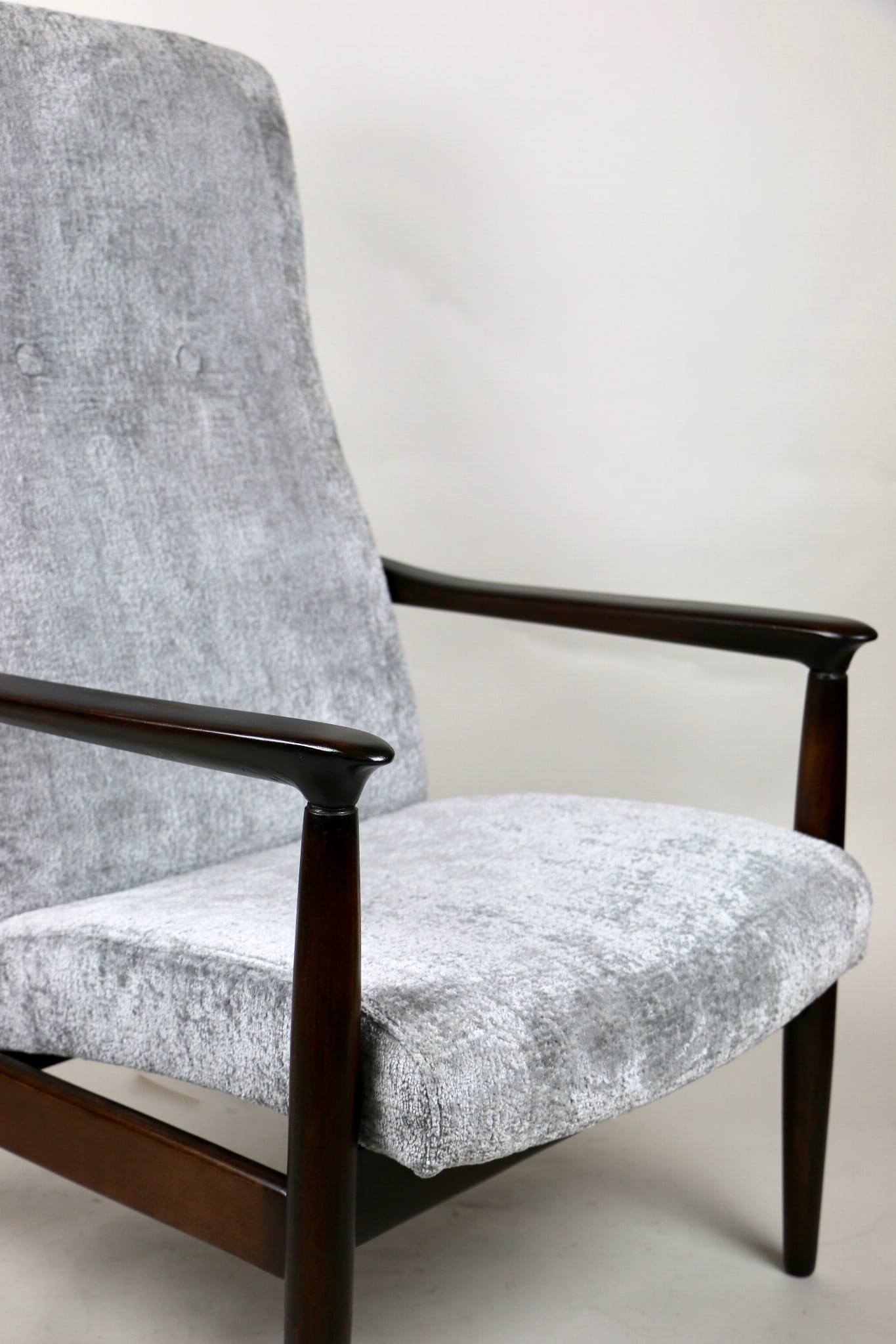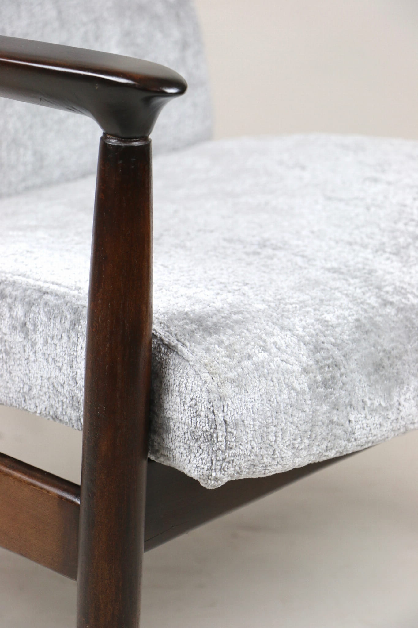 Fotel GFM - 64 zaprojektowany przez Edmunda Homę z wysokim oparciem, którym jest unikatem z lat 70tych. Kompletnie odrestaurowany - nowa tapicerka wraz z wypełnieniem została pokryta materiałem tapicerskim strukturalnym w kolorze srebrnym z serii Bergen. Podparcia i nóżki drewniane pokryte lakierem w kolorze ciemnego drewna.