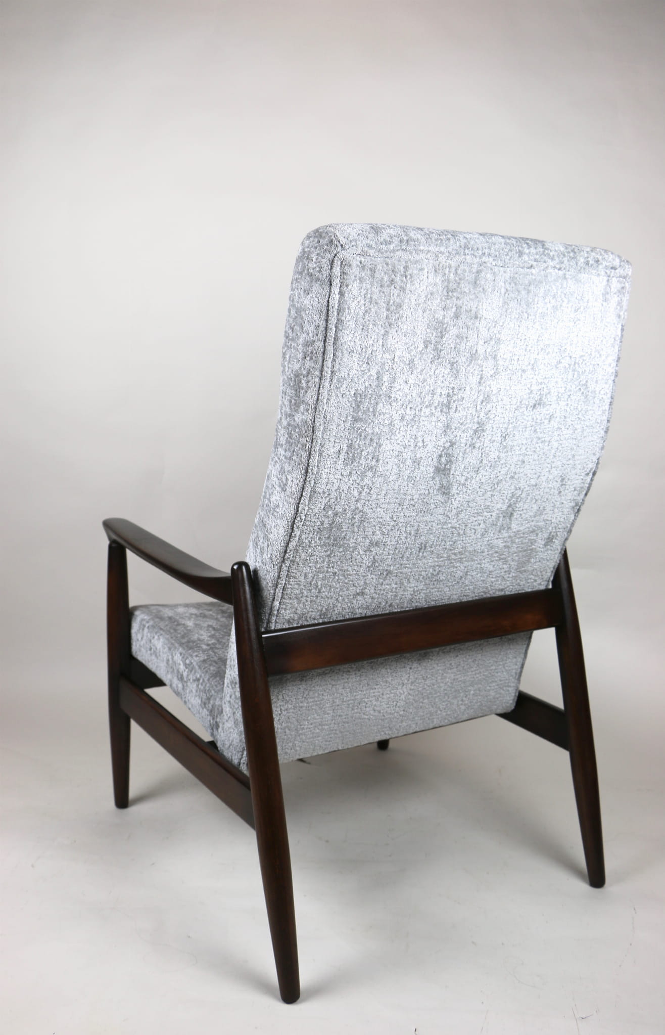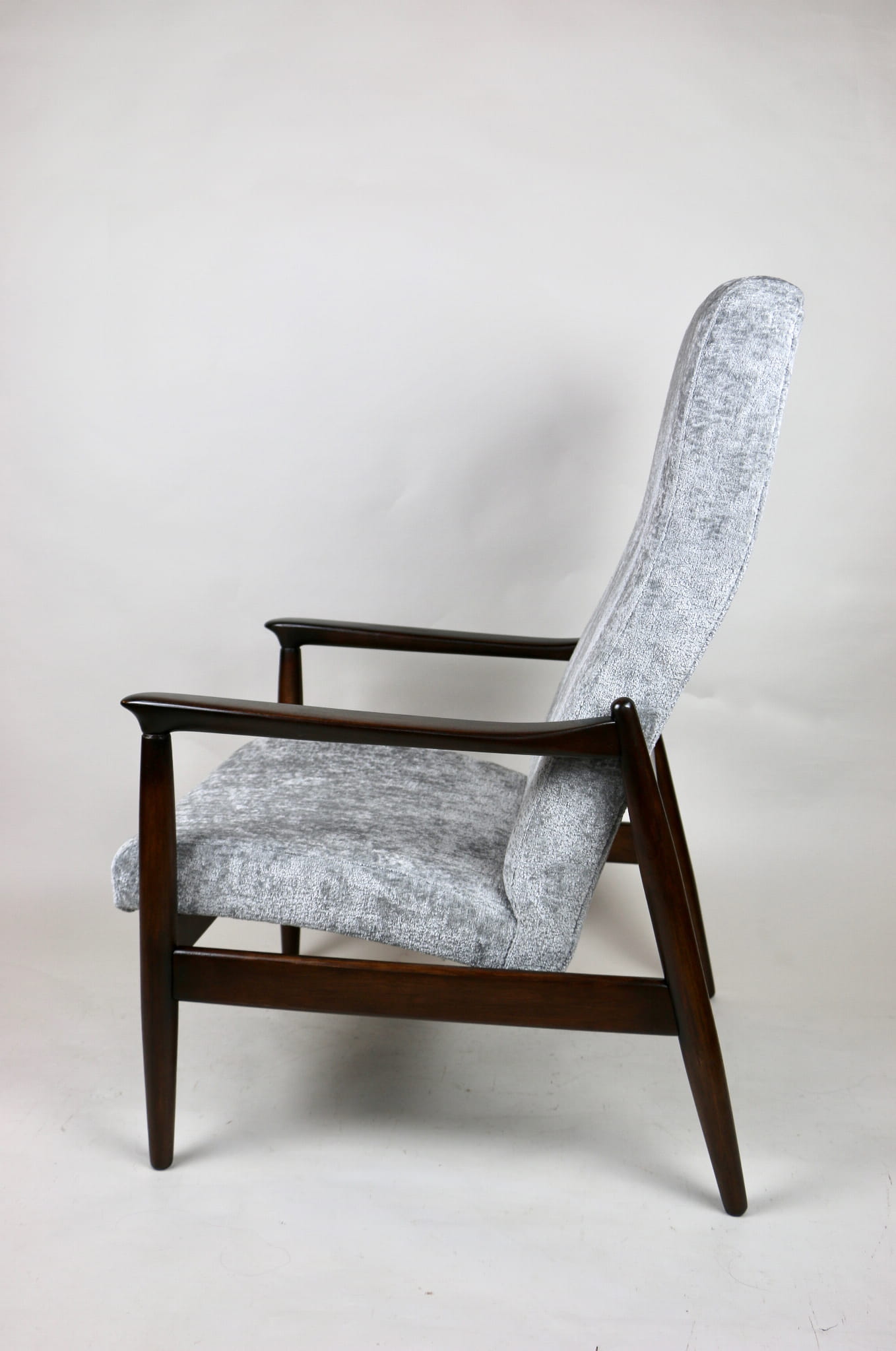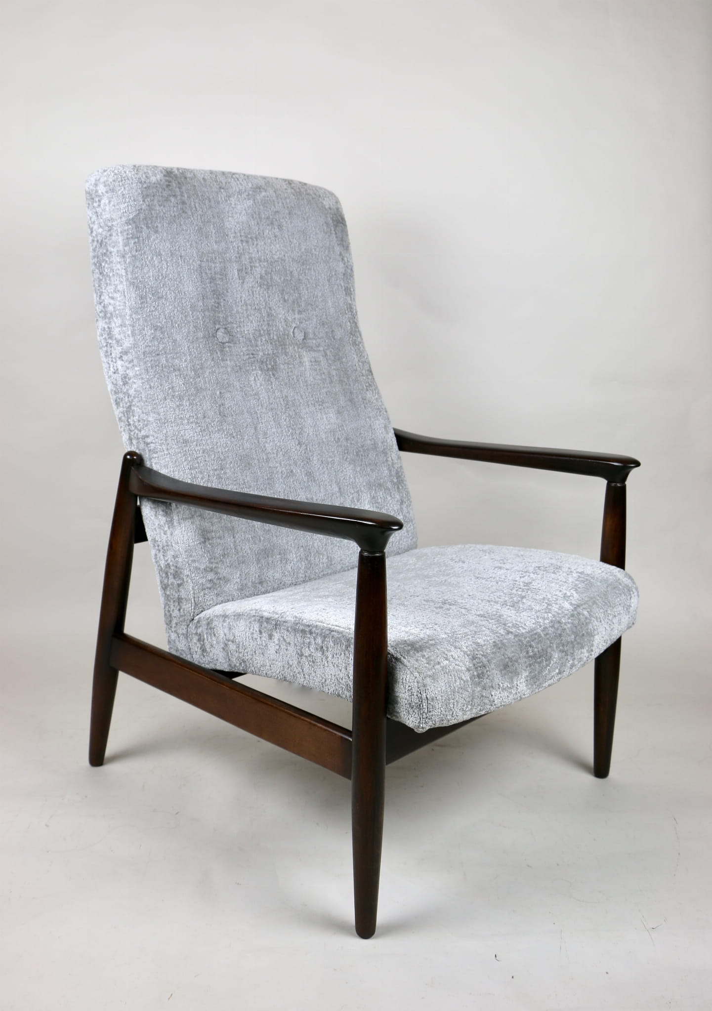 Fotel GFM - 64 zaprojektowany przez Edmunda Homę z wysokim oparciem, którym jest unikatem z lat 70tych. Kompletnie odrestaurowany - nowa tapicerka wraz z wypełnieniem została pokryta materiałem tapicerskim strukturalnym w kolorze srebrnym z serii Bergen. Podparcia i nóżki drewniane pokryte lakierem w kolorze ciemnego drewna.
