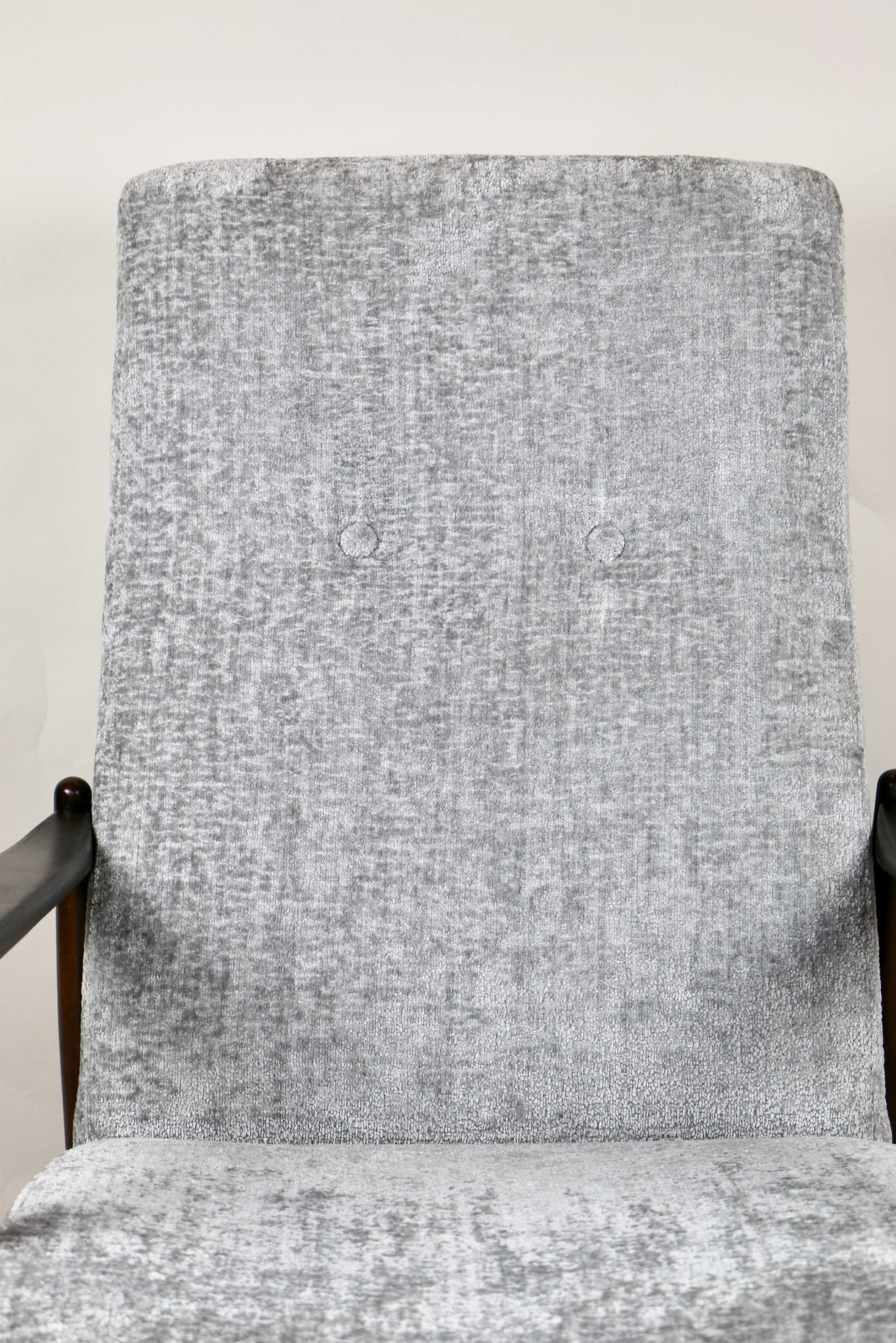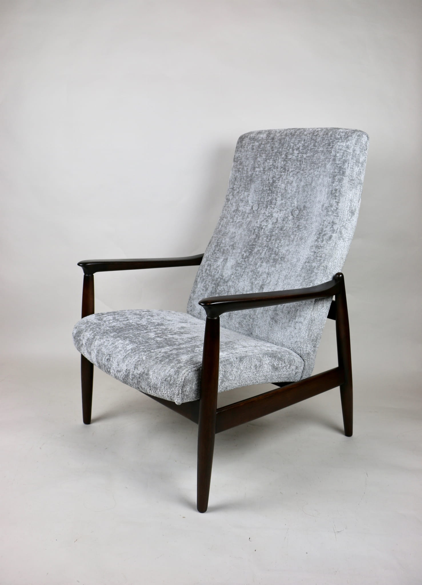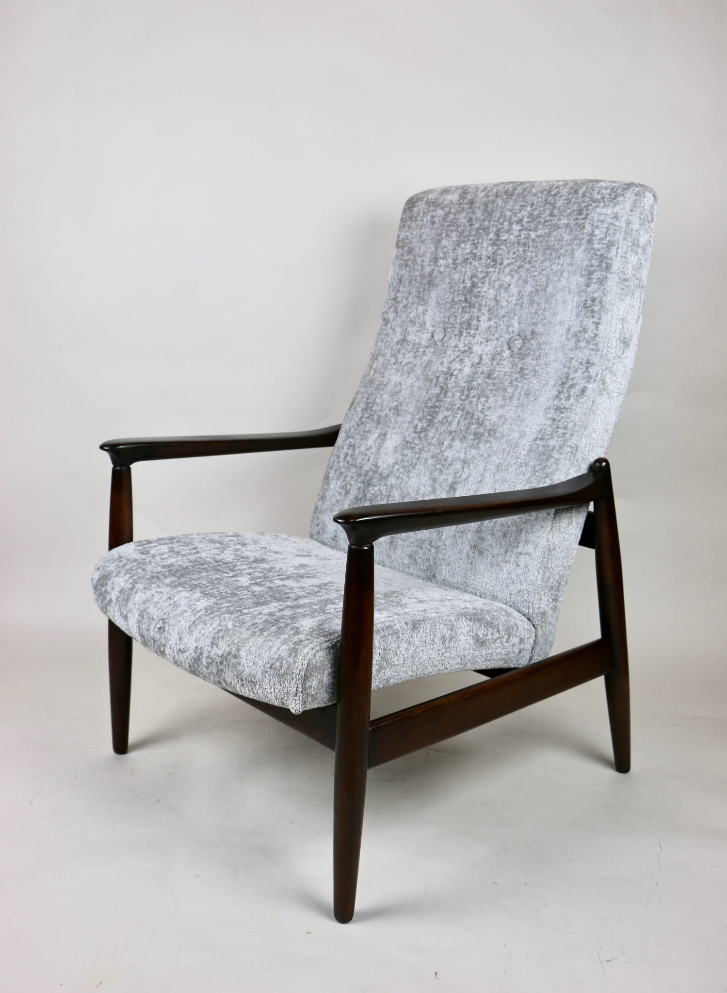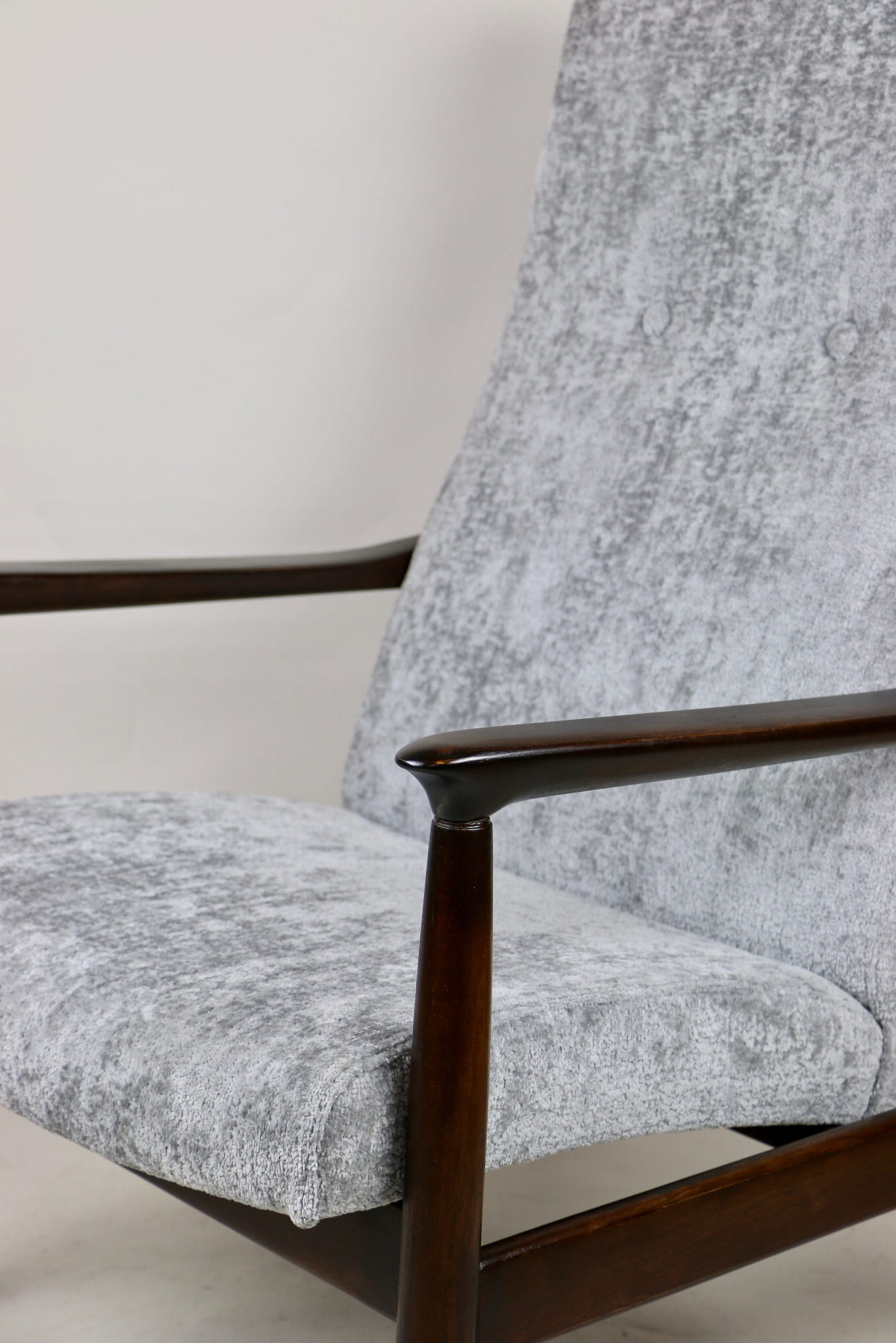 Fotel GFM - 64 zaprojektowany przez Edmunda Homę z wysokim oparciem, którym jest unikatem z lat 70tych. Kompletnie odrestaurowany - nowa tapicerka wraz z wypełnieniem została pokryta materiałem tapicerskim strukturalnym w kolorze srebrnym z serii Bergen. Podparcia i nóżki drewniane pokryte lakierem w kolorze ciemnego drewna.