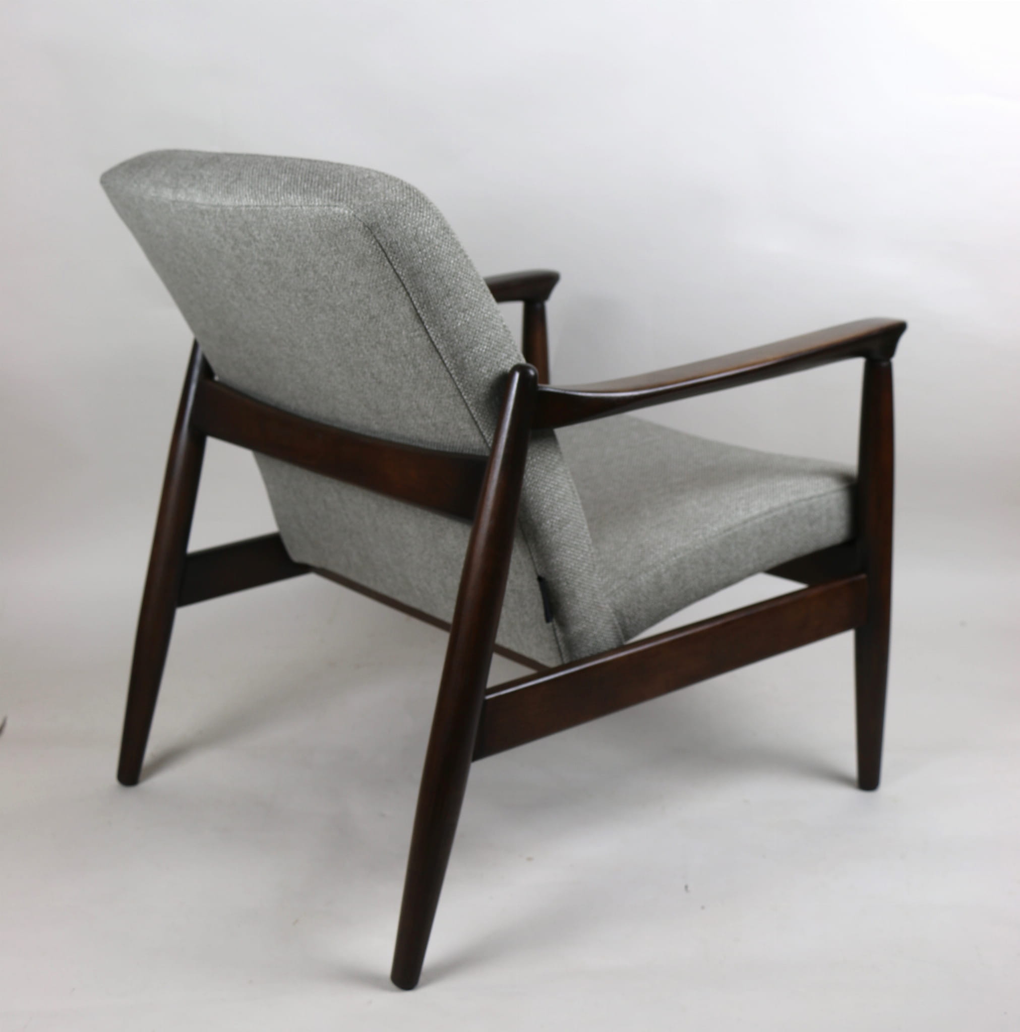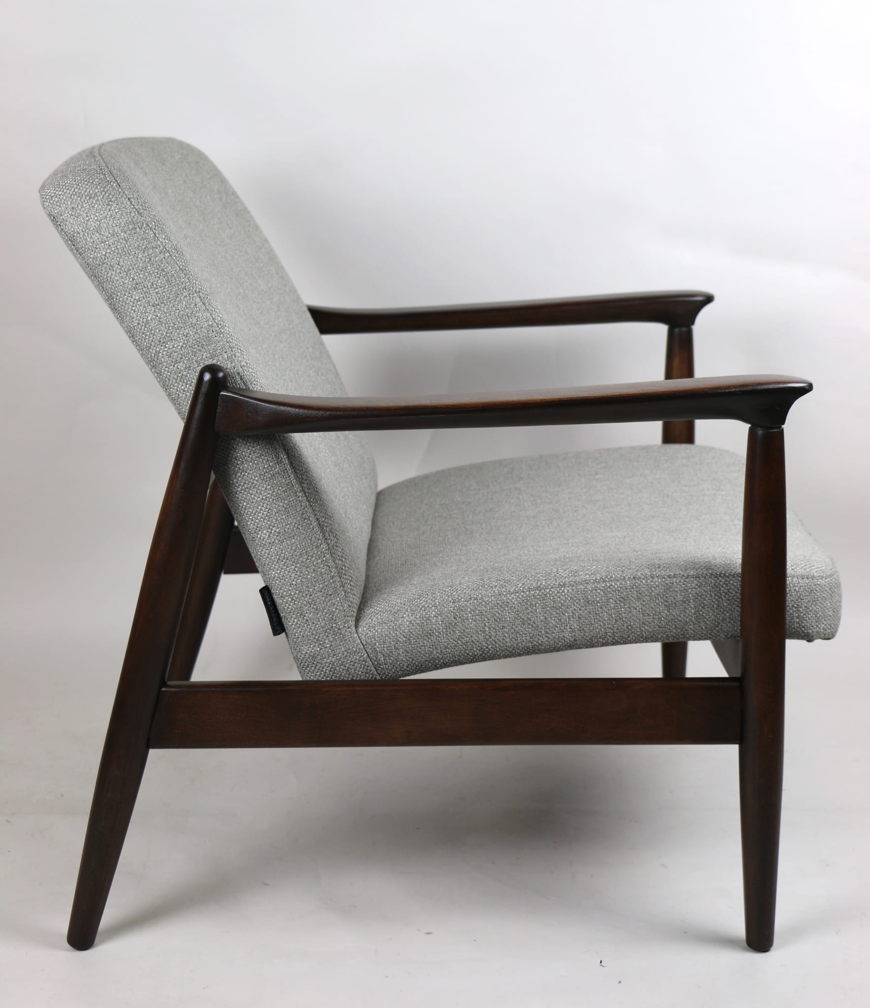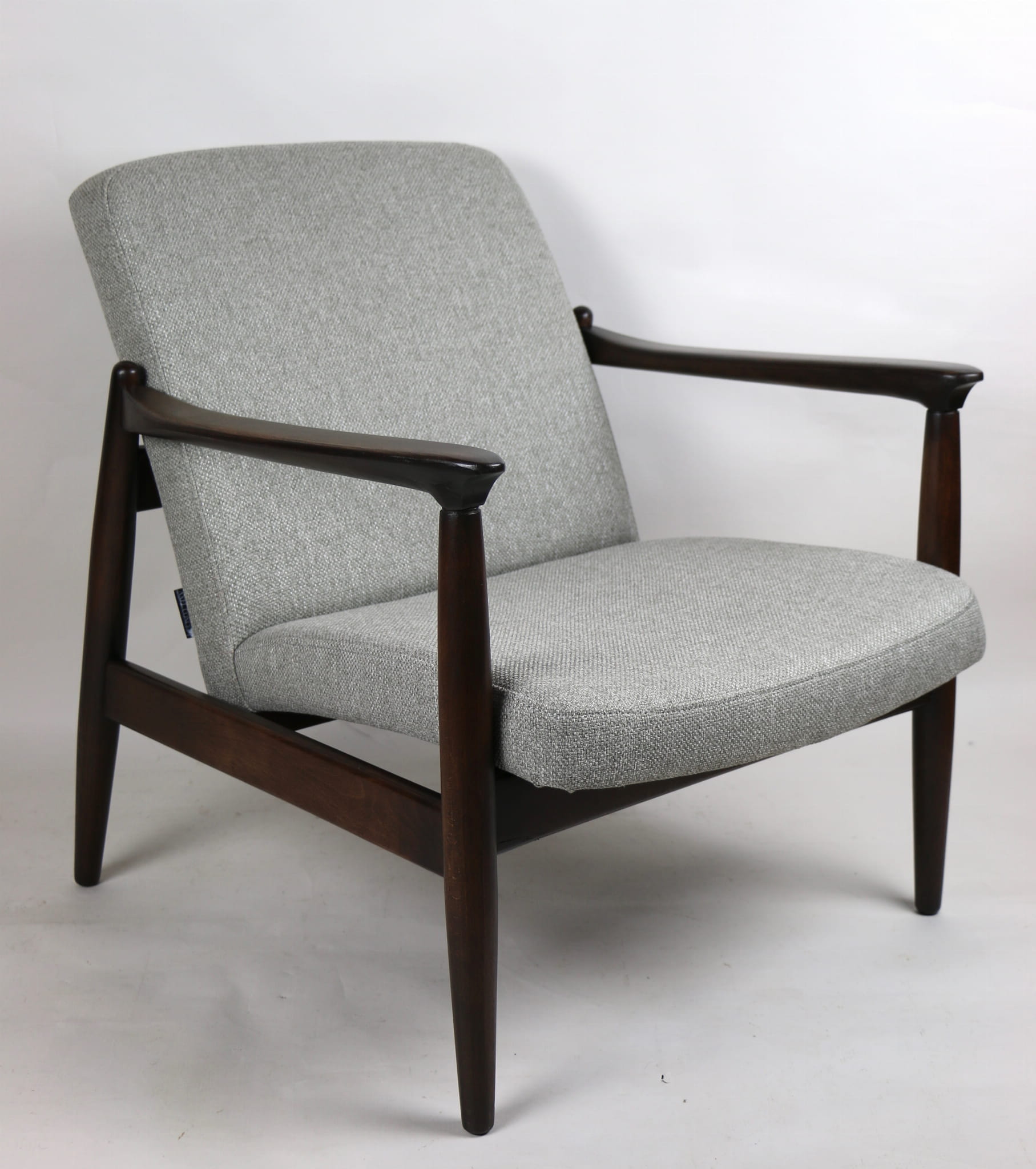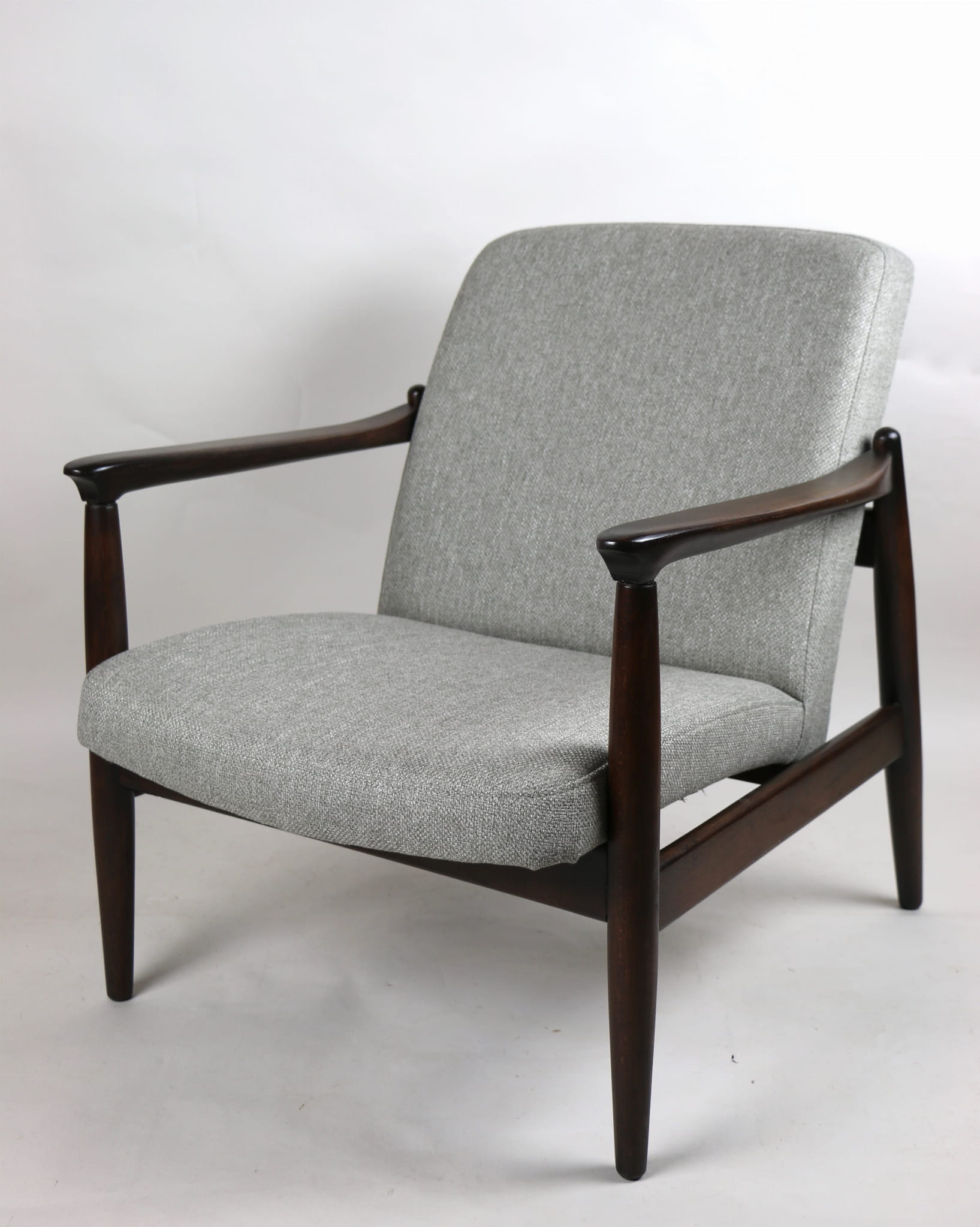 Fotel GFM - 64 zaprojektowany przez Edmunda Homę. Kompletnie odrestaurowany - nowa tapicerka wraz z wypełnieniem została pokryta materiałem tapicerskim strukturalnym plecionym w kolorze szarym. Podparcia i nóżki drewniane, pokryte lakierem w kolorze ciemnego drewna.