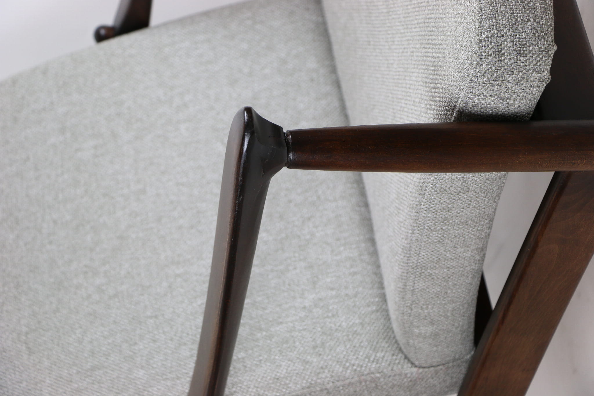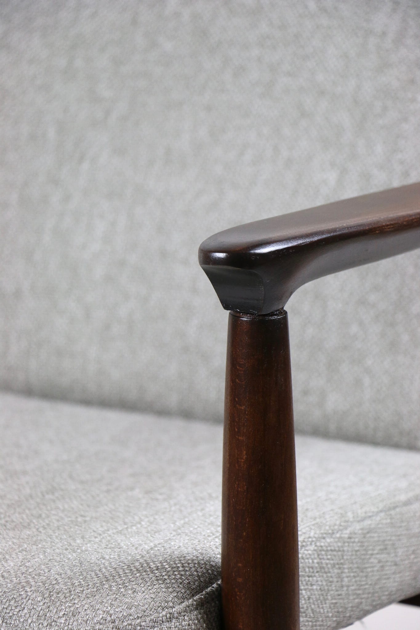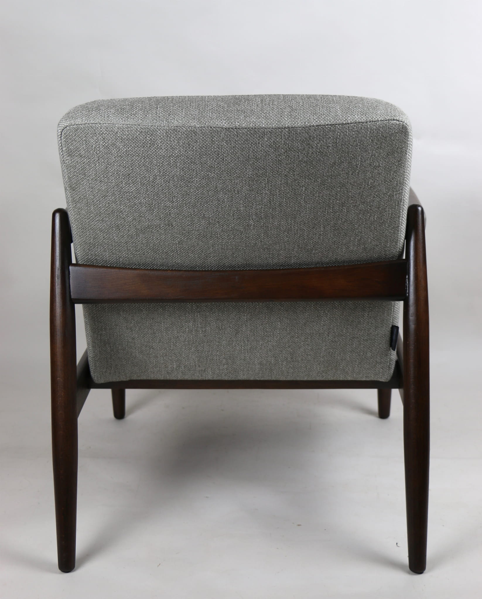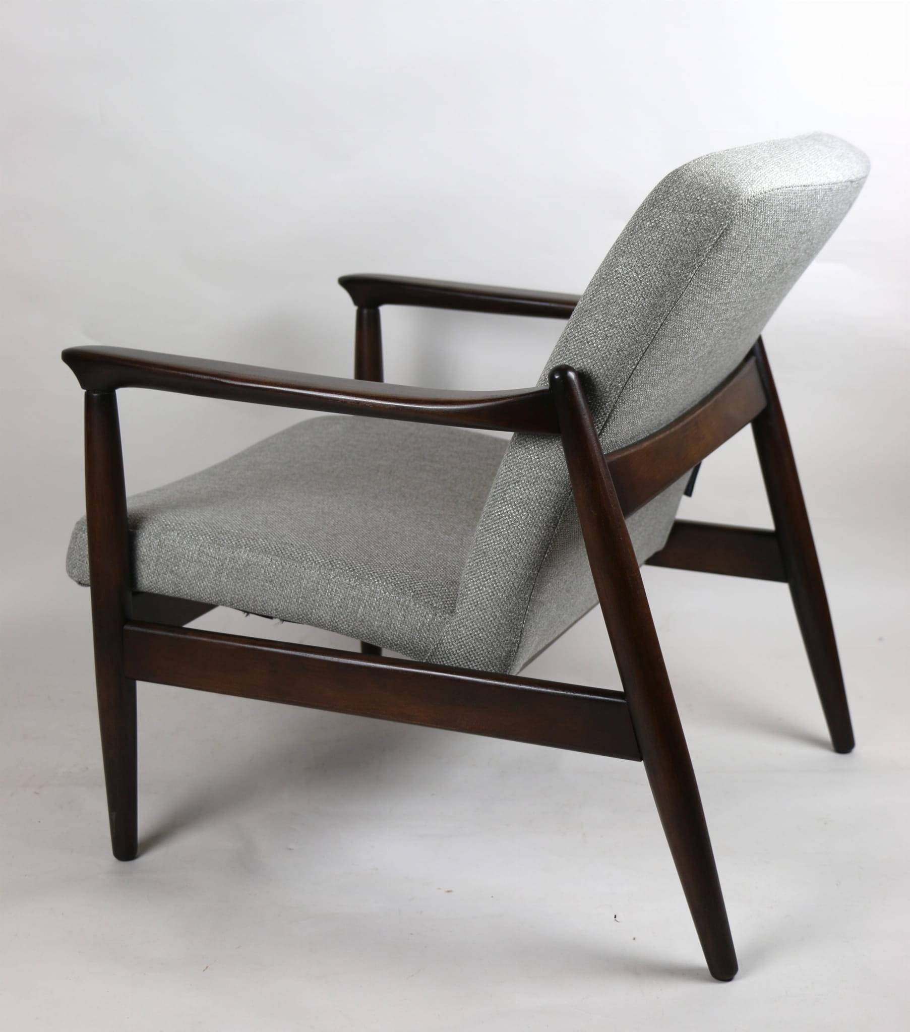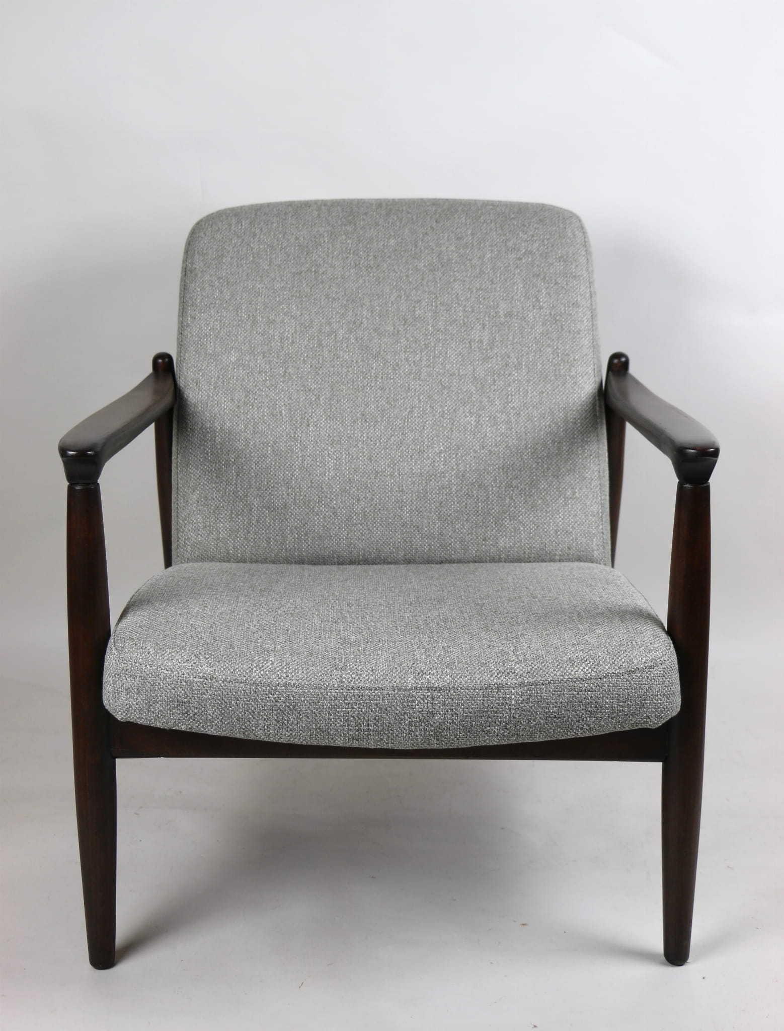 Fotel GFM - 64 zaprojektowany przez Edmunda Homę. Kompletnie odrestaurowany - nowa tapicerka wraz z wypełnieniem została pokryta materiałem tapicerskim strukturalnym plecionym w kolorze szarym. Podparcia i nóżki drewniane, pokryte lakierem w kolorze ciemnego drewna.