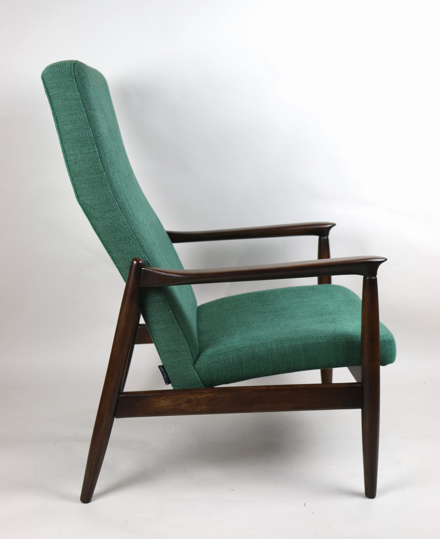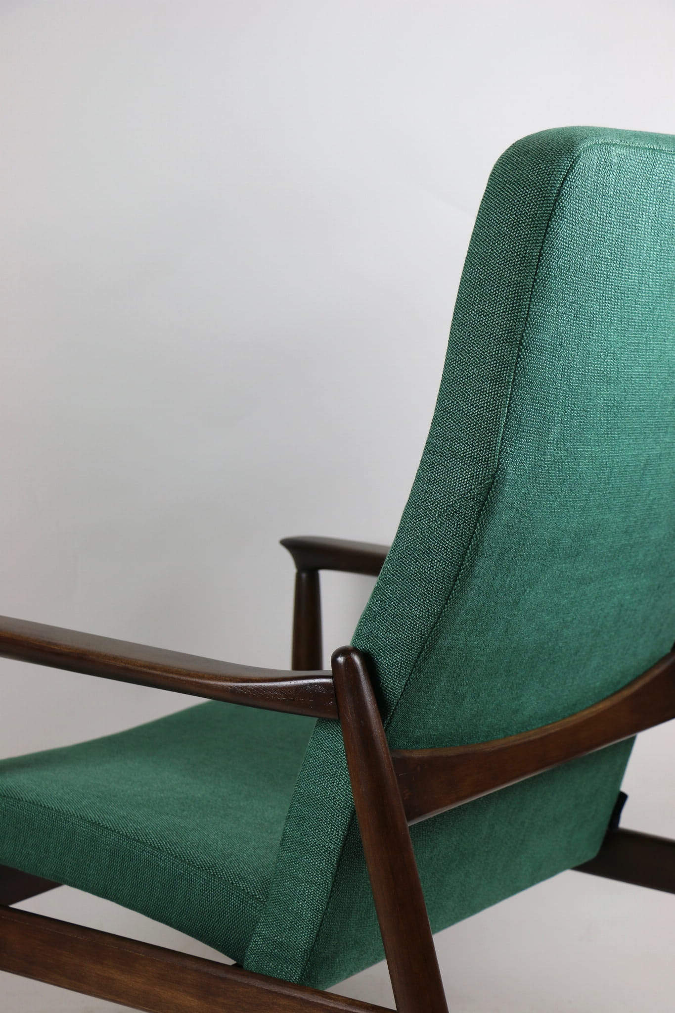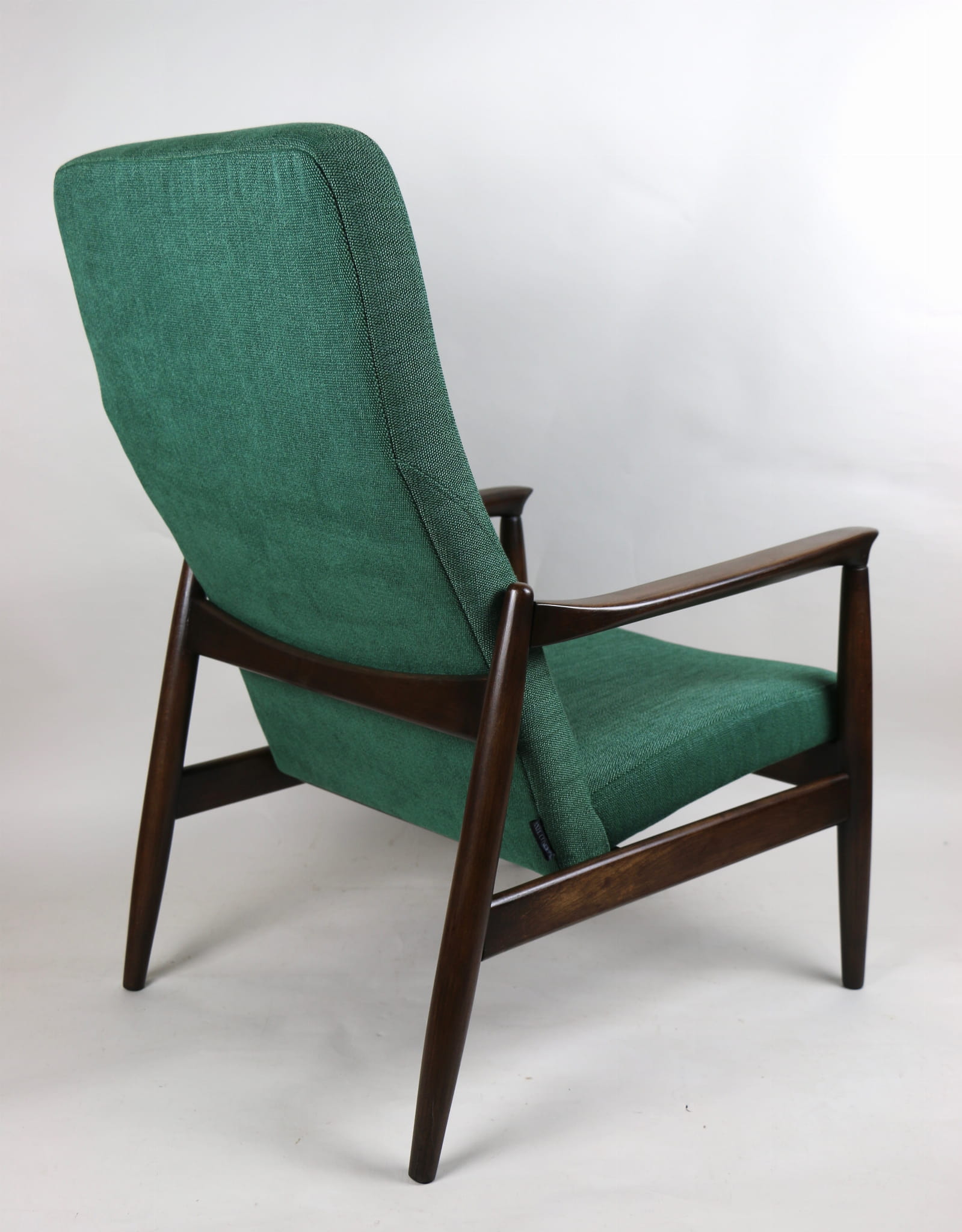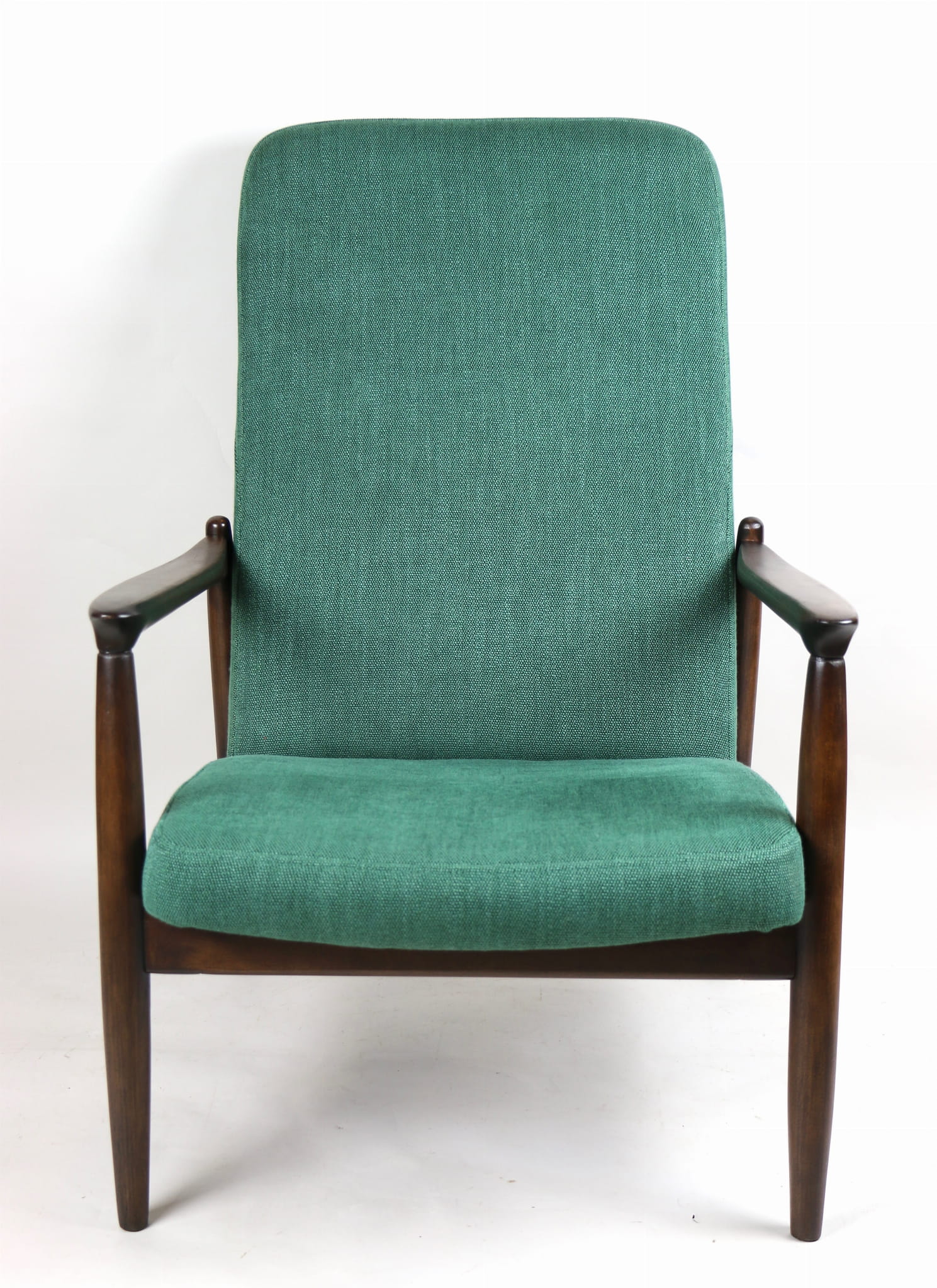 Fotel GFM - 64 zaprojektowany przez Edmunda Homę z wysokim oparciem, którym jest unikatem z lat 70tych. Kompletnie odrestaurowany - nowa tapicerka wraz z wypełnieniem została pokryta materiałem tapicerskim strukturalnym plecionym w kolorze zielonym. Podparcia i nóżki drewniane, pokryte lakierem w kolorze ciemnego drewna.