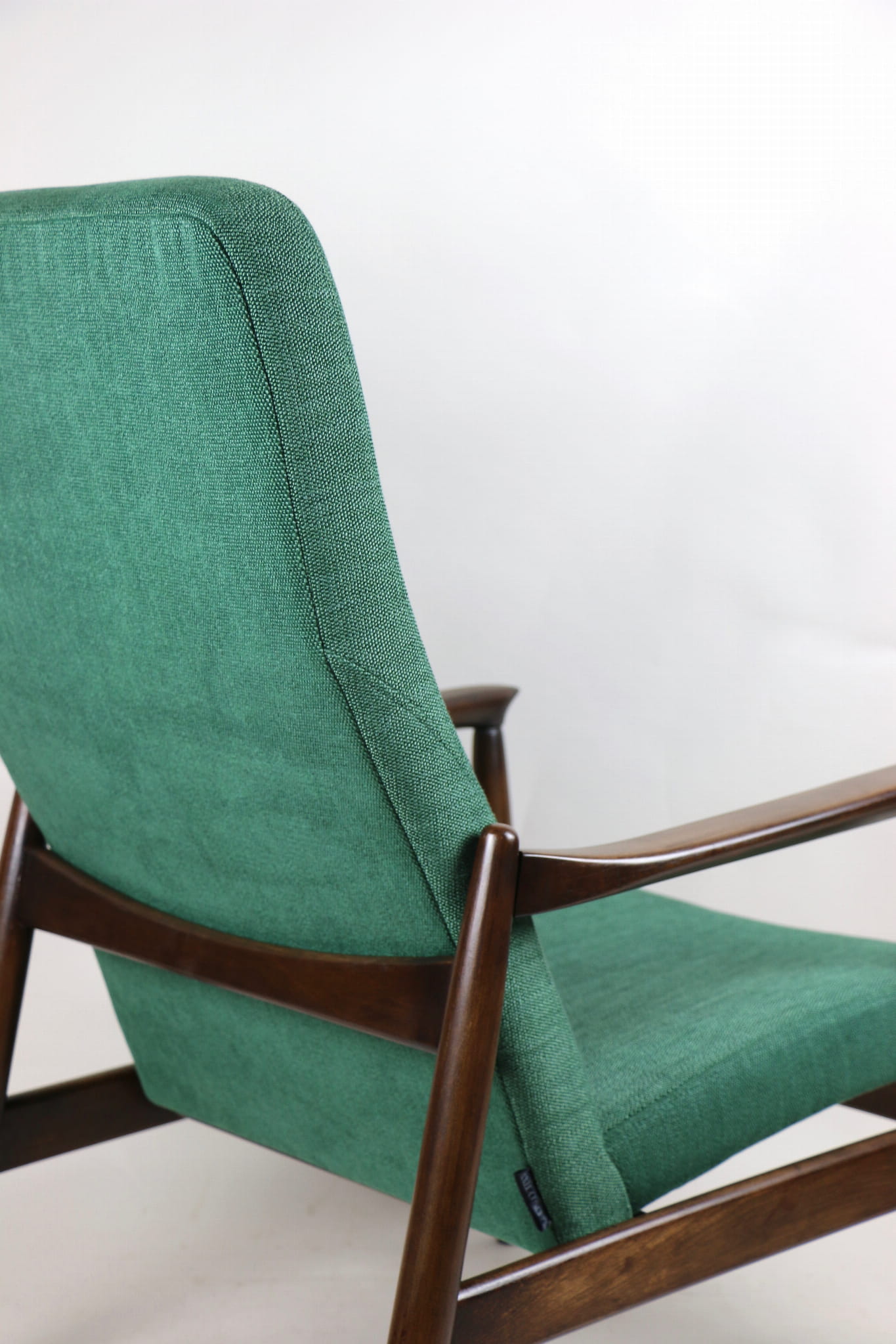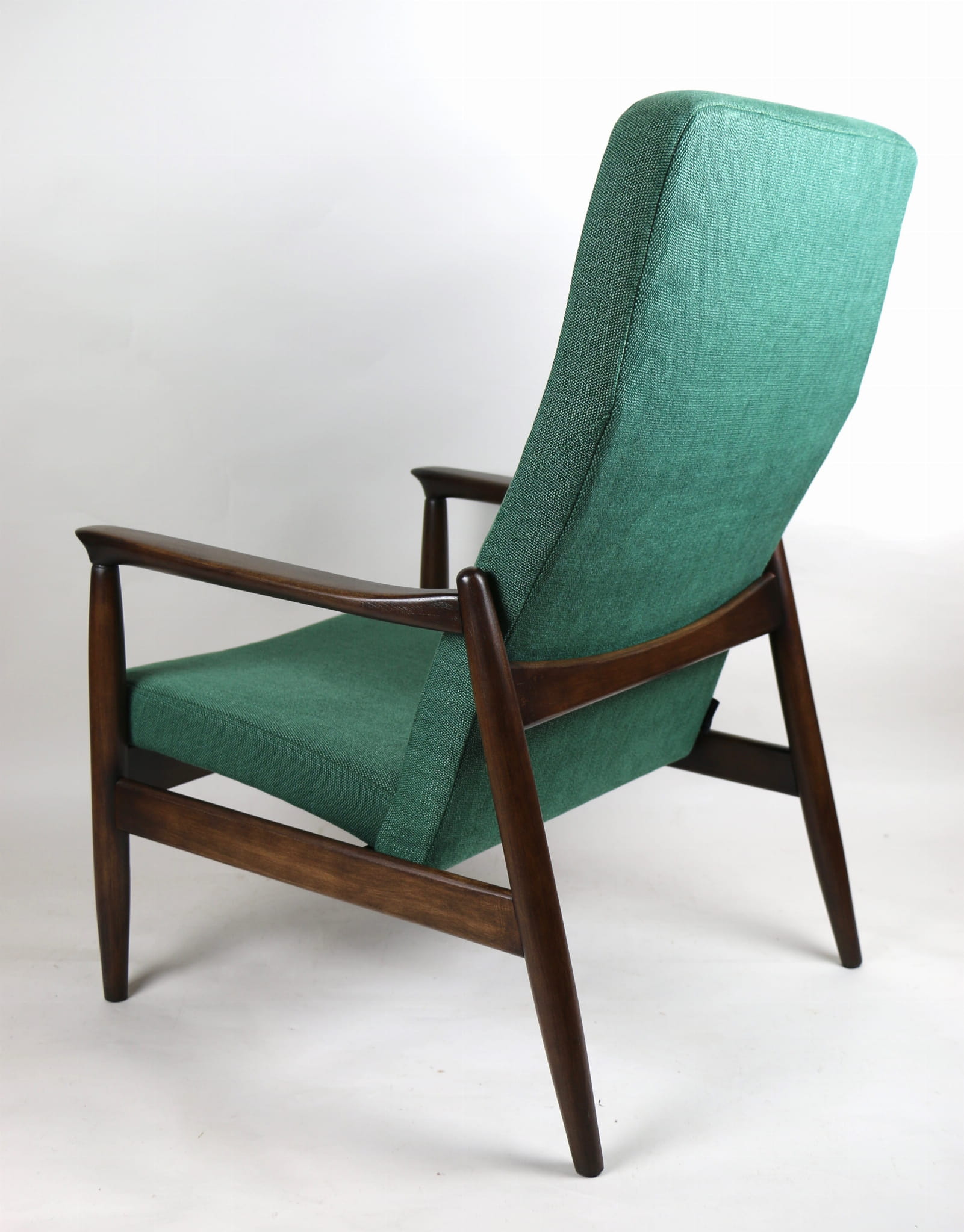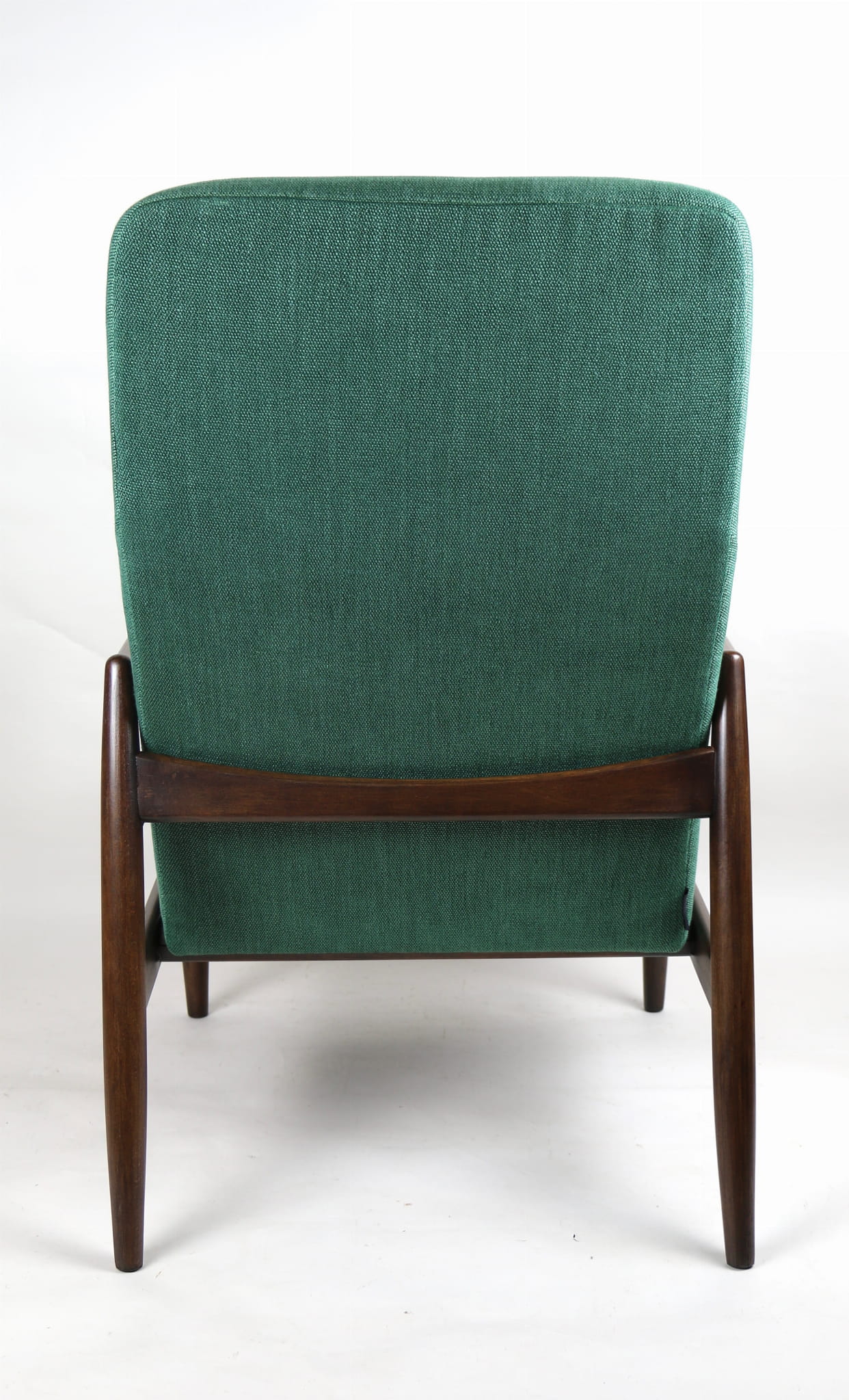 Fotel GFM - 64 zaprojektowany przez Edmunda Homę z wysokim oparciem, którym jest unikatem z lat 70tych. Kompletnie odrestaurowany - nowa tapicerka wraz z wypełnieniem została pokryta materiałem tapicerskim strukturalnym plecionym w kolorze zielonym. Podparcia i nóżki drewniane, pokryte lakierem w kolorze ciemnego drewna.