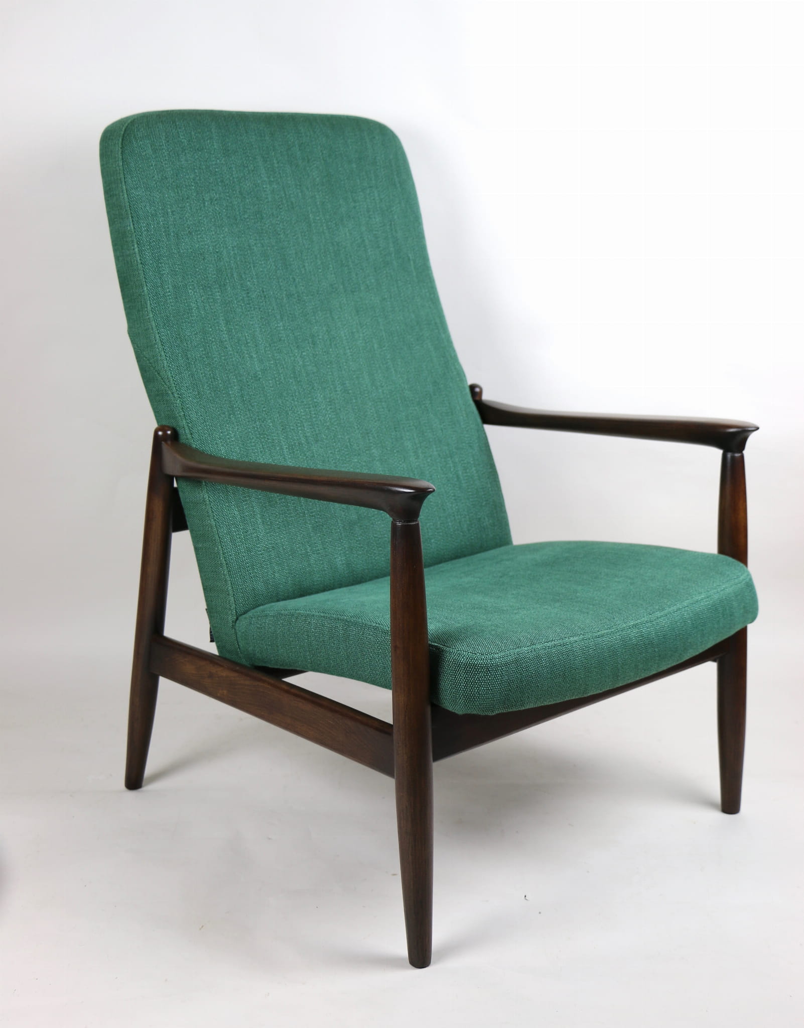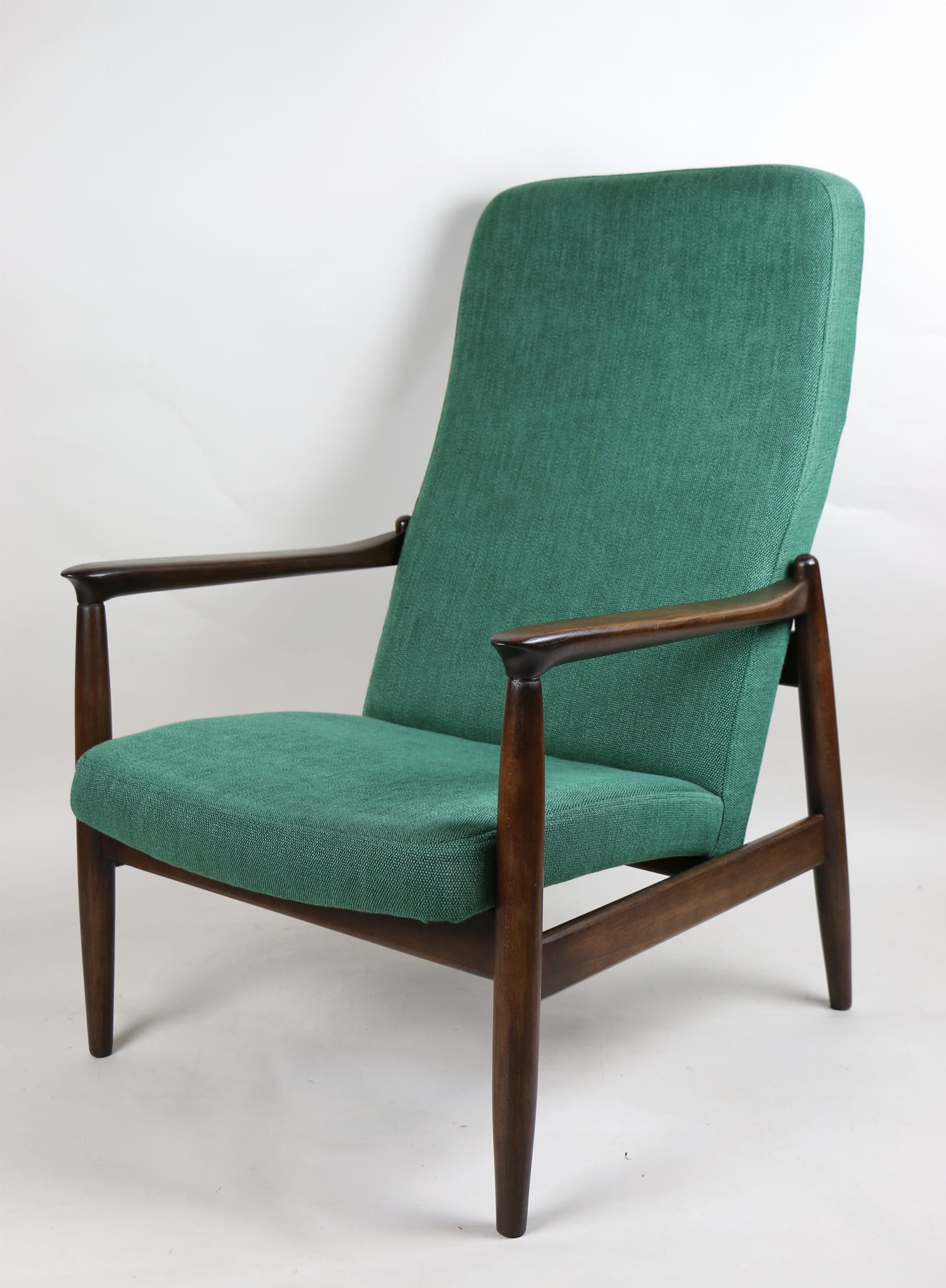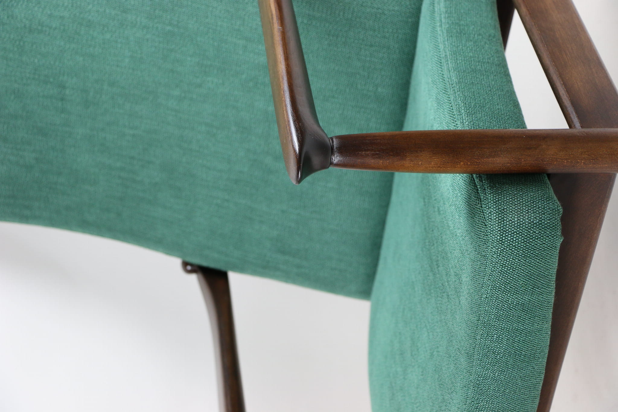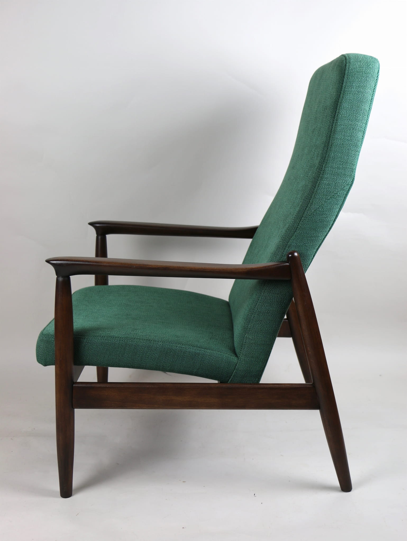 Fotel GFM - 64 zaprojektowany przez Edmunda Homę z wysokim oparciem, którym jest unikatem z lat 70tych. Kompletnie odrestaurowany - nowa tapicerka wraz z wypełnieniem została pokryta materiałem tapicerskim strukturalnym plecionym w kolorze zielonym. Podparcia i nóżki drewniane, pokryte lakierem w kolorze ciemnego drewna.