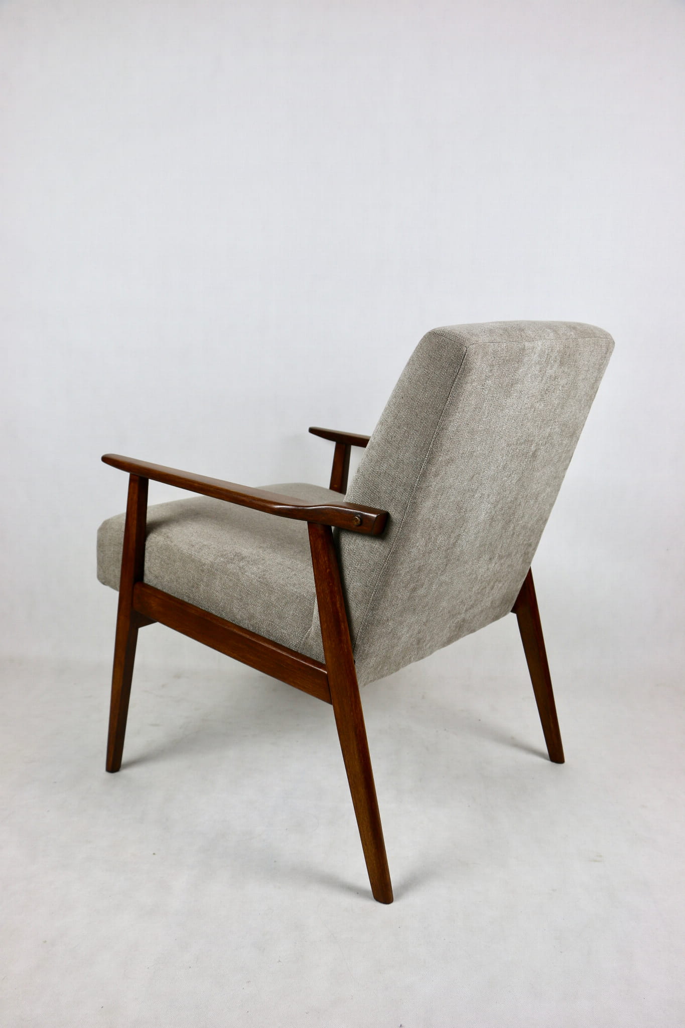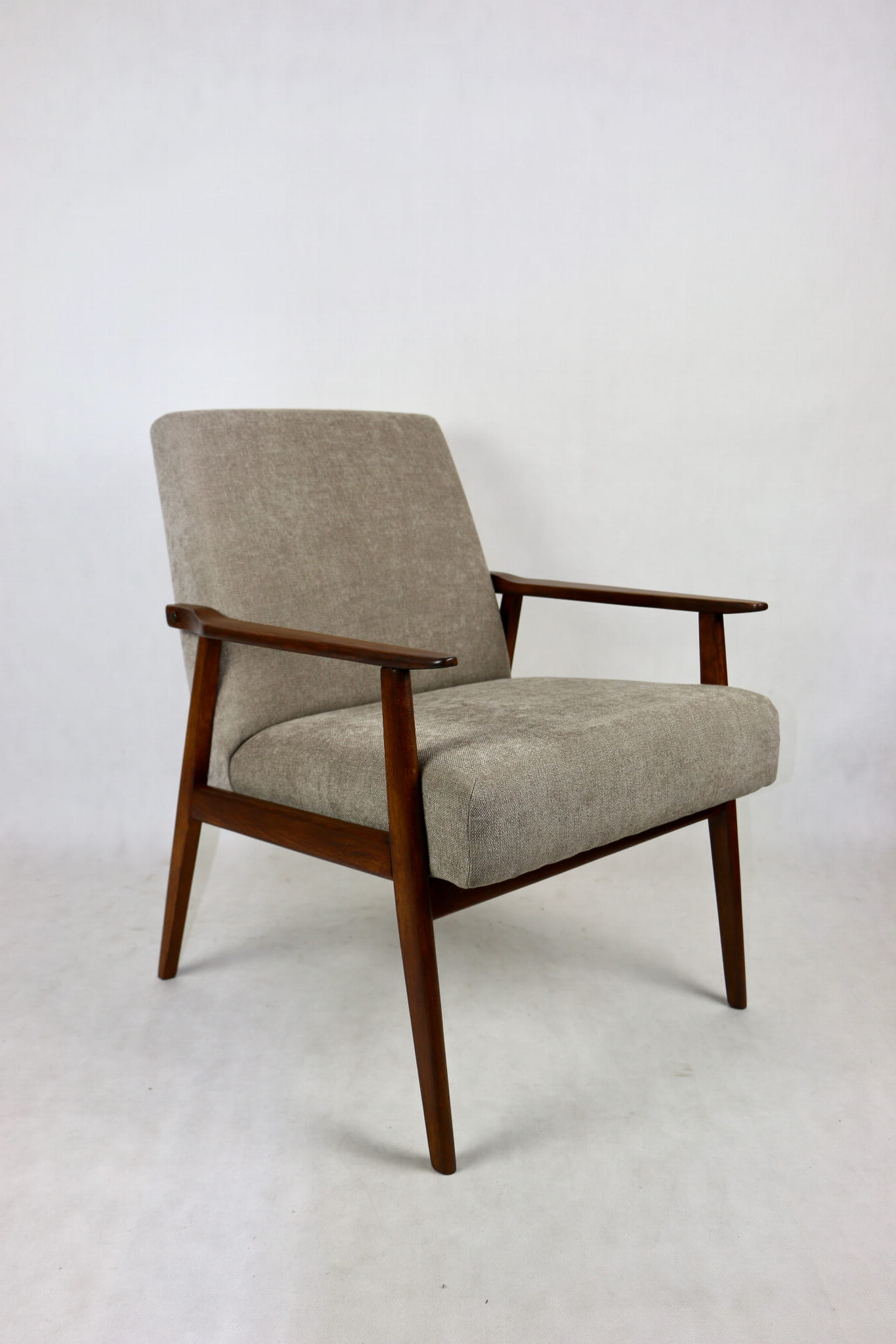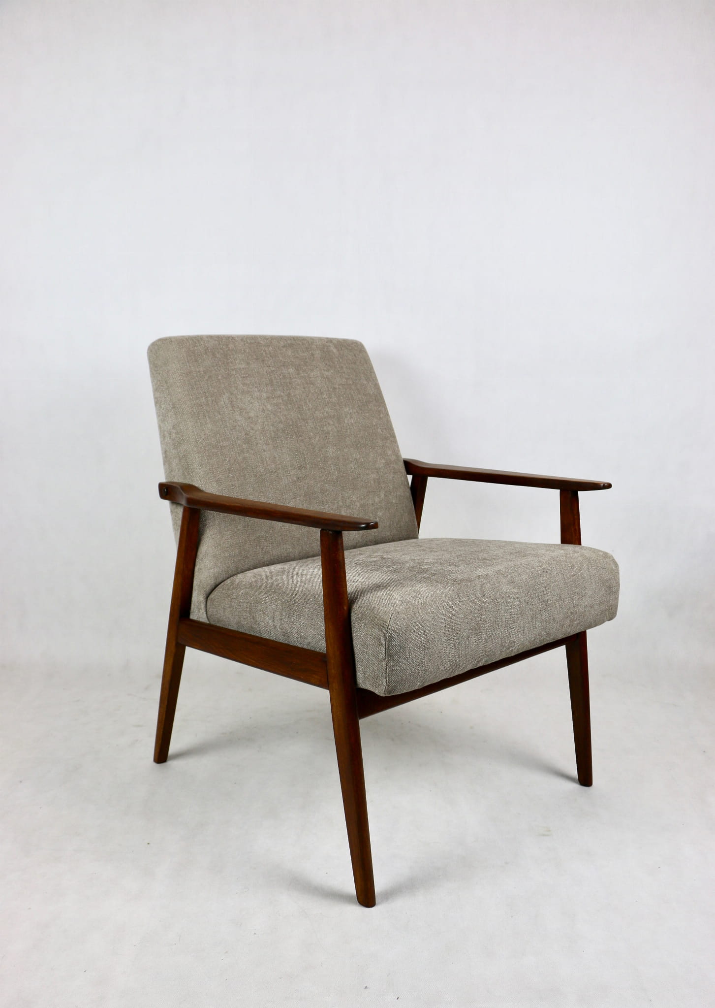 Fotel Śnieżnik pochodzi z lat 70. Mebel został całkowicie odrestaurowany. Obity materiałym strukturalnym w kolorze jasno - brązowym z serii Boston. Stelaż drewniany połączony z podłokietnikami w kolorze orzechowo- brązowym.
