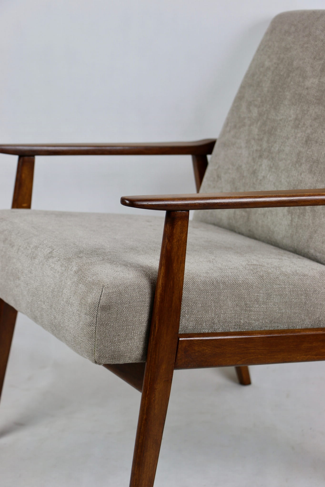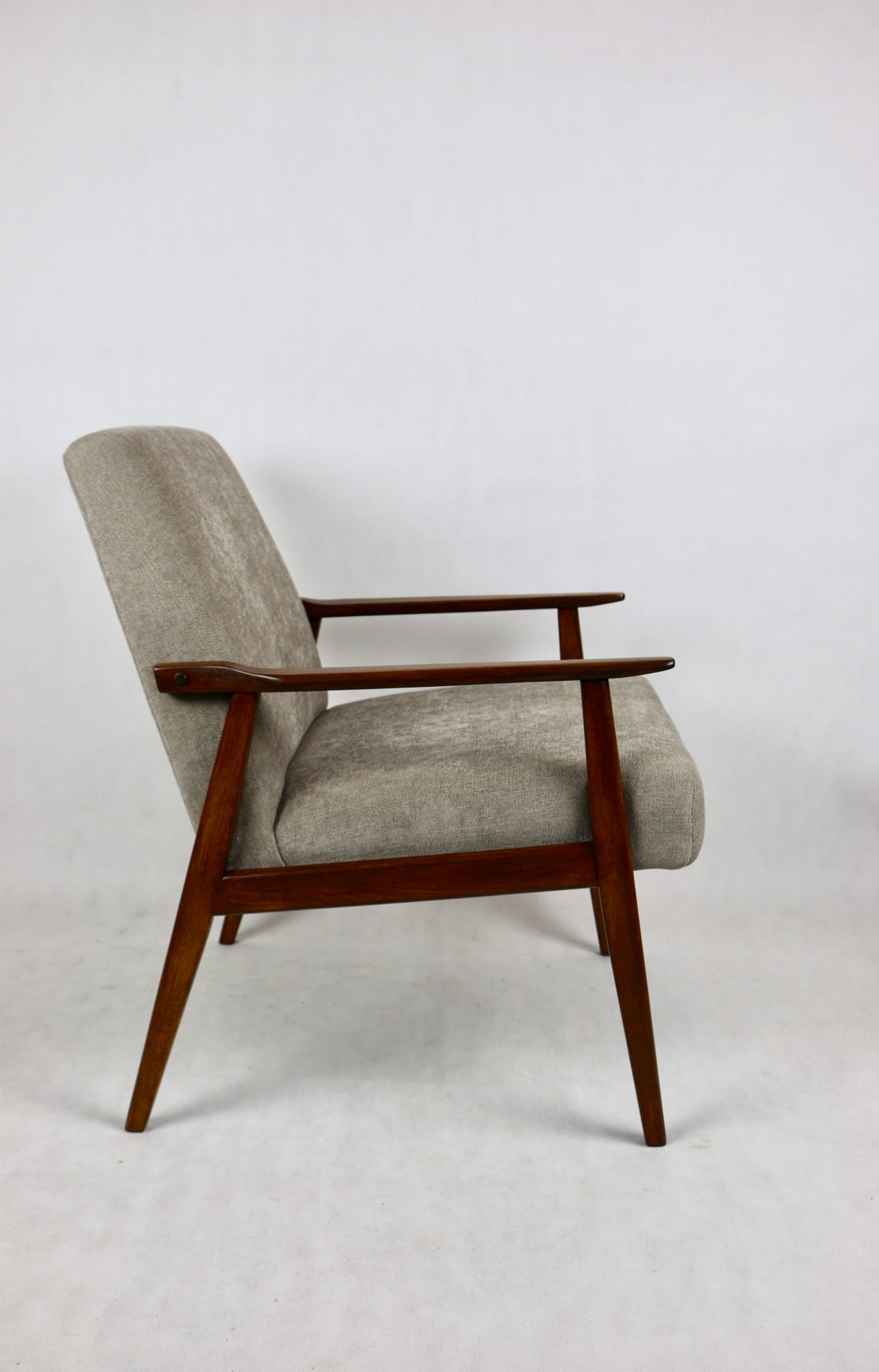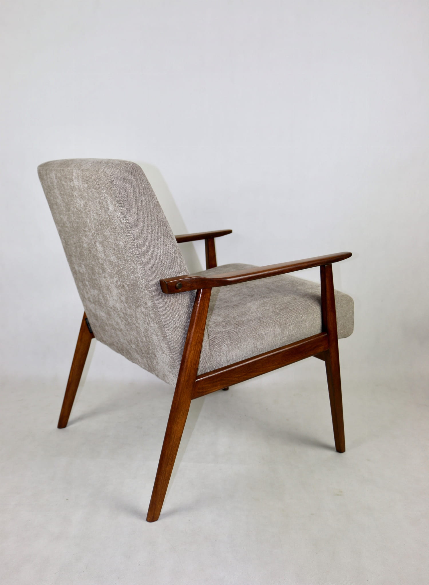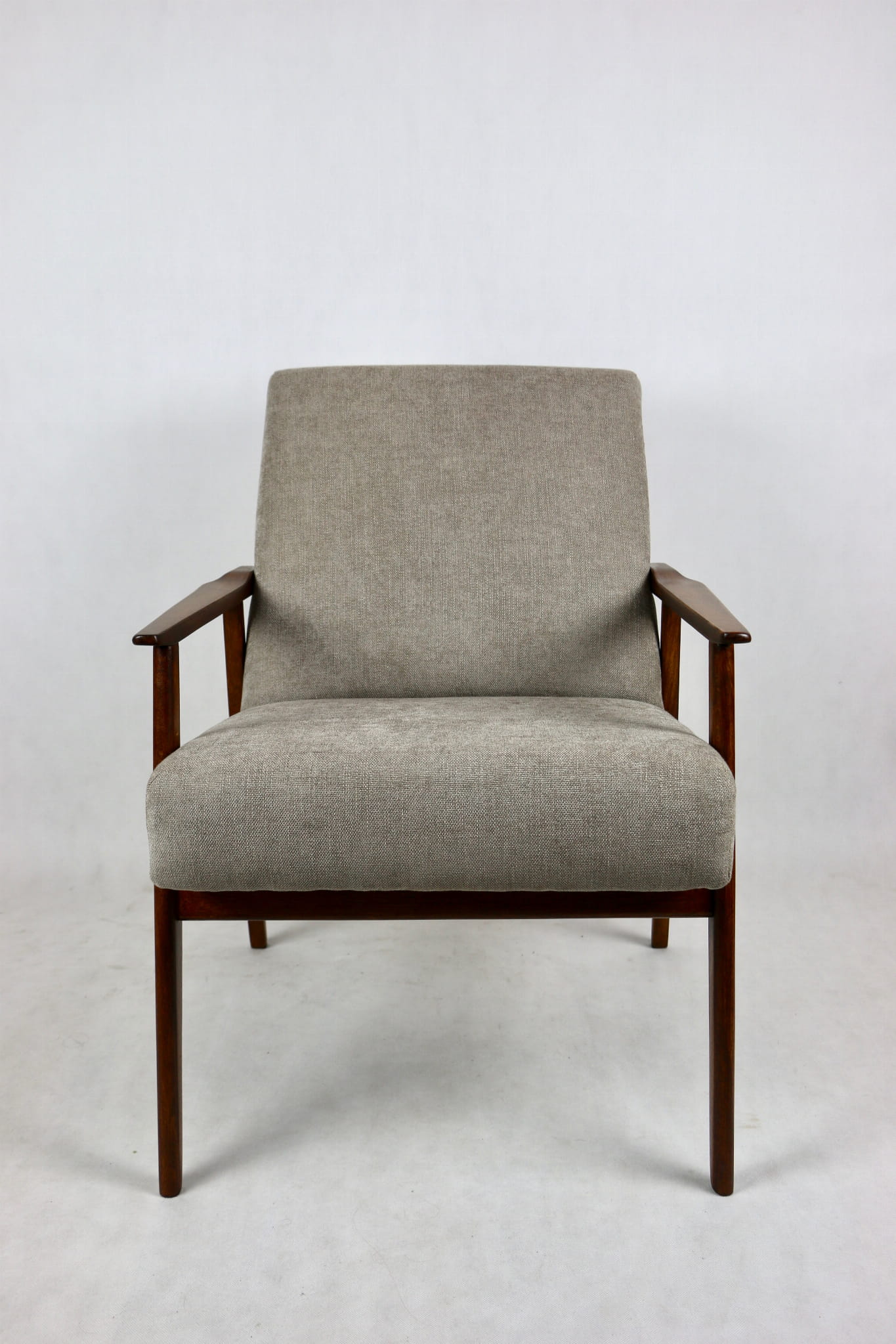 Fotel Śnieżnik pochodzi z lat 70. Mebel został całkowicie odrestaurowany. Obity materiałym strukturalnym w kolorze jasno - brązowym z serii Boston. Stelaż drewniany połączony z podłokietnikami w kolorze orzechowo- brązowym.