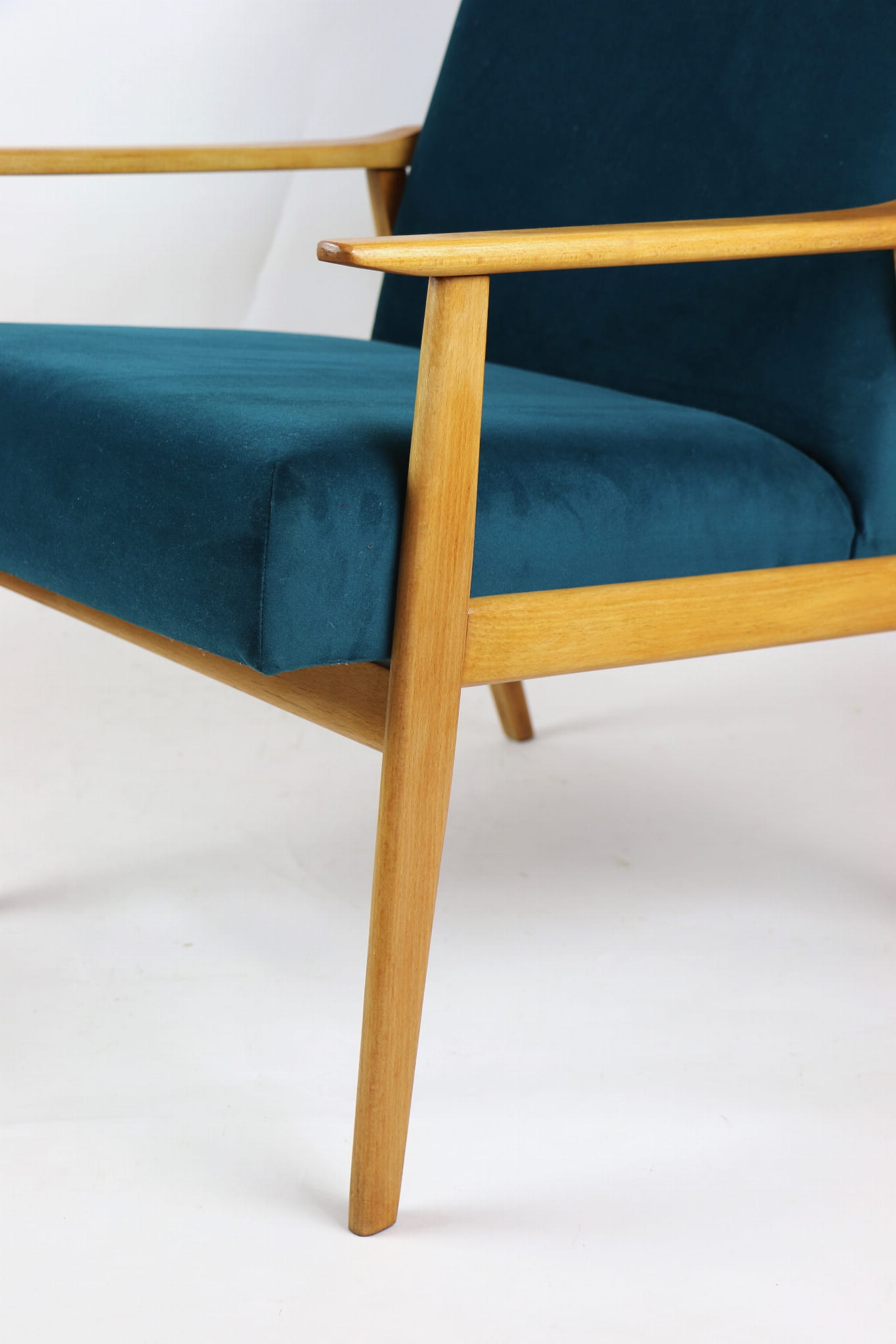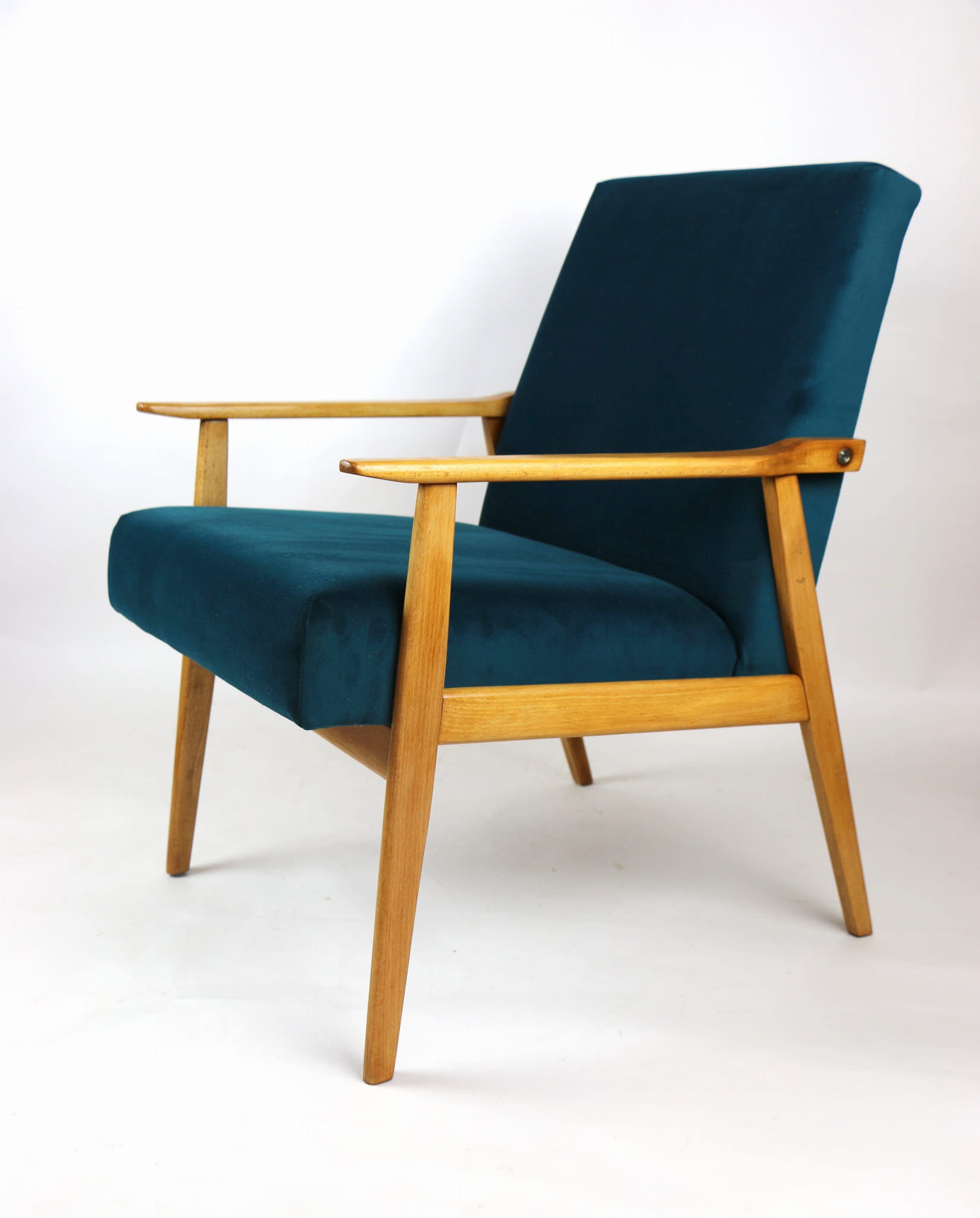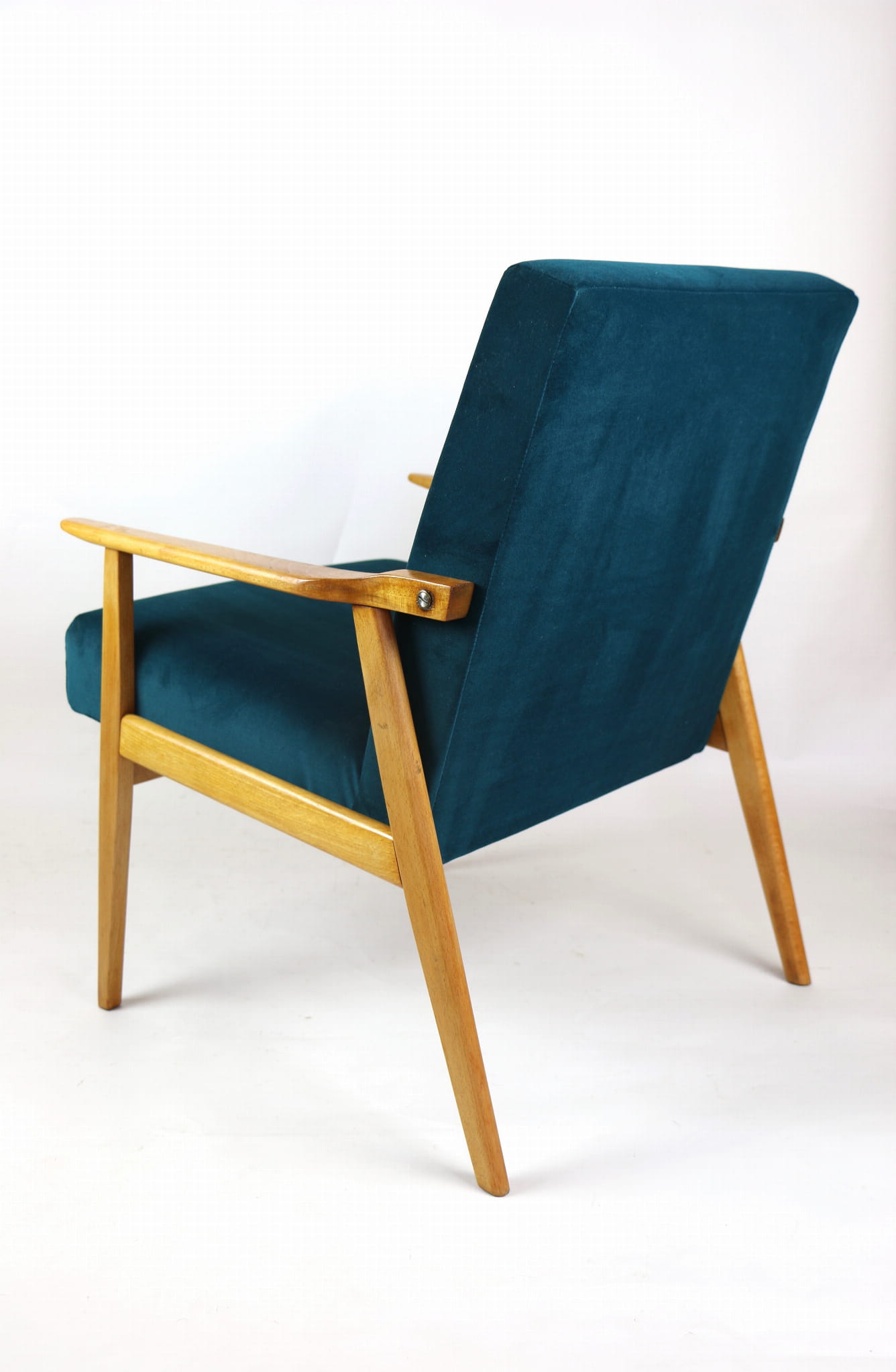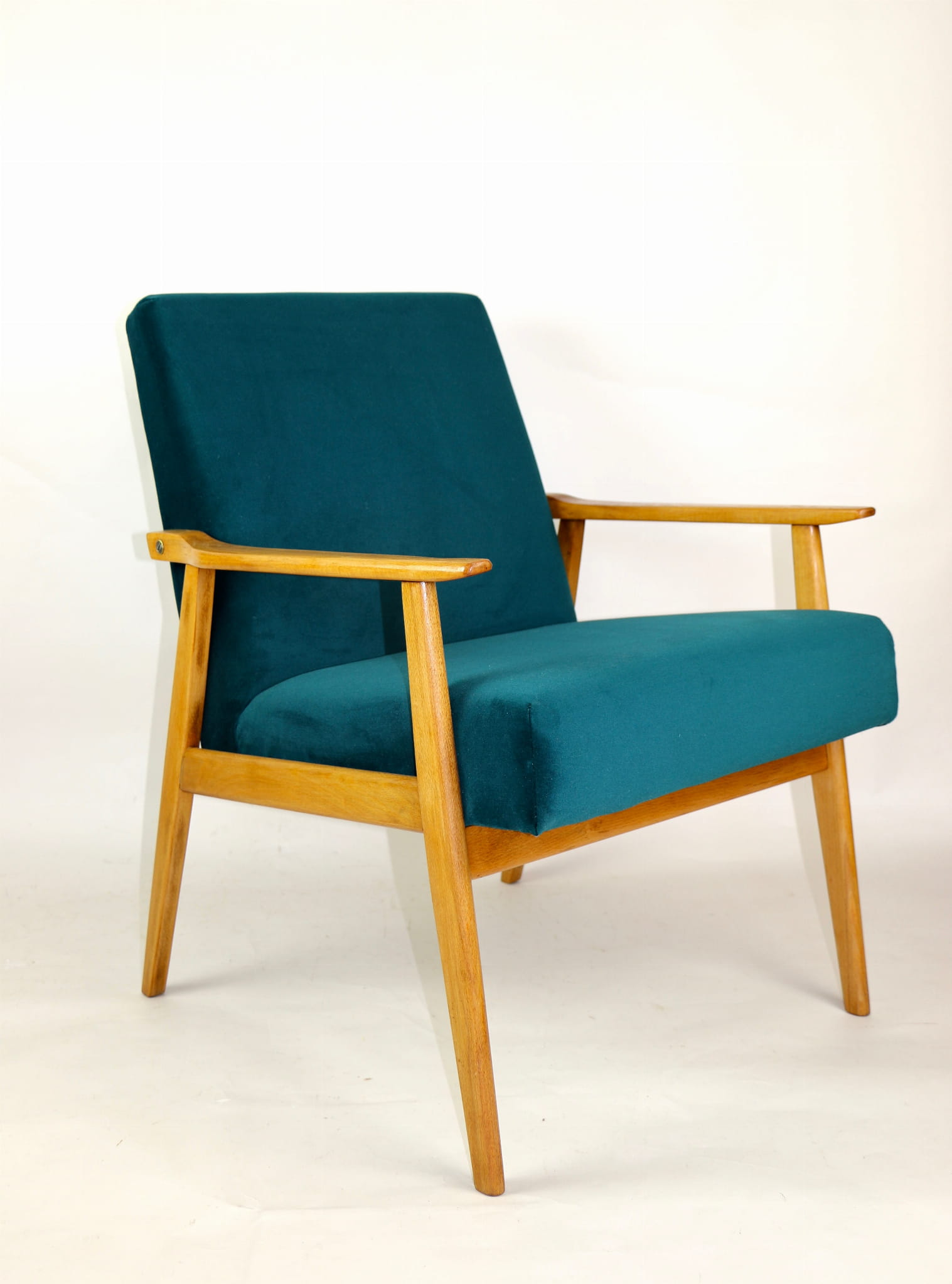 Fotel Śnieżnik pochodzi z lat 70. Mebel został całkowicie odrestaurowany. Jest obity materiałym typu welwet w kolorze zielono-morskiem z serii Jade - kolor 608. Stelaż drewniany połączony z podłokietnikami w kolorze jasnego dębu