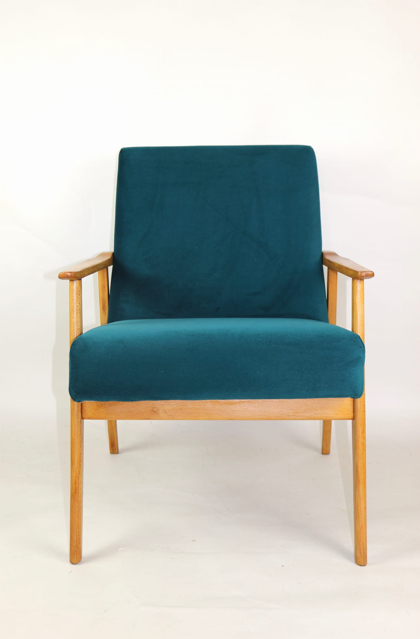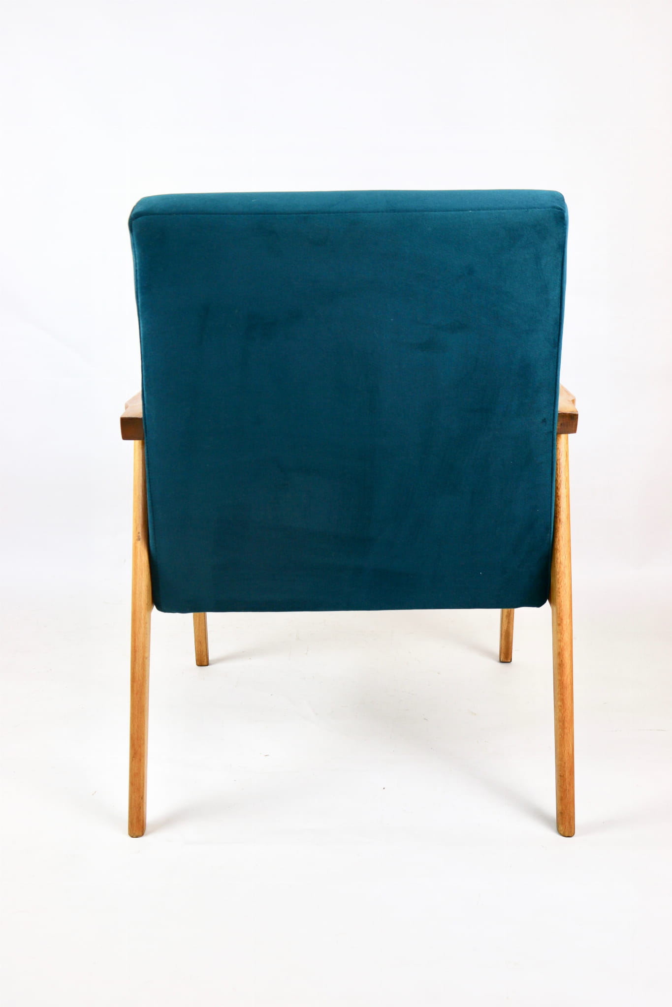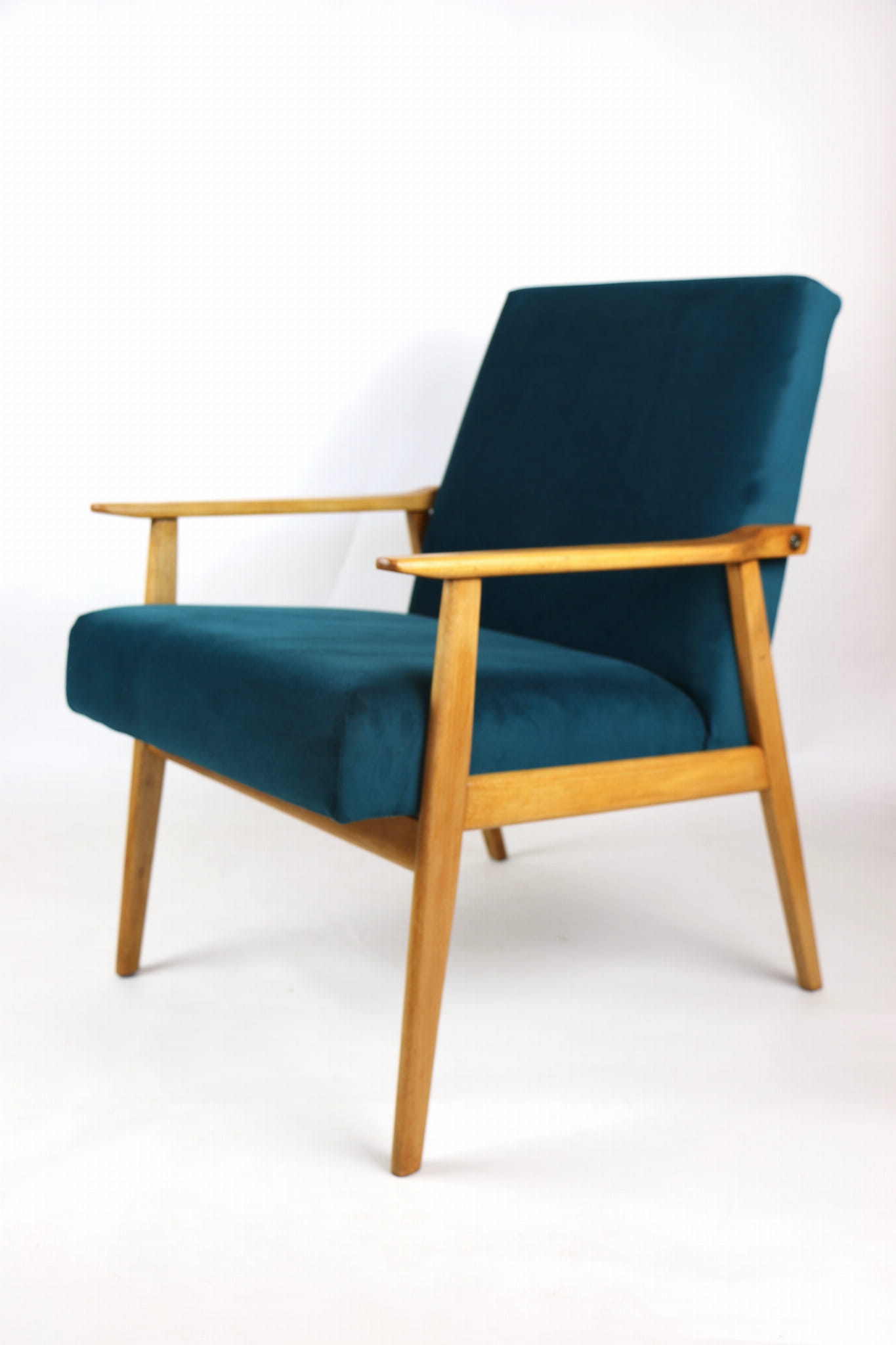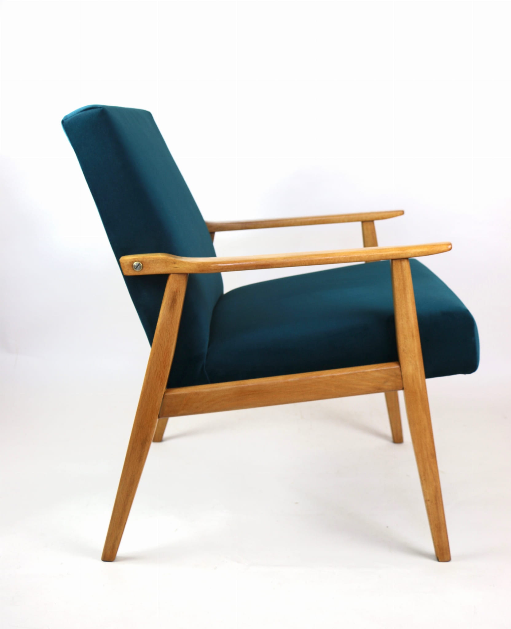 Fotel Śnieżnik pochodzi z lat 70. Mebel został całkowicie odrestaurowany. Jest obity materiałym typu welwet w kolorze zielono-morskiem z serii Jade - kolor 608. Stelaż drewniany połączony z podłokietnikami w kolorze jasnego dębu