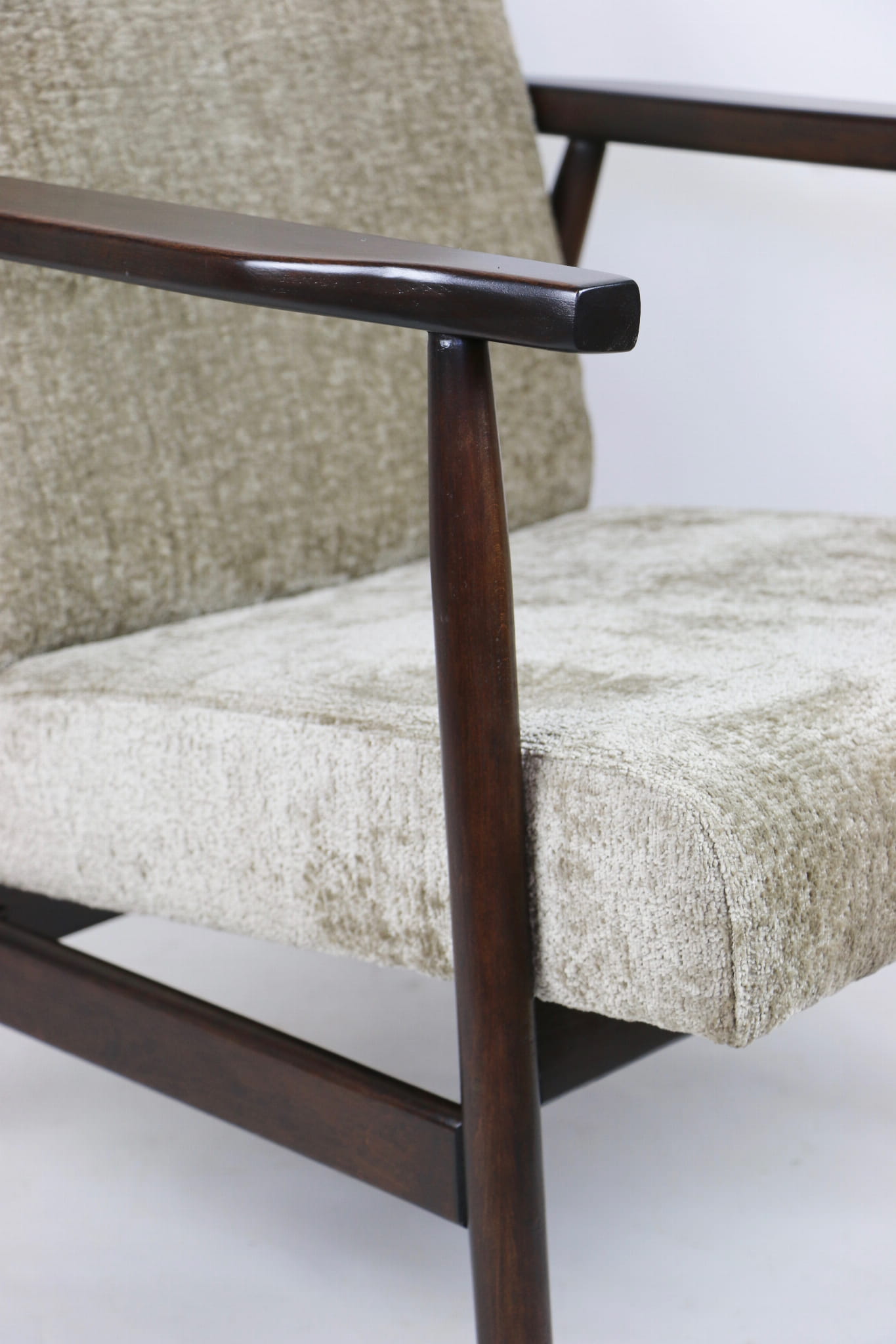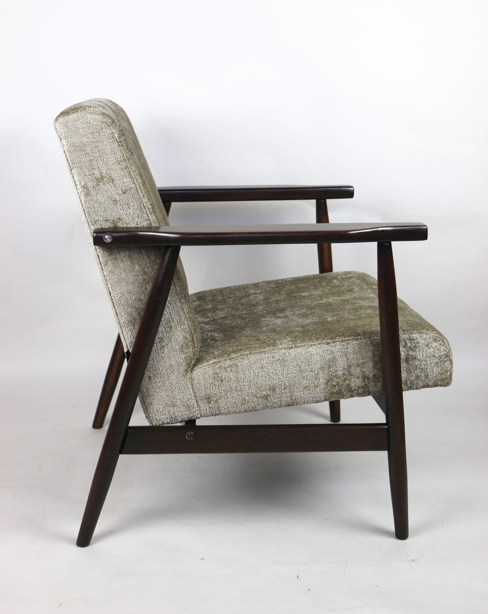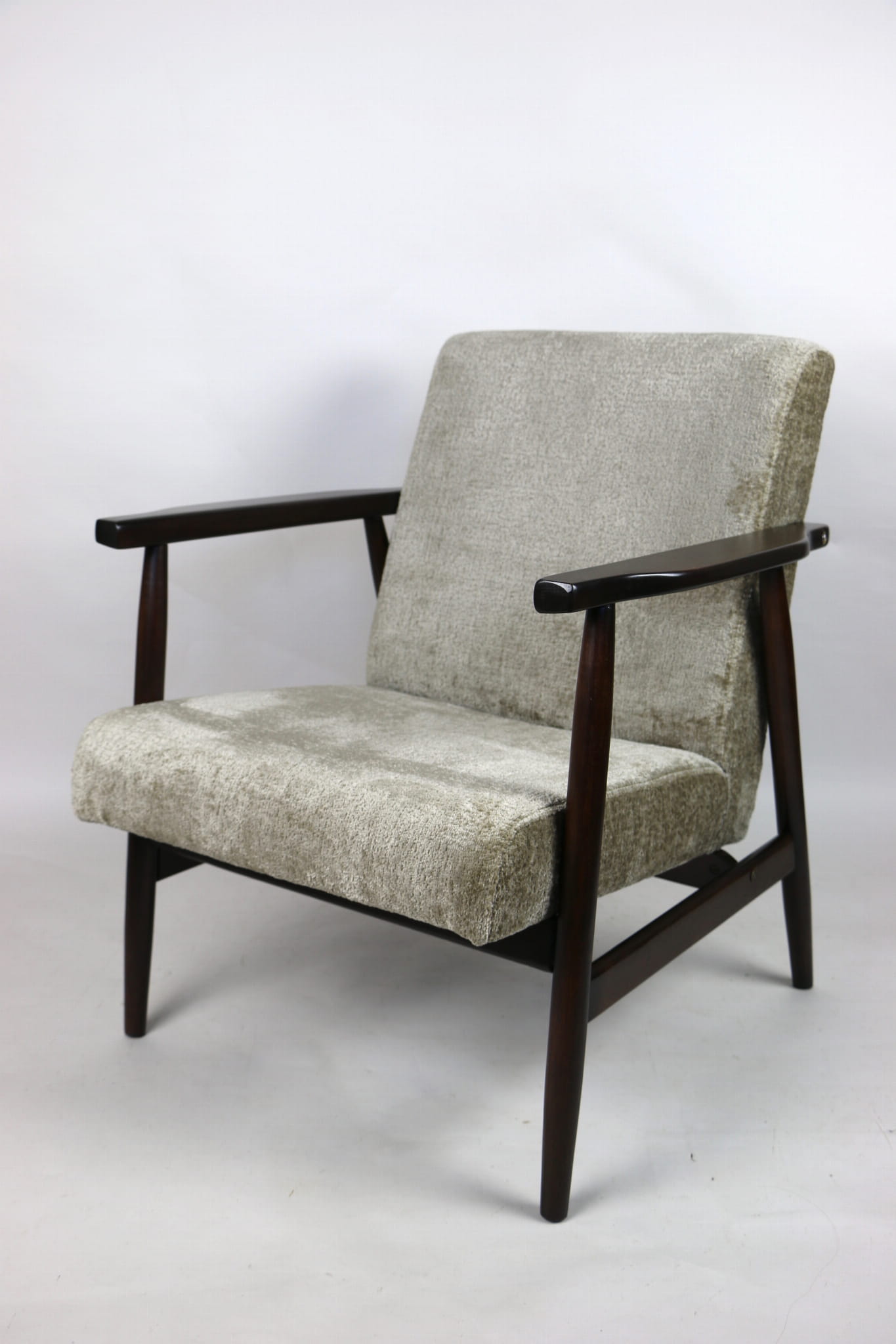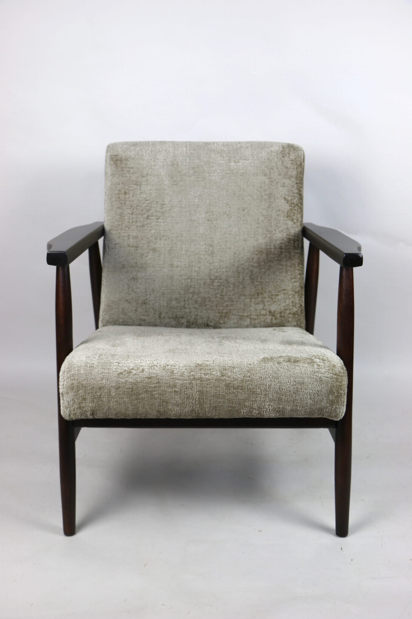Fotel podobny do bardzo popularnego modelu Lis był produkowany przez zakłady meblarskie w Radomsku w latach 70 tych. Został całkowicie odrestaurowany, zyskał nowe i modne obicie w kolorze beżowym - materiał welwet strukturalny z serii Bergen. Stelaż drewniany połączony jest z podłokietnikami w ciemnej kolorystyce drewna typu orzech pokryty lakierem.
