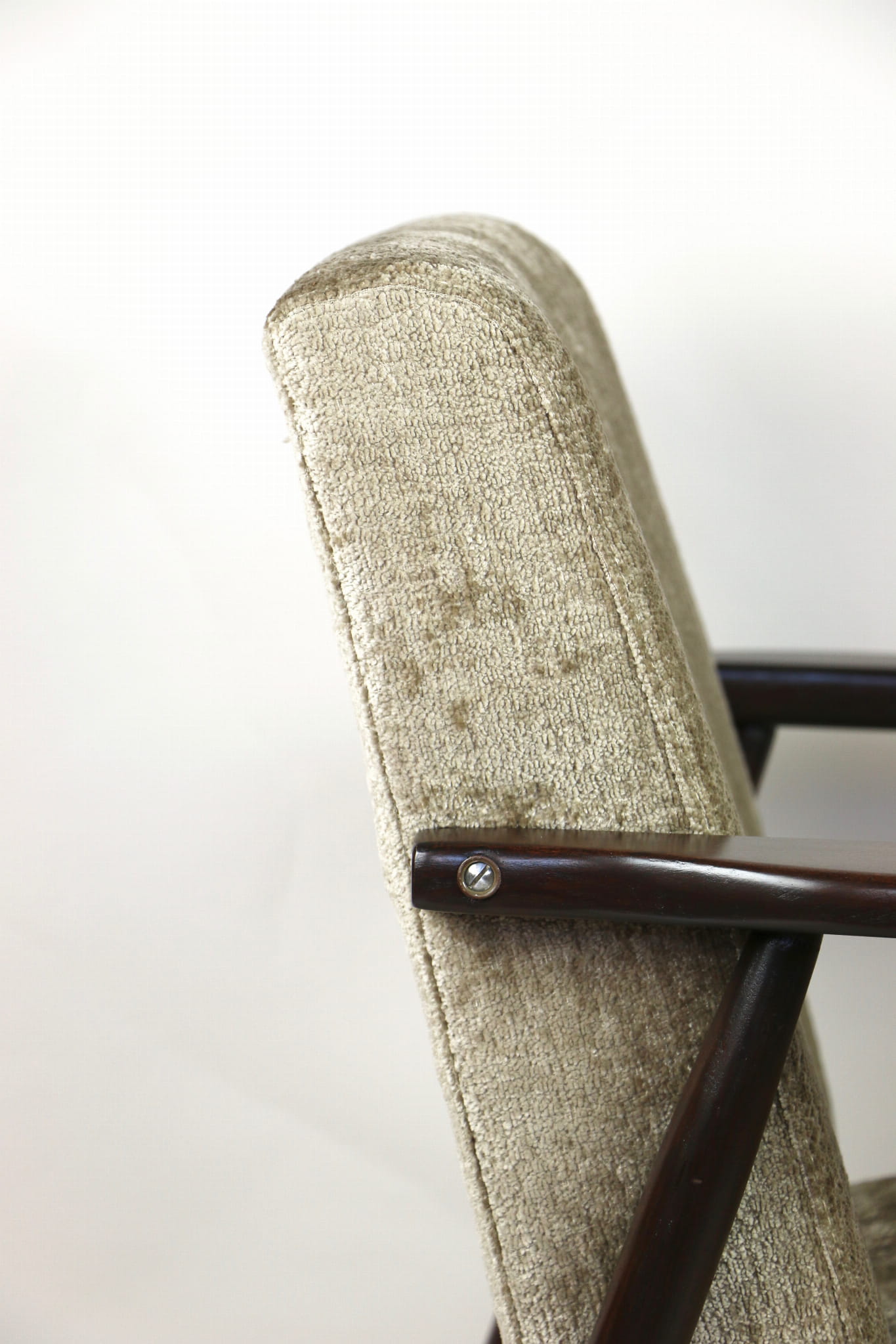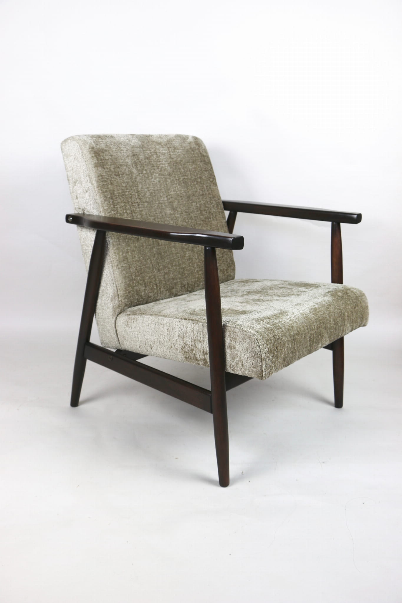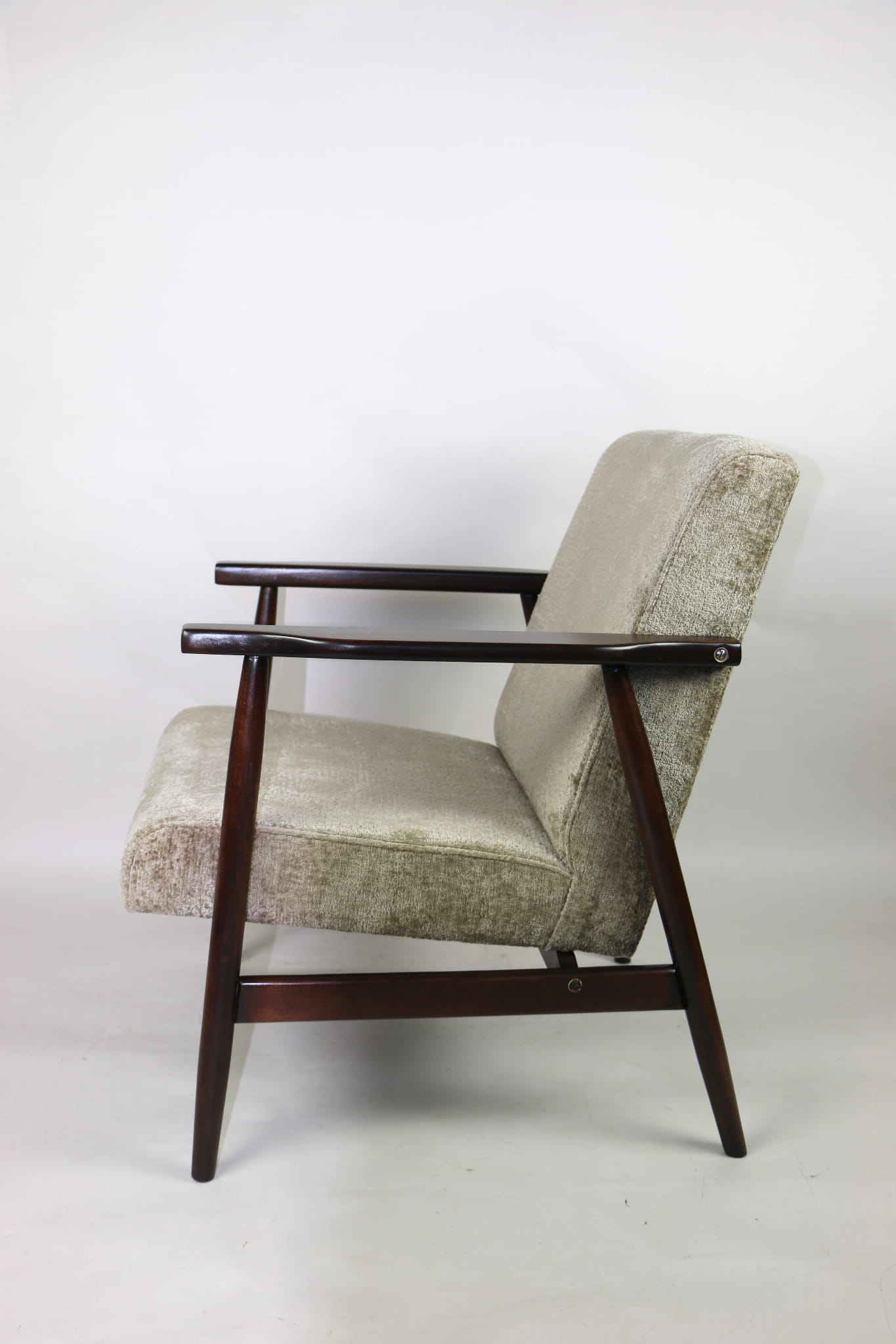 Fotel podobny do bardzo popularnego modelu Lis był produkowany przez zakłady meblarskie w Radomsku w latach 70 tych. Został całkowicie odrestaurowany, zyskał nowe i modne obicie w kolorze beżowym - materiał welwet strukturalny z serii Bergen. Stelaż drewniany połączony jest z podłokietnikami w ciemnej kolorystyce drewna typu orzech pokryty lakierem.