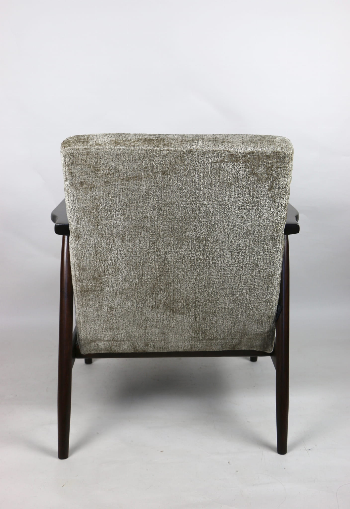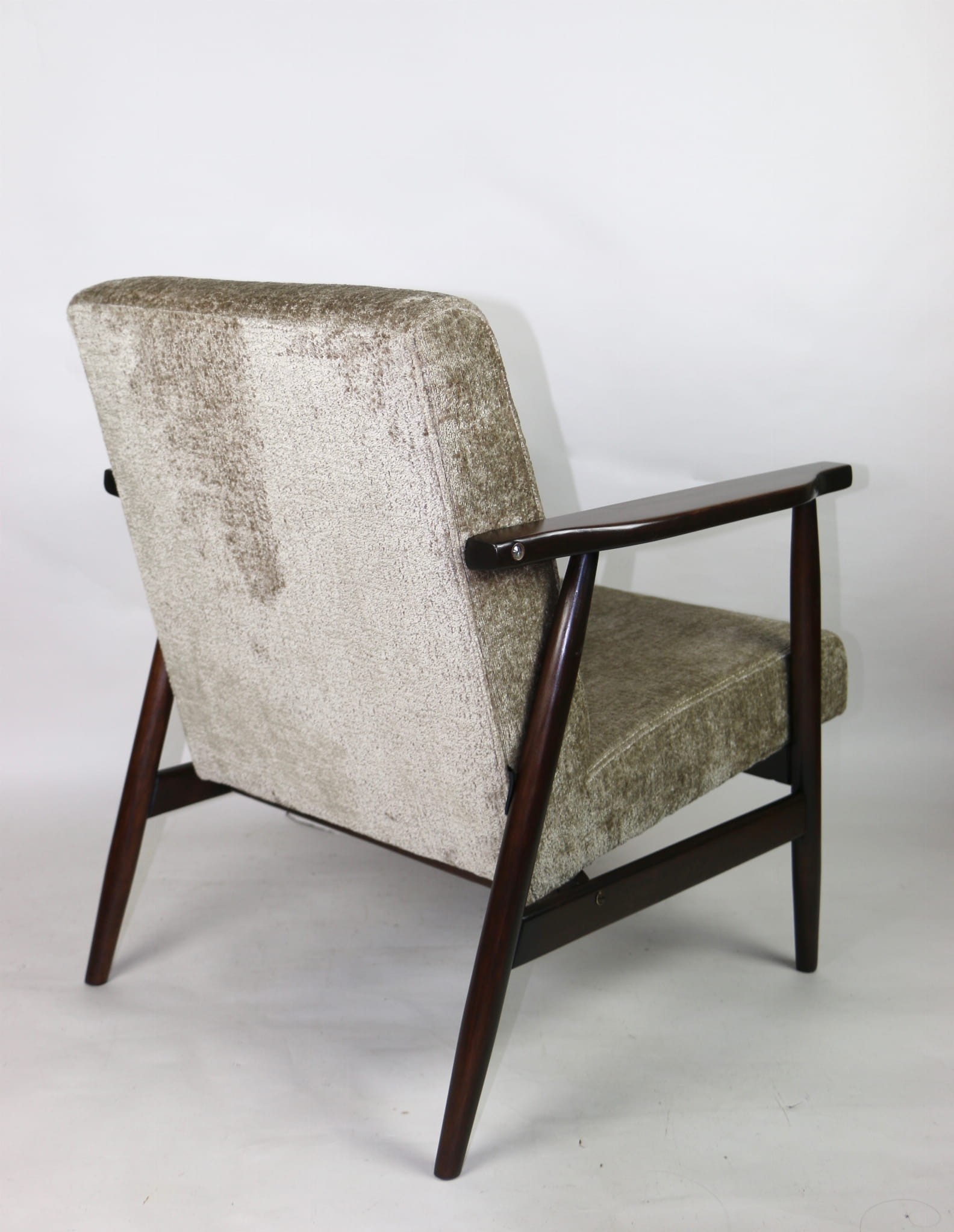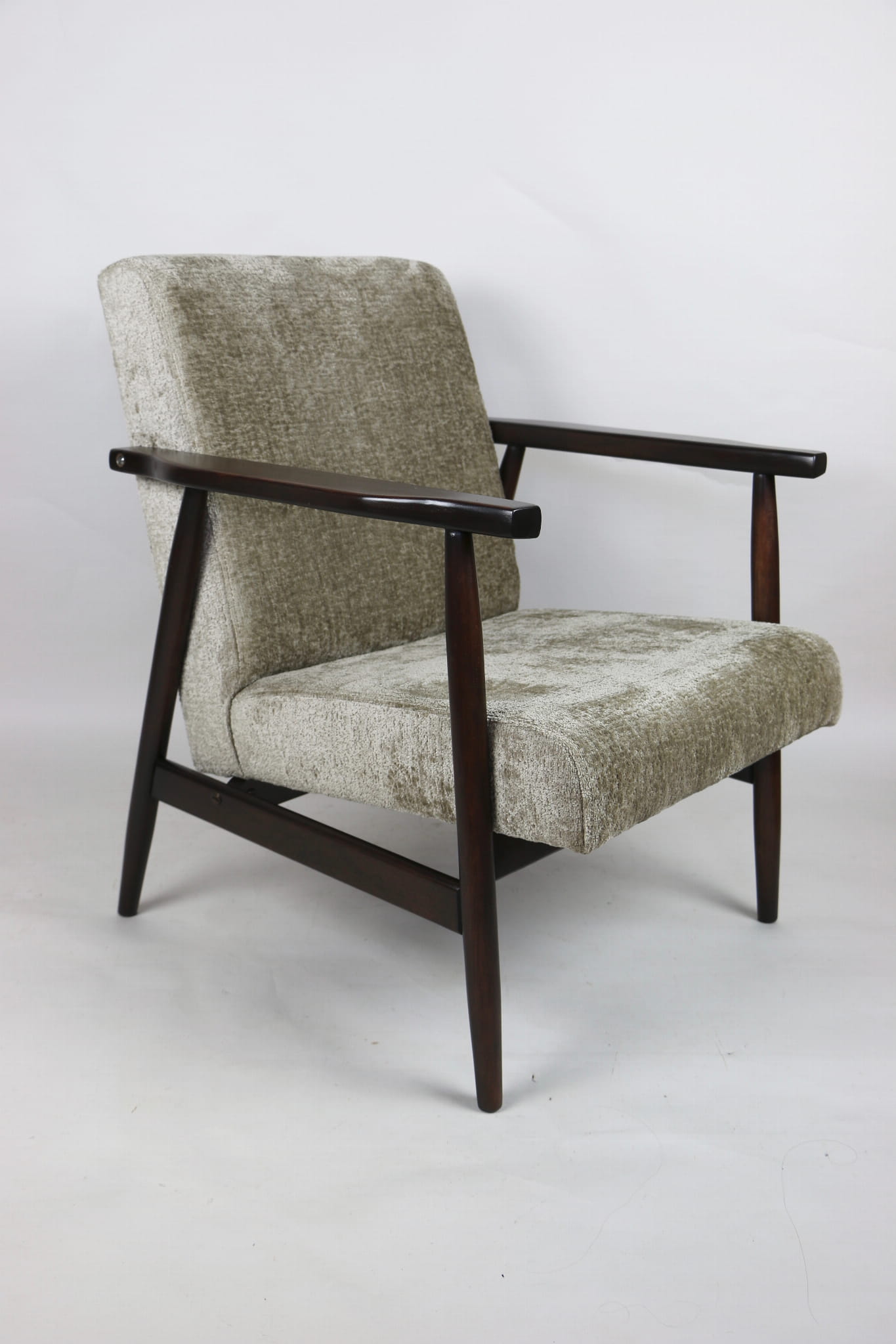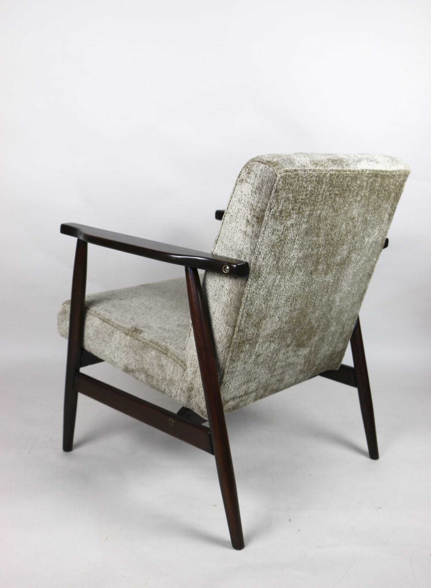 Fotel podobny do bardzo popularnego modelu Lis był produkowany przez zakłady meblarskie w Radomsku w latach 70 tych. Został całkowicie odrestaurowany, zyskał nowe i modne obicie w kolorze beżowym - materiał welwet strukturalny z serii Bergen. Stelaż drewniany połączony jest z podłokietnikami w ciemnej kolorystyce drewna typu orzech pokryty lakierem.