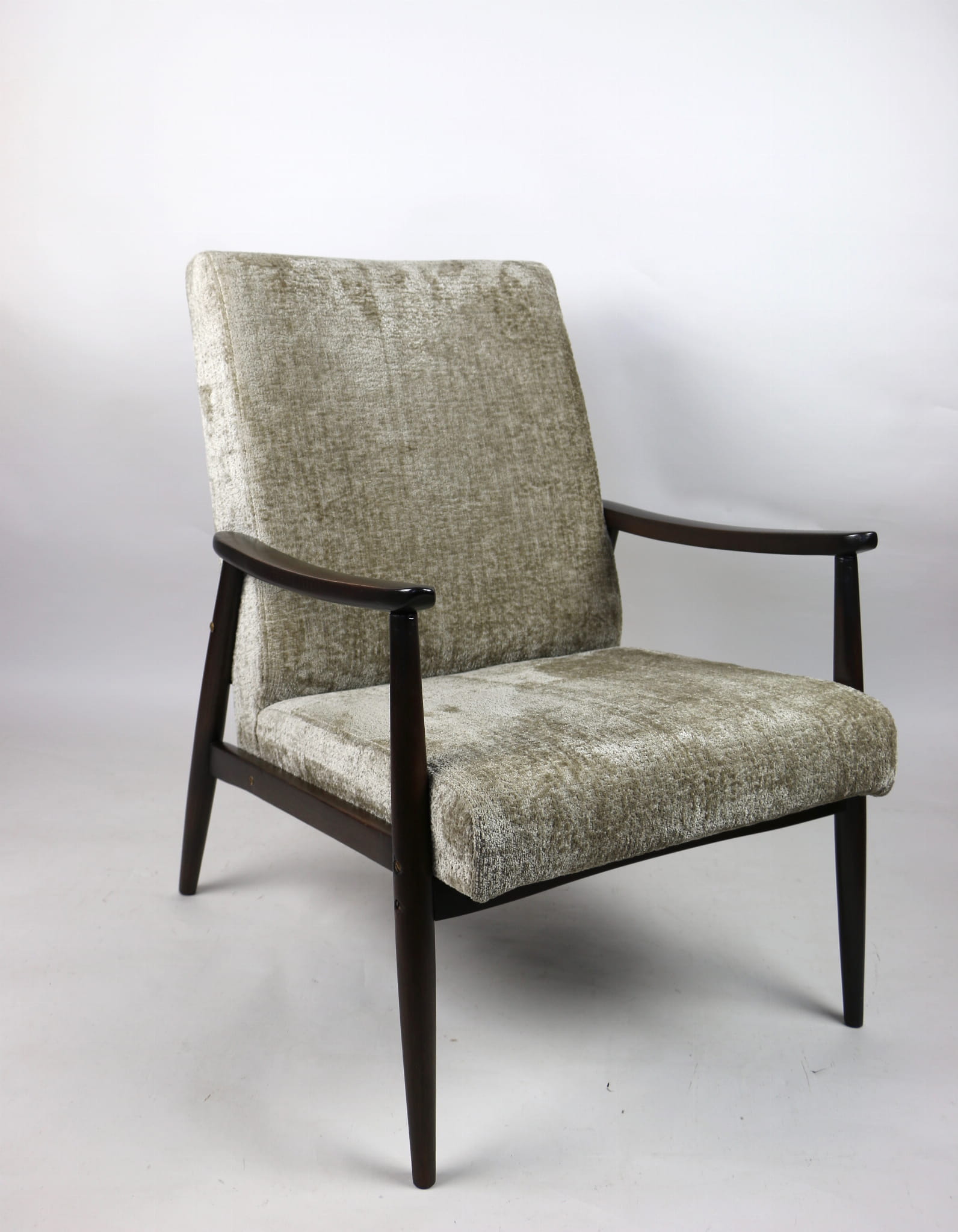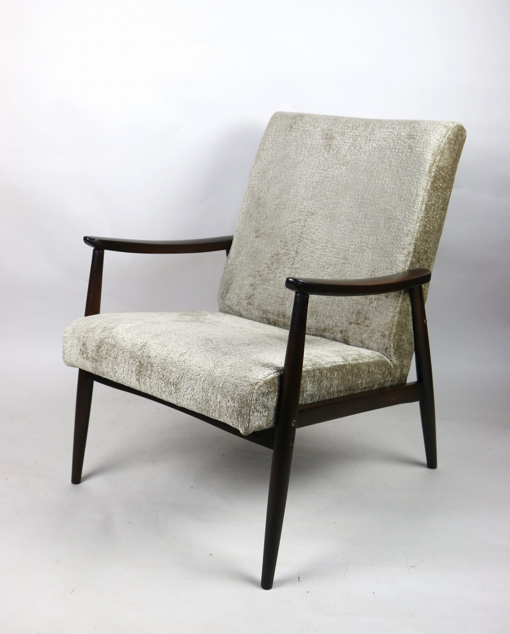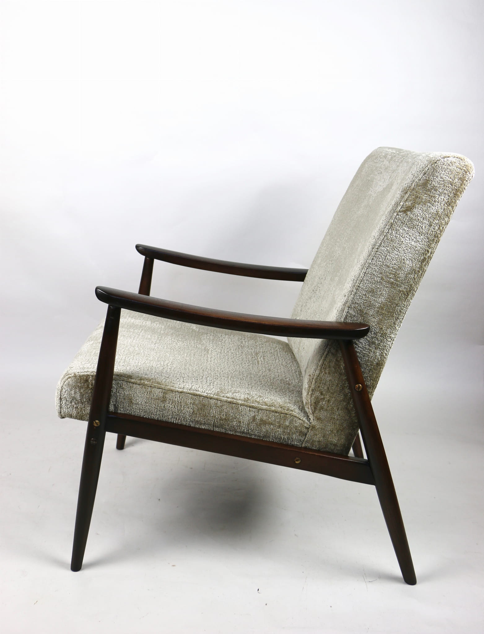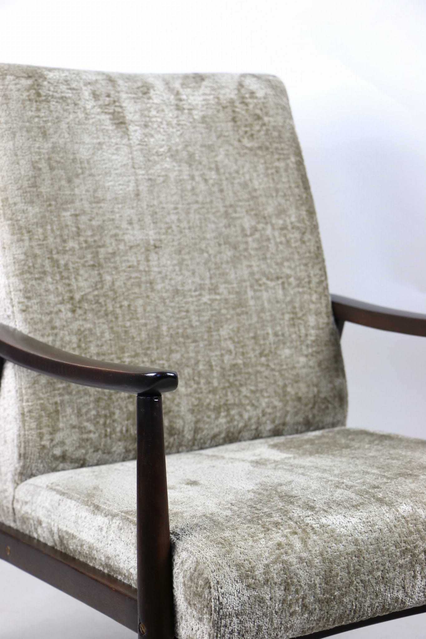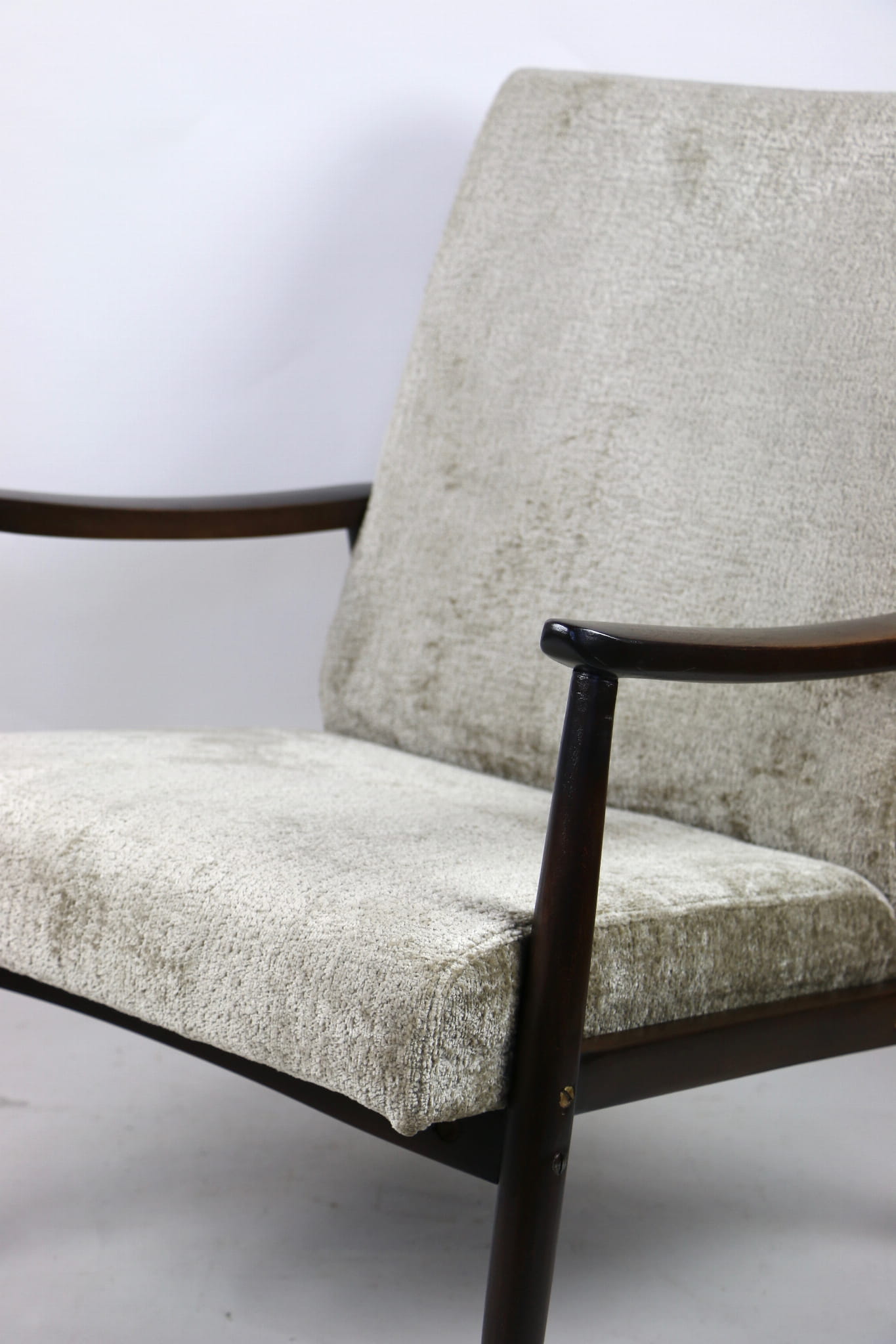 Fotel klasyczny podobny do bardzo popularnego modelu Lis. Został całkowicie odrestaurowany, zyskał nowe i modne obicie w kolorze beżowym - materiał welwet strukturalny z serii Bergen. Stelaż drewniany połączony jest z podłokietnikami w ciemnej kolorystyce drewna typu orzech pokryty lakierem.