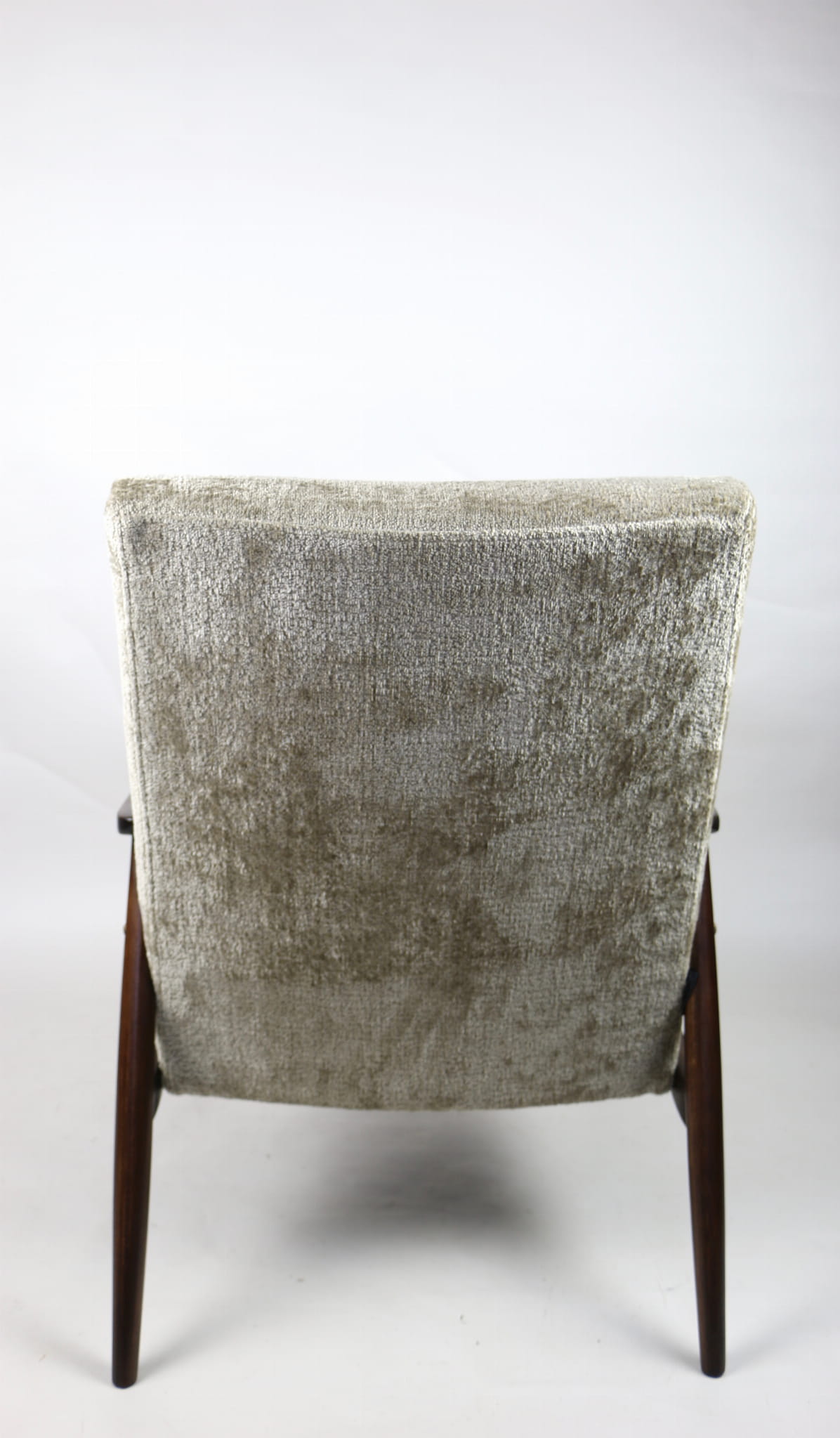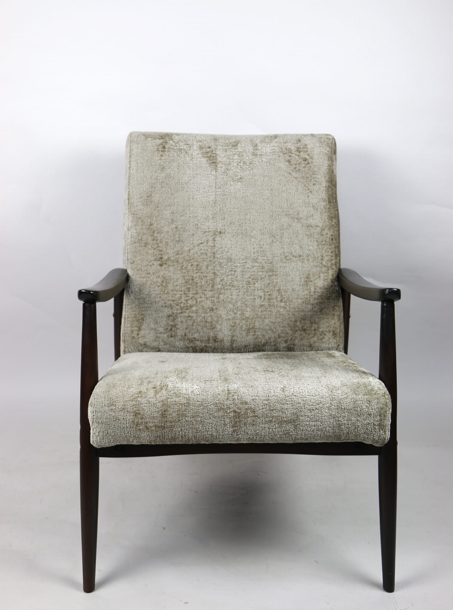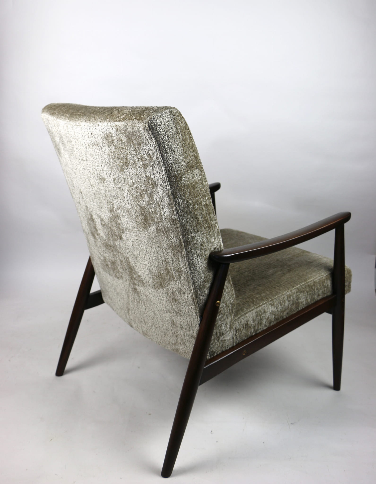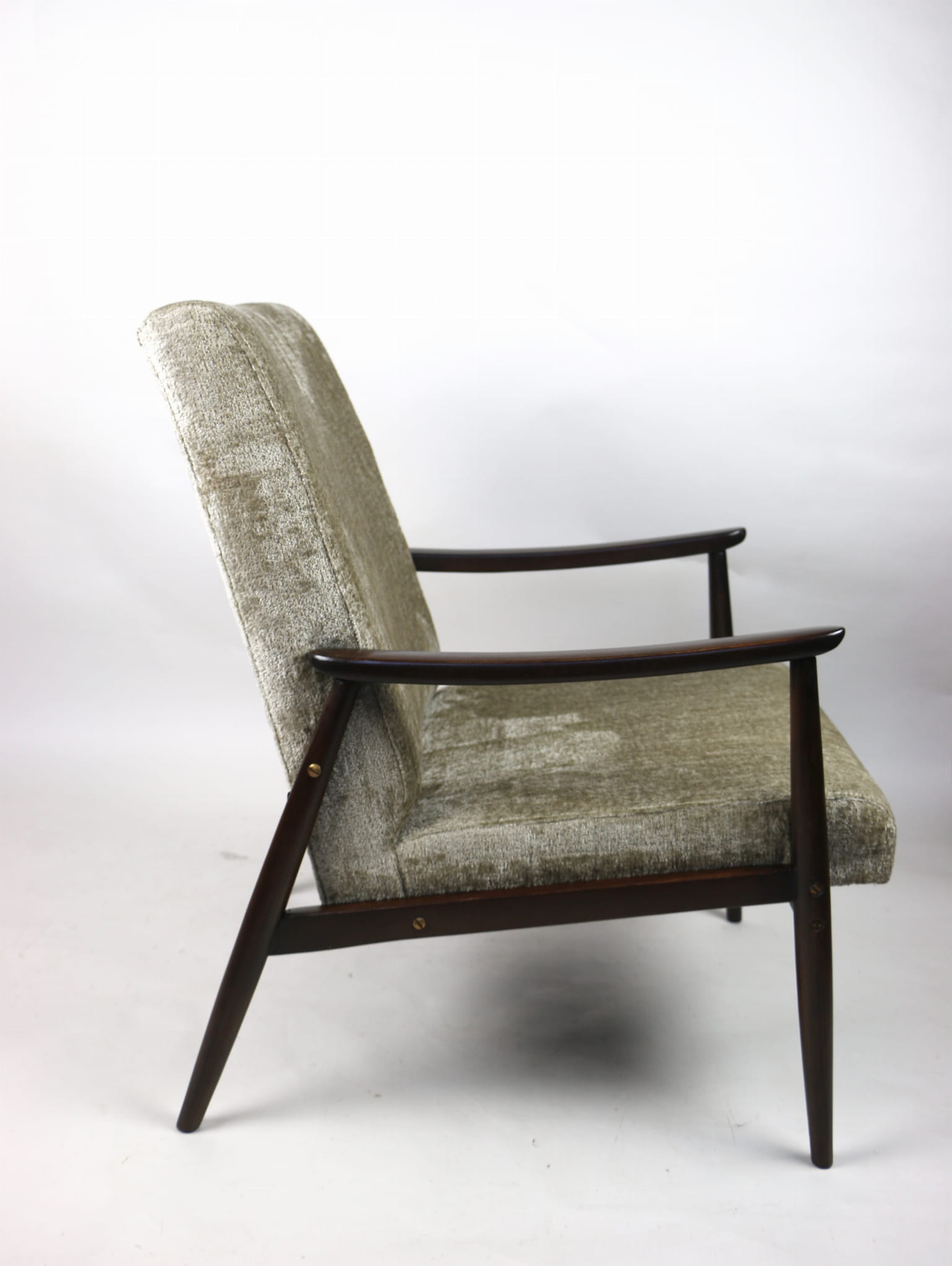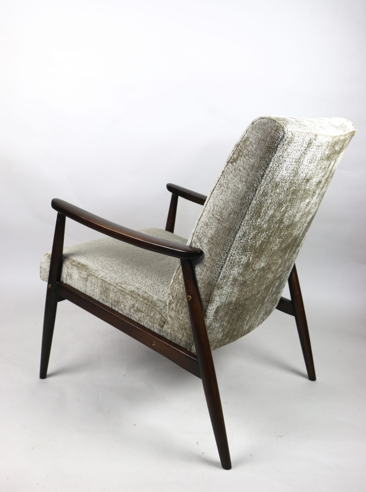 Fotel klasyczny podobny do bardzo popularnego modelu Lis. Został całkowicie odrestaurowany, zyskał nowe i modne obicie w kolorze beżowym - materiał welwet strukturalny z serii Bergen. Stelaż drewniany połączony jest z podłokietnikami w ciemnej kolorystyce drewna typu orzech pokryty lakierem.