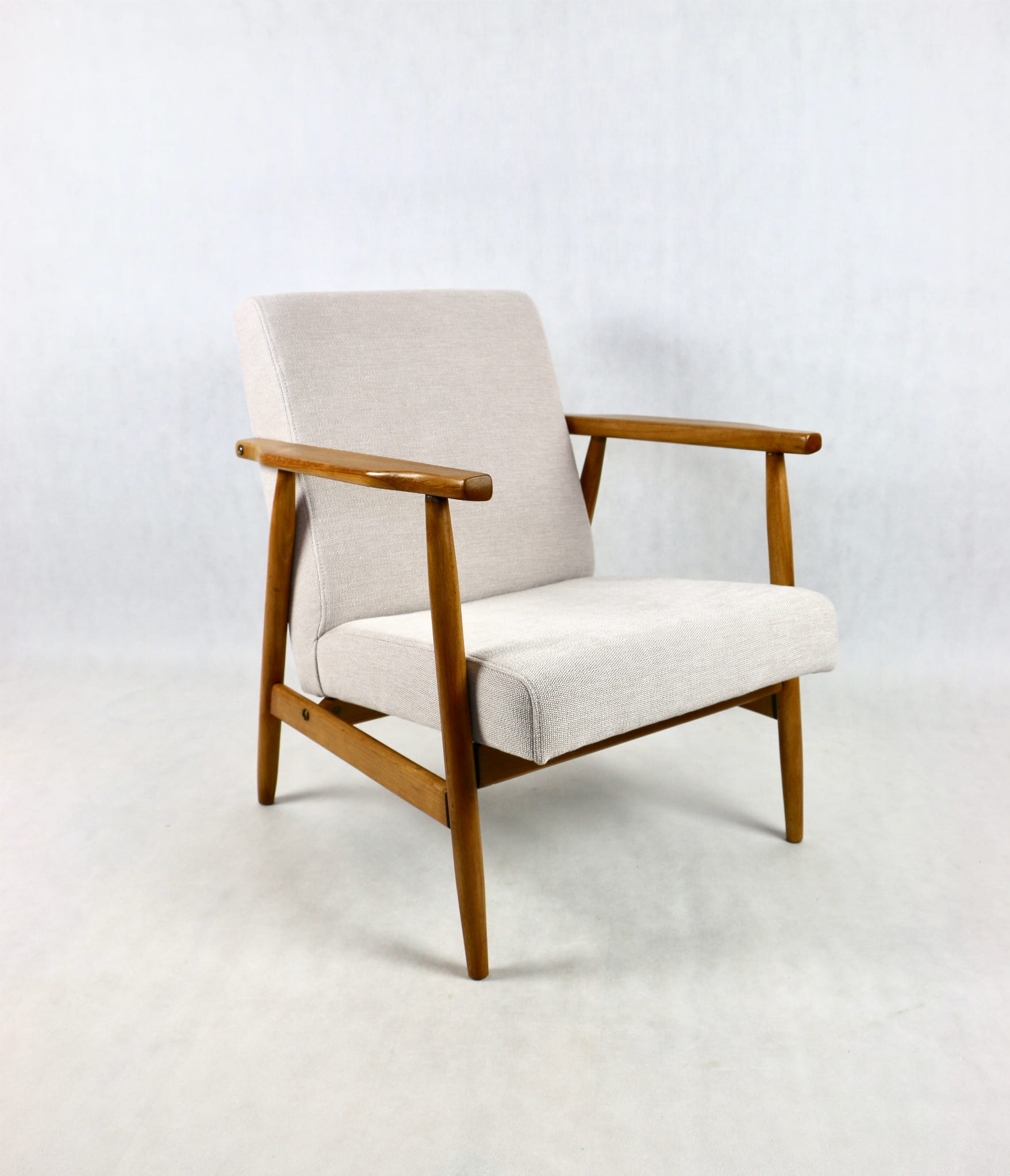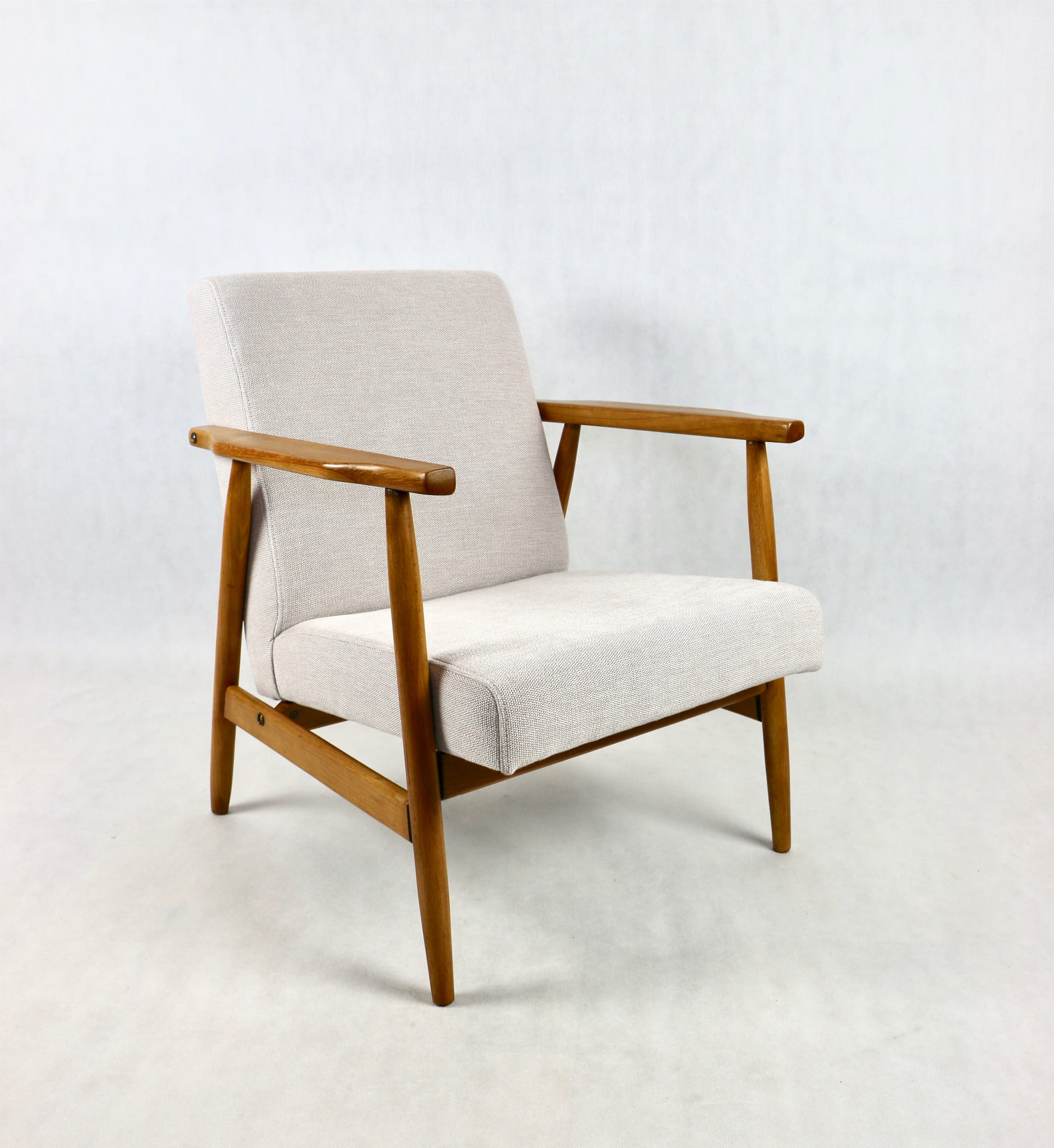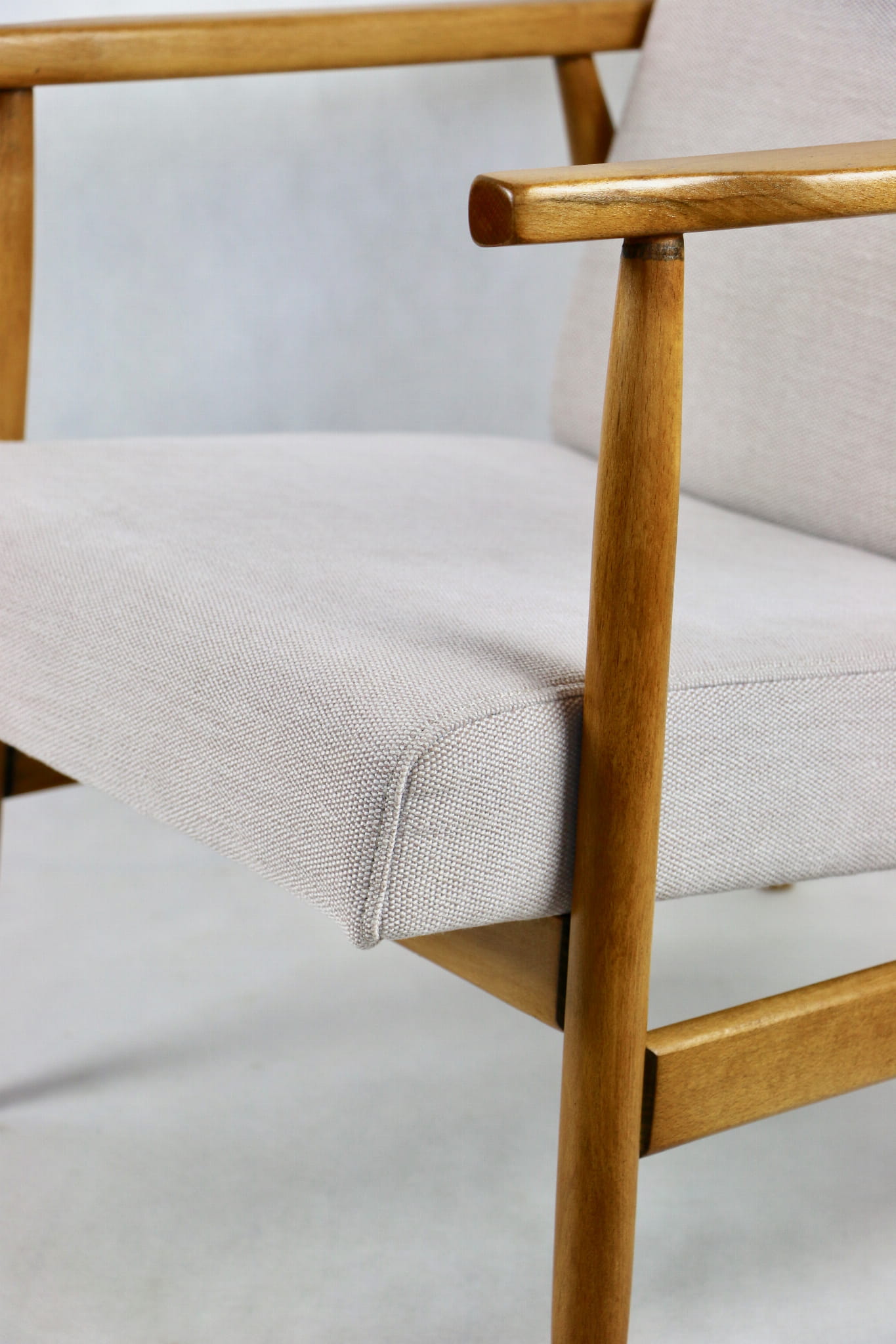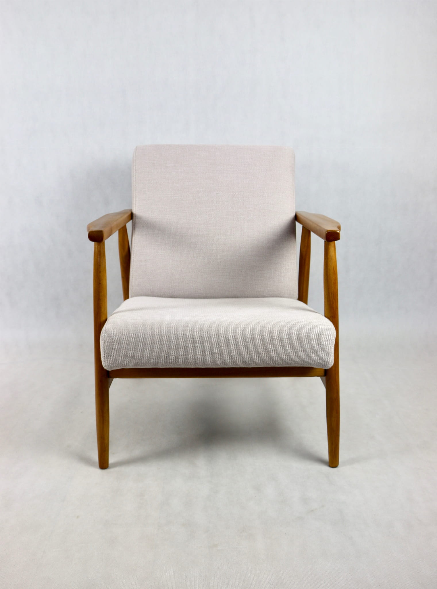 Fotel podobny do bardzo popularnego modelu Lis był produkowany przez zakłady meblarskie w Radomsku w latach 70 tych. Został całkowicie odrestaurowany, zyskał nowe i modne obicie w kolorze beżowym - materiał strukturalny z serii Atlantis Stelaż drewniany połączony jest z podłokietnikami w jasnej kolorystyce drewna pokryty lakierem.