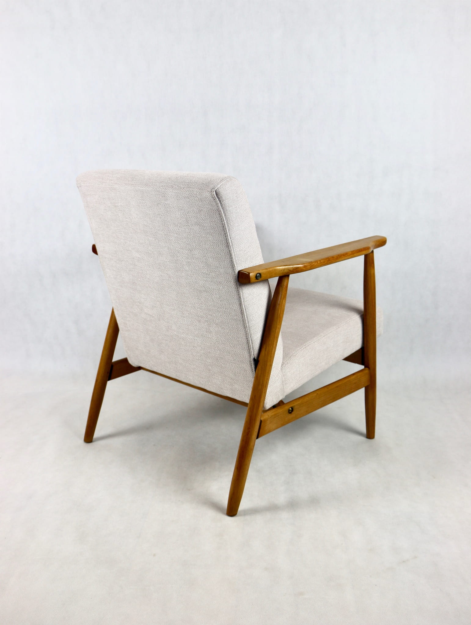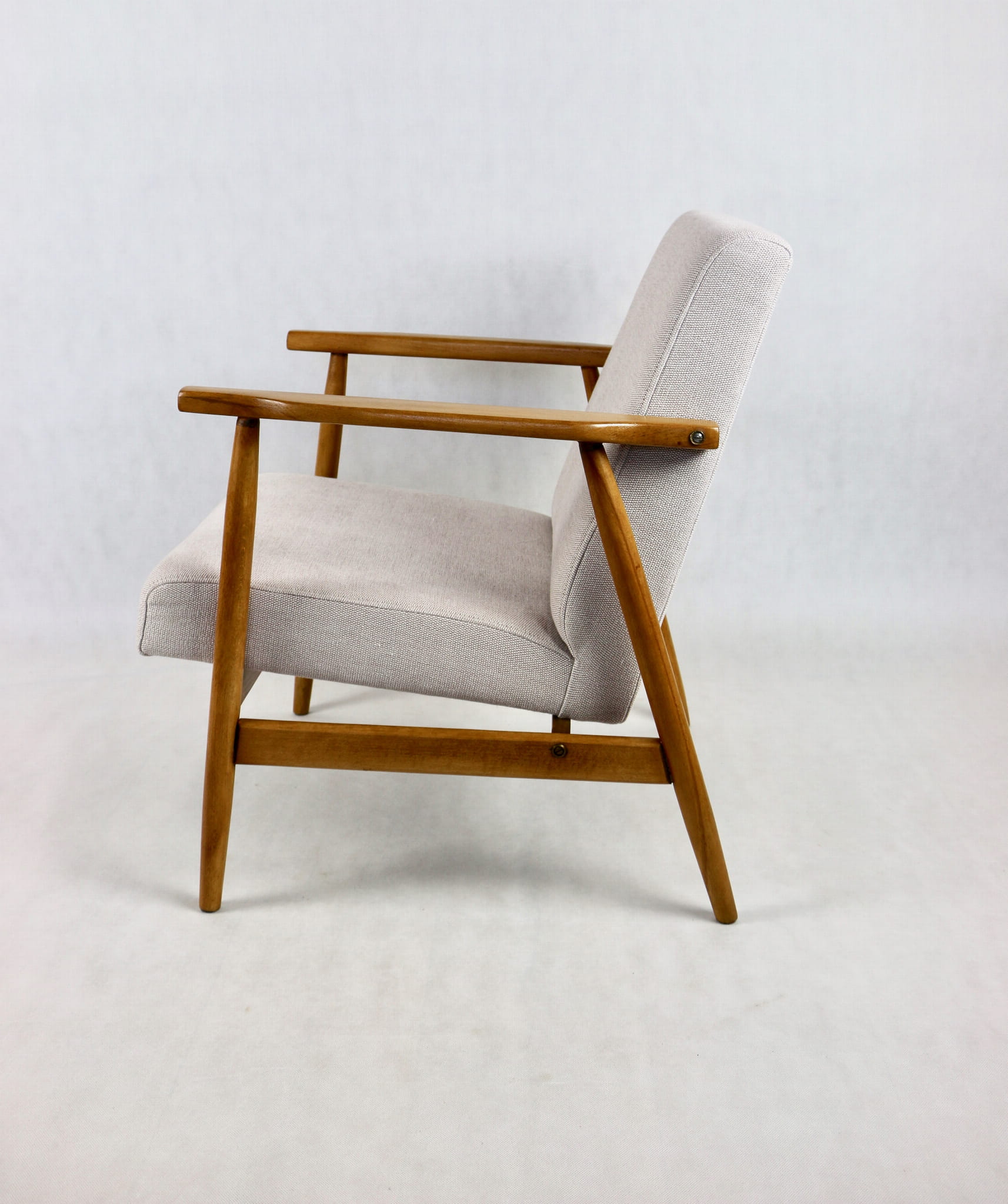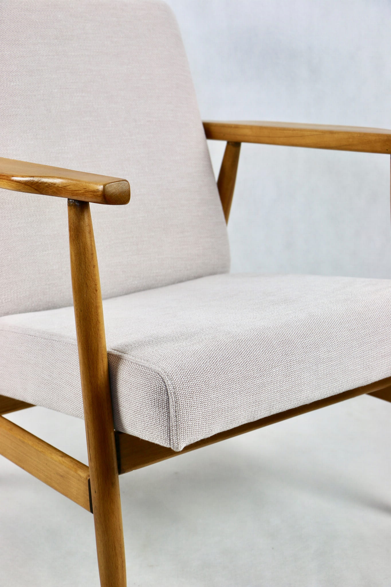 Fotel podobny do bardzo popularnego modelu Lis był produkowany przez zakłady meblarskie w Radomsku w latach 70 tych. Został całkowicie odrestaurowany, zyskał nowe i modne obicie w kolorze beżowym - materiał strukturalny z serii Atlantis Stelaż drewniany połączony jest z podłokietnikami w jasnej kolorystyce drewna pokryty lakierem.