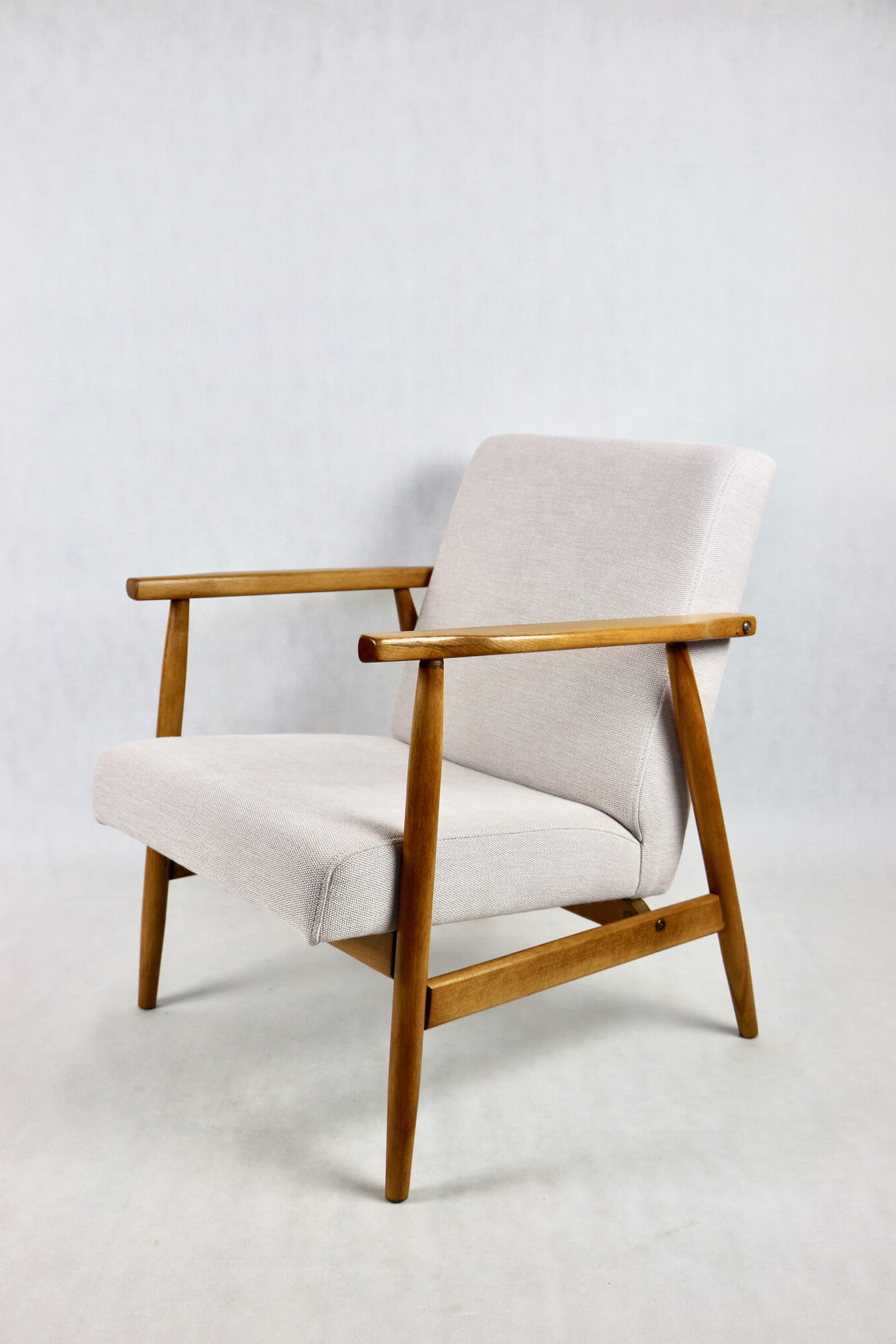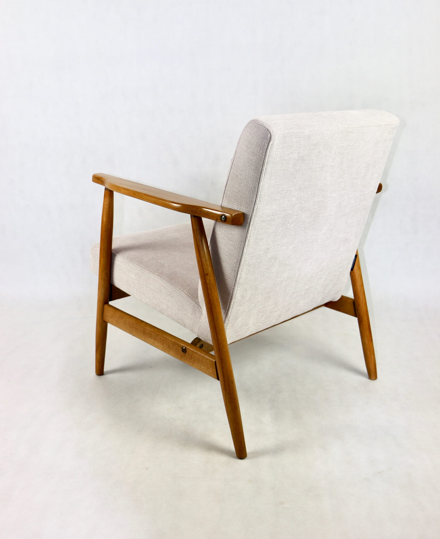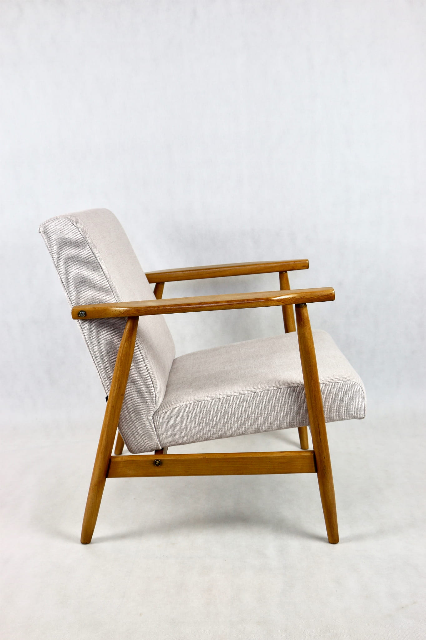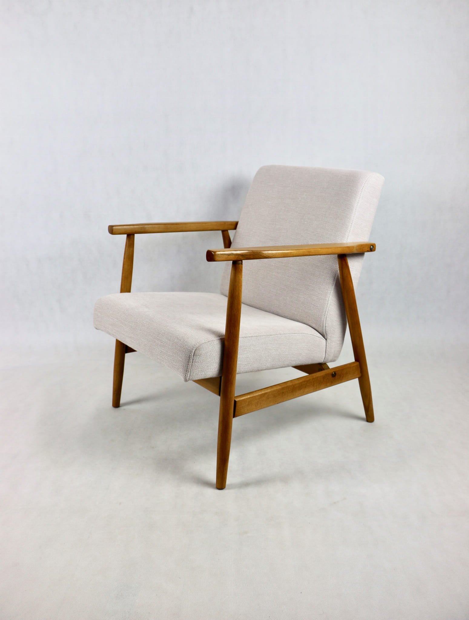 Fotel podobny do bardzo popularnego modelu Lis był produkowany przez zakłady meblarskie w Radomsku w latach 70 tych. Został całkowicie odrestaurowany, zyskał nowe i modne obicie w kolorze beżowym - materiał strukturalny z serii Atlantis Stelaż drewniany połączony jest z podłokietnikami w jasnej kolorystyce drewna pokryty lakierem.
