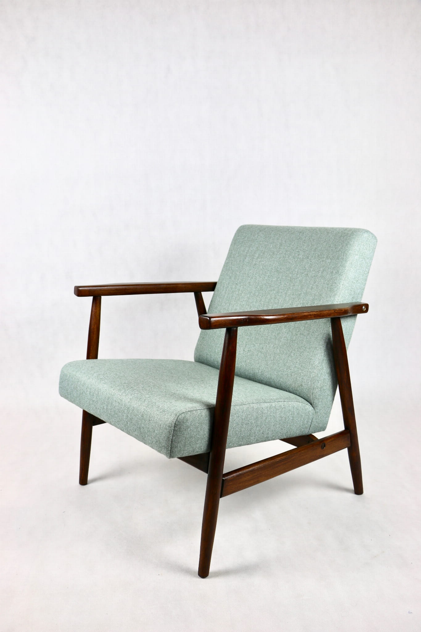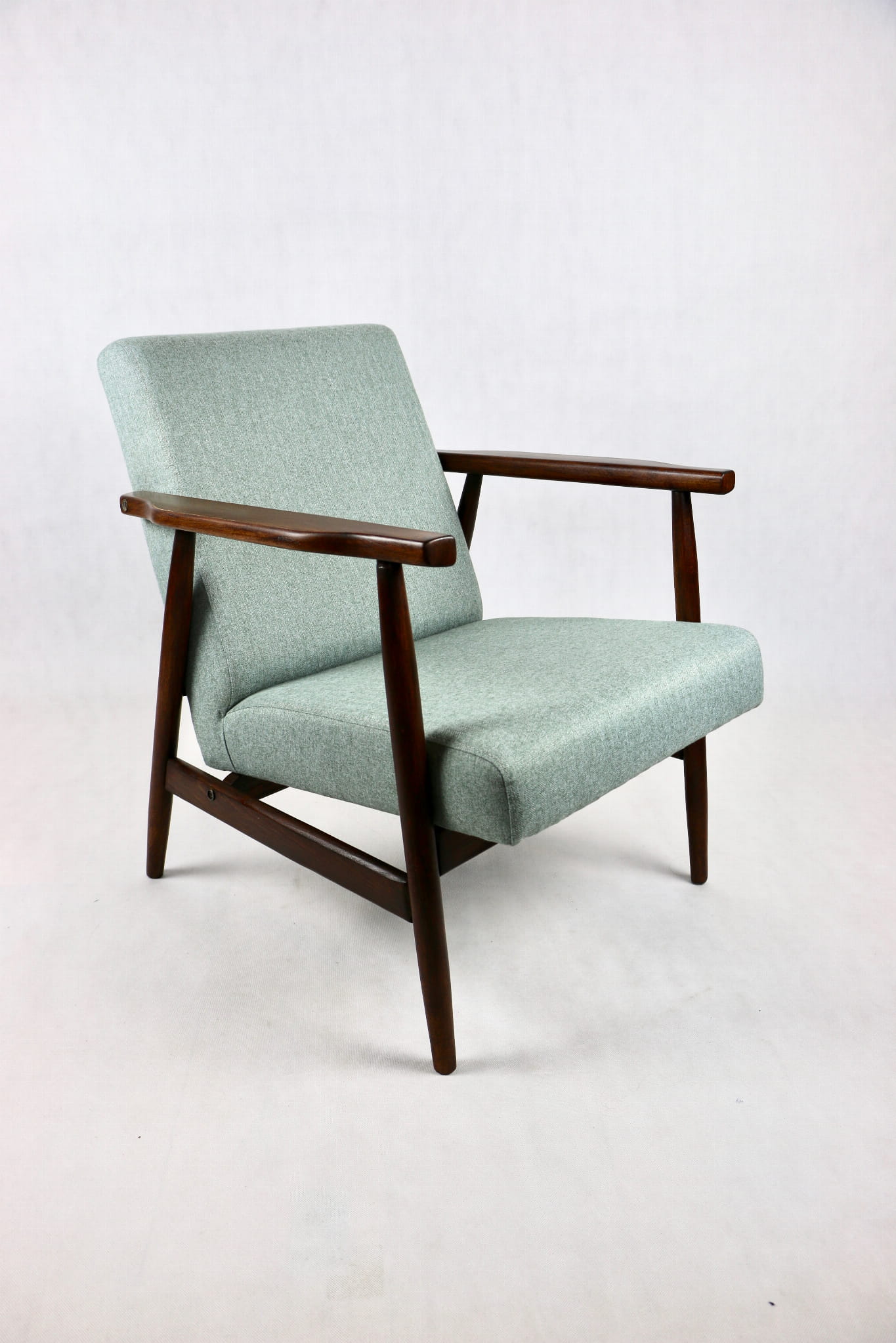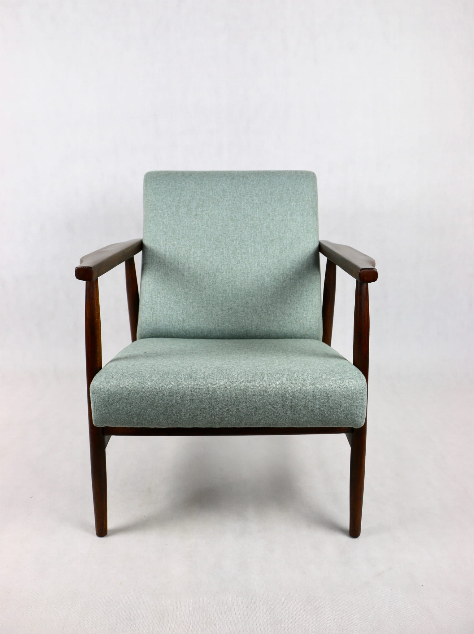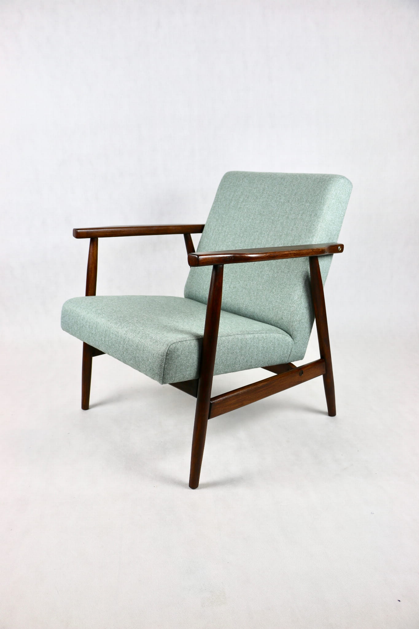 Fotel podobny do bardzo popularnego modelu Lis był produkowany przez zakłady meblarskie w Radomsku w latach 70 tych. Został całkowicie odrestaurowany, zyskał nowe i modne obicie w kolorze turkusowym - jasno zielonym - materiał strukturalny z serii Tweed. Stelaż drewniany połączony jest z podłokietnikami w ciemnej kolorystyce drewna pokryty lakierem.