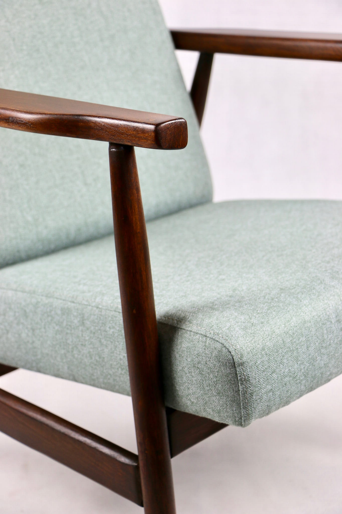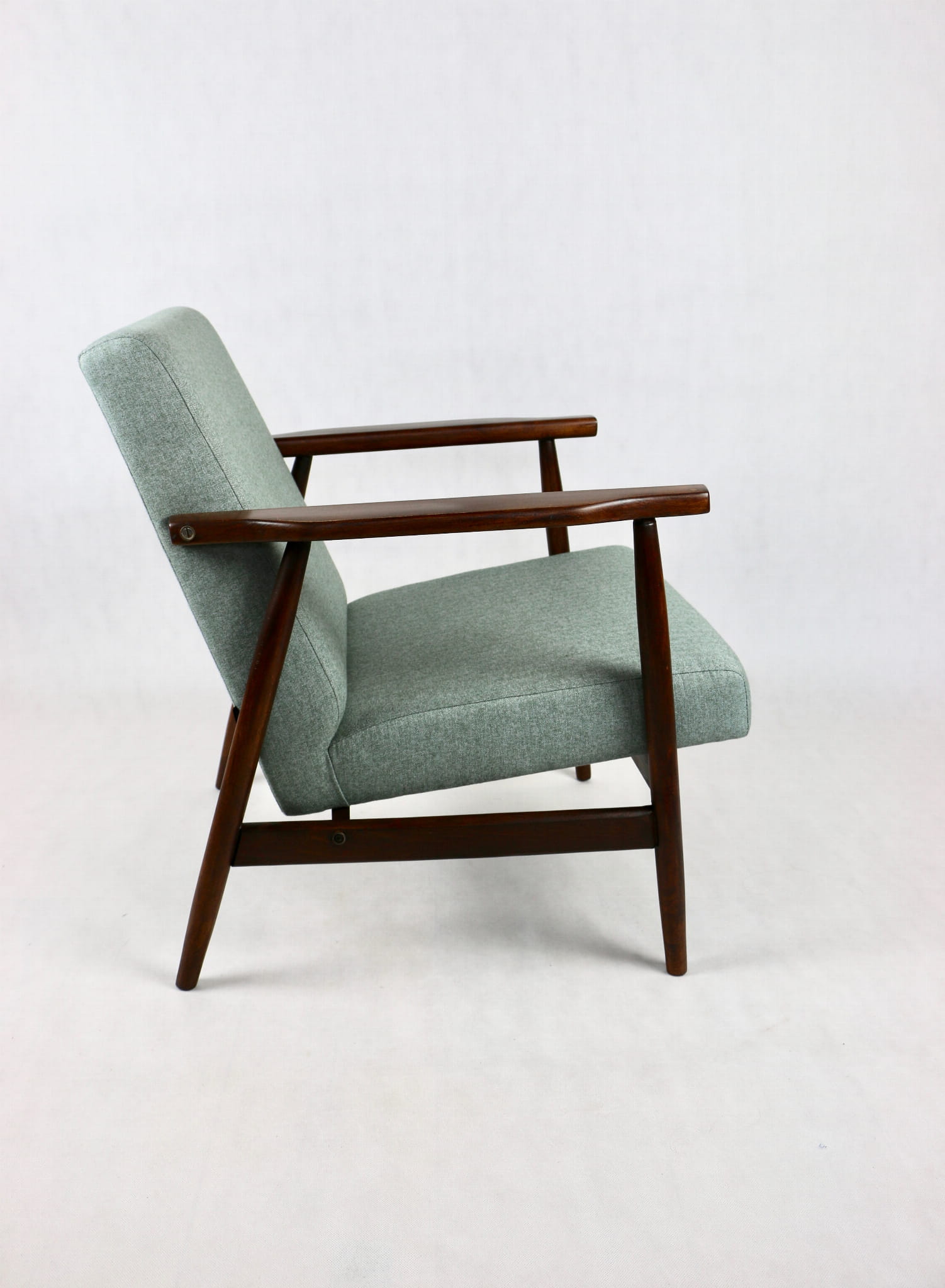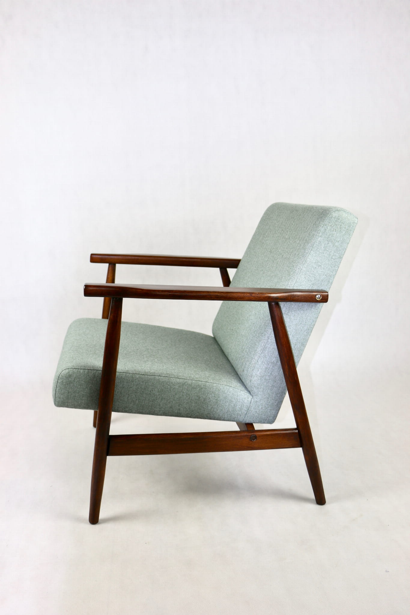 Fotel podobny do bardzo popularnego modelu Lis był produkowany przez zakłady meblarskie w Radomsku w latach 70 tych. Został całkowicie odrestaurowany, zyskał nowe i modne obicie w kolorze turkusowym - jasno zielonym - materiał strukturalny z serii Tweed. Stelaż drewniany połączony jest z podłokietnikami w ciemnej kolorystyce drewna pokryty lakierem.