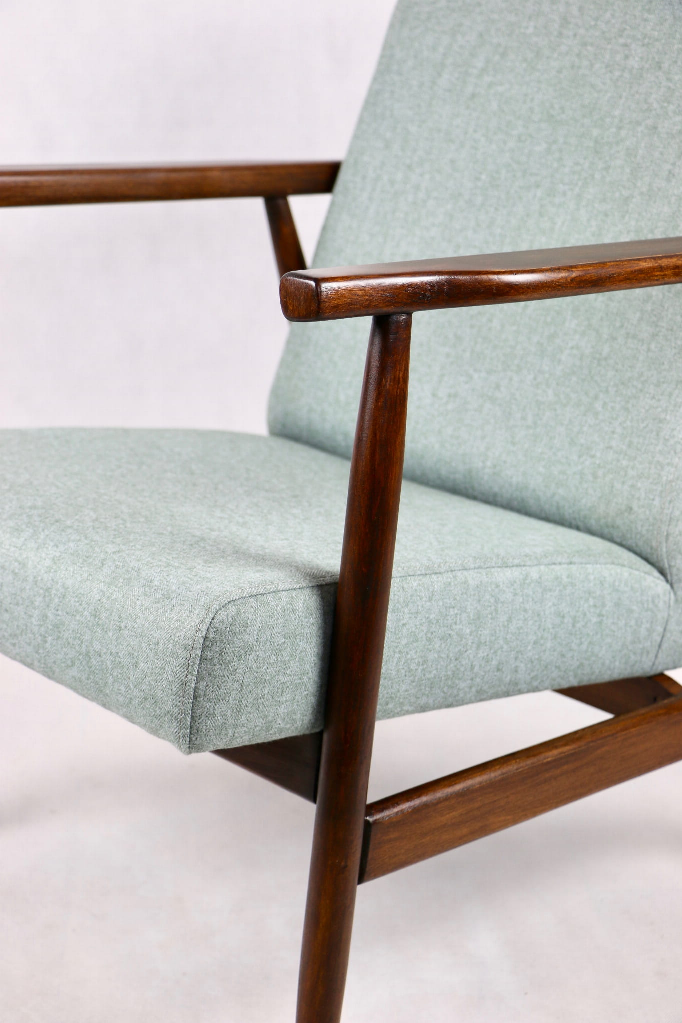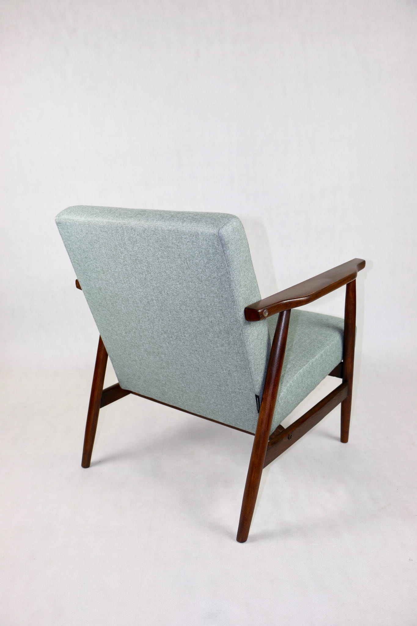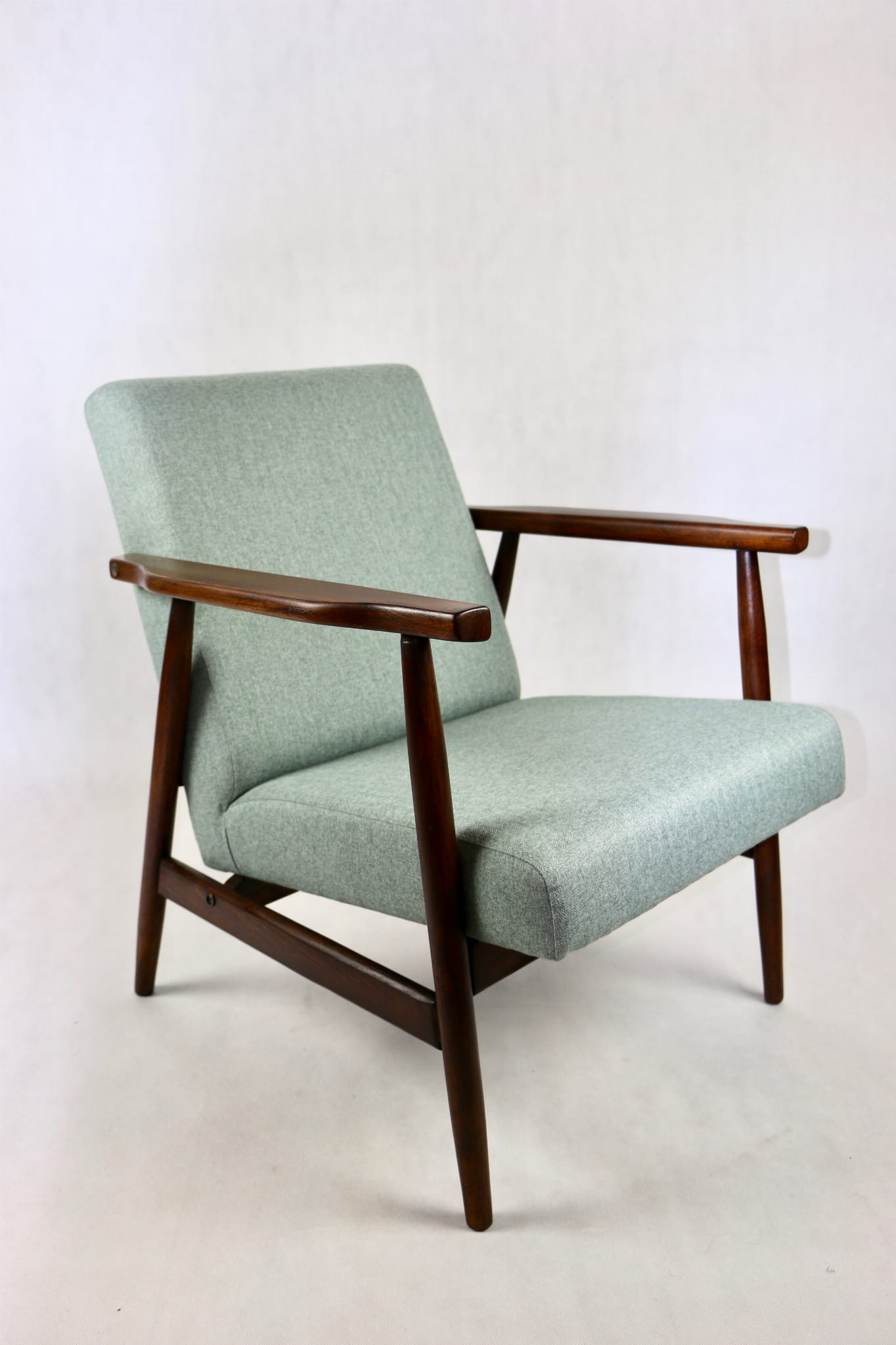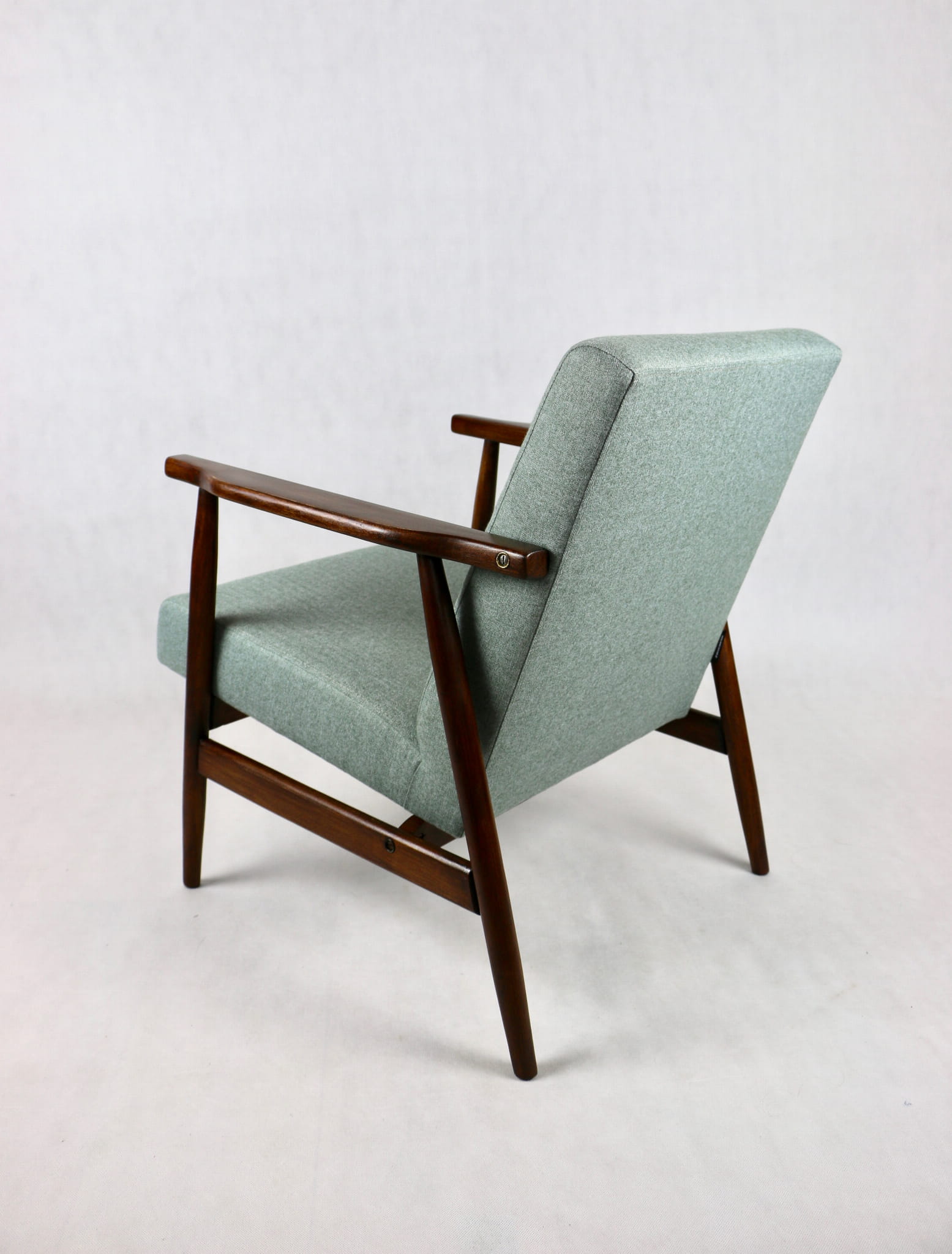Fotel podobny do bardzo popularnego modelu Lis był produkowany przez zakłady meblarskie w Radomsku w latach 70 tych. Został całkowicie odrestaurowany, zyskał nowe i modne obicie w kolorze turkusowym - jasno zielonym - materiał strukturalny z serii Tweed. Stelaż drewniany połączony jest z podłokietnikami w ciemnej kolorystyce drewna pokryty lakierem.