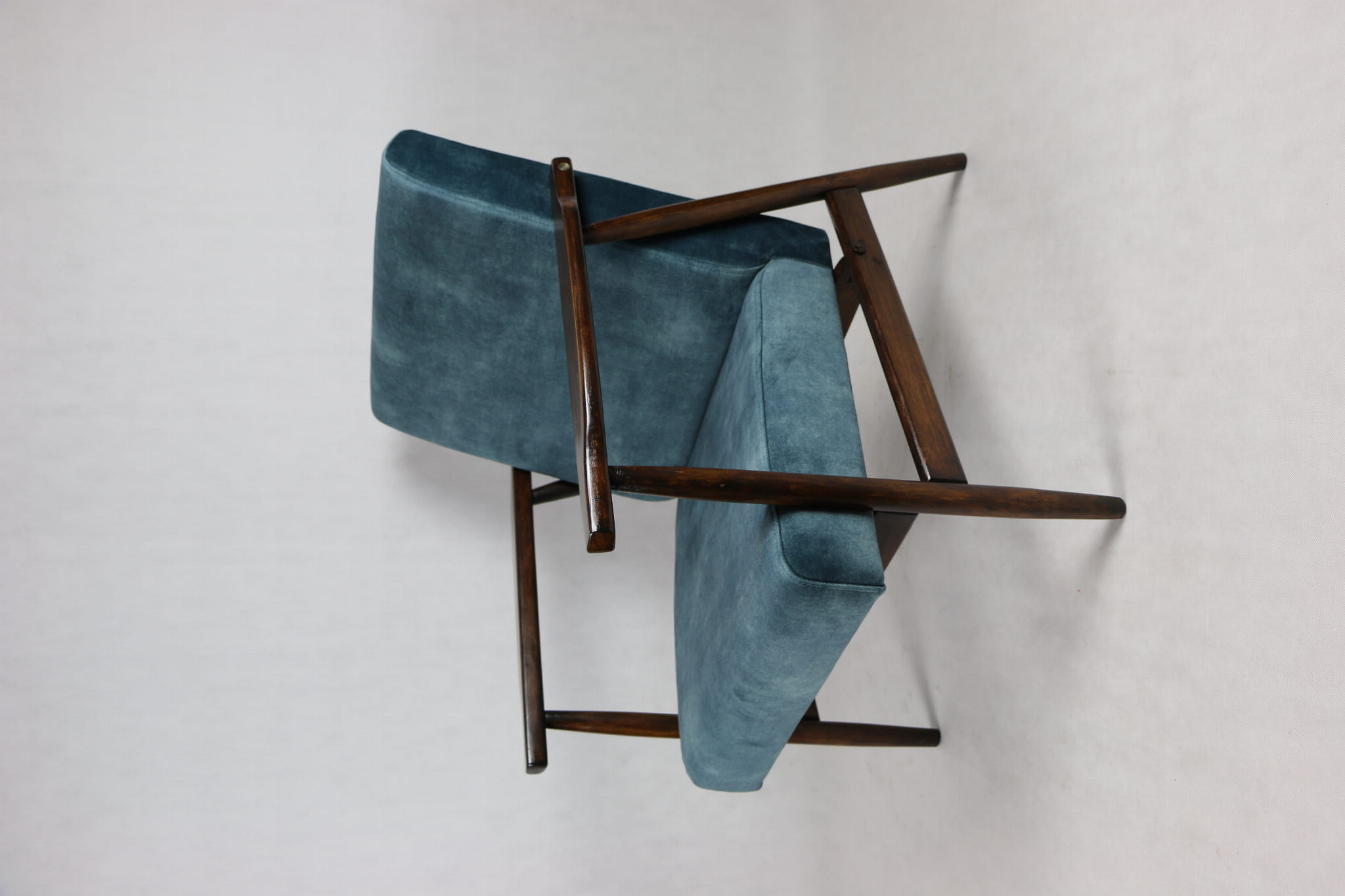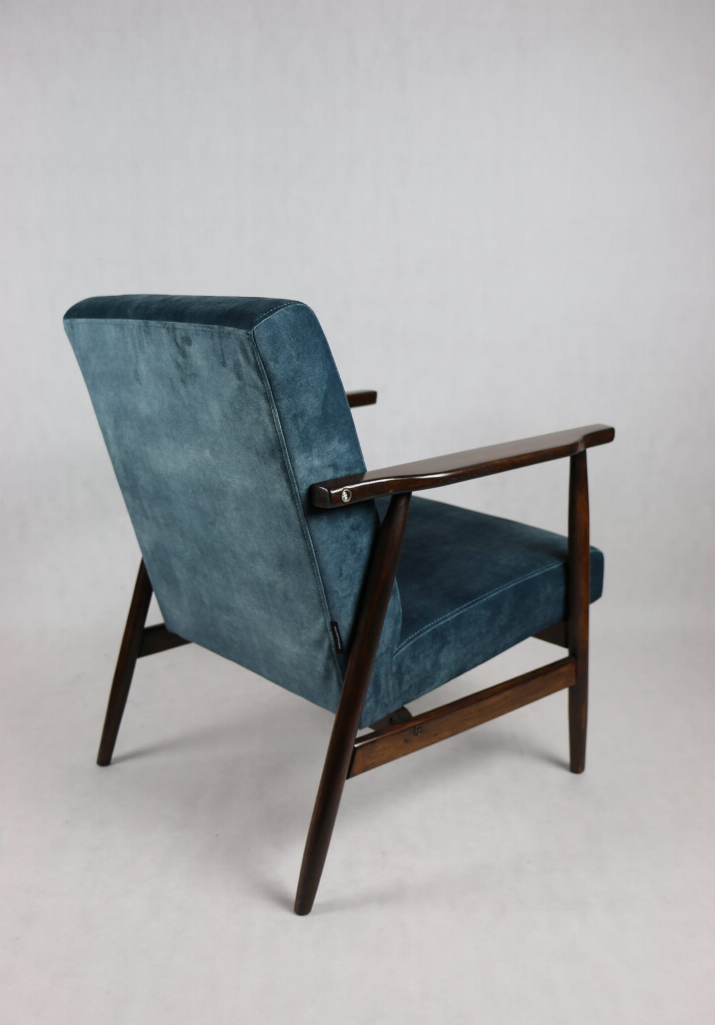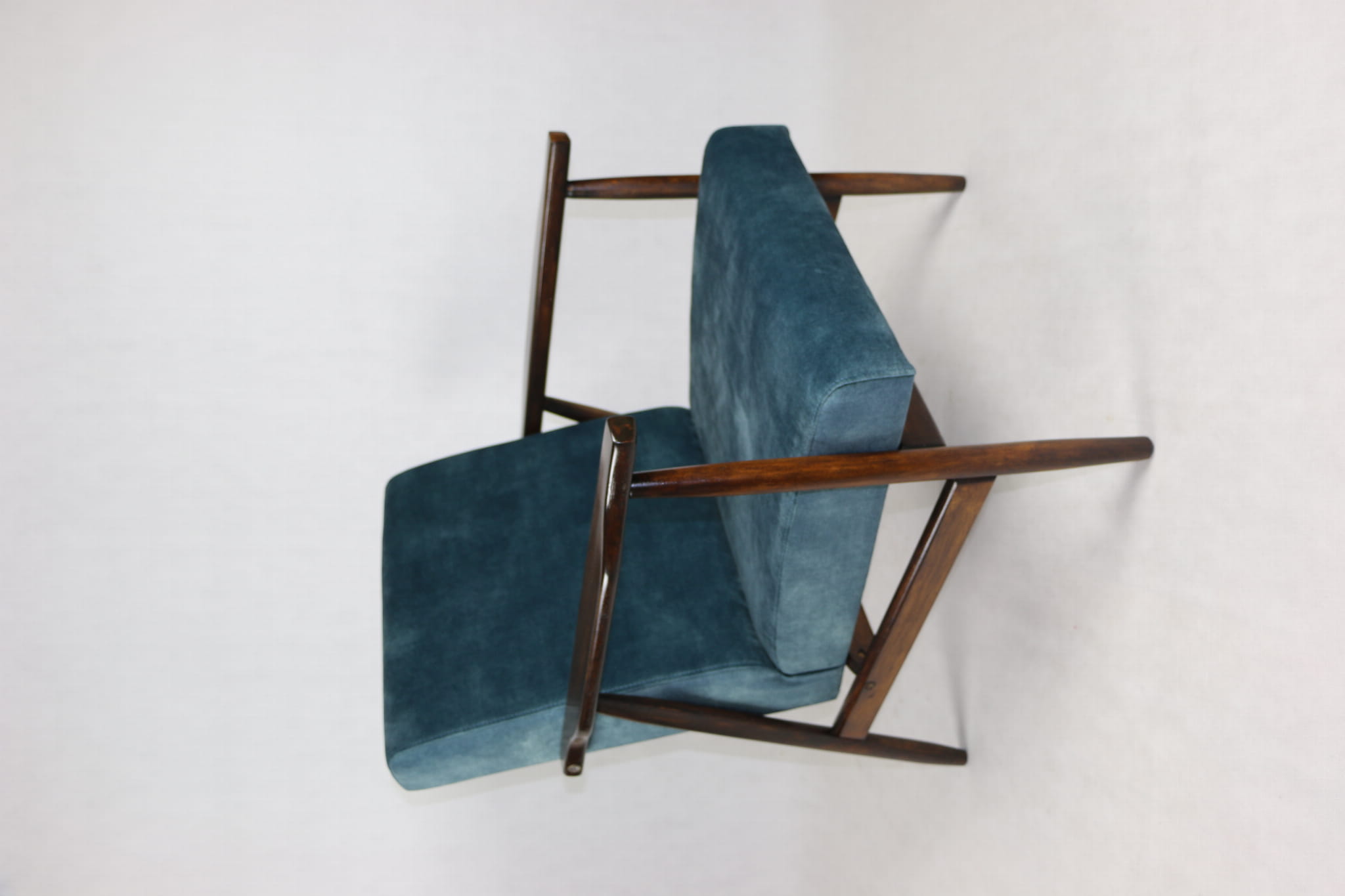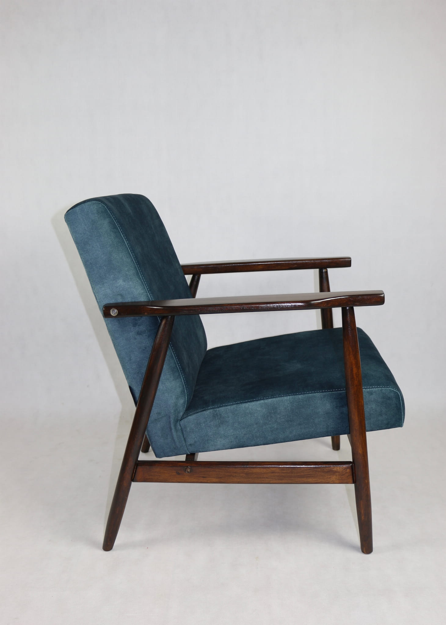 Fotel podobny do bardzo popularnego modelu Lis był produkowany przez zakłady meblarskie w Radomsku w latach 70 tych. Został całkowicie odrestaurowany, zyskał nowe i modne obicie w kolorze morskim - niebieskim - materiał typu welwet z serii Macau. Stelaż drewniany połączony jest z podłokietnikami w ciemnej kolorystyce drewna typu palisander pokryty lakierem.