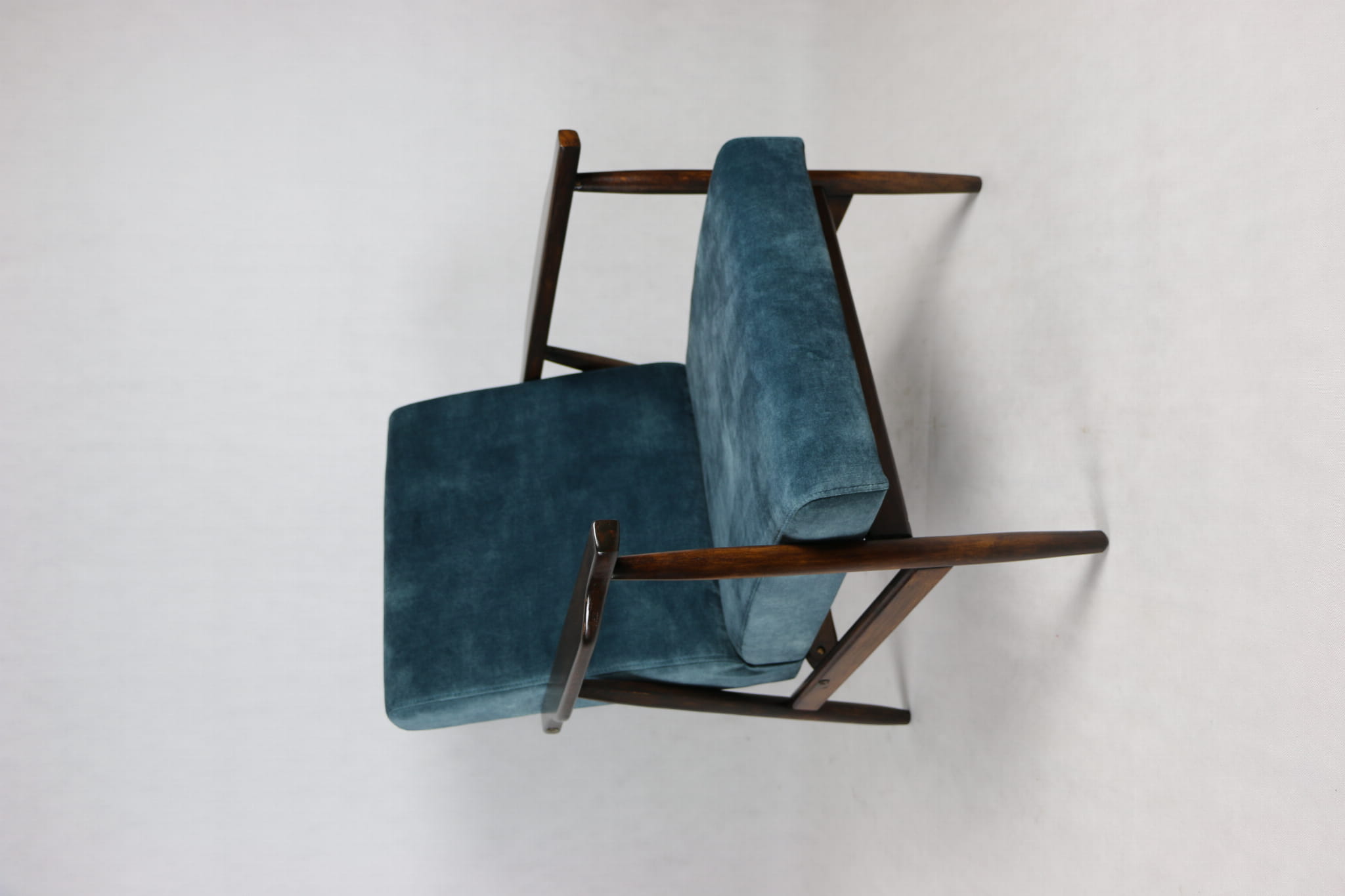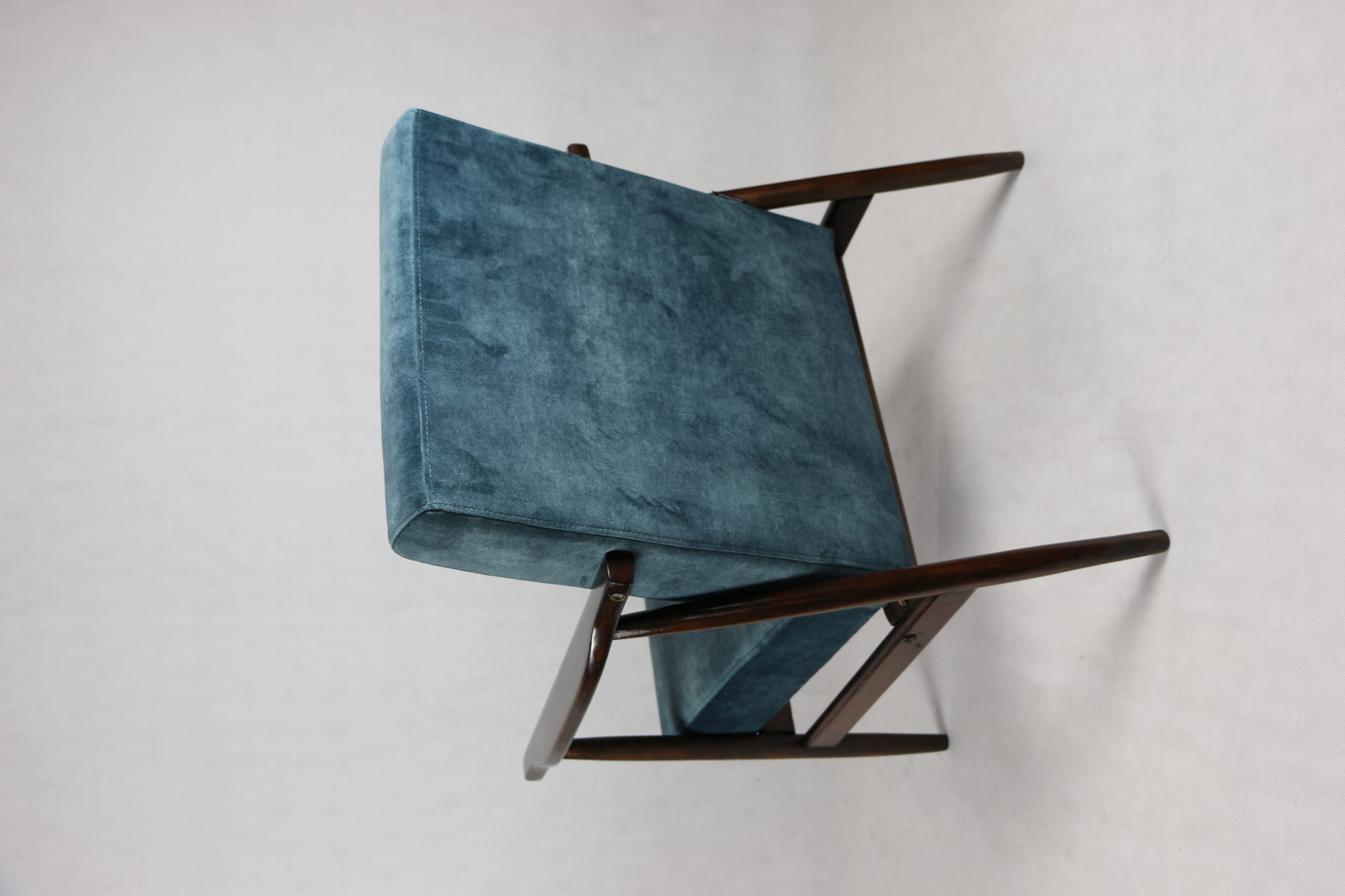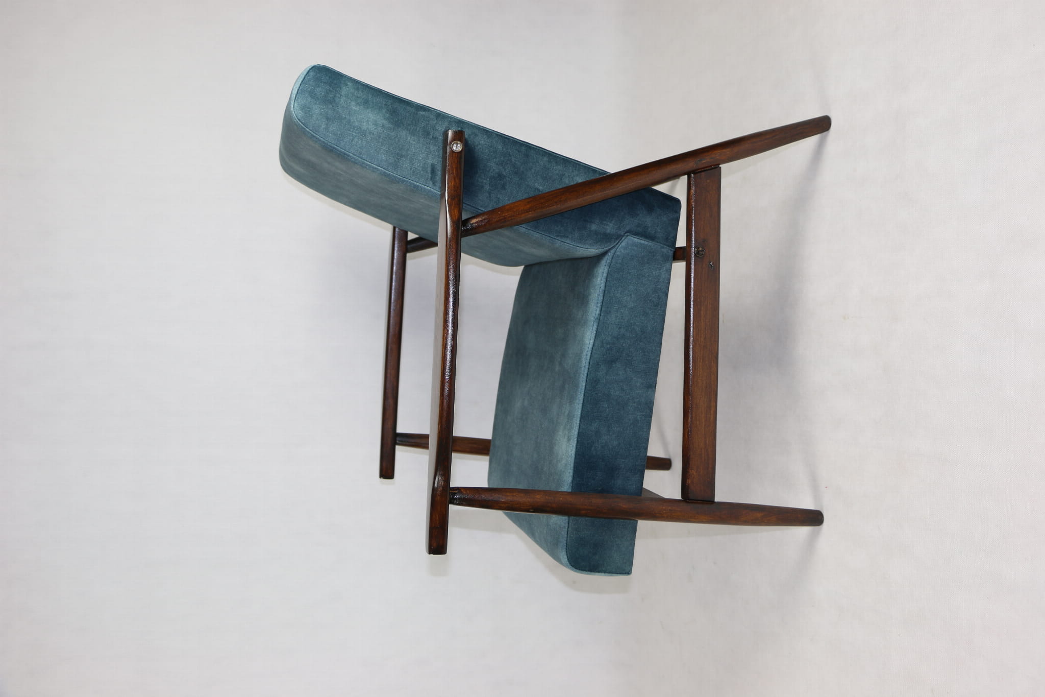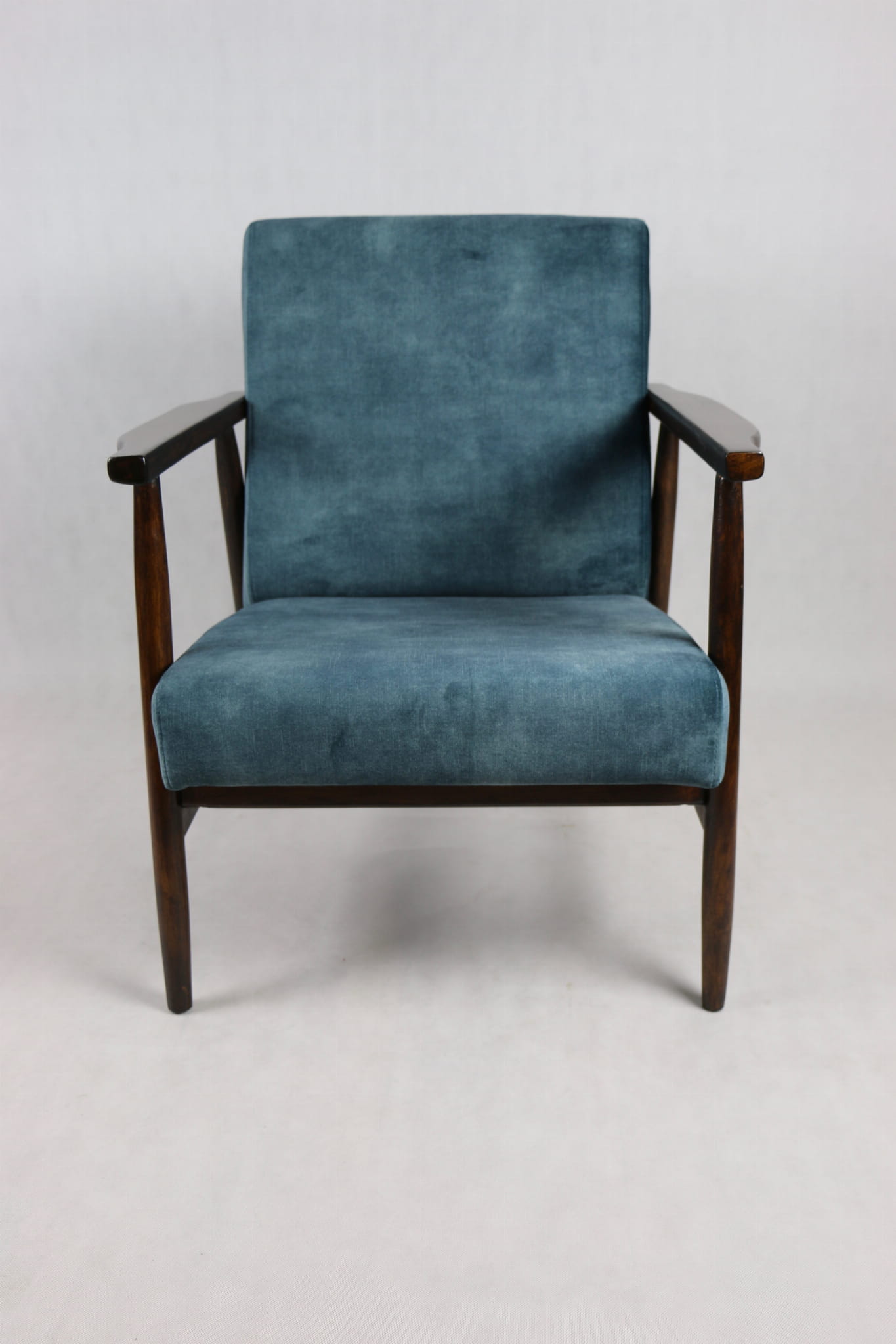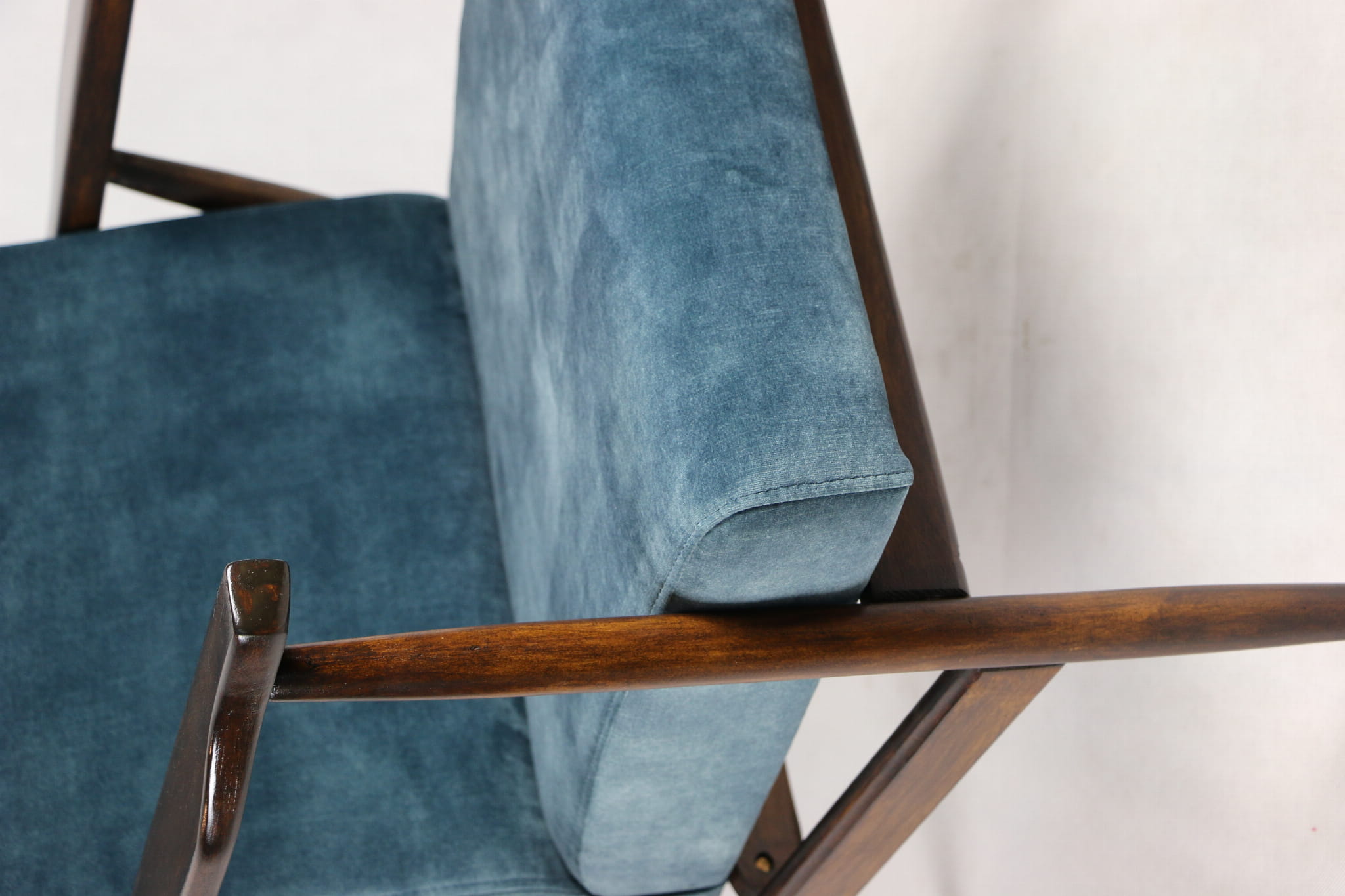 Fotel podobny do bardzo popularnego modelu Lis był produkowany przez zakłady meblarskie w Radomsku w latach 70 tych. Został całkowicie odrestaurowany, zyskał nowe i modne obicie w kolorze morskim - niebieskim - materiał typu welwet z serii Macau. Stelaż drewniany połączony jest z podłokietnikami w ciemnej kolorystyce drewna typu palisander pokryty lakierem.