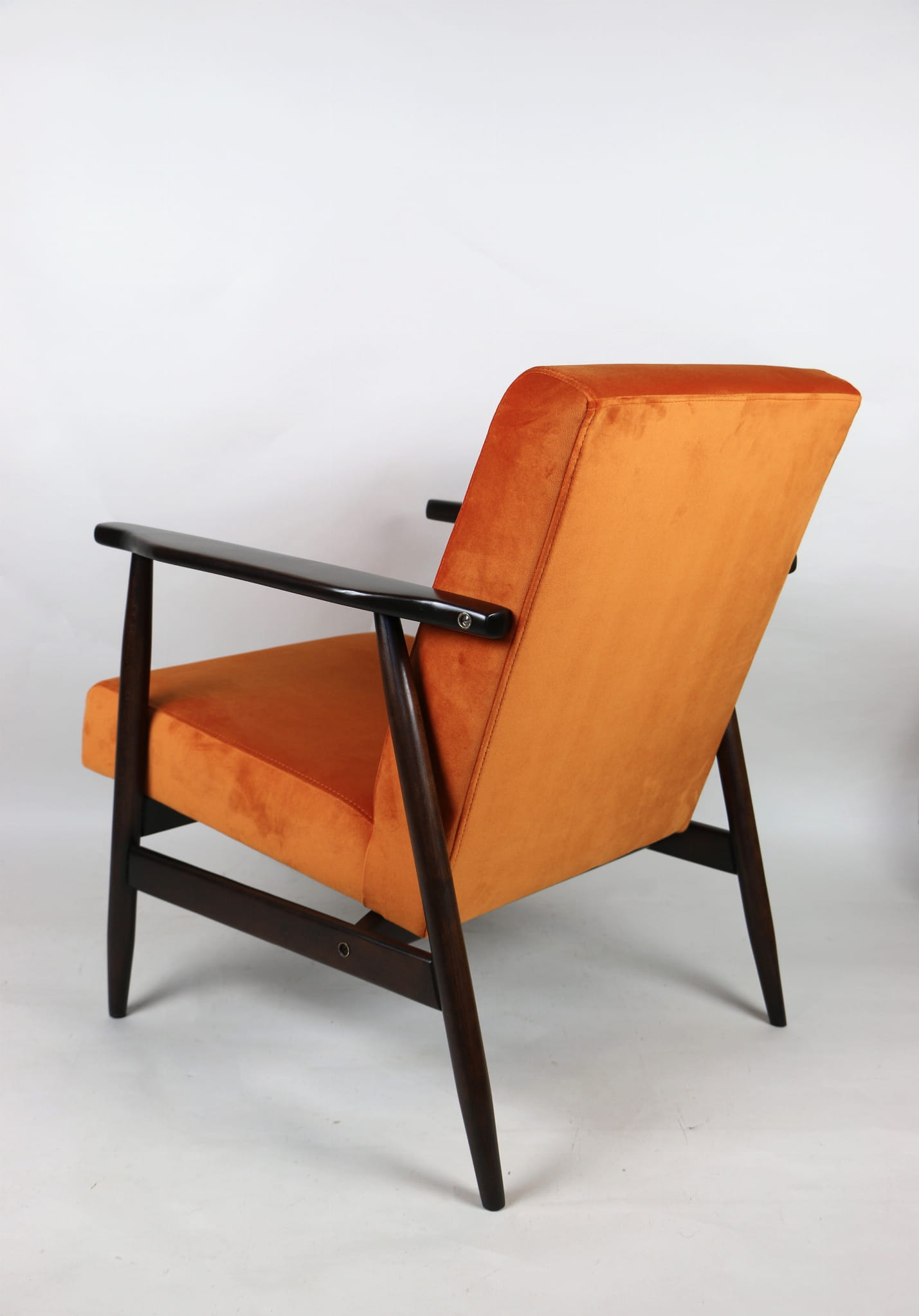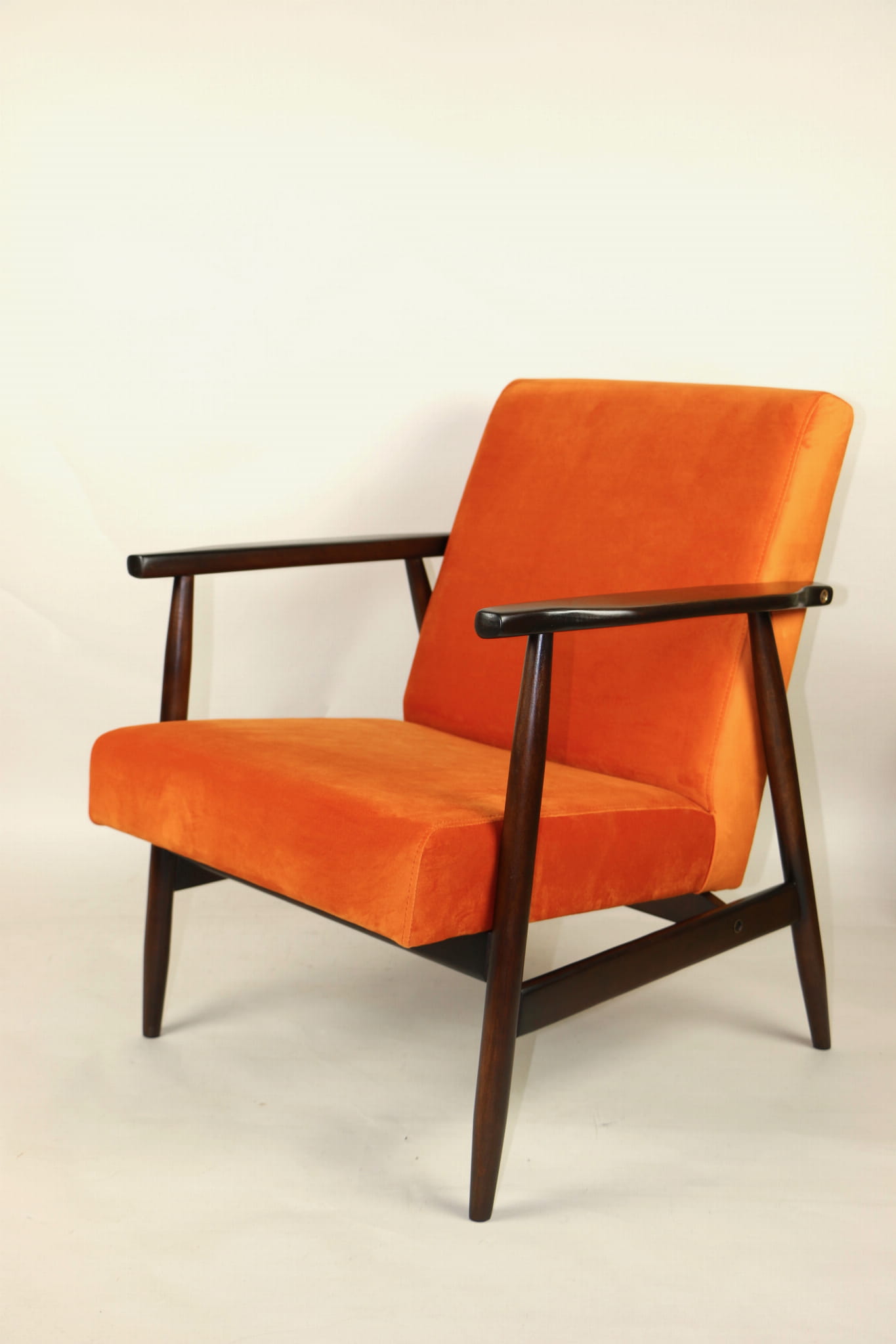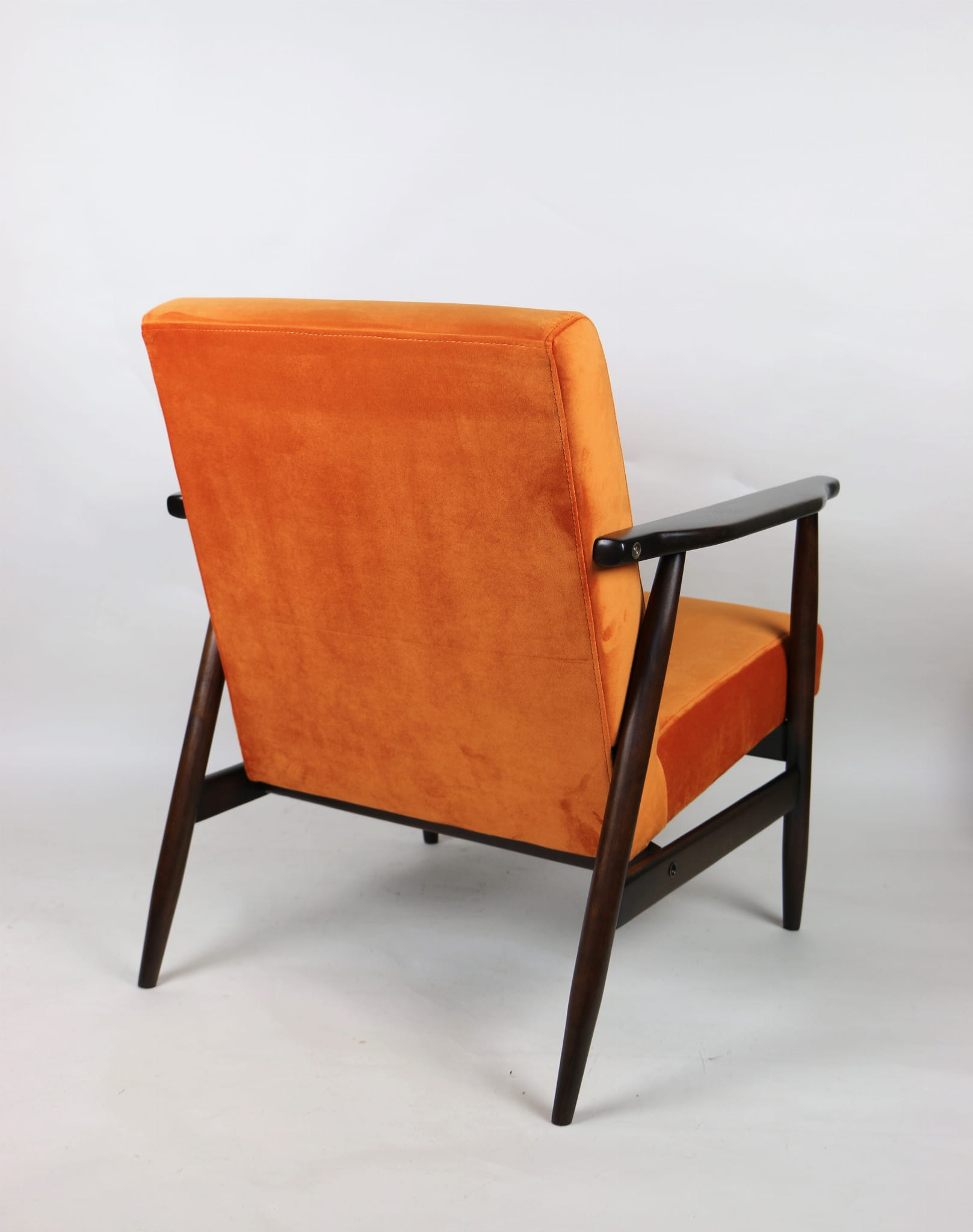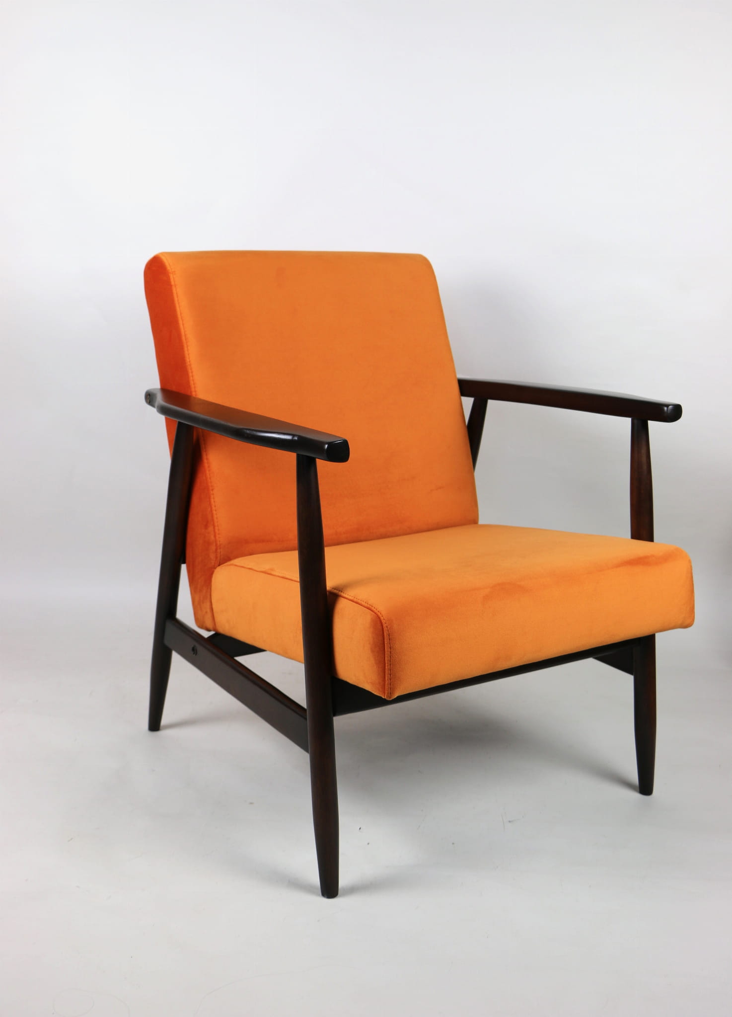 Fotel podobny do bardzo popularnego modelu Lis był produkowany przez zakłady meblarskie w Radomsku w latach 70 tych. Został całkowicie odrestaurowany, zyskał nowe i modne aksamitne obicie w kolorze pomarańczowym typu welwet. Stelaż drewniany połączony jest z podłokietnikami w ciemnej kolorystyce drewna typu orzech pokryty lakierem.