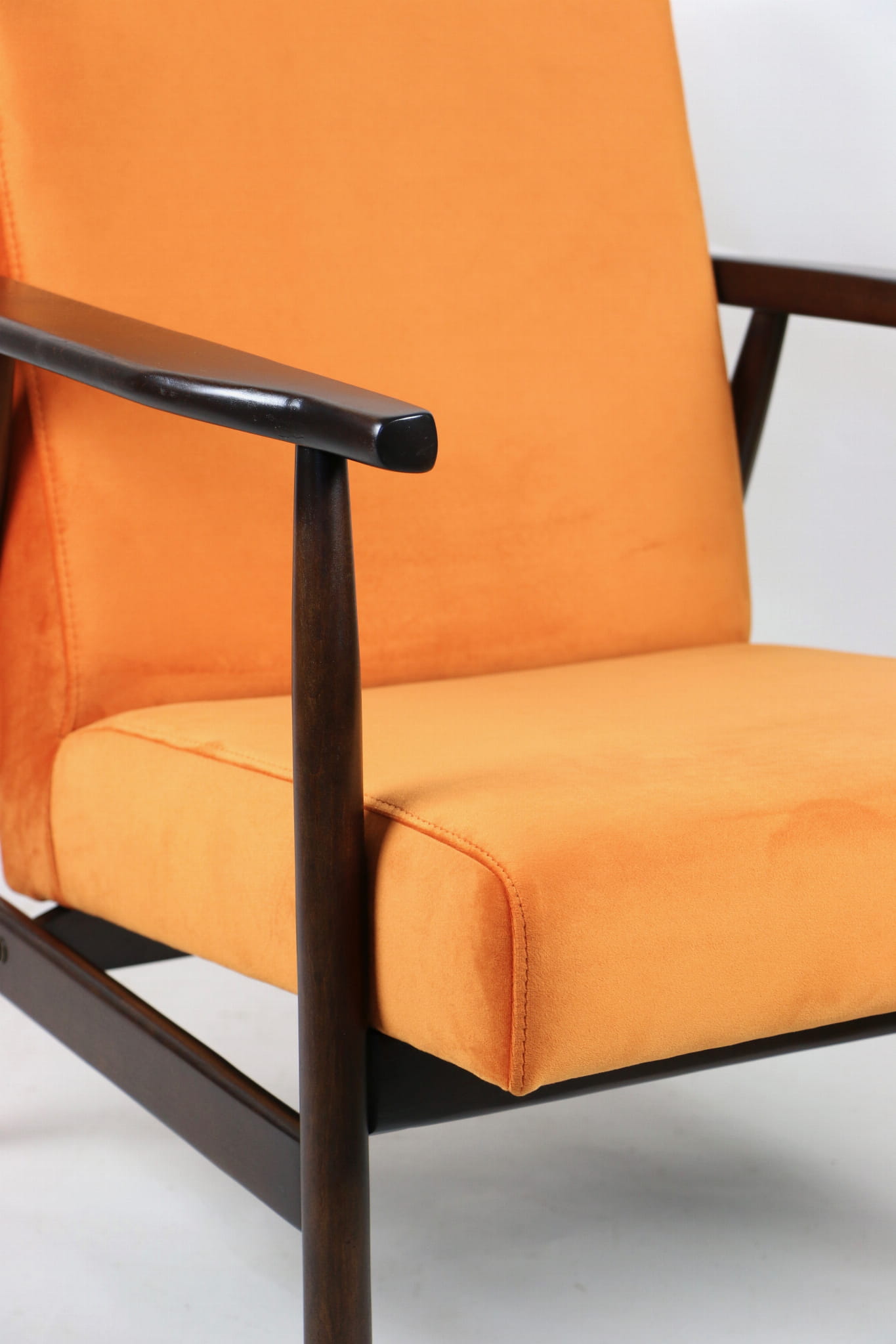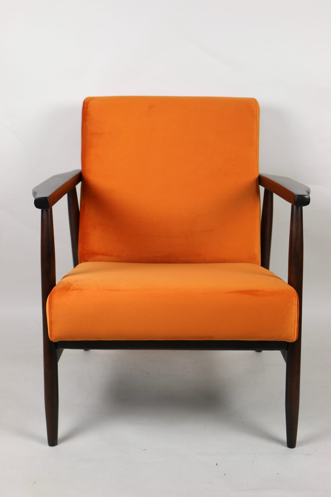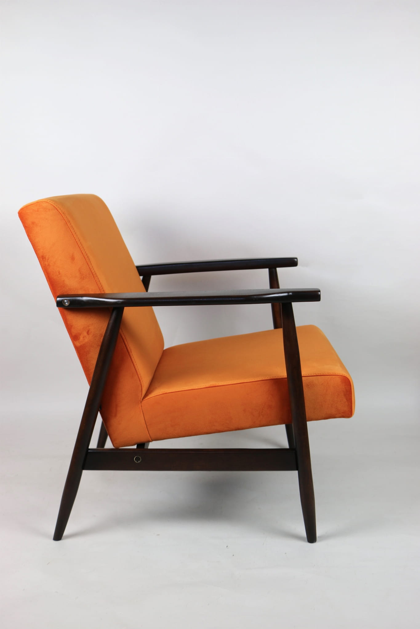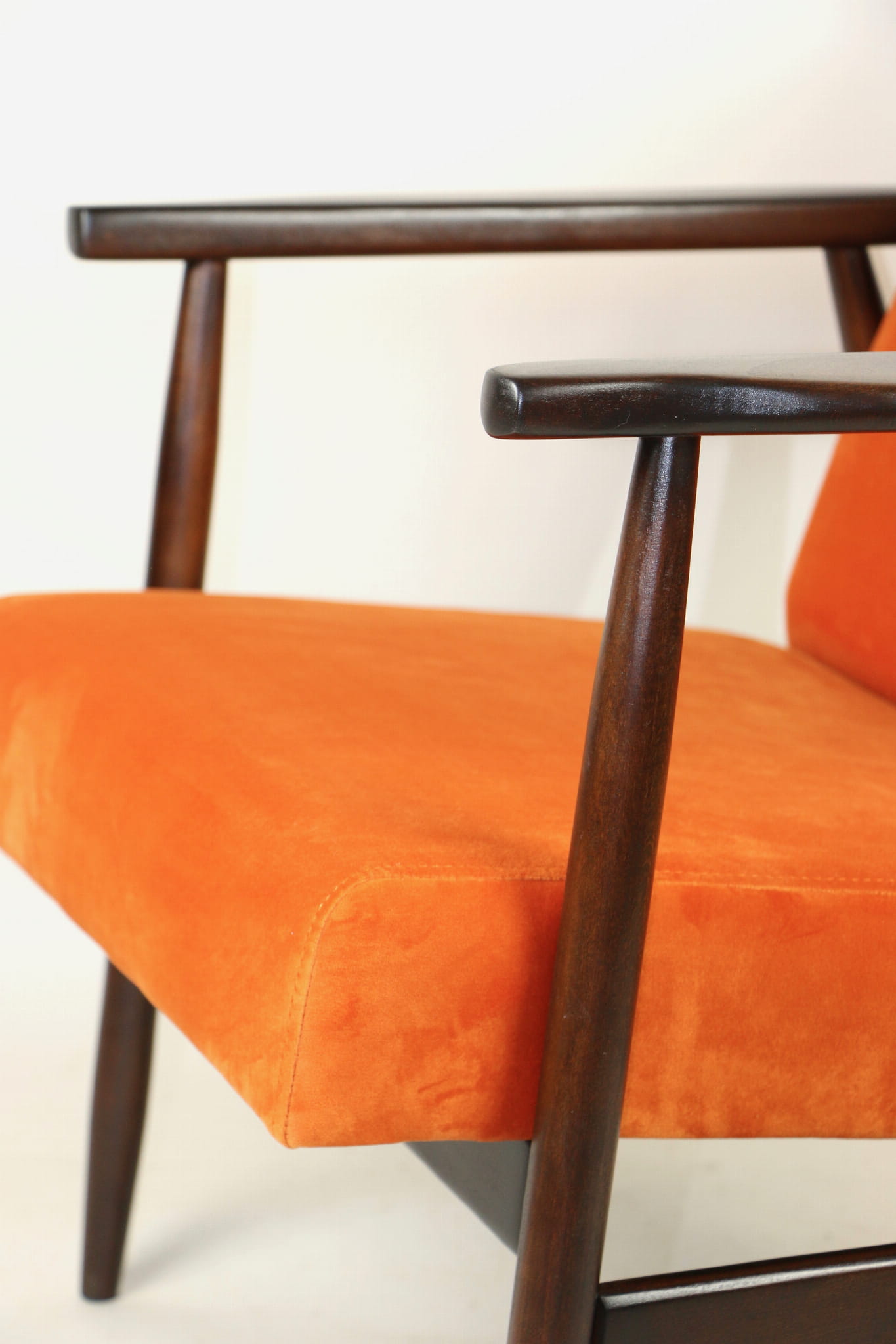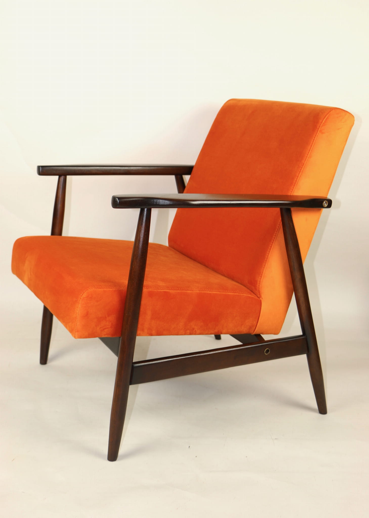 Fotel podobny do bardzo popularnego modelu Lis był produkowany przez zakłady meblarskie w Radomsku w latach 70 tych. Został całkowicie odrestaurowany, zyskał nowe i modne aksamitne obicie w kolorze pomarańczowym typu welwet. Stelaż drewniany połączony jest z podłokietnikami w ciemnej kolorystyce drewna typu orzech pokryty lakierem.