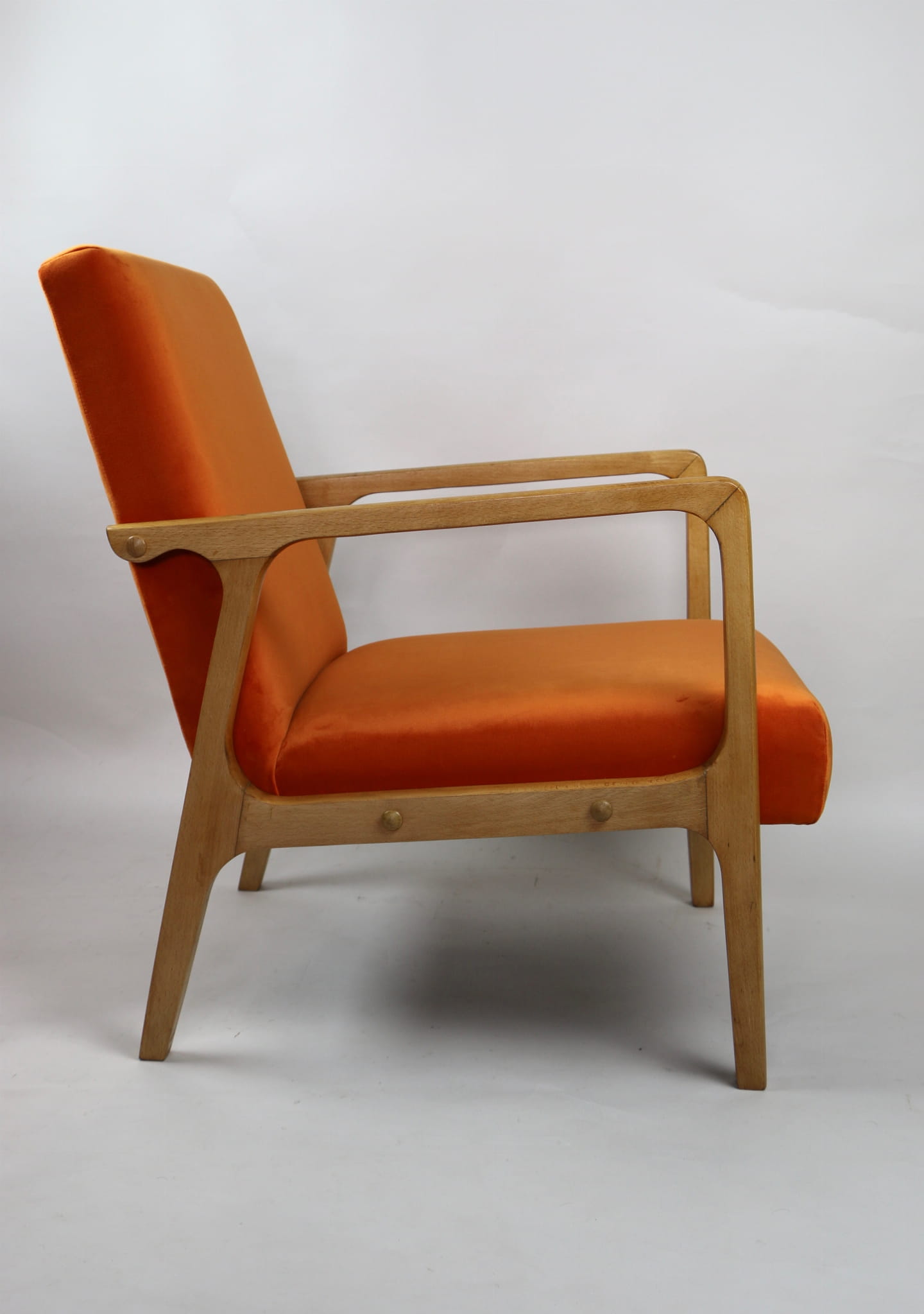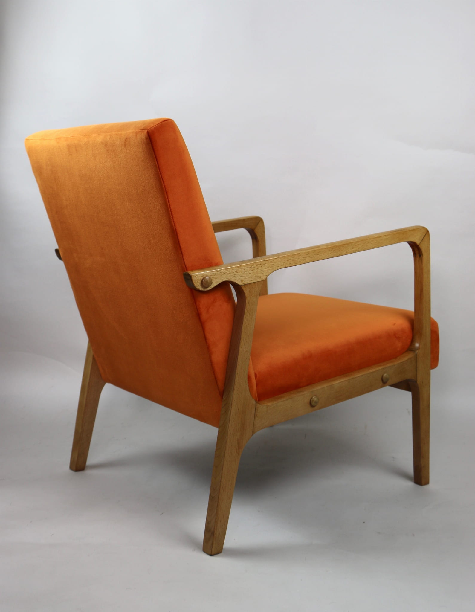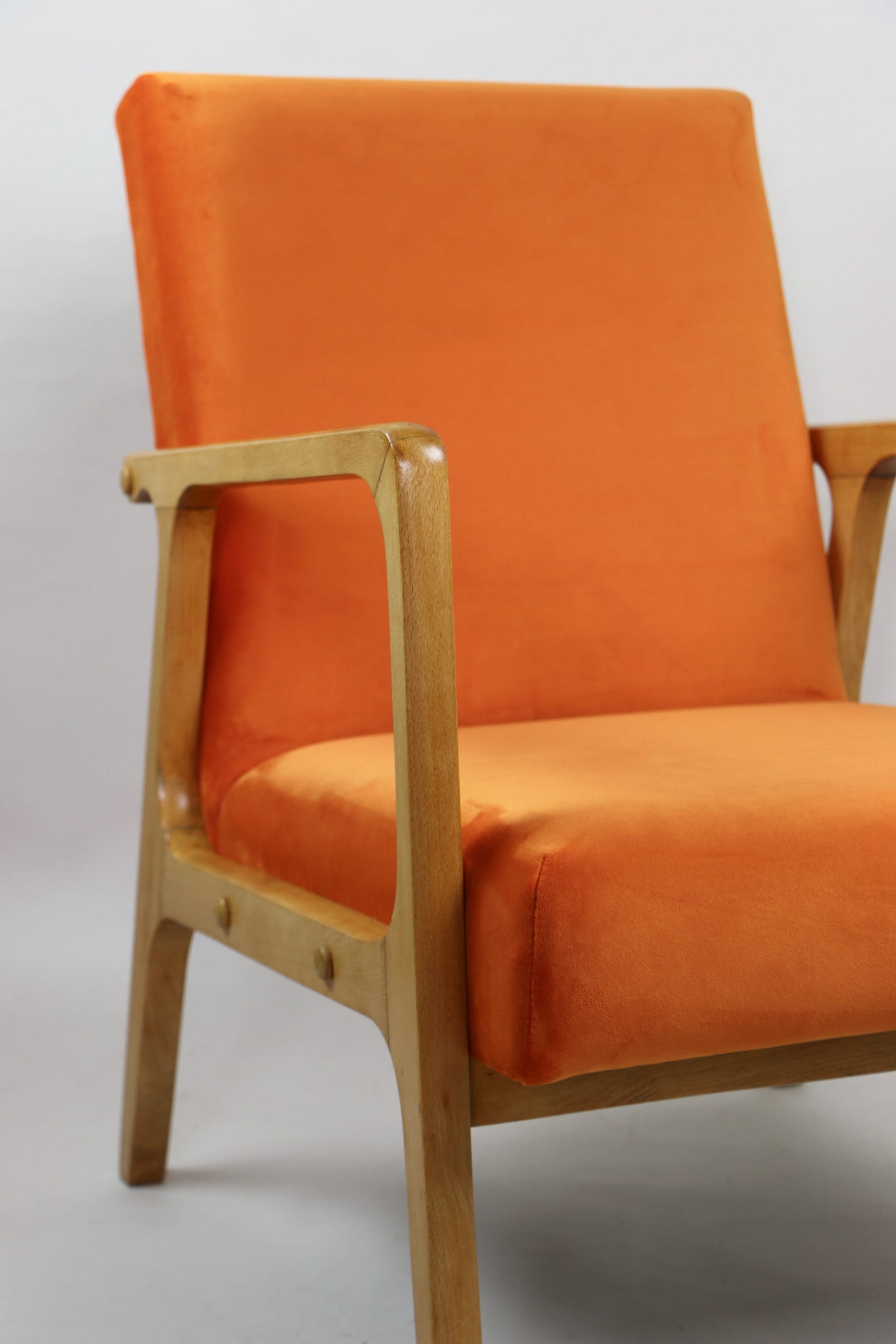 Fotel klasyczny Vintage z lat 70. Został całkowicie odrestaurowany. Zyskał nowe obicie pokryte aksymintnym materiałem tapicerskim w kolorze pomarańczowym. Stelaż drewniany z podłokietnikami w kolorze naturalnego drewna utrwalony olejowoskiem. Dostępne 3 sztuki.