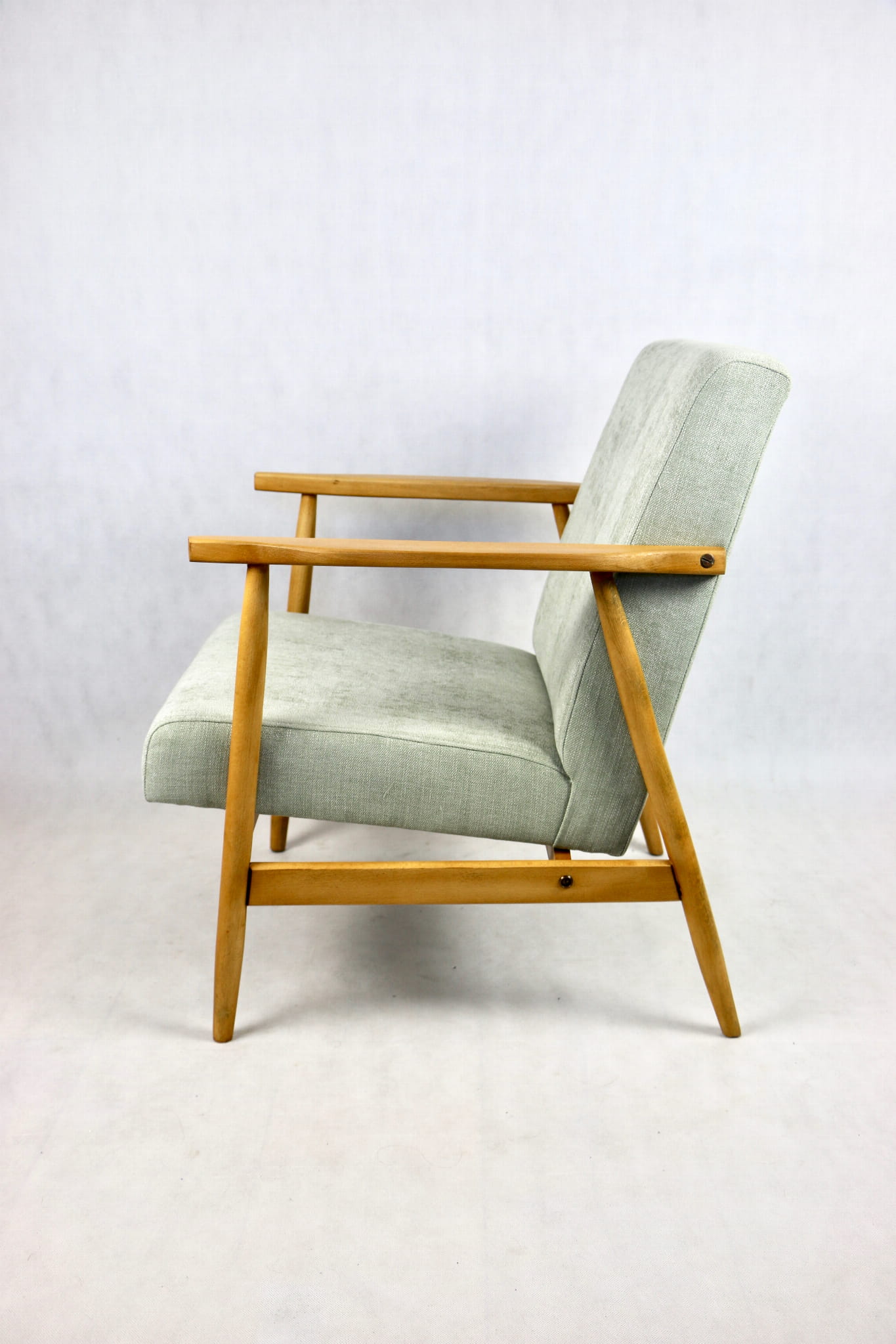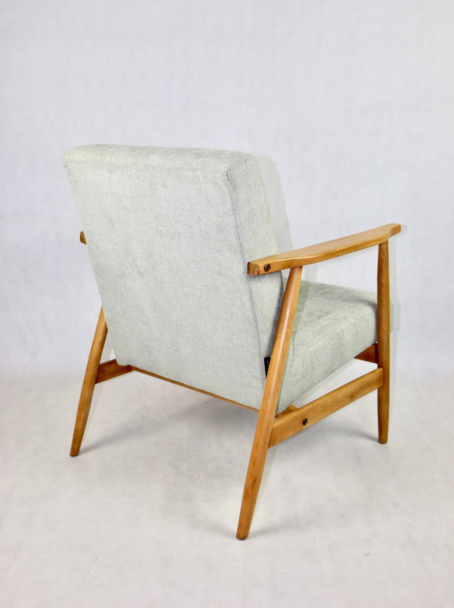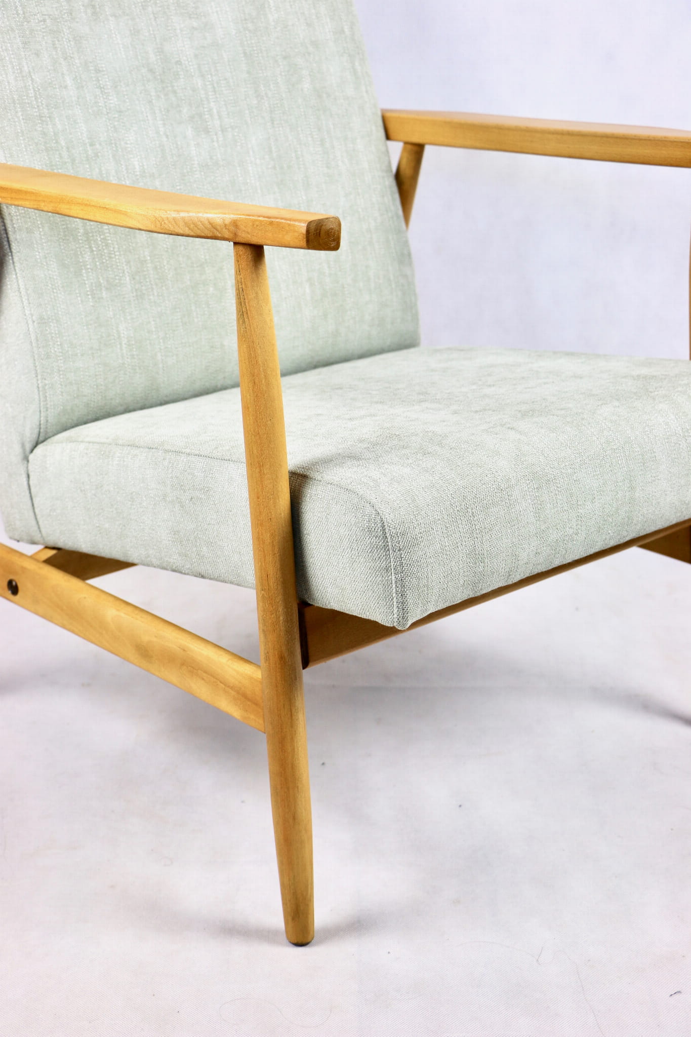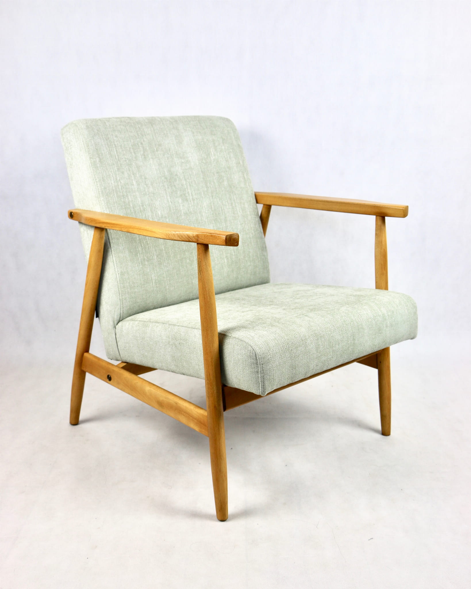 Fotel podobny do bardzo popularnego modelu Lis był produkowany przez zakłady meblarskie w Radomsku w latach 70 tych. Został całkowicie odrestaurowany, zyskał nowe i modne obicie w kolorze seledynowym - materiał typu strukturalnego z serii Boucle. Stelaż drewniany połączony jest z podłokietnikami w jasnej kolorystyce drewna pokryty lakierem.