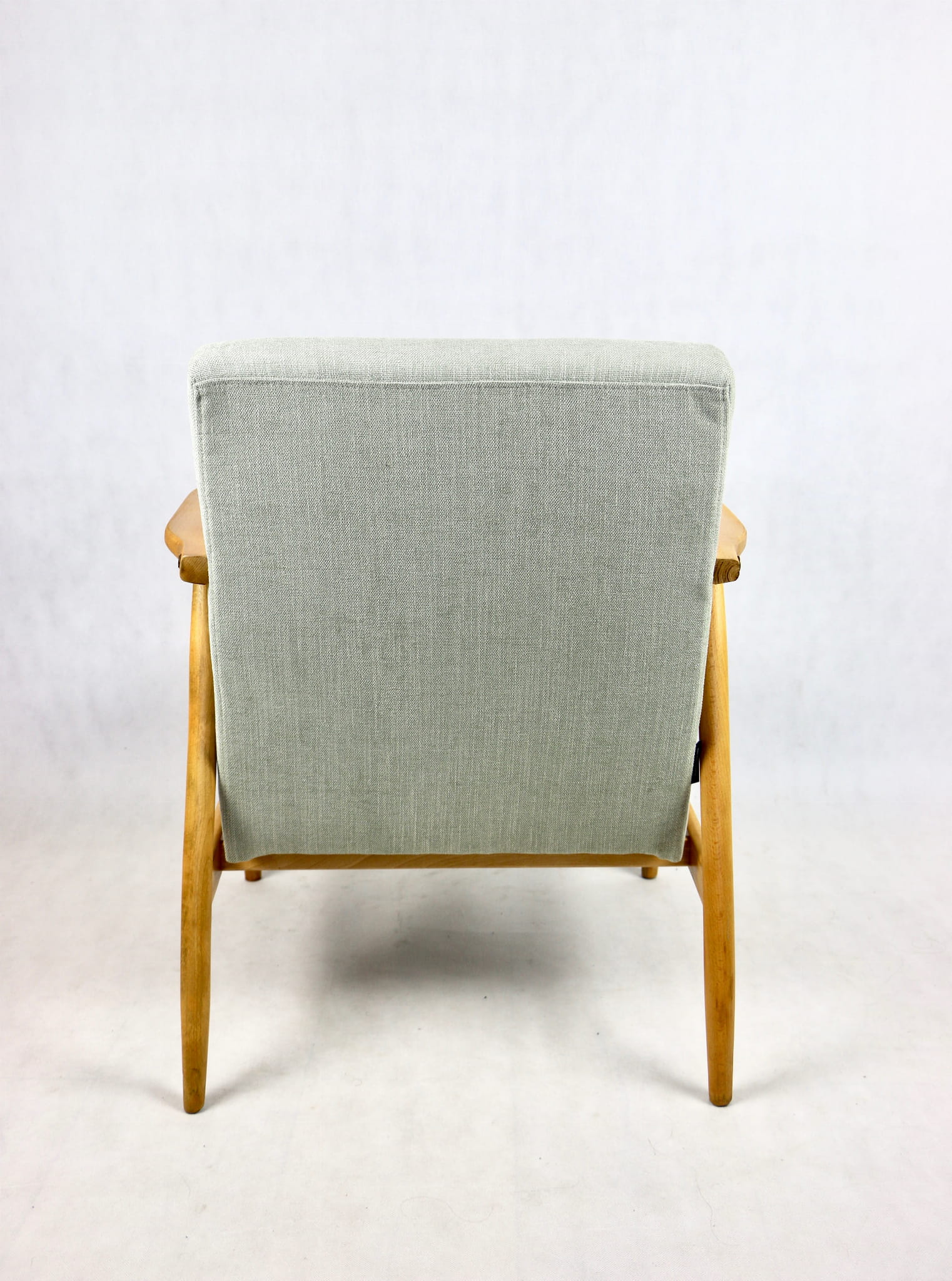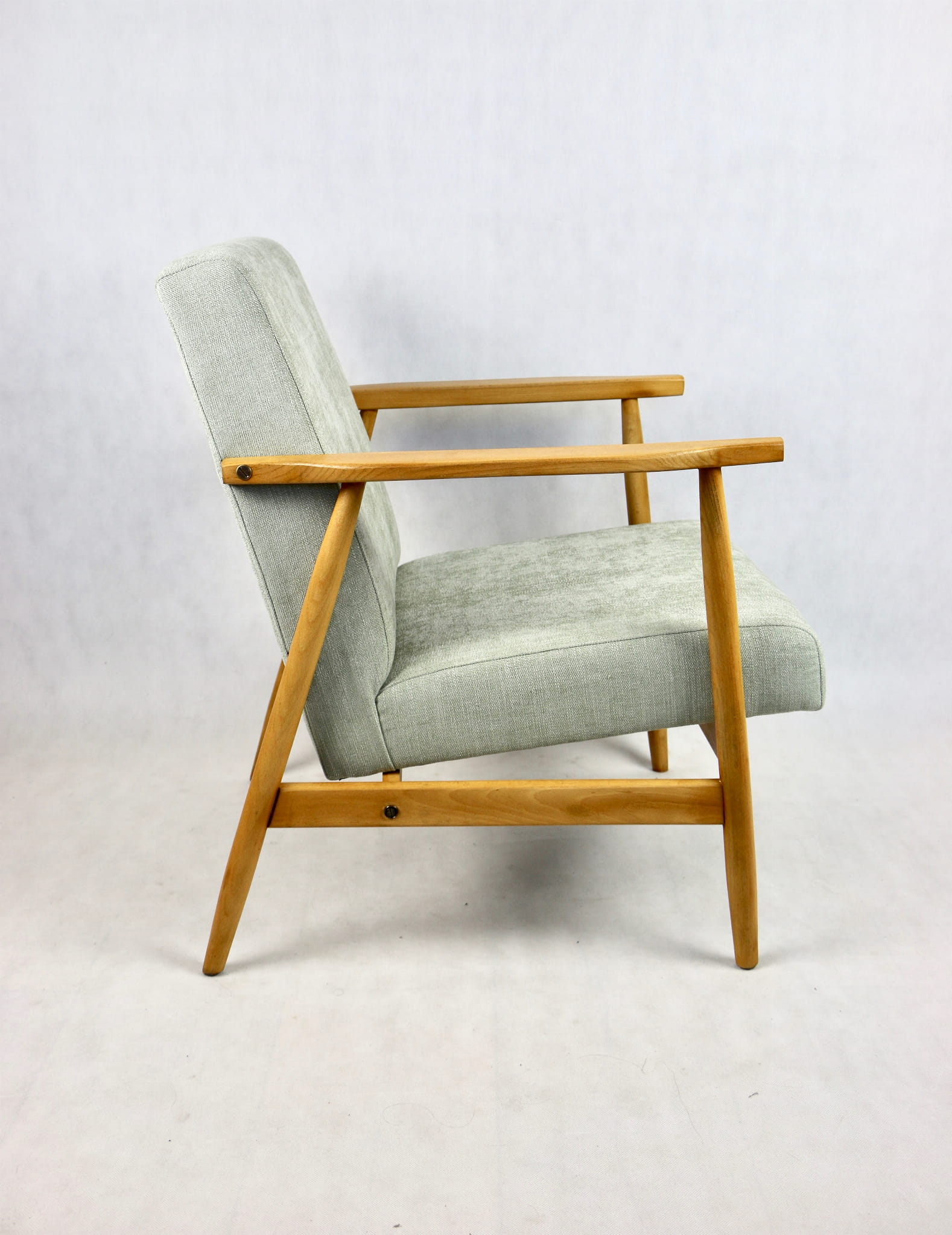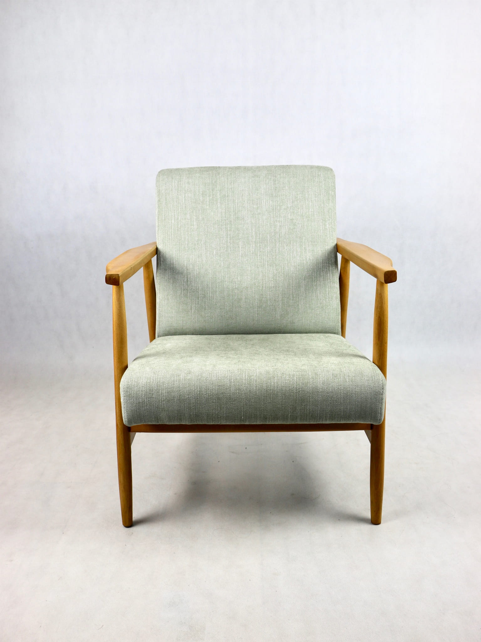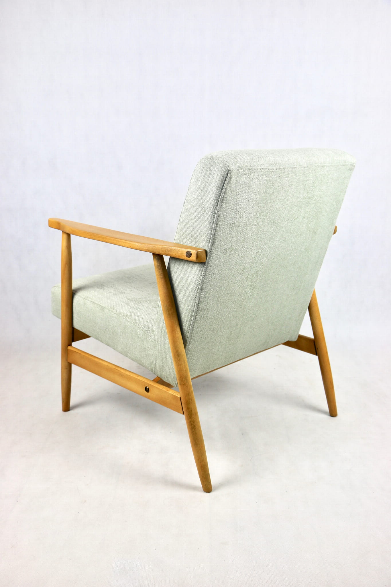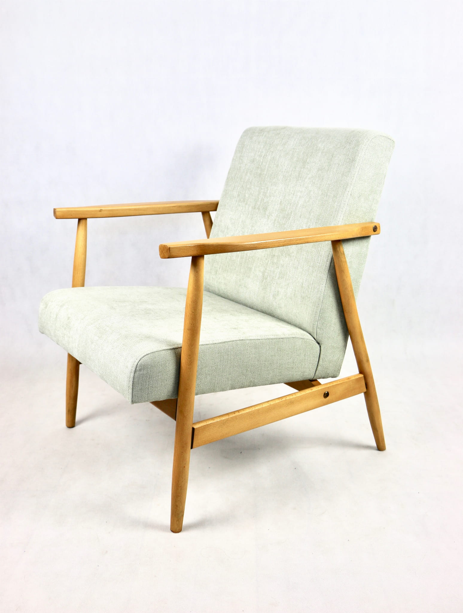 Fotel podobny do bardzo popularnego modelu Lis był produkowany przez zakłady meblarskie w Radomsku w latach 70 tych. Został całkowicie odrestaurowany, zyskał nowe i modne obicie w kolorze seledynowym - materiał typu strukturalnego z serii Boucle. Stelaż drewniany połączony jest z podłokietnikami w jasnej kolorystyce drewna pokryty lakierem.
