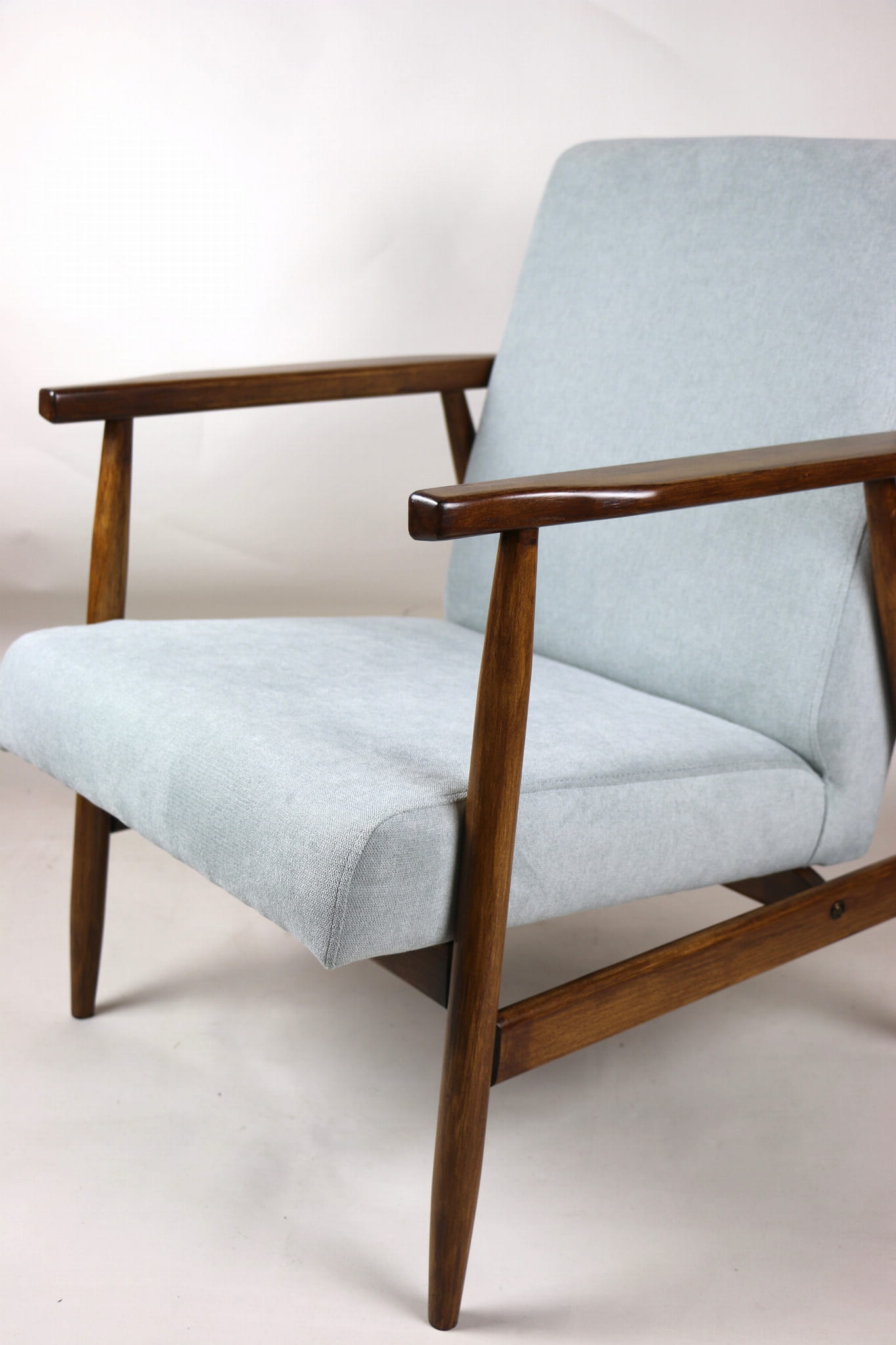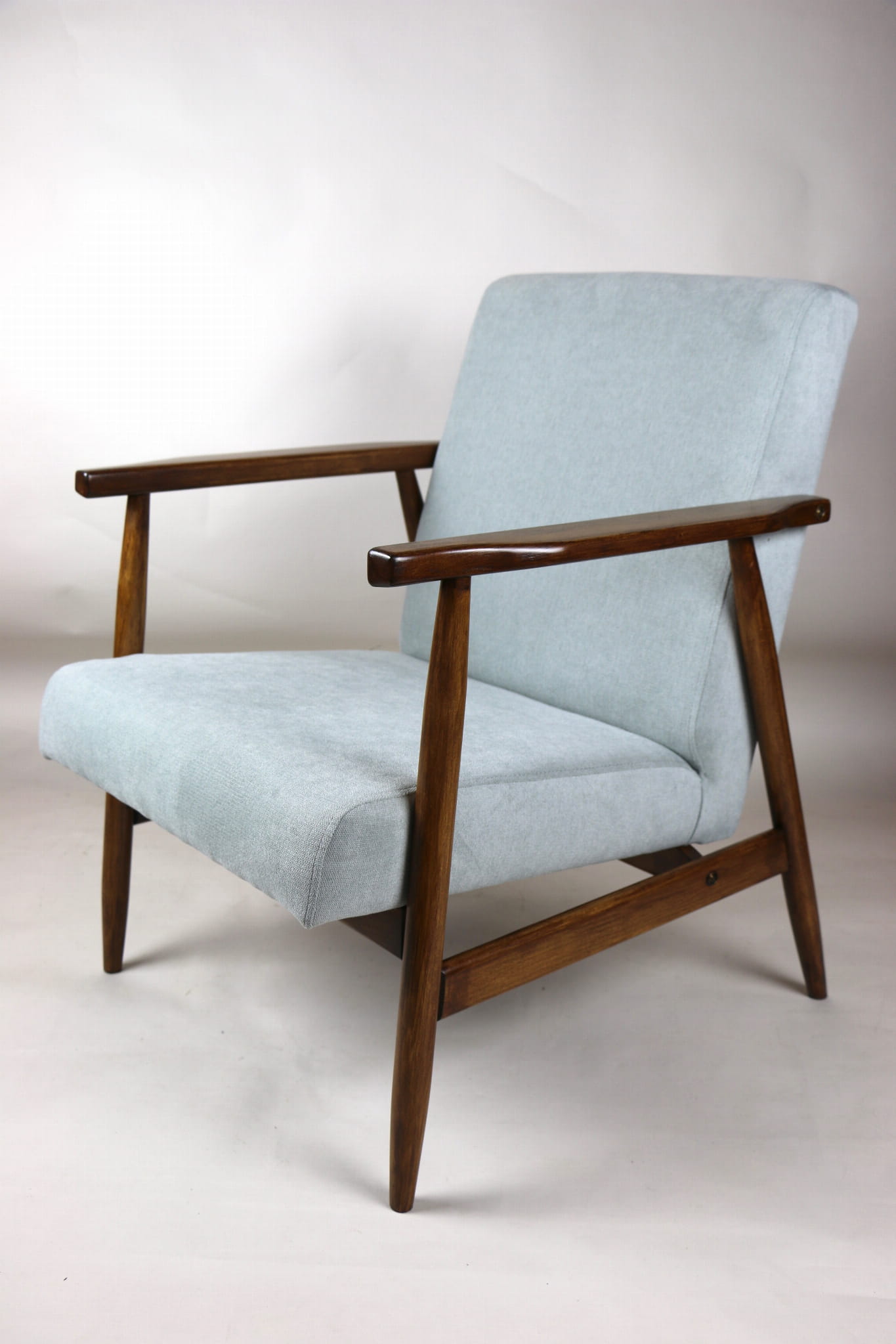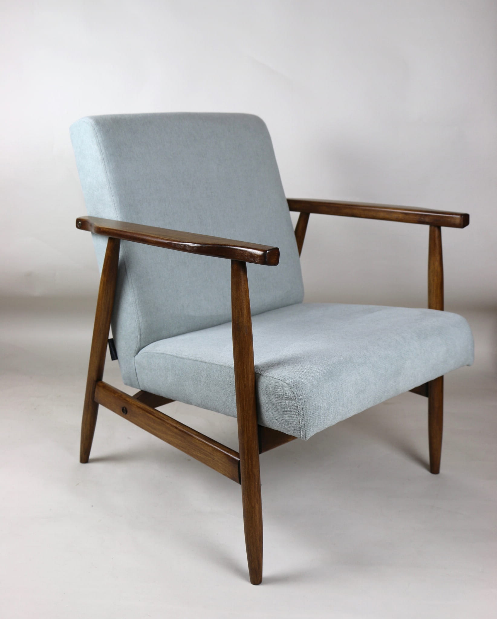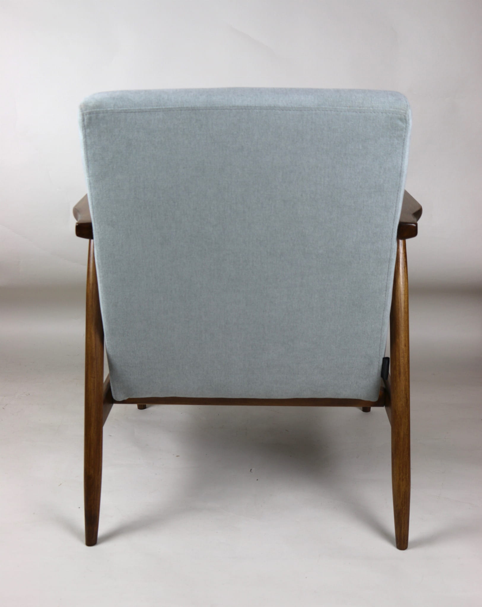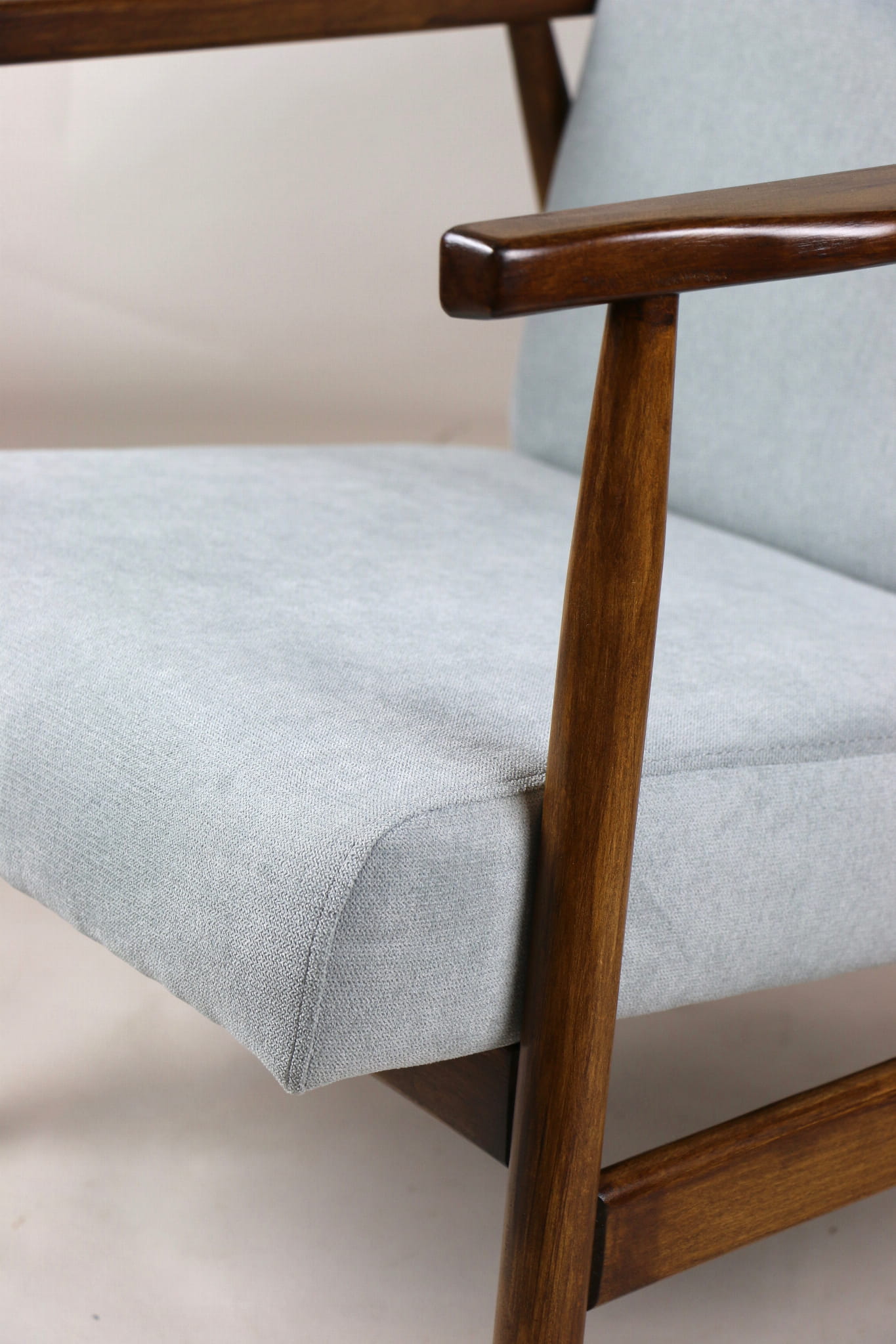 Fotel podobny do bardzo popularnego modelu Lis był produkowany przez zakłady meblarskie w Radomsku w latach 70 tych. Został całkowicie odrestaurowany, zyskał nowe i modne obicie w kolorze szaro-zielonym - materiał strukturalny. Stelaż drewniany połączony jest z podłokietnikami w ciemnej kolorystyce drewna typu orzech pokryty lakierem.