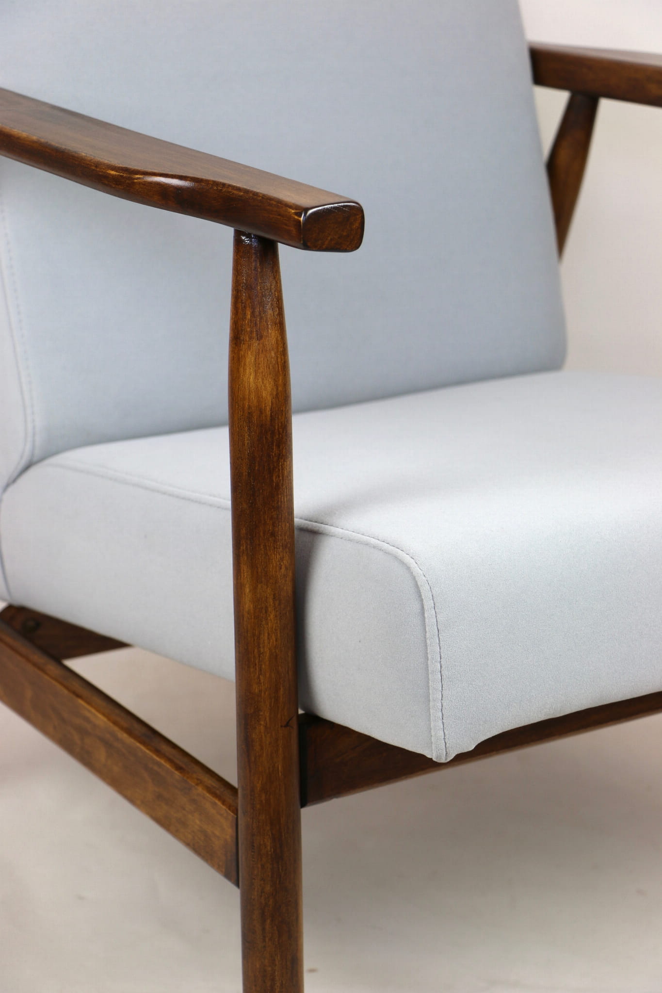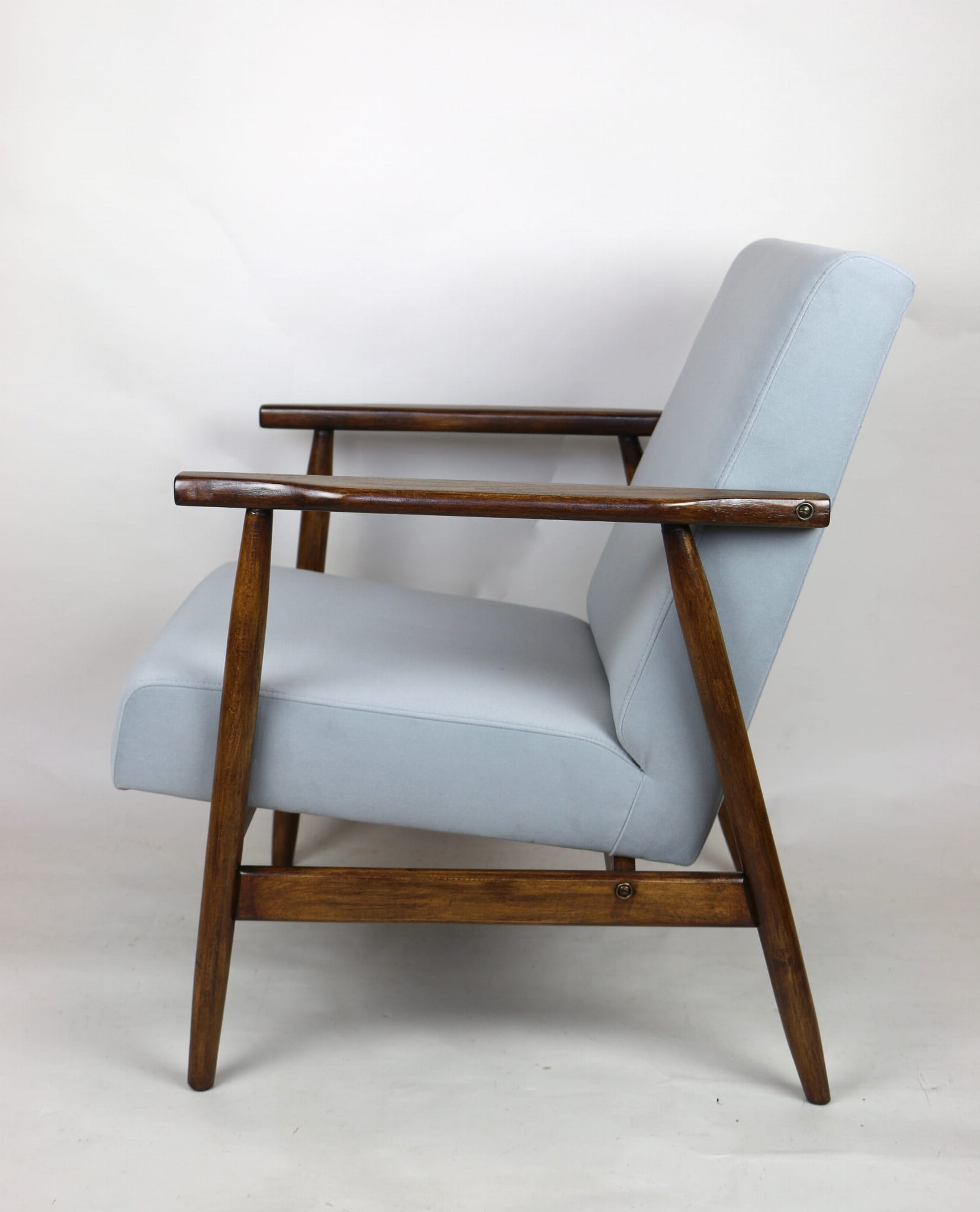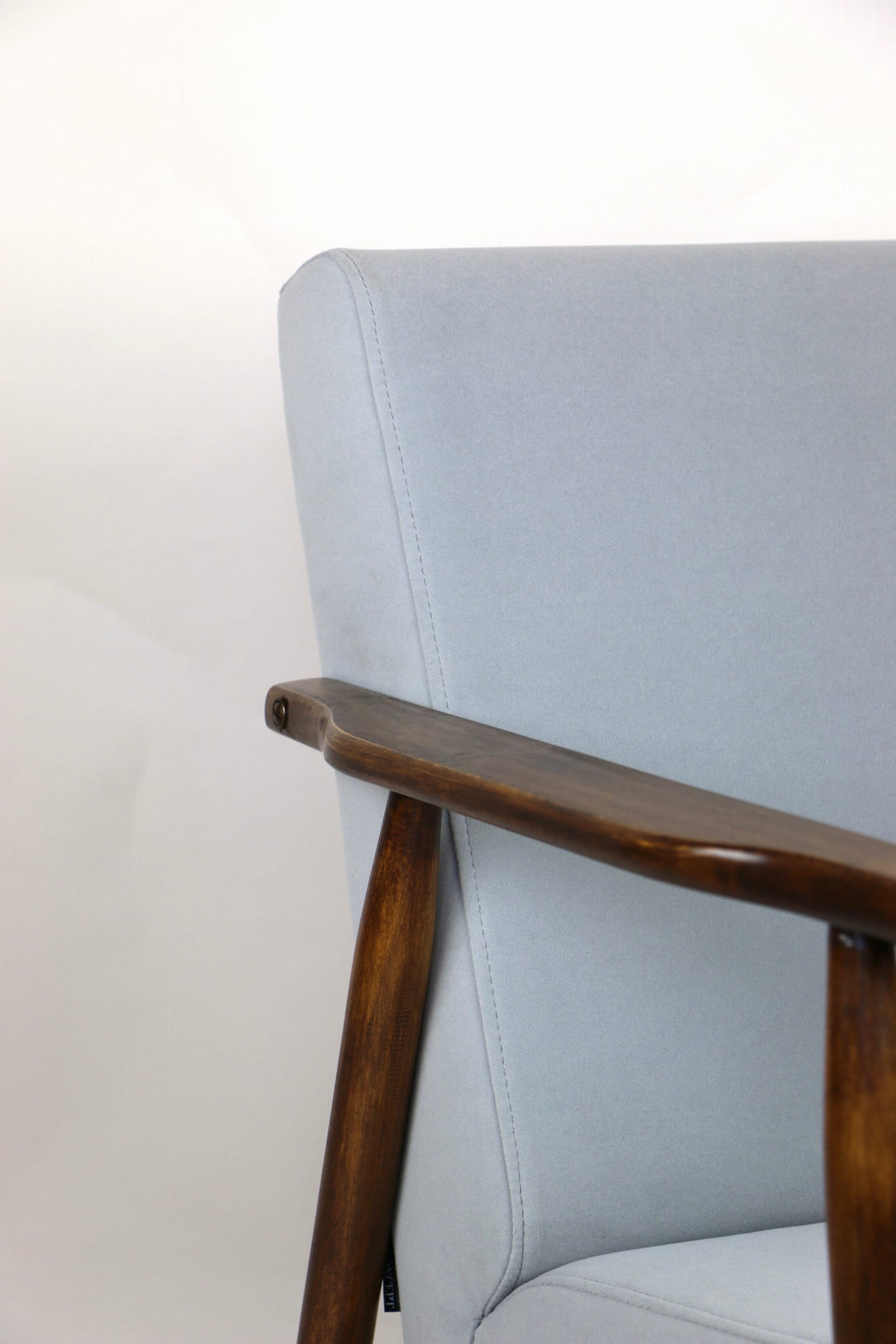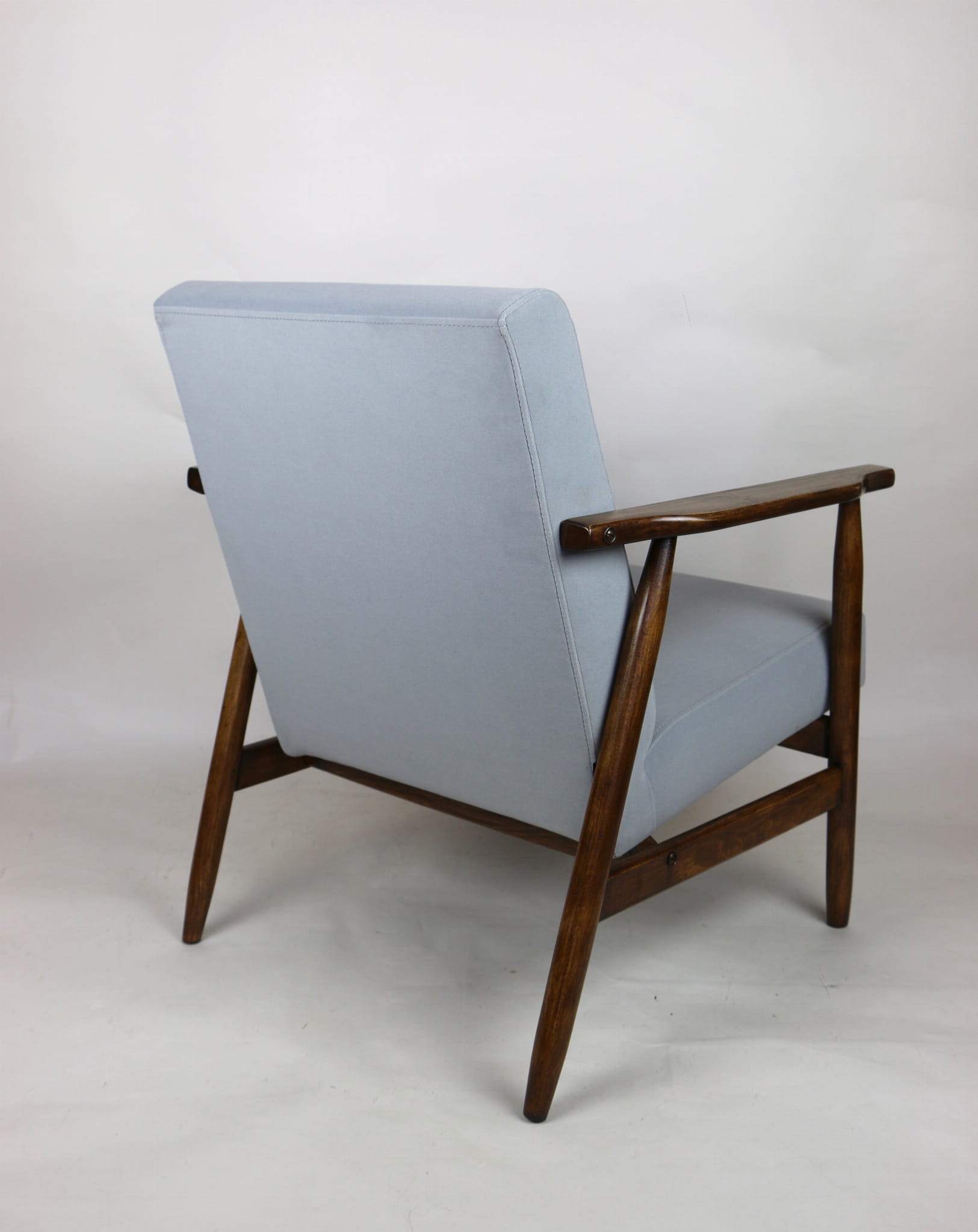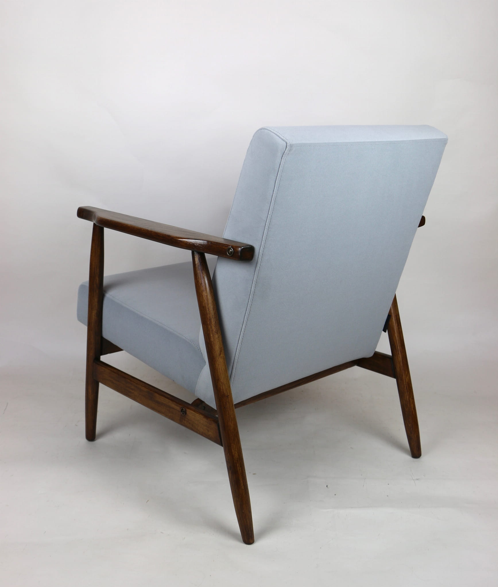 Fotel podobny do bardzo popularnego modelu Lis był produkowany przez zakłady meblarskie w Radomsku w latach 70 tych. Został całkowicie odrestaurowany, zyskał nowe i modne obicie w kolorze szarym- materiał welwet z serii Jade - kolor 804. Stelaż drewniany połączony jest z podłokietnikami w ciemnej kolorystyce drewna typu orzech pokryty lakierem.