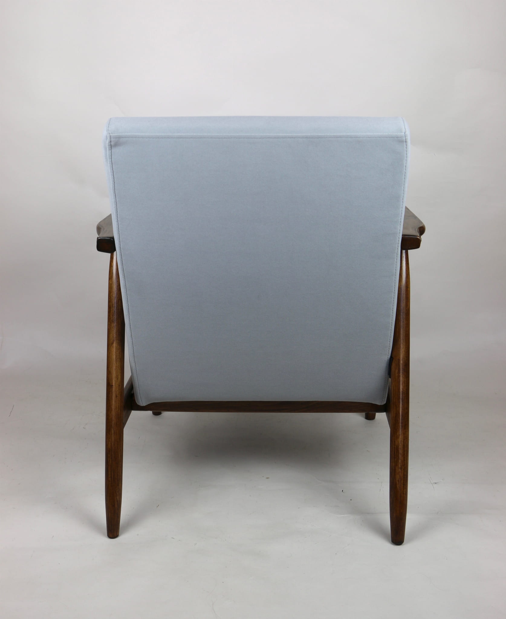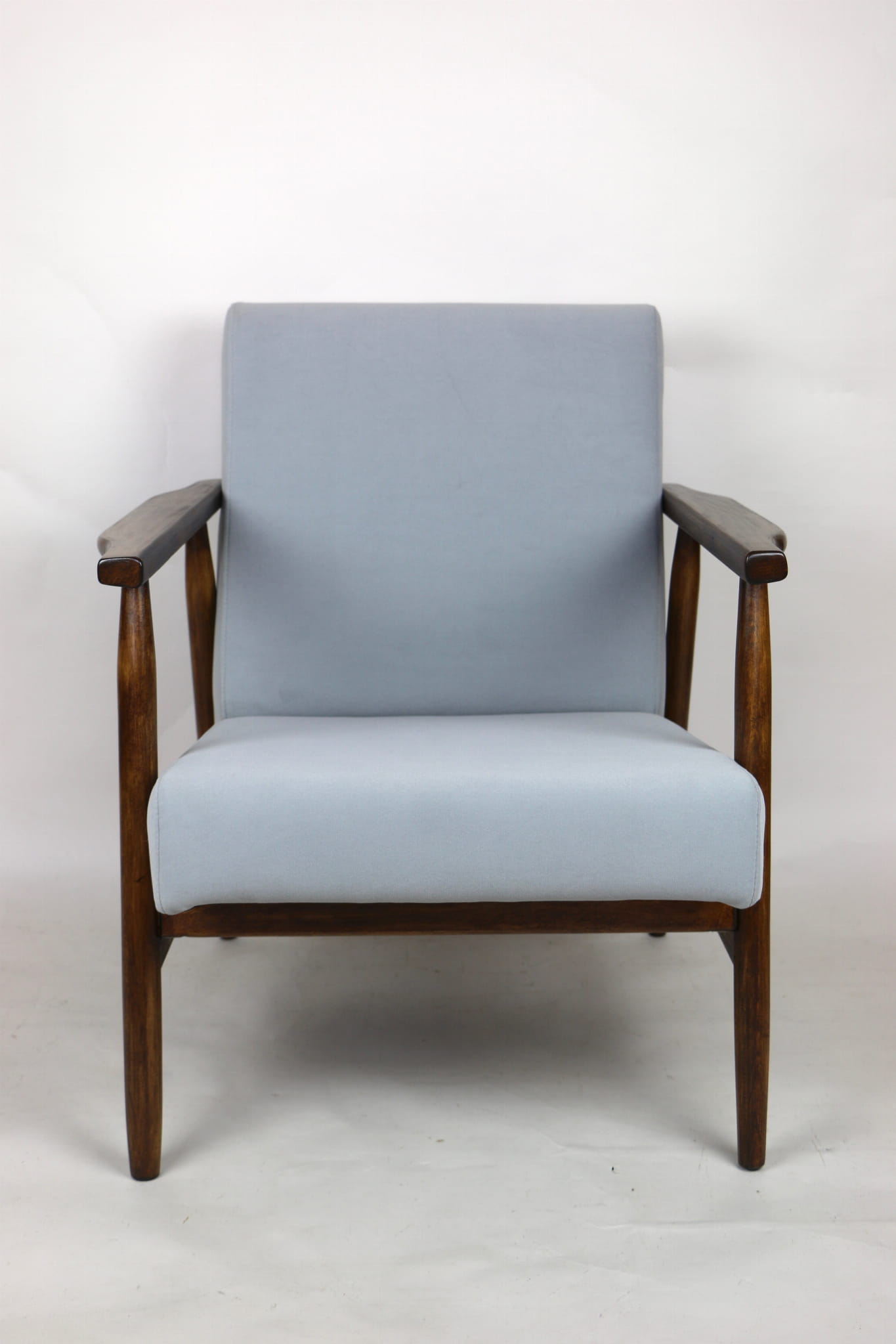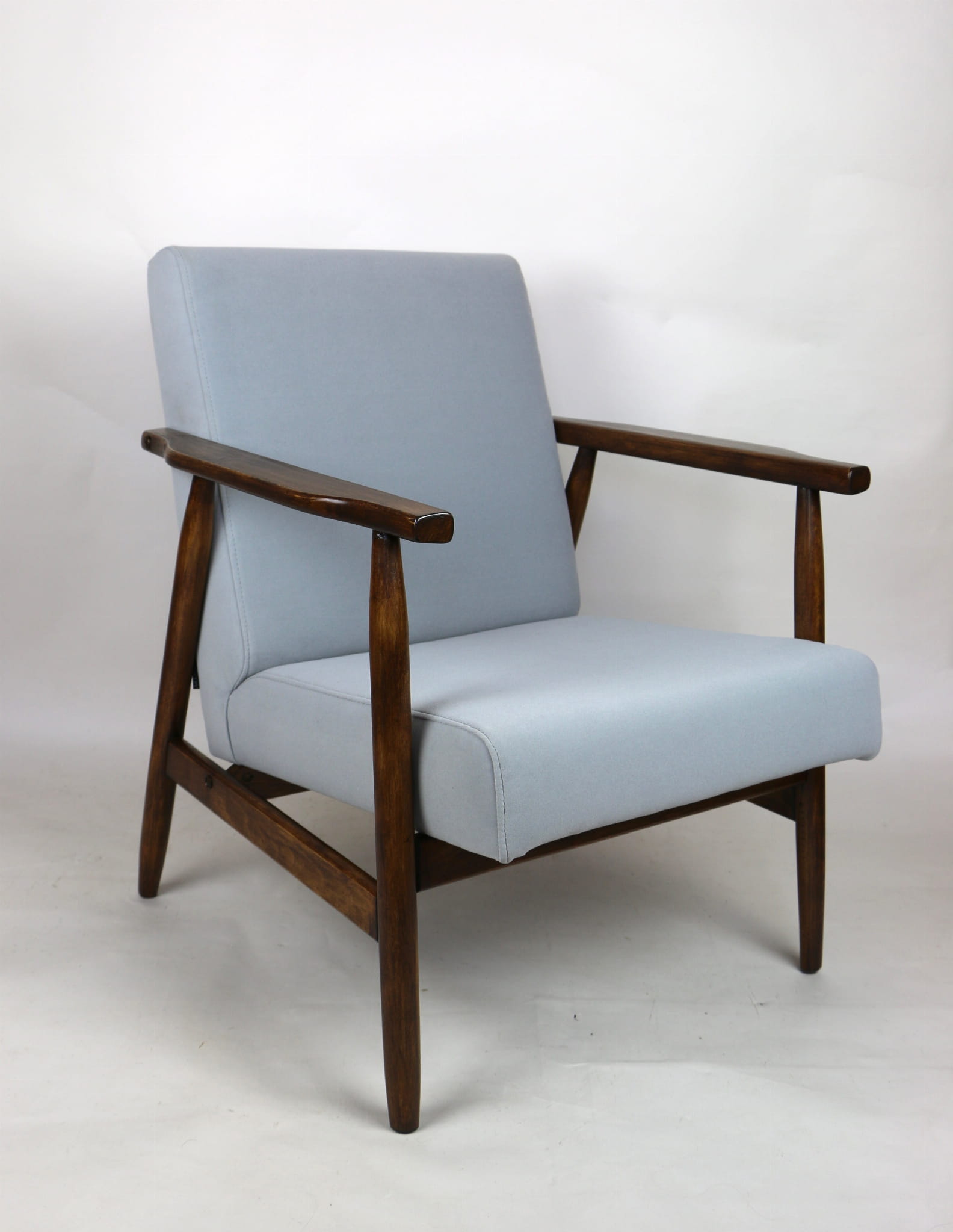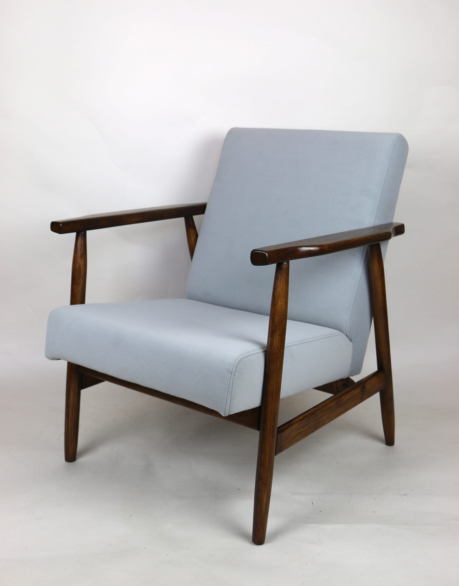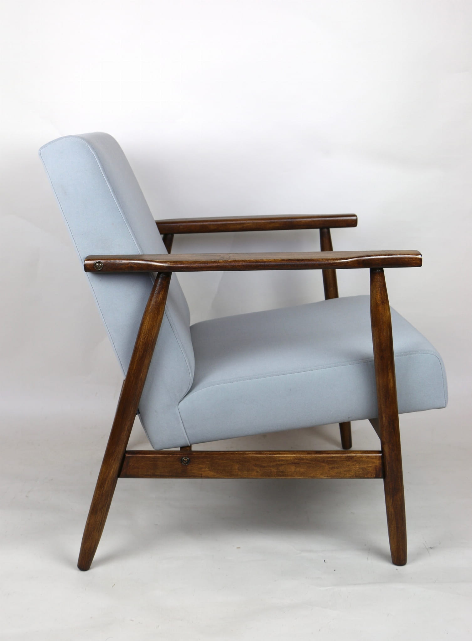 Fotel podobny do bardzo popularnego modelu Lis był produkowany przez zakłady meblarskie w Radomsku w latach 70 tych. Został całkowicie odrestaurowany, zyskał nowe i modne obicie w kolorze szarym- materiał welwet z serii Jade - kolor 804. Stelaż drewniany połączony jest z podłokietnikami w ciemnej kolorystyce drewna typu orzech pokryty lakierem.