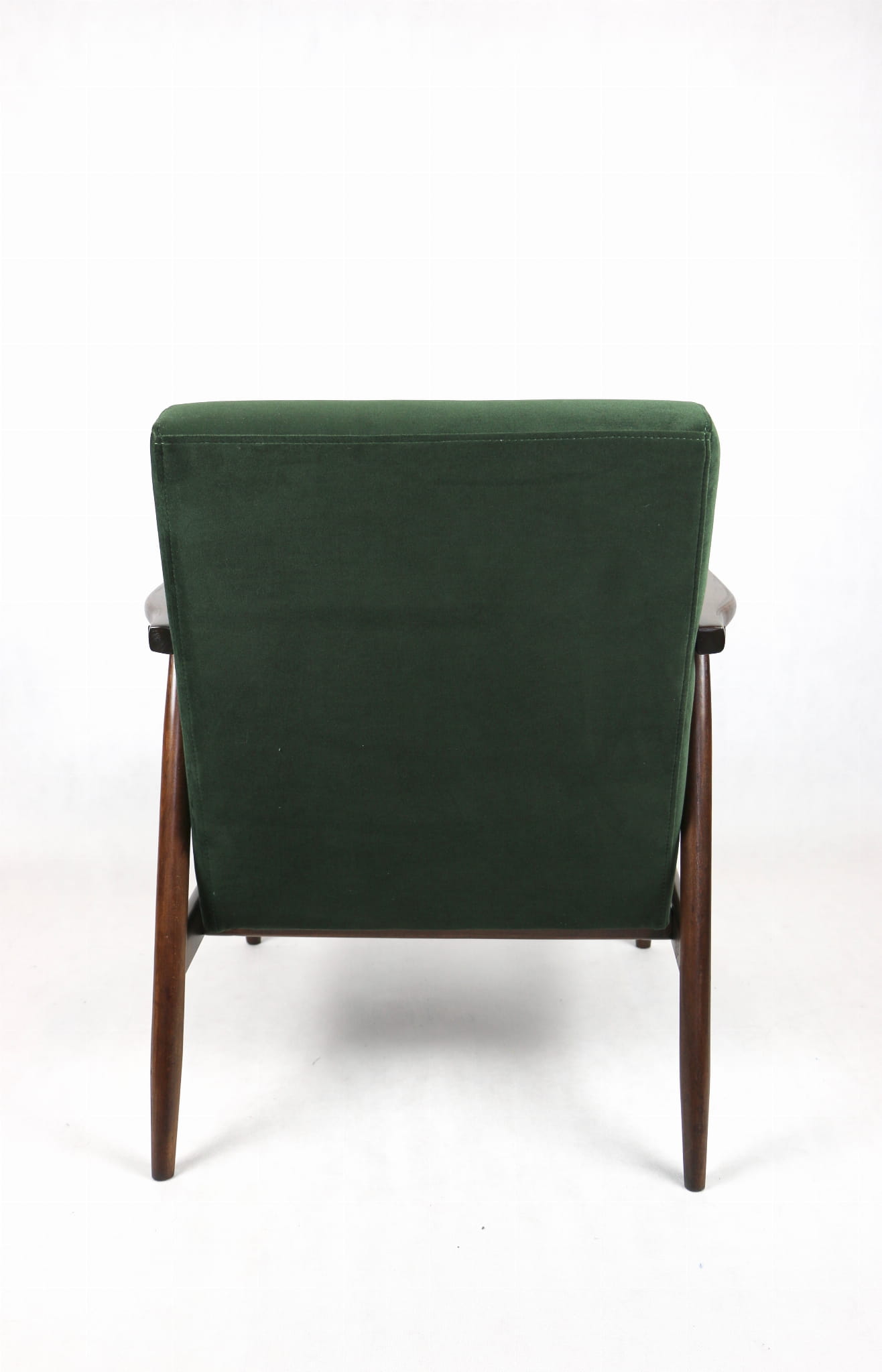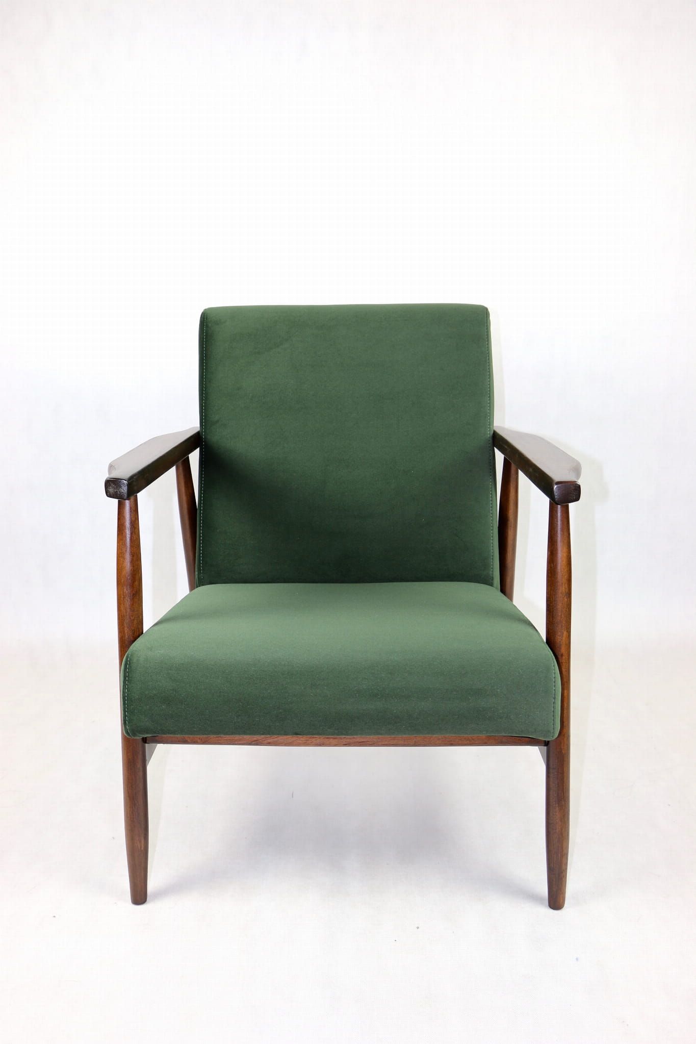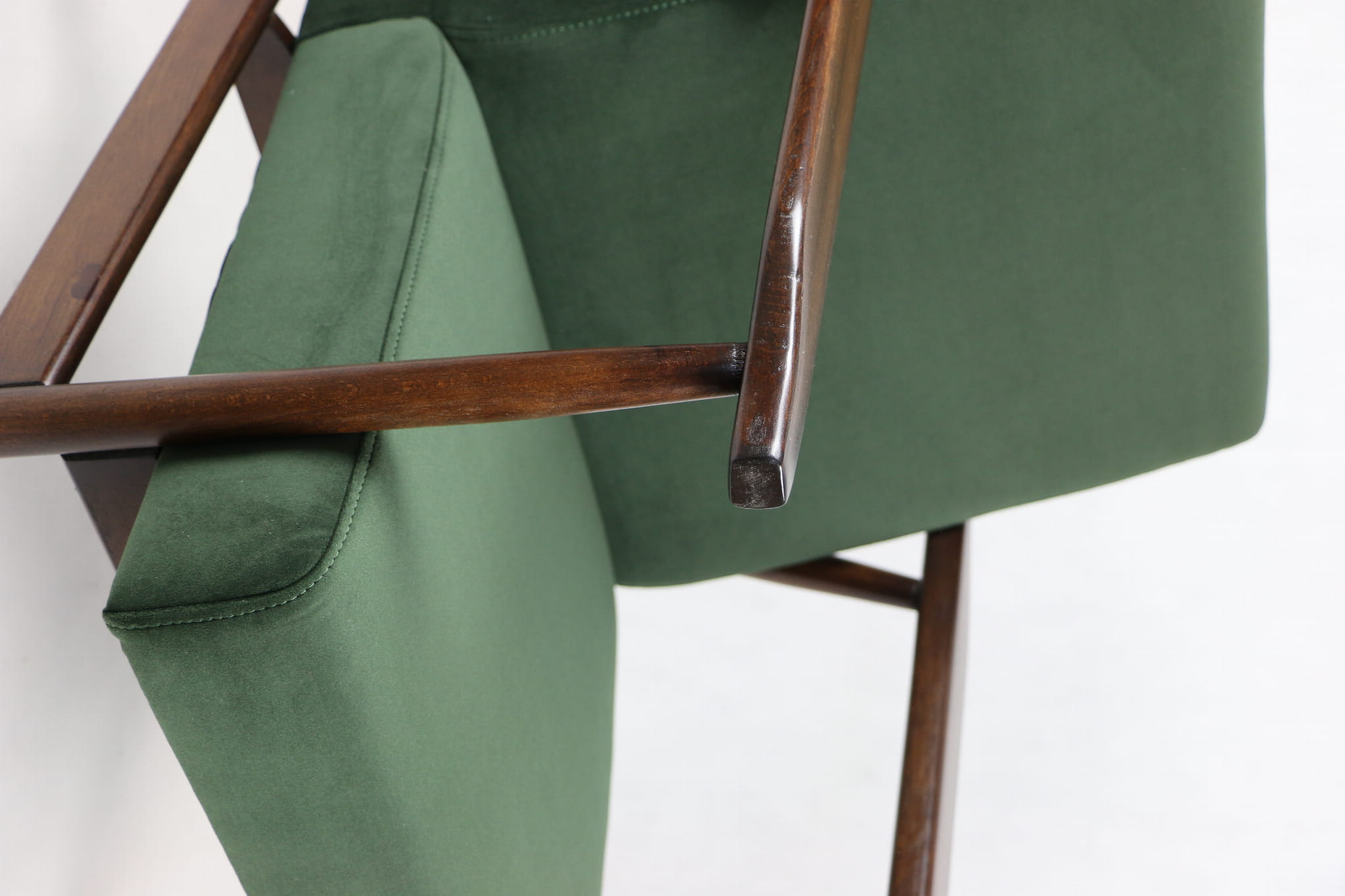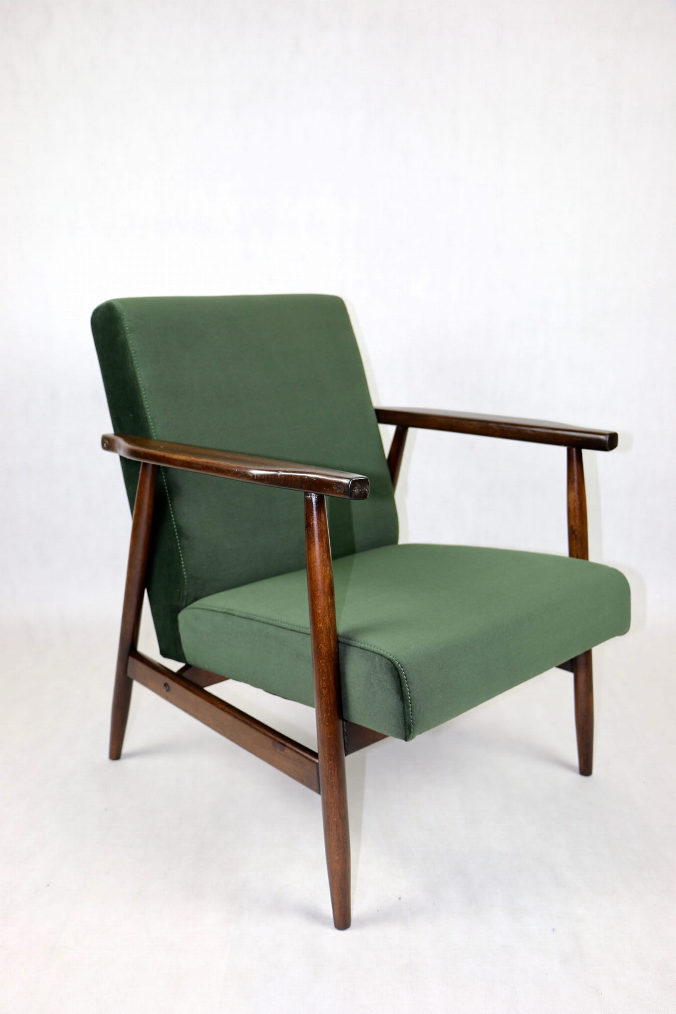 Fotel podobny do bardzo popularnego modelu Lis był produkowany przez zakłady meblarskie w Radomsku w latach 70 tych. Został całkowicie odrestaurowany, zyskał nowe i modne obicie w kolorze zielono-oliwkowym - materiał welwet z serii Jade - kolor 503. Stelaż drewniany połączony jest z podłokietnikami w ciemnej kolorystyce drewna typu orzech pokryty lakierem.