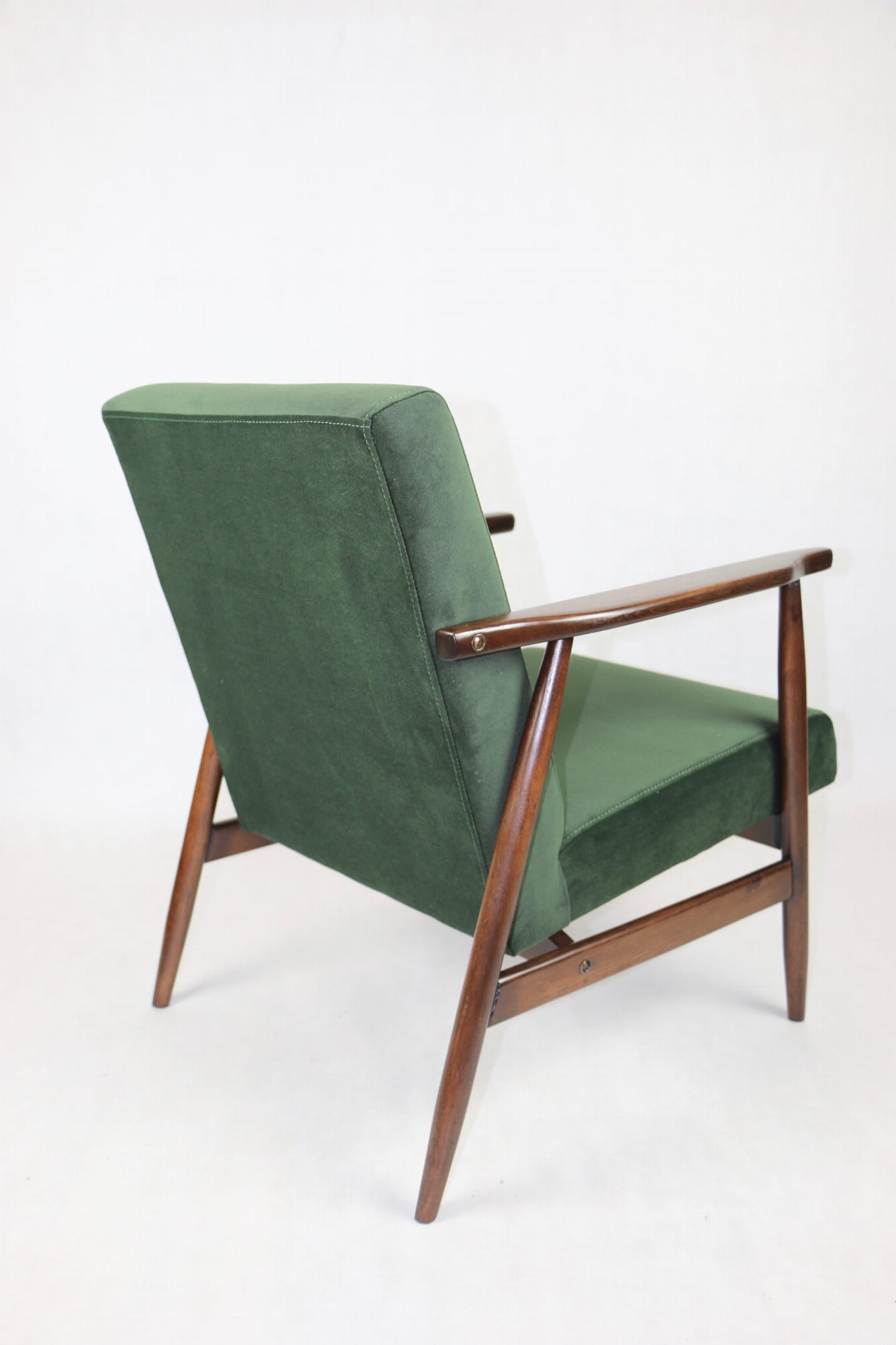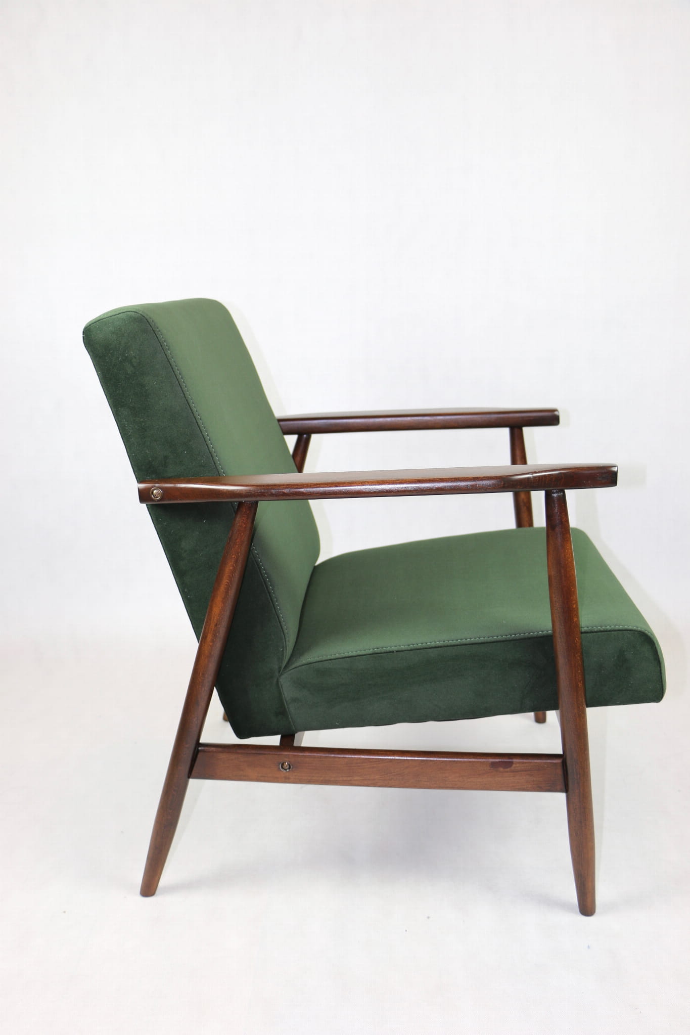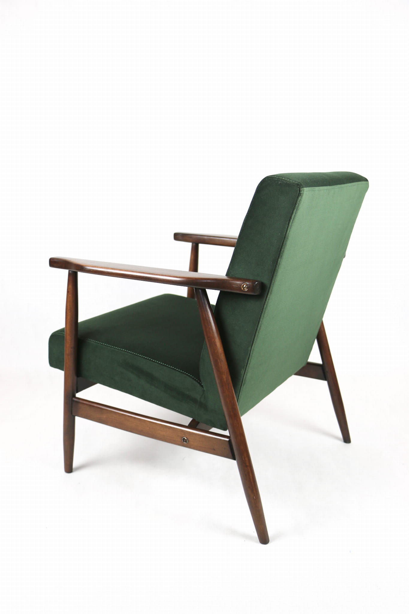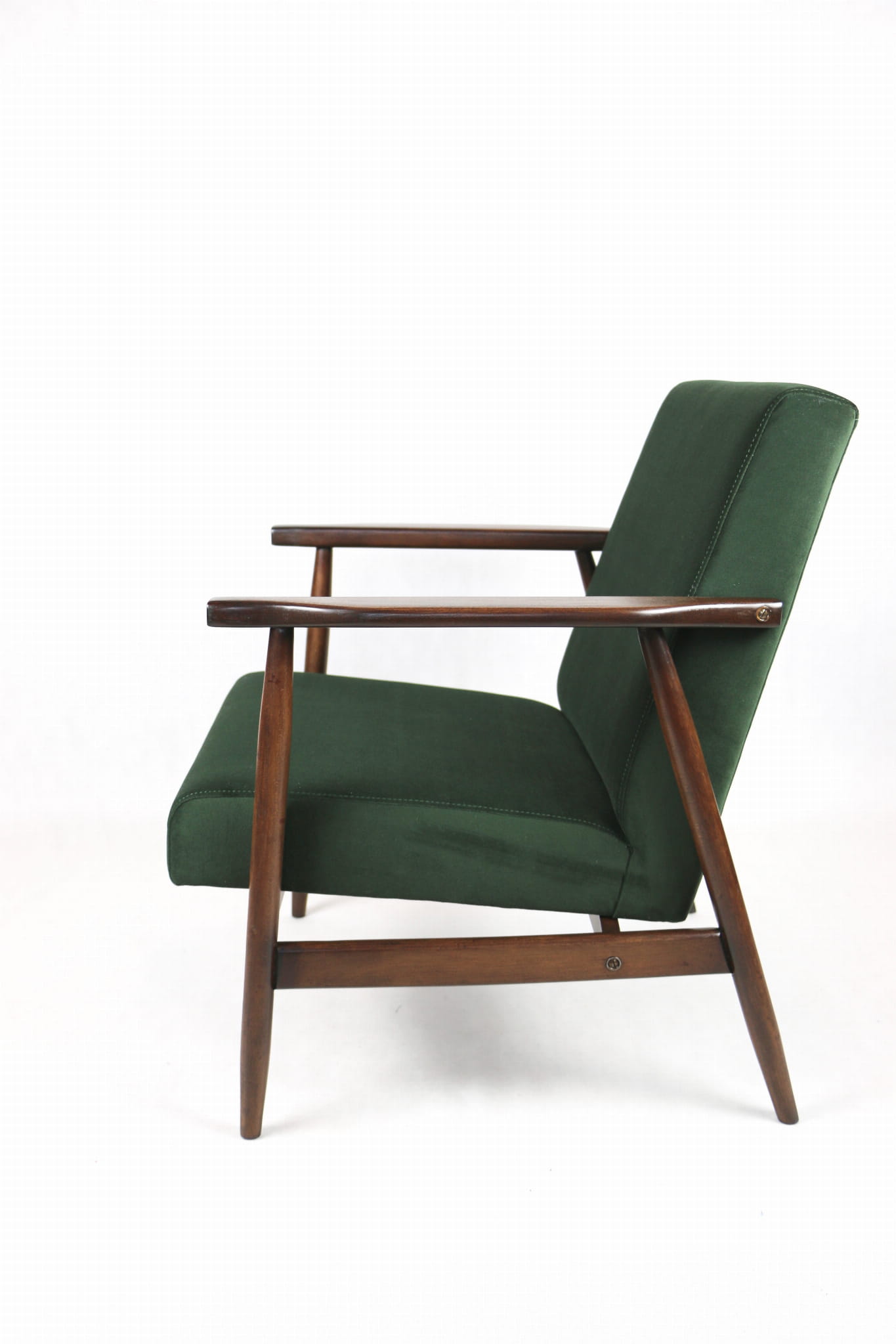 Fotel podobny do bardzo popularnego modelu Lis był produkowany przez zakłady meblarskie w Radomsku w latach 70 tych. Został całkowicie odrestaurowany, zyskał nowe i modne obicie w kolorze zielono-oliwkowym - materiał welwet z serii Jade - kolor 503. Stelaż drewniany połączony jest z podłokietnikami w ciemnej kolorystyce drewna typu orzech pokryty lakierem.