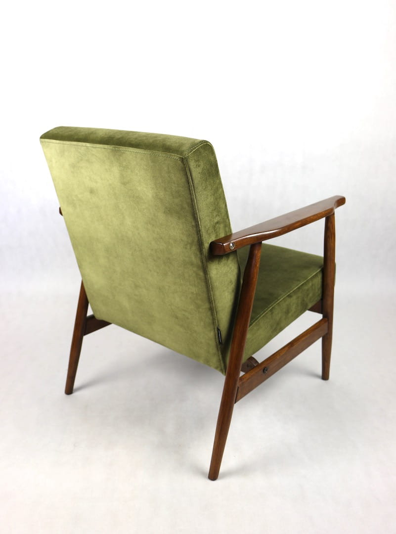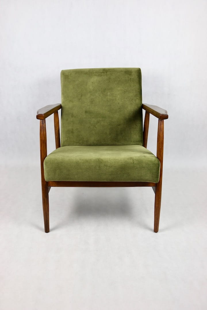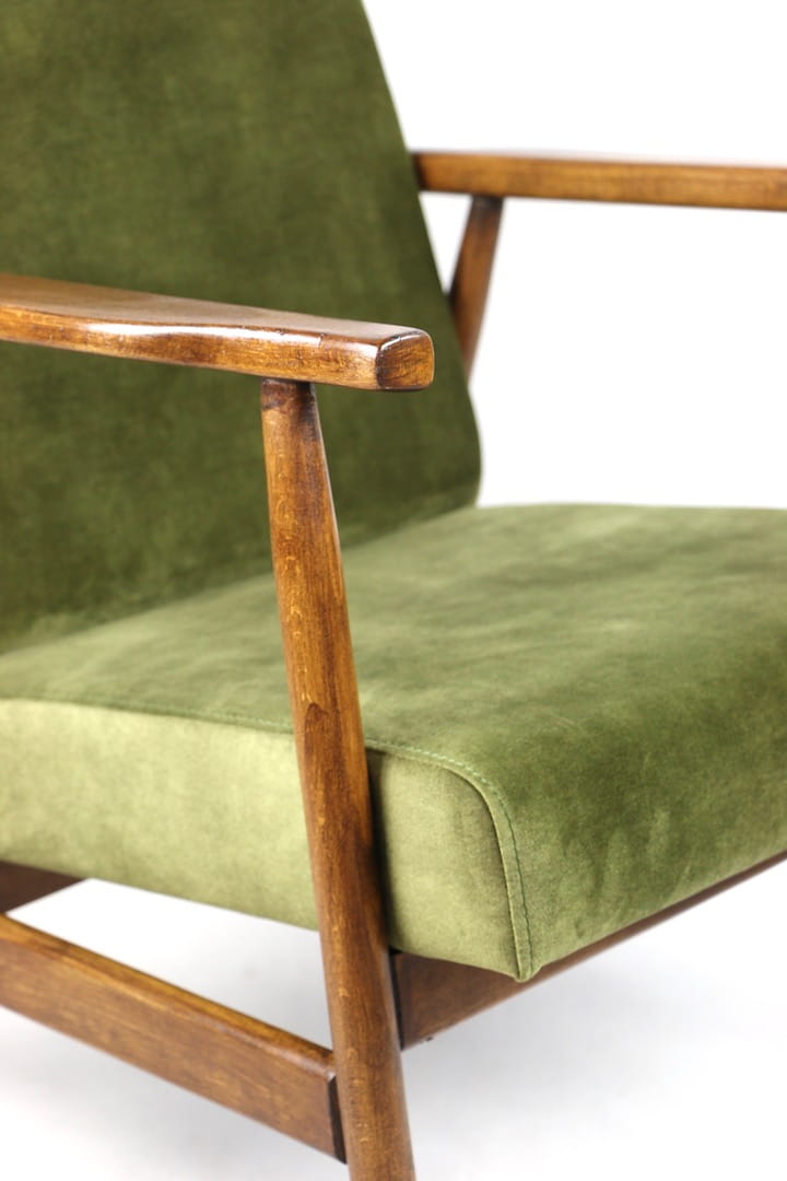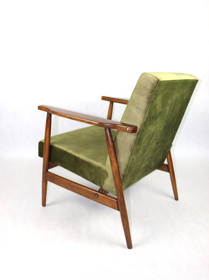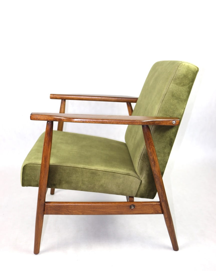 Fotel podobny do bardzo popularnego modelu Lis był produkowany przez zakłady meblarskie w Radomsku w latach 70 tych. Został całkowicie odrestaurowany, zyskał nowe i modne obicie w kolorze zielono-oliwkowym - materiał welwet. Stelaż drewniany połączony jest z podłokietnikami w ciemnej kolorystyce drewna typu orzech pokryty lakierem.