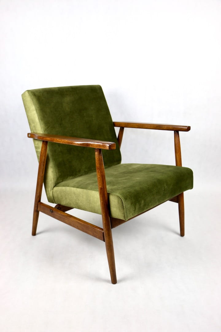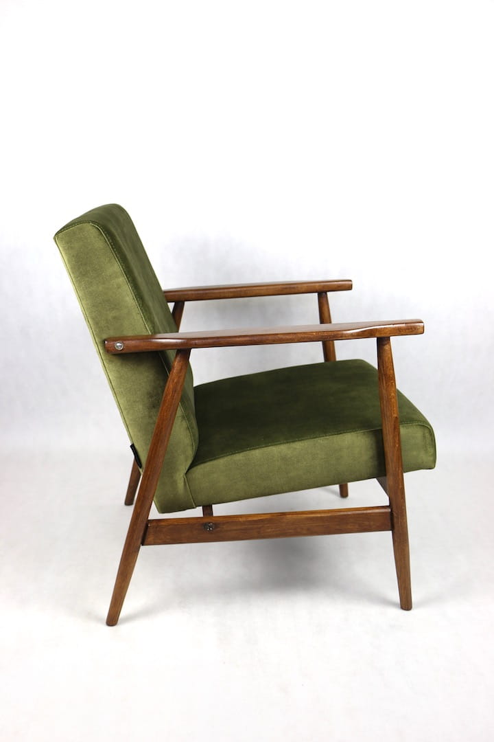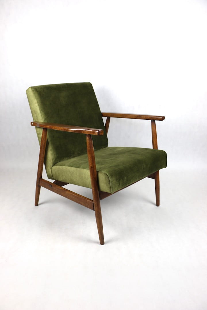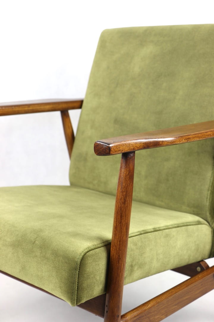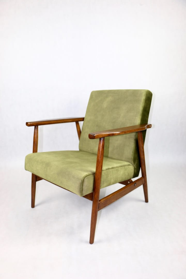 Fotel podobny do bardzo popularnego modelu Lis był produkowany przez zakłady meblarskie w Radomsku w latach 70 tych. Został całkowicie odrestaurowany, zyskał nowe i modne obicie w kolorze zielono-oliwkowym - materiał welwet. Stelaż drewniany połączony jest z podłokietnikami w ciemnej kolorystyce drewna typu orzech pokryty lakierem.