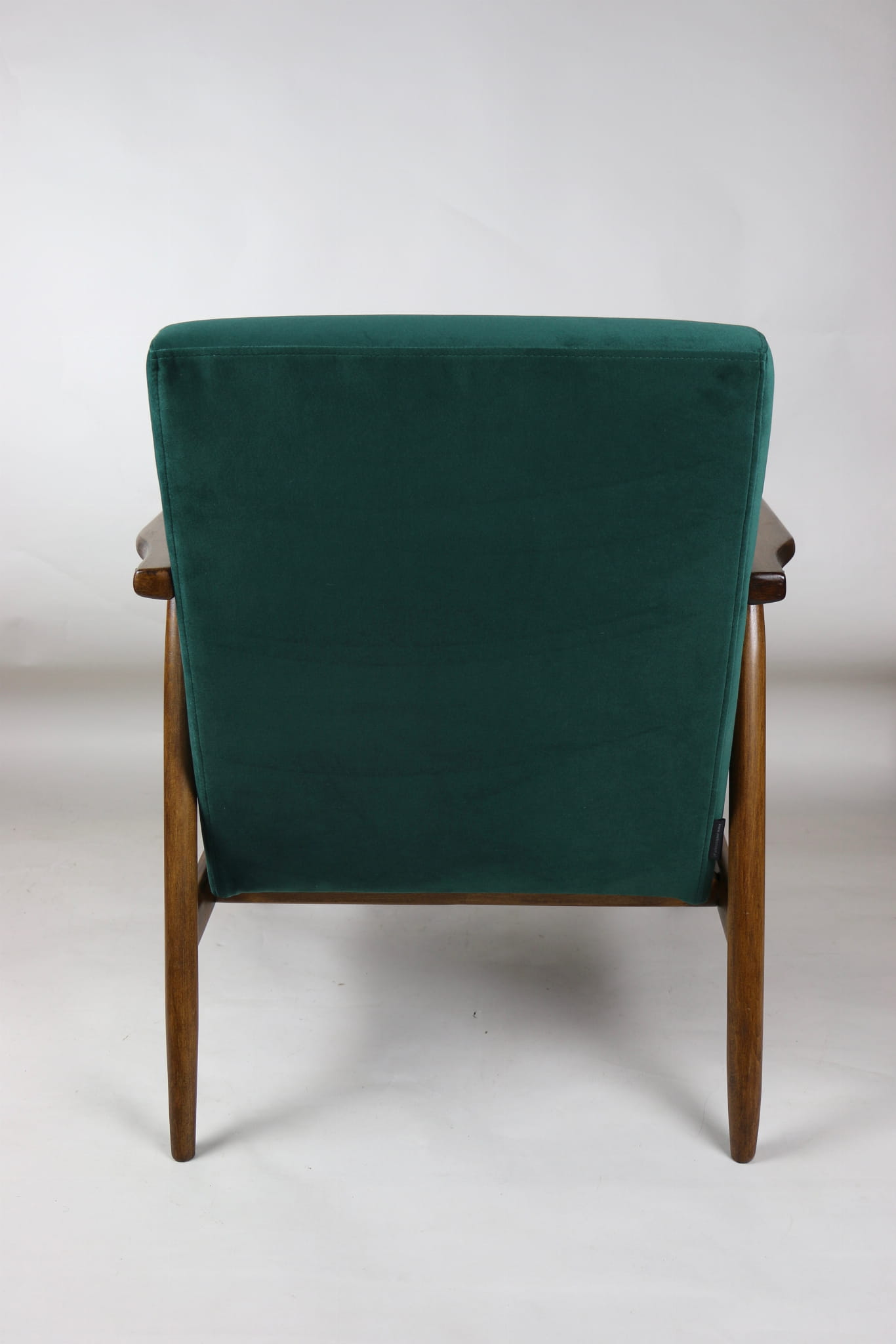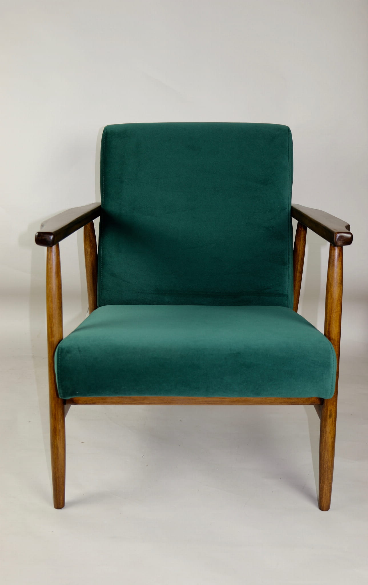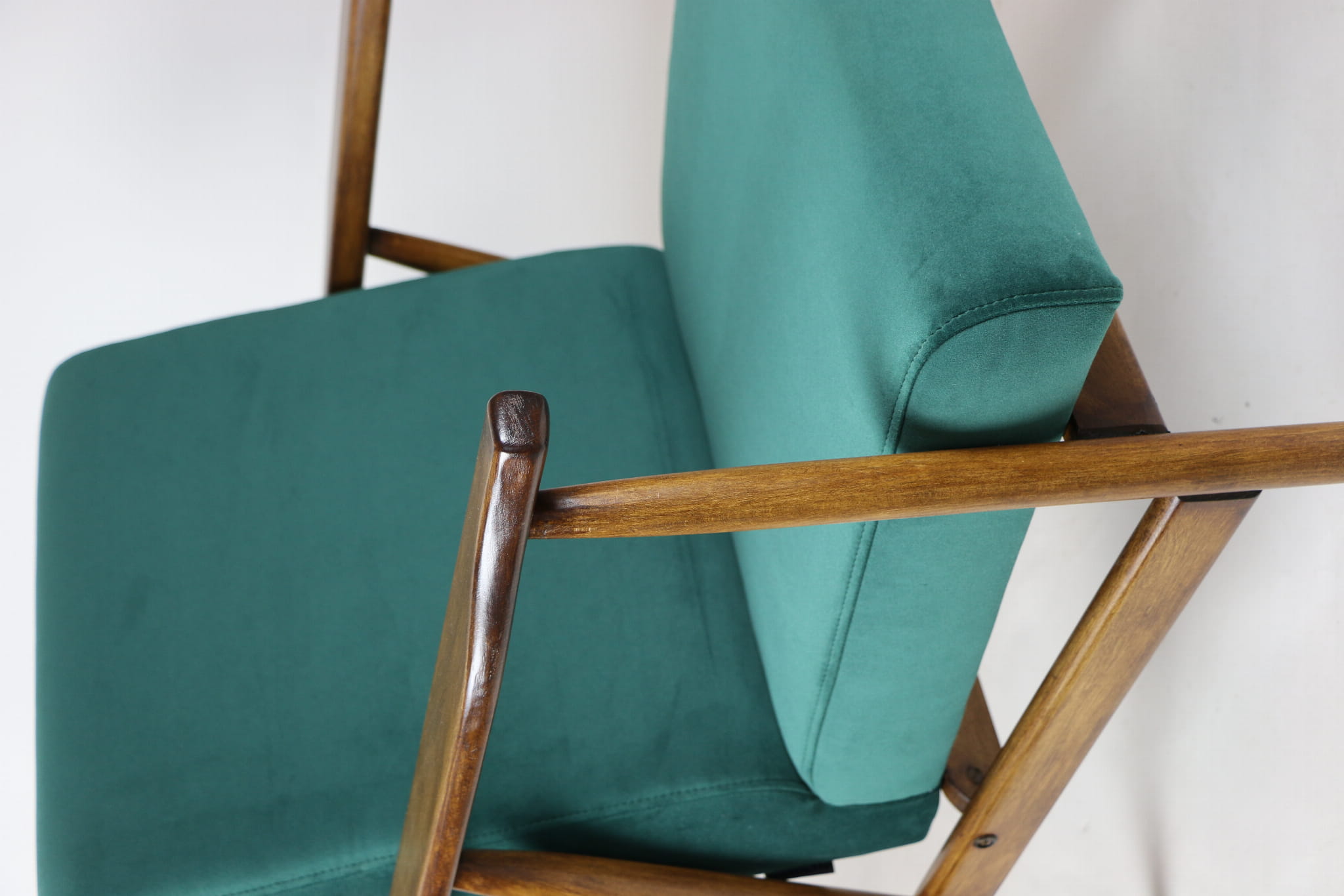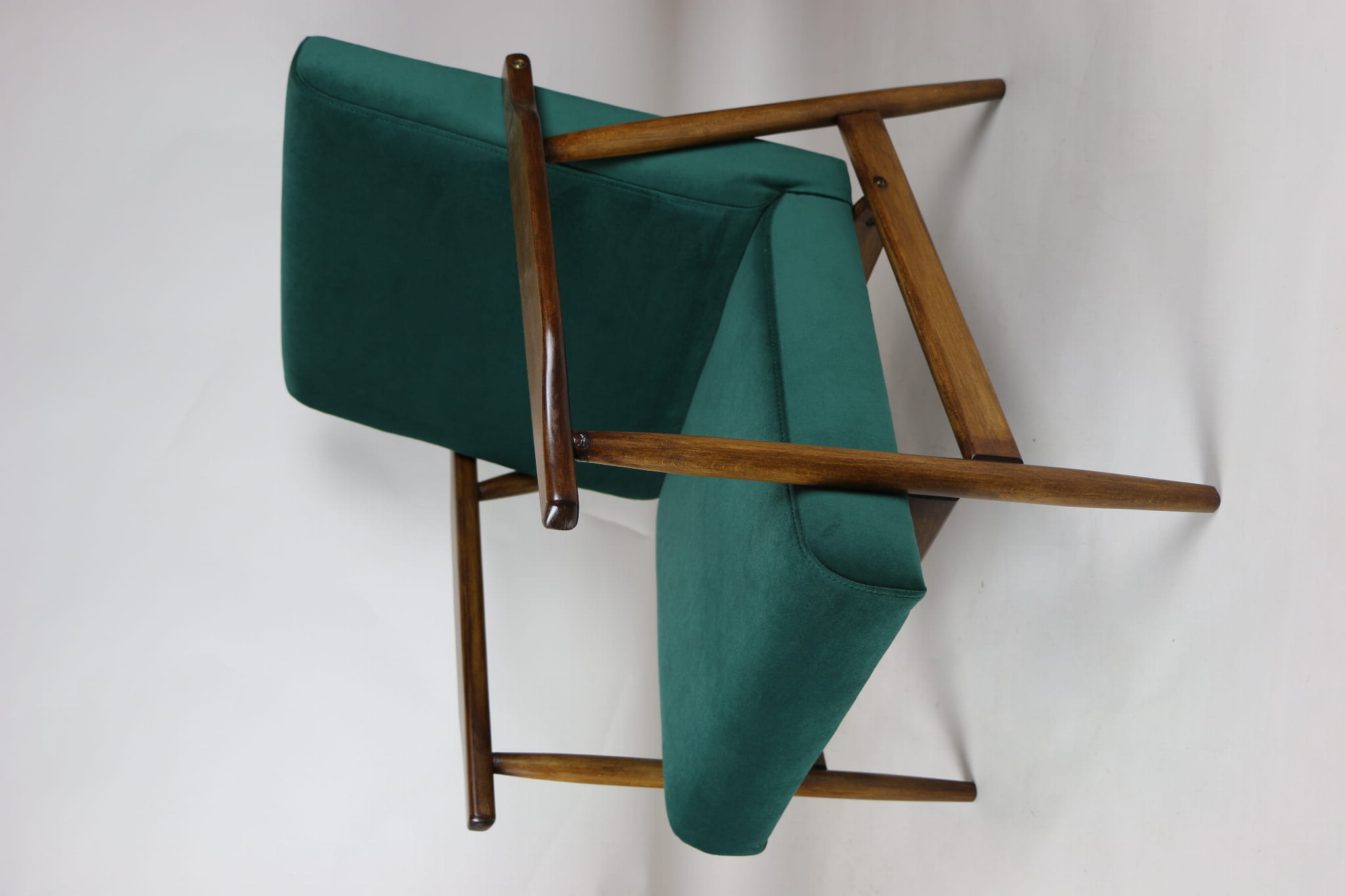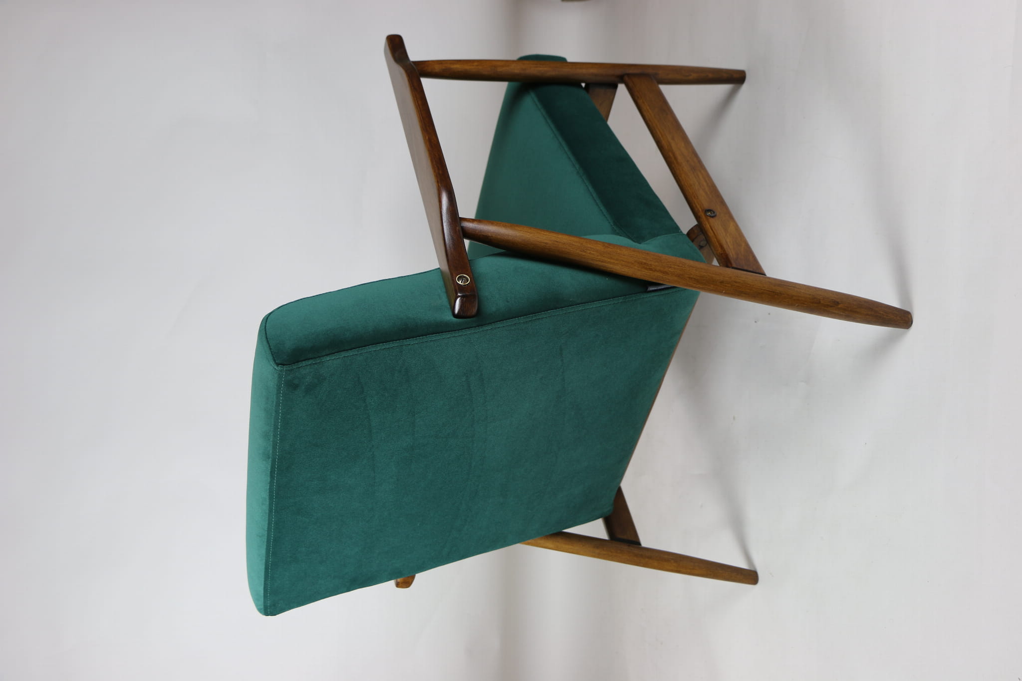 Fotel podobny do bardzo popularnego modelu Lis był produkowany przez zakłady meblarskie w Radomsku w latach 70 tych. Został całkowicie odrestaurowany, zyskał nowe i modne obicie w kolorze zielonym- materiał welwet z serii Jade - kolor 500. Stelaż drewniany połączony jest z podłokietnikami w ciemnej kolorystyce drewna typu orzech pokryty lakierem.