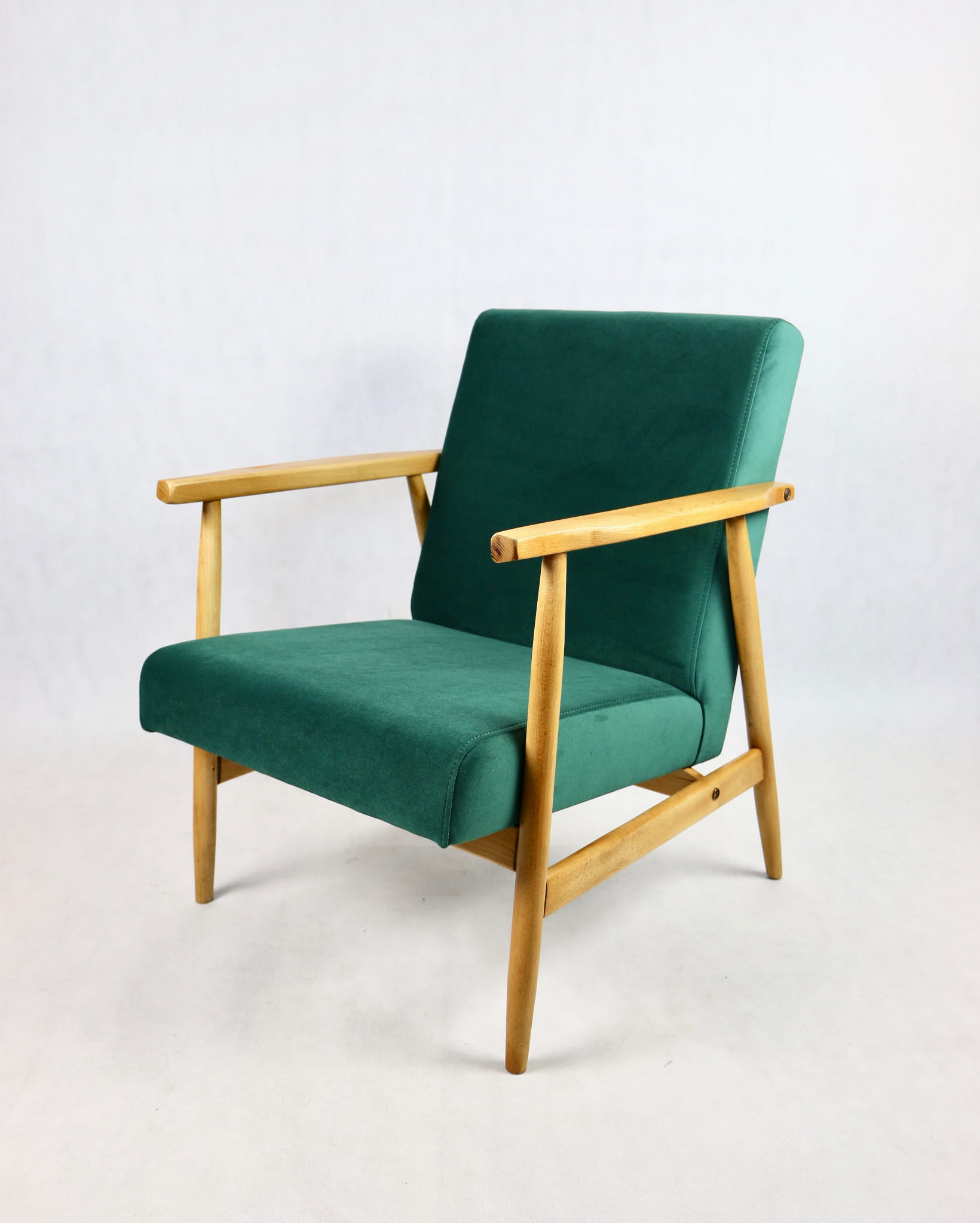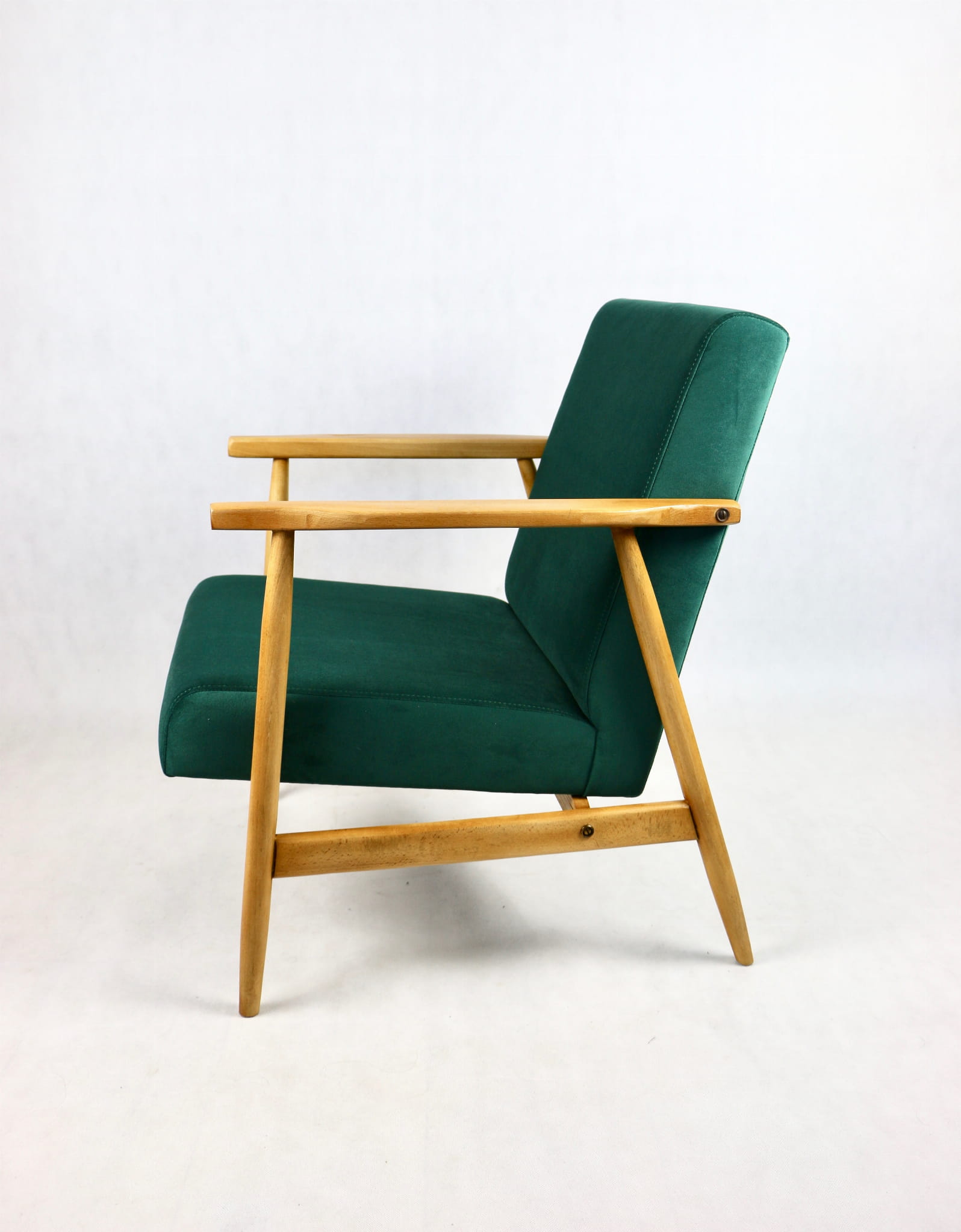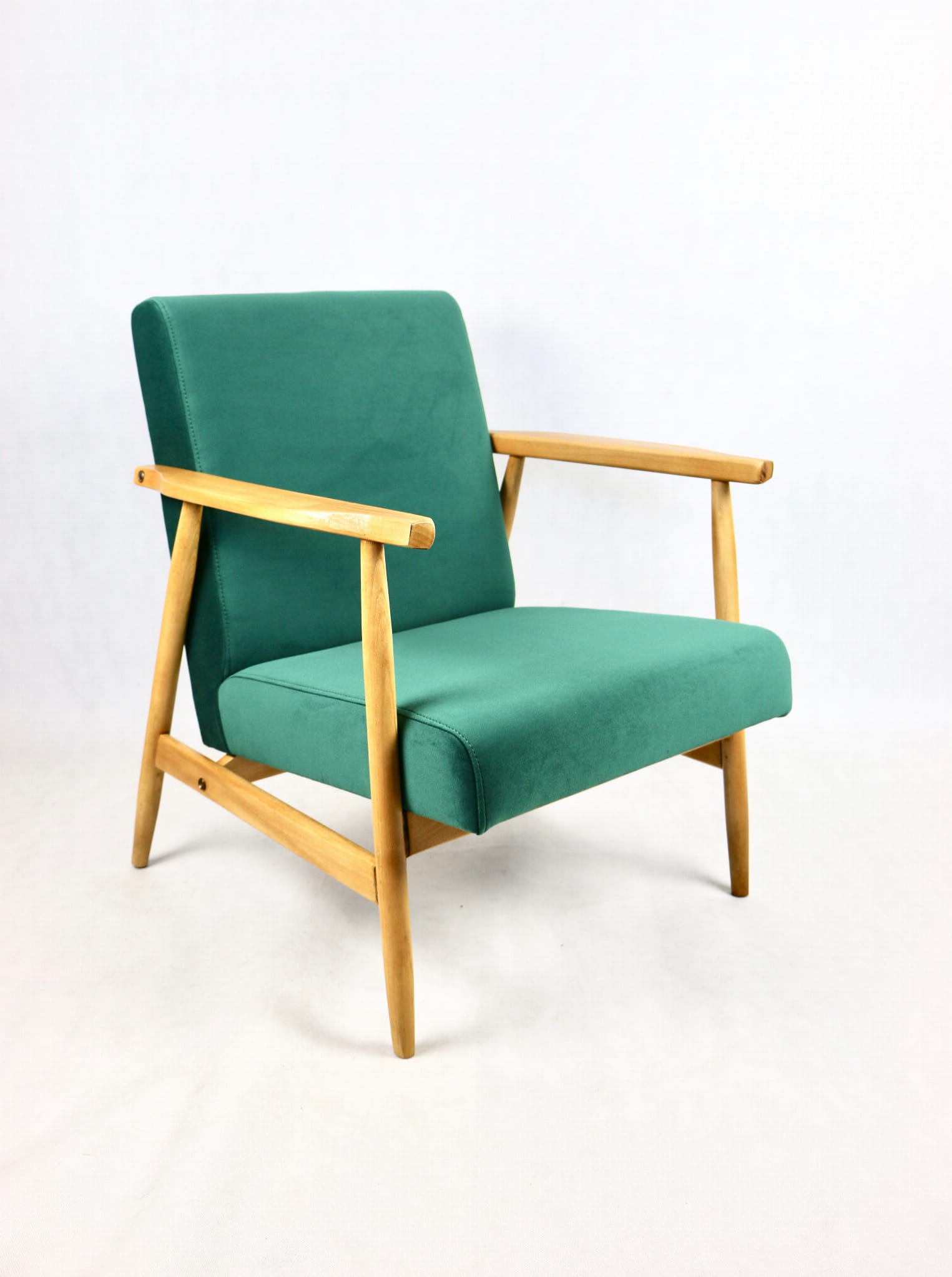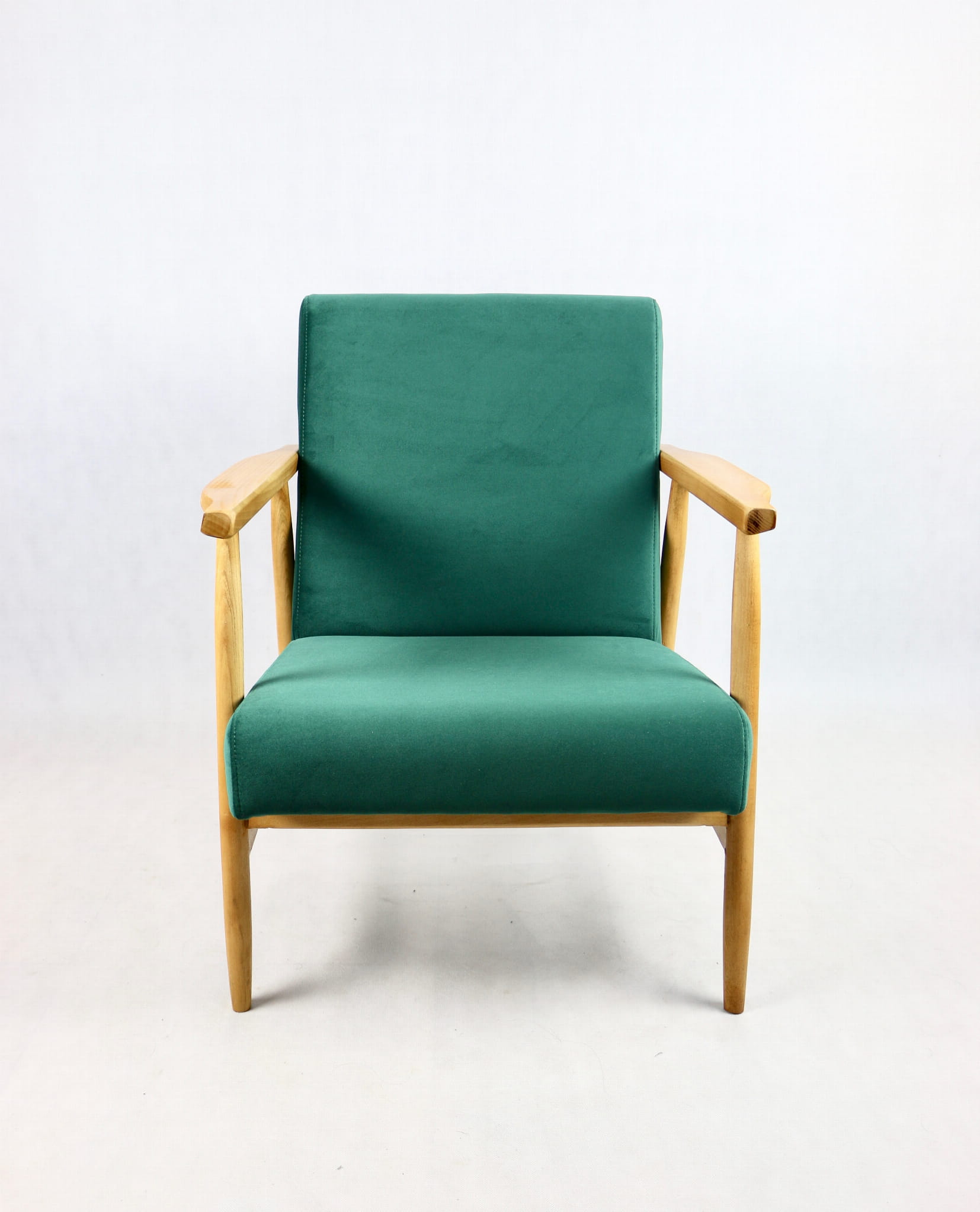 Fotel podobny do bardzo popularnego modelu Lis był produkowany przez zakłady meblarskie w Radomsku w latach 70 tych. Został całkowicie odrestaurowany, zyskał nowe i modne obicie w kolorze zielonym - materiał typu welwet z serii Jade - easy to clean. Stelaż drewniany połączony jest z podłokietnikami w jasnej kolorystyce drewna pokryty lakierem.